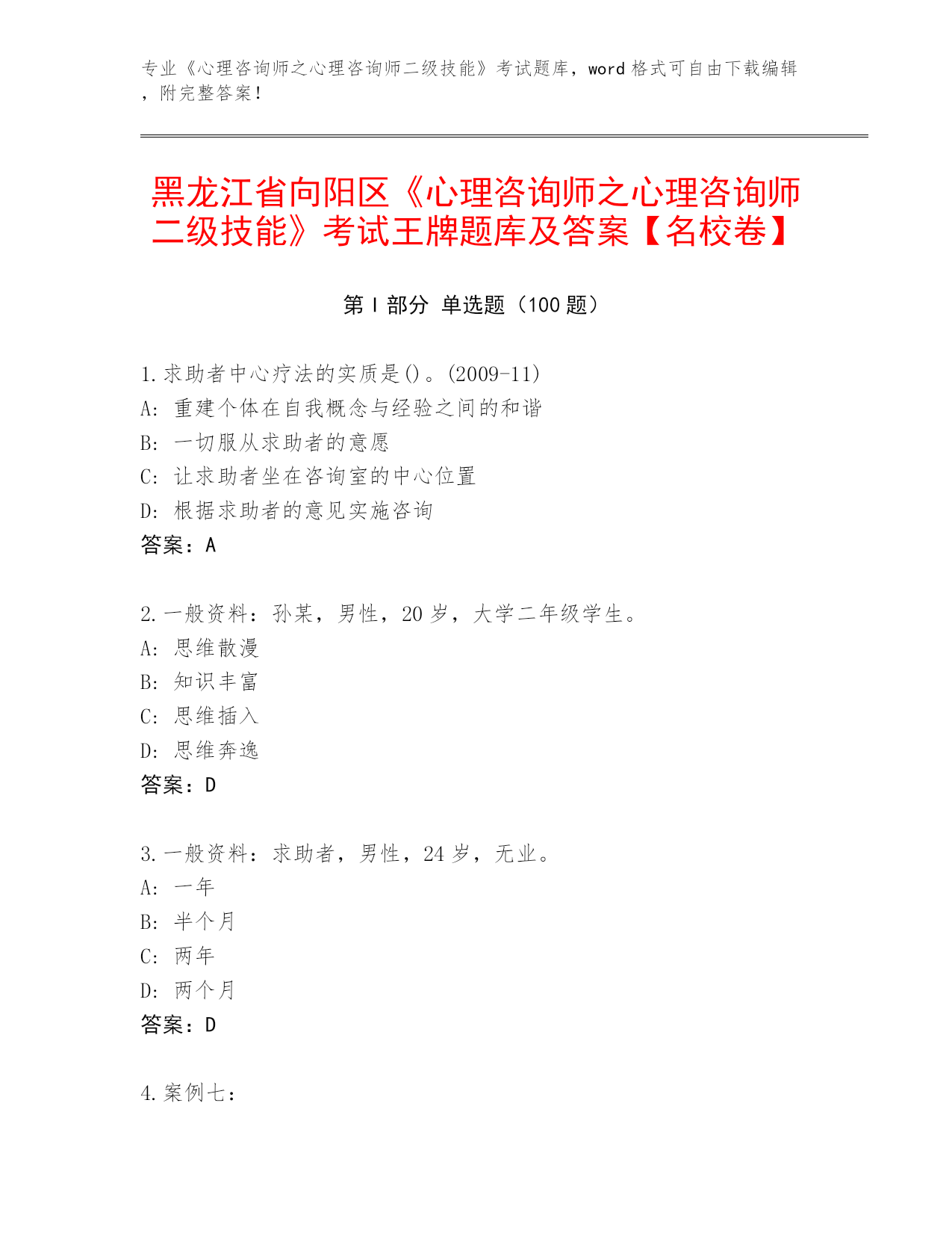 黑龙江省向阳区2024《心理咨询师之心理咨询师二级技能》考试必刷200题王牌题库(预热题)