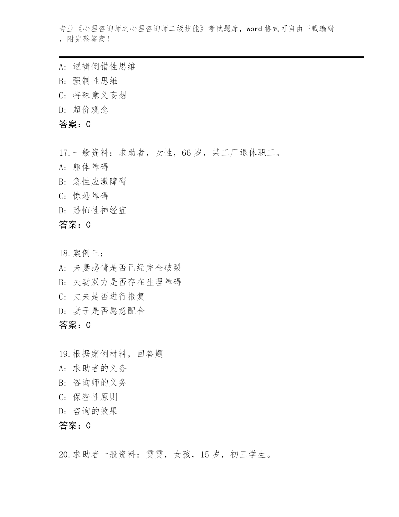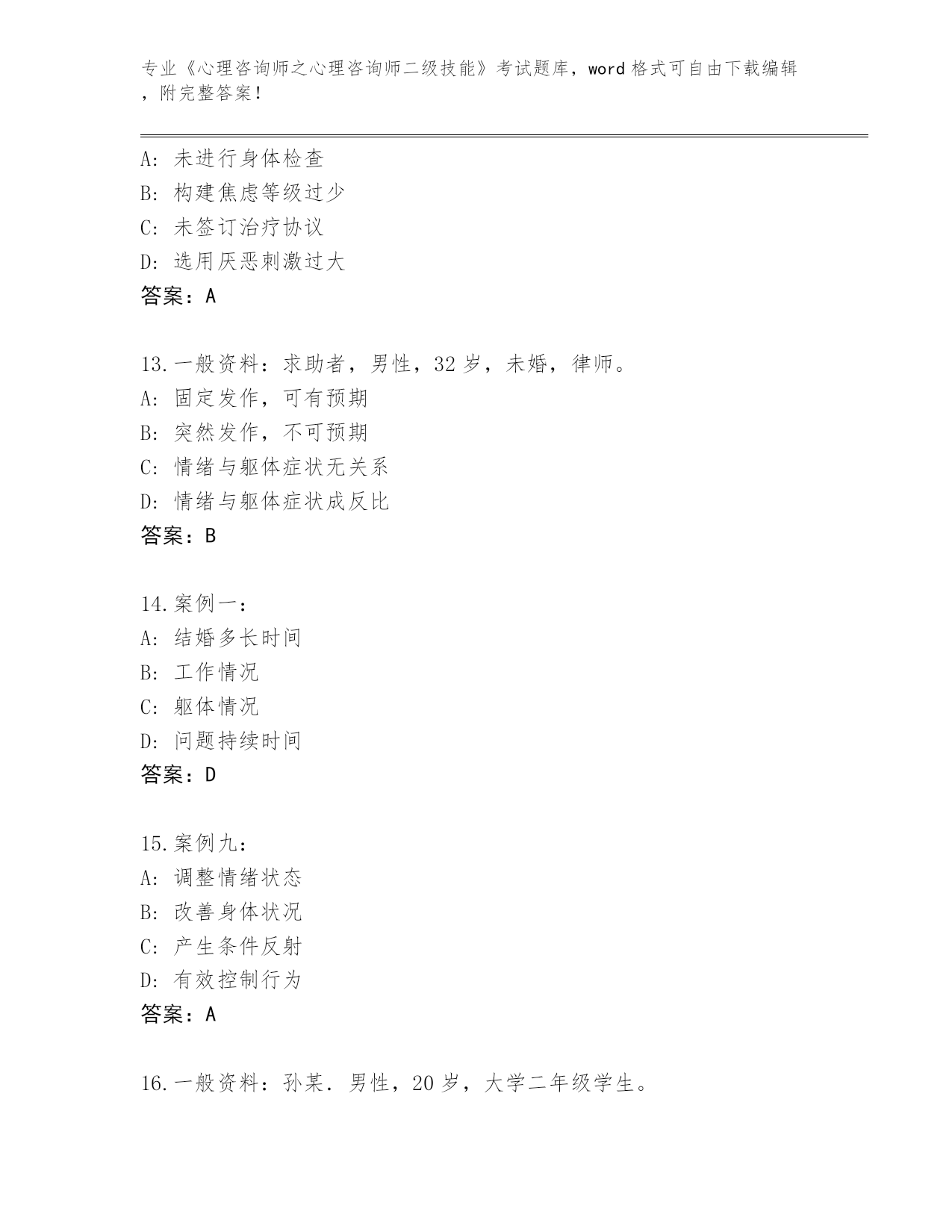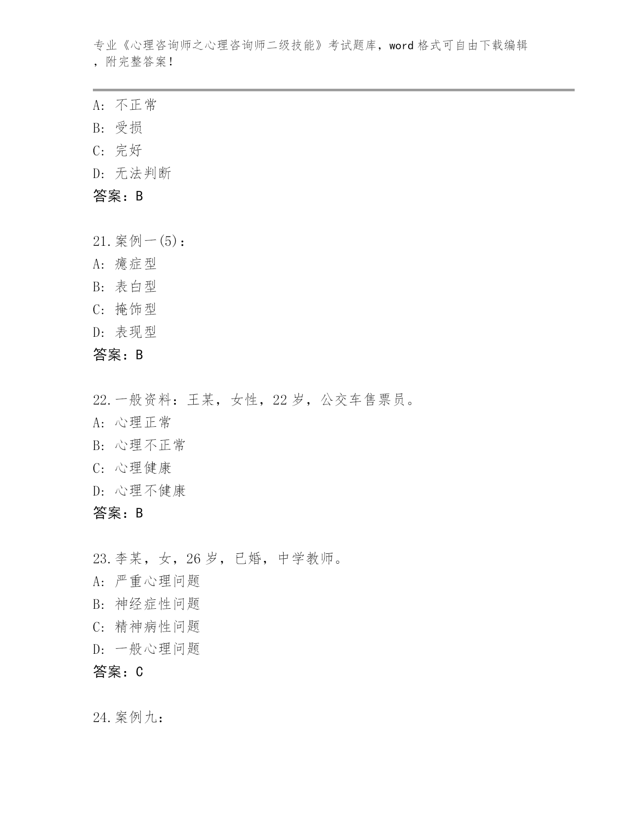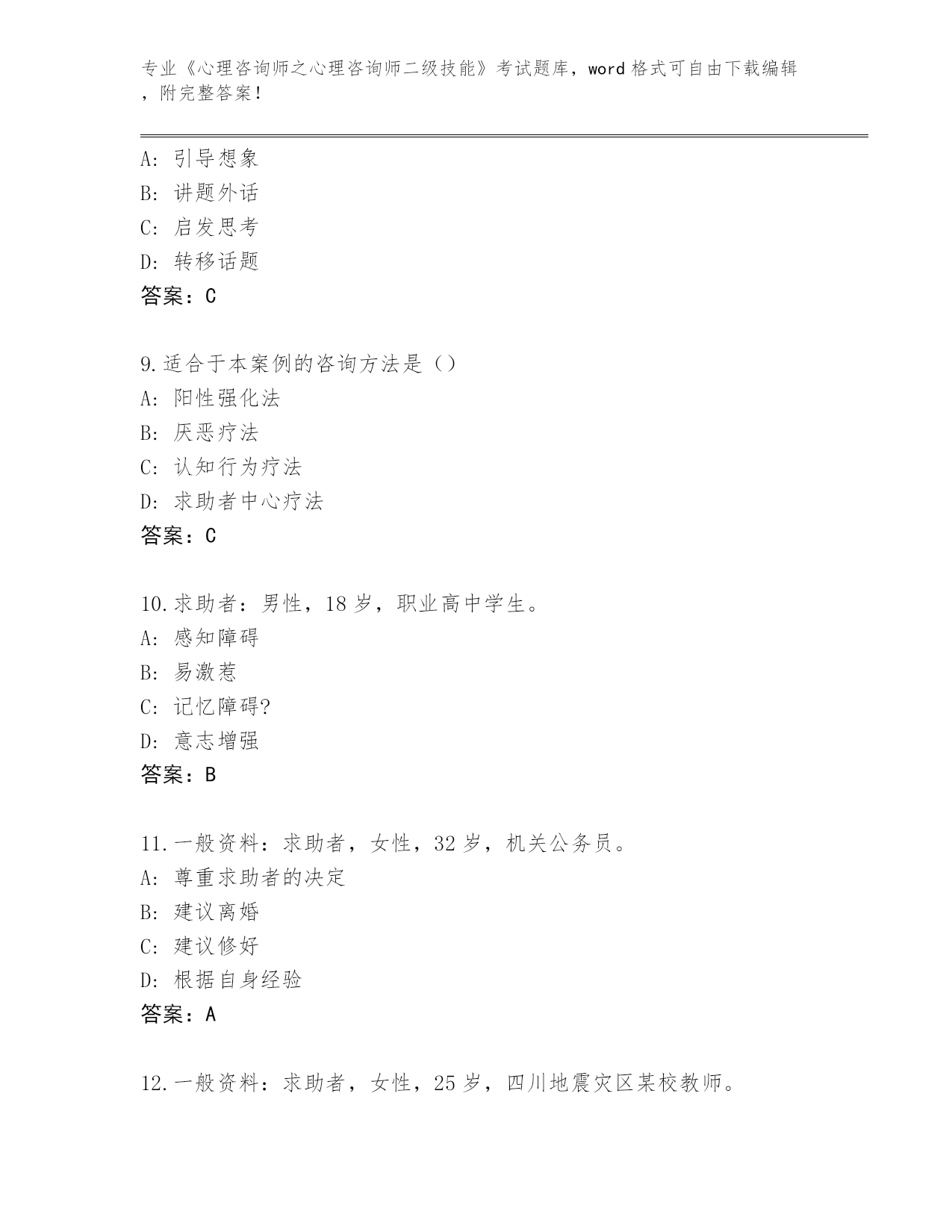 陕西省2024年《心理咨询师之心理咨询师二级技能》考试必考200题王牌题库及答案(名校卷)