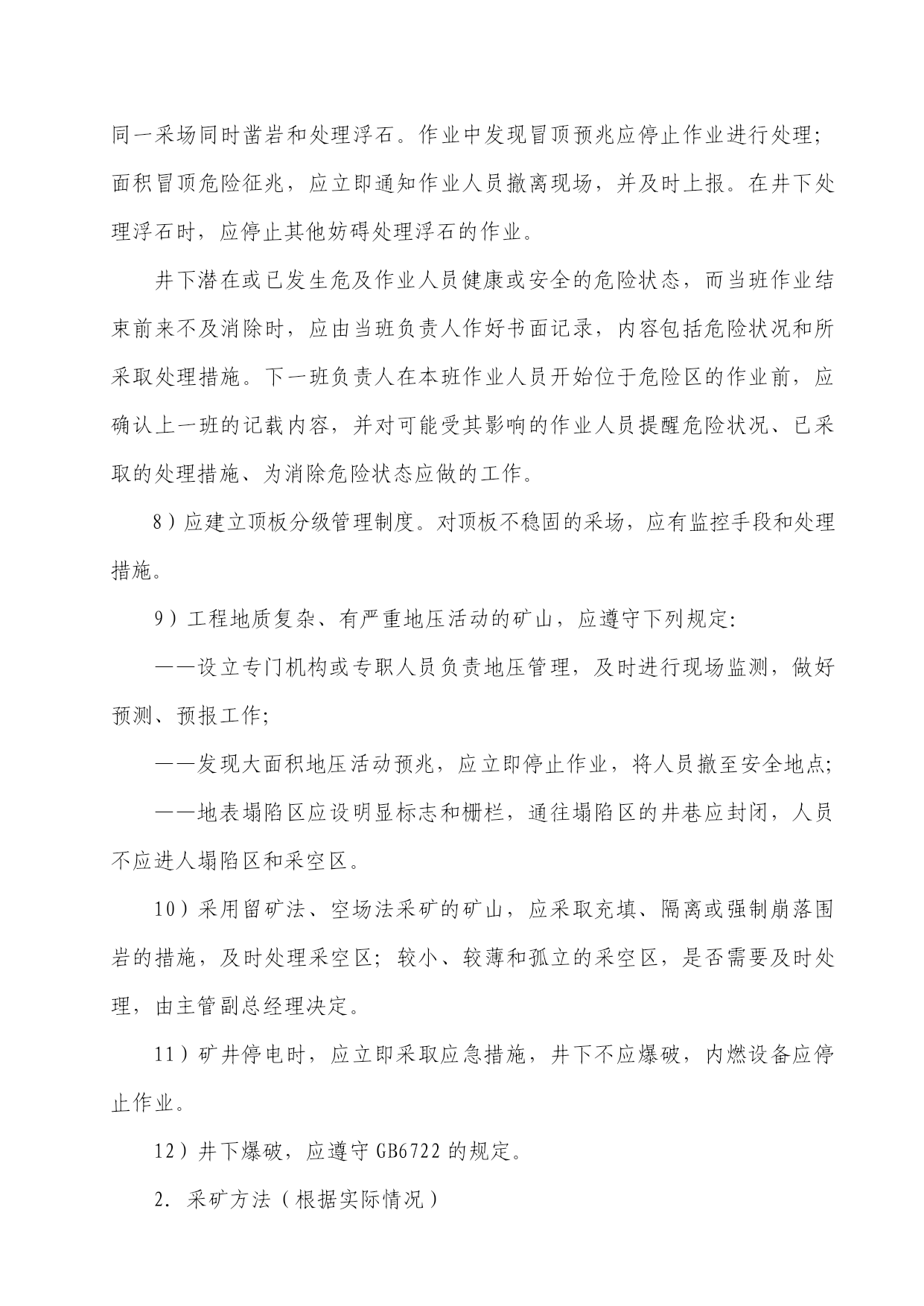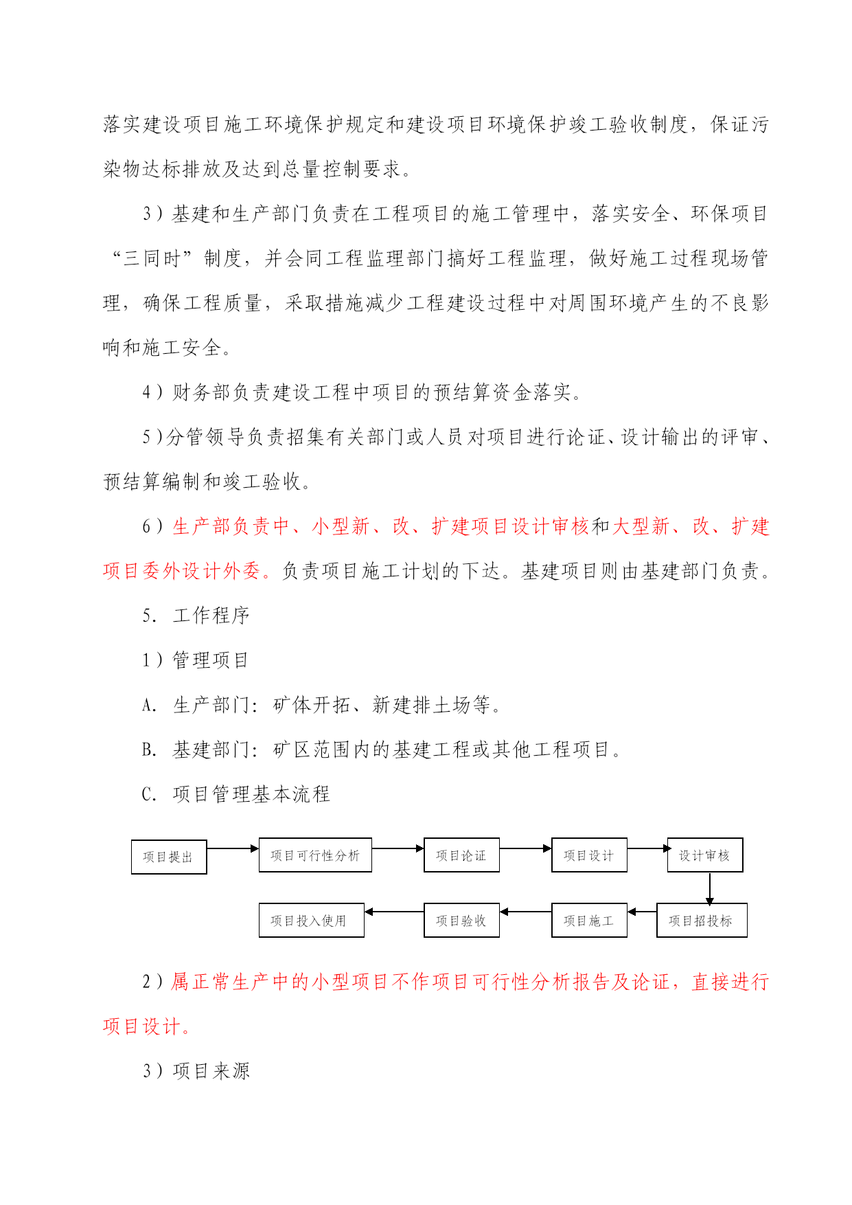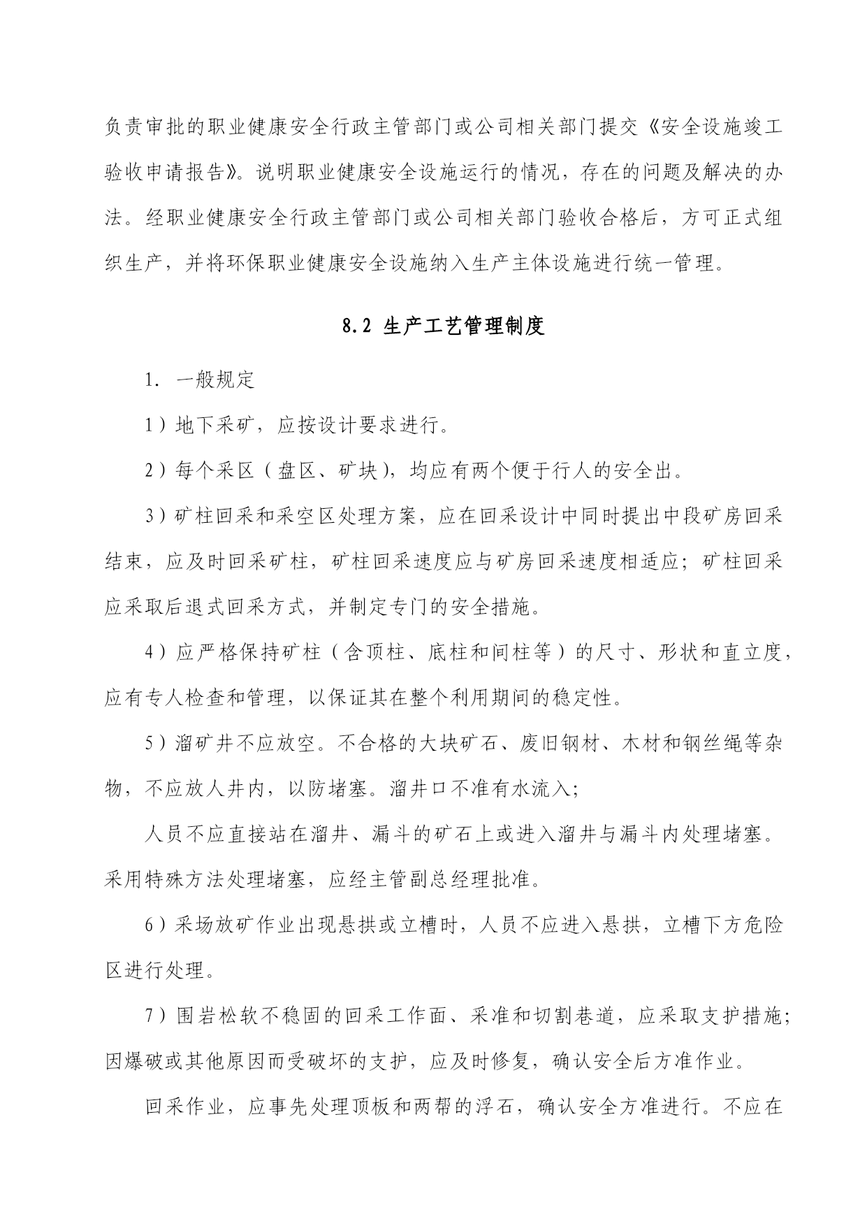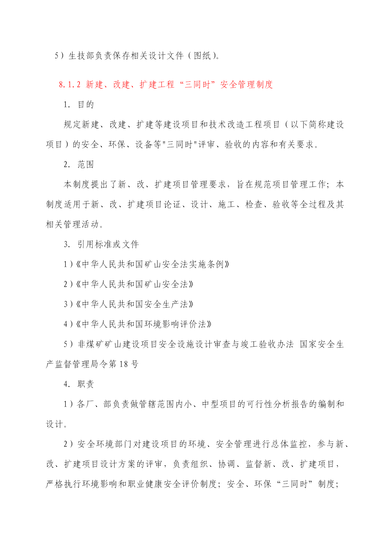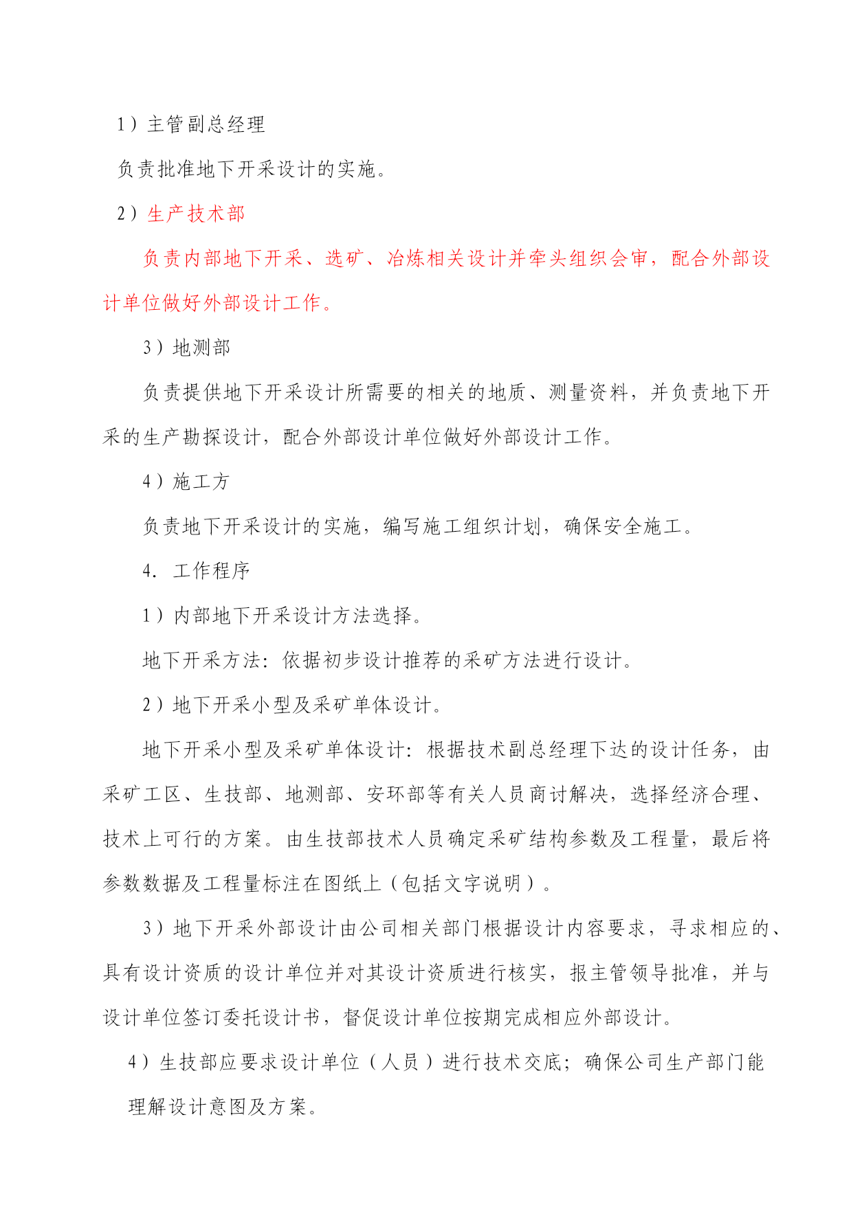 矿山井下安全生产标准化工作矿山井下安全生产标准化的工作内容,按条块的纲纲主要分三个部分:即生产工艺系统安全管理、设备设施安全管理制度和作业现场安全管理,现将三个部分的相关内容和大家共同学习与探讨,首先讲第一个提纲:生产工艺系统安全管理。生产工艺系统安全管理1、设计要求1-1、地下开采设计管理制度1.目的黄金是珍贵的矿产资源,也是一种不可再生的矿产资源,为了经济、合理地开发和利用有限的黄金矿产资源,规范地下开采设计,同时为施工创造良好的作业条件,确保施工安全,因此,根据金属非金属矿山安全标准化建设体系,对地下开采设计管理制度提出了相关要求。2.设计工作及分类地下开采设计分为外部设计和内部设计两种:为什么要区分为外部设计与内部设计?外部设计是指公司内部没有设计资质和能力,由公司委托具有相应资质的设计单位进行设计,包括矿井的开拓设计等;内部设计由公司相关部门技术人员对某一具体工作内容进行的设计,包括采矿单体设计、局部生产勘探设计、局部的工艺改进设计等。3.职责1)主管副总经理负责批准地下开采设计的实施。2)生产技术部负责内部地下开采、选矿、冶炼相关设计并牵头组织会审,配合外部设计单位做好外部设计工作。3)地测部负责提供地下开采设计所需要的相关的地质、测量资料,并负责地下开采的生产勘探设计,配合外部设计单位做好外部设计工作。4)施工方负责地下开采设计的实施,编写施工组织计划,确保安全施工。4.工作程序1)内部地下开采设计方法选择。地下开采方法:依据初步设计推荐的采矿方法进行设计。2)地下开采小型及采矿单体设计。地下开采小型及采矿单体设计:根据技术副总经理下达的设计任务,由采矿工区、生技部、地测部、安环部等有关人员商讨解决,选择经济合理、技术上可行的方案。由生技部技术人员确定采矿结构参数及工程量,最后将参数数据及工程量标注在图纸上(包括文字说明)。3)地下开采外部设计由公司相关部门根据设计内容要求,寻求相应的、具有设计资质的设计单位并对其设计资质进行核实,报主管领导批准,并与设计单位签订委托设计书,督促设计单位按期完成相应外部设计。4)生技部应要求设计单位(人员)进行技术交底;确保公司生产部门能理解设计意图及方案。5)生技部负责保存相关设计文件(图纸)。8.1.2新建、改建、扩建工程“三同时”安全管理制度1.目的规定新建、改建、扩建等建设项目和技术改造工程项目(以下简称建设项目)的安全、环保、设备等"三同时"评审、验收的内容和有关要求。2.范围本制度提出了新、改、扩建项目管理要求,旨在规范项目管理工作;本制度适用于新、改、扩建项目论证、设计、施工、检查、验收等全过程及其相关管理活动。3.引用标准或文件1)《中华人民共和国矿山安全法实施条例》2)《中华人民共和国矿山安全法》3)《中华人民共和国安全生产法》4)《中华人民共和国环境影响评价法》5)非煤矿矿山建设项目安全设施设计审查与竣工验收办法国家安全生产监督管理局令第18号4.职责1)各厂、部负责做管辖范围内小、中型项目的可行性分析报告的编制和设计。2)安全环境部门对建设项目的环境、安全管理进行总体监控,参与新、改、扩建项目设计方案的评审,负责组织、协调、监督新、改、扩建项目,严格执行环境影响和职业健康安全评价制度;安全、环保“三同时”制度;落实建设项目施工环境保护规定和建设项目环境保护竣工验收制度,保证污染物达标排放及达到总量控制要求。3)基建和生产部门负责在工程项目的施工管理中,落实安全、环保项目“三同时”制度,并会同工程监理部门搞好工程监理,做好施工过程现场管理,确保工程质量,采取措施减少工程建设过程中对周围环境产生的不良影响和施工安全。4)财务部负责建设工程中项目的预结算资金落实。5)分管领导负责招集有关部门或人员对项目进行论证、设计输出的评审、预结算编制和竣工验收。6)生产部负责中、小型新、改、扩建项目设计审核和大型新、改、扩建项目委外设计外委。负责项目施工计划的下达。基建项目则由基建部门负责。5.工作程序1)管理项目A.生产部门:矿体开拓、新建排土场等。B.基建部门:矿区范围内的基建工程或其他工程项目。C.项目管理基本流程设计审核项目提出项目可行性分析项目论证项目设计项目投入使用项目验收项目招投标项目施工2)属正常生产中的小型项目不作项目可行性分析报告及论证,直接进行项目设计。3)项目来源A.从员工提出的合理化建议中产生。B.从企业发展规划中产生的要求。C.从优化生产工艺中产生的需要。D.由公司或政府有关部门建议或指令。4)项目可行性分析报告A.项目的可行性分析报告包括:可行的技术方案、经济技术分析、环境影响报告书(表)、职业健康安全报