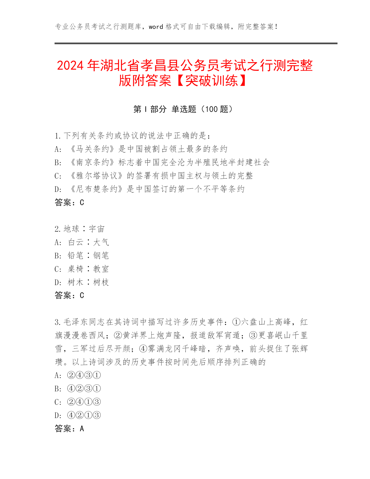2024年湖北省孝昌县公务员考试之行测完整版附答案【突破训练】