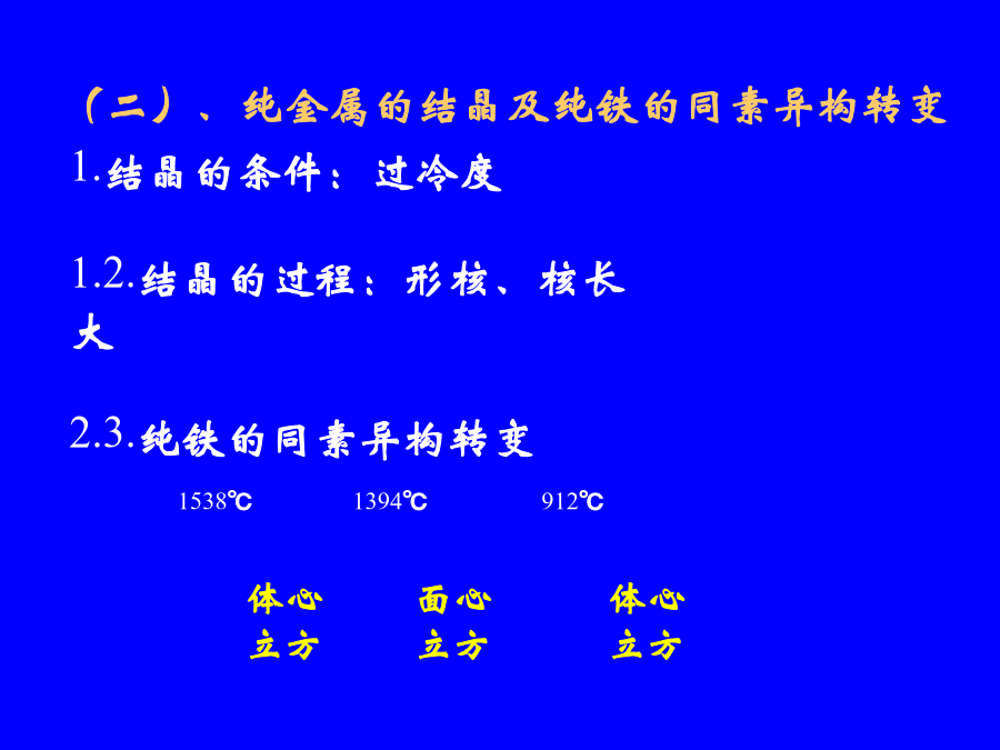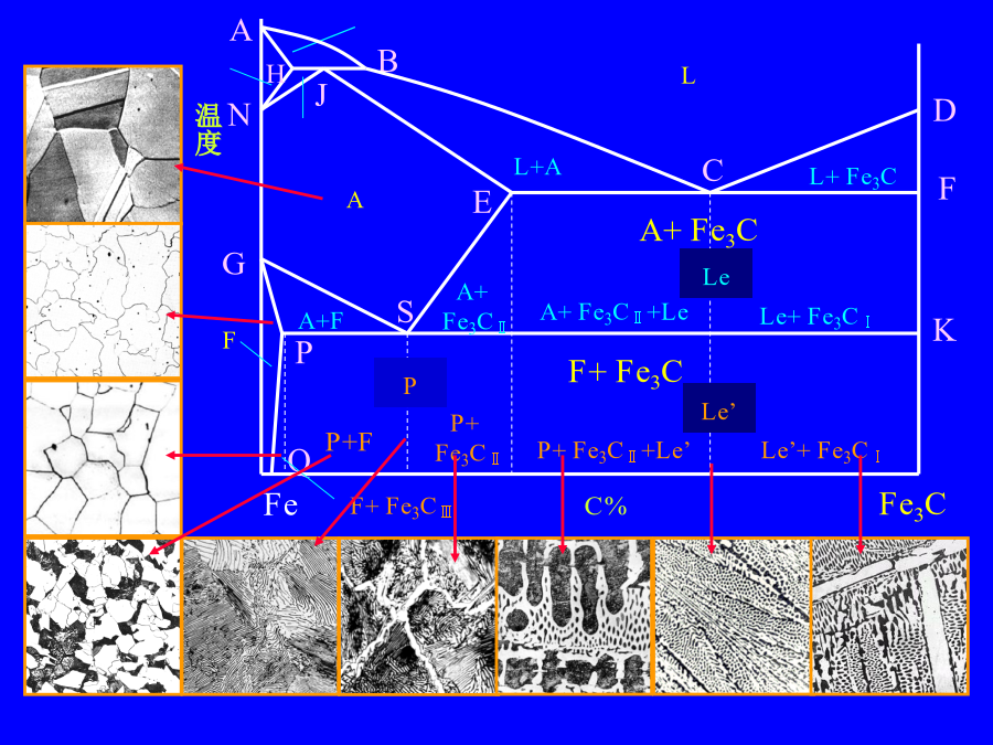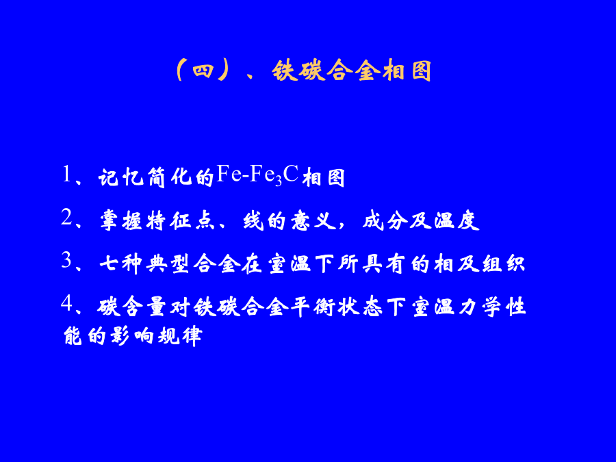 工程材料及成型技术复习1、金属学原理2、钢的热处理3、工程材料4、典型零件的选材、加工路线的制定(一)纯金属的三种晶体结构及三种缺陷点缺陷:空位、间隙原子等线缺陷:位错面缺陷:晶界,亚晶界L⇄-Fe⇄-Fe⇄-Fe固溶体金属化合物1、记忆简化的Fe-Fe3C相图2、掌握特征点、线的意义,成分及温度3、七种典型合金在室温下所具有的相及组织4、碳含量对铁碳合金平衡状态下室温力学性能的影响规律Fe钢>0.9%C,Fe3CⅡ为晶界连续网状,强度下降,但硬度仍上升>2.11%C,组织中有以Fe3C为基的Le’,合金太脆.1、金属塑性变形的方式:滑移与孪生。2、加工硬化概念:随着冷塑性变形量的增加,材料的强度、硬度增加,塑性、韧性下降的现象。3、再结晶:冷变形后的金属重新加热到再结晶温度以上,则金属的组织恢复成等轴状,加工硬化现象消失。4、冷热加工的区别在于加工温度是否高于再结晶温度。包括:钢的热处理原理—C曲线第一步奥氏体晶核形成第二步奥氏体晶核长大第三步残余Fe3C溶解第四步奥氏体的均匀化掌握共析钢(T8钢)的等温冷却及连续冷却曲线,清楚不同的温度下相变(或不同的冷却速度下相变)可以获得不同的组织,并认识组织的特点转变类型钢的热处理工艺:回火的总结加工路线:渗碳处理适于低碳及低碳合金钢(渗碳钢)加工路线:以碳钢、合金钢和铸铁为主要的教学内容掌握:牌号—名称—成分特点—常用热处理—性能特点—应用之间的关系碳钢C<0.25%—低碳钢C在0.25~0.6%—中碳钢C>0.6%—高碳钢牌号:Q235—A、F—普通碳素结构钢45#、20#—优质碳素结构钢(二位数字万分之几作为含碳量)T8、T10、T12—碳素工具钢(一位或两位数字千分之几作为含碳量)合金钢编号原则特点:合金结构钢:二位数字——万分之几作碳量,如20CrMnTi,60Si2Mn合金工具钢:一位数字——千分之几作碳量,如9SiCr,CrWMn(碳量大于1%不标数字)特性钢:同工具钢近似判断钢种1、看前面是几位数字判断大致钢种2、看数字的大小判断具体钢种3、看合金元素的量及种类判断具体钢种铸铁名称铸铁名称综合分析题给定工作条件及对零件的性能要求要求为其选择一种材料并制定加工路线说明每步热处理的目的使用状态下的组织例:汽车变速箱齿轮要求表面62~64HRC,心部38~42HRC,请选择材料并制定加工路线,说明使用状态的组织。1、选20CrMnTi2、加工路线:锻—正火—机加工—渗碳淬火+低温回火—精磨入库3、使用状态组织表面:M针回+Arˊ+碳化物(HRC62~64)心部:M板回+(F)(HRC38~40)铸造工艺锻压焊接