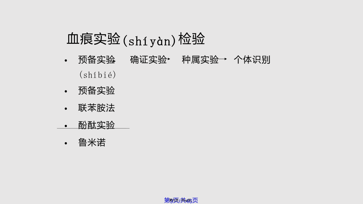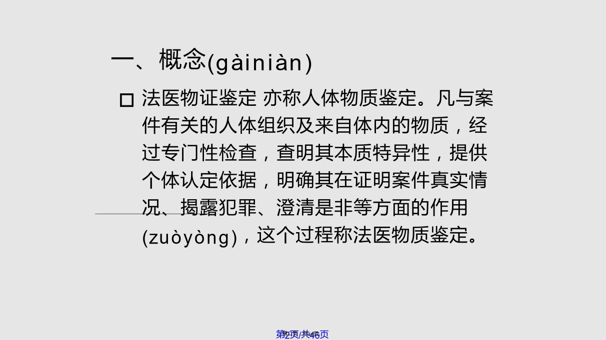 第一节一、概念(gàiniàn)二、法医物证鉴定(jiàndìng)的范围三、法医物证(wùzhèng)鉴定的任务第二节第三节一、血液(xuèyè)和血痕的鉴定血痕实验(shíyàn)检验种属实验免疫(miǎnyì)反应:抗原+抗体凝集反应个体识别ABO血型及DNA鉴定出血部位的鉴定根据血液中的组织细胞来进行鉴定二、精液(jīngyè)、精斑的鉴定三、唾液(tuòyè)(斑)鉴定四、尿液(斑)检验(jiǎnyàn)五、毛发(máofà)鉴定六、骨骼、牙齿(yáchǐ)鉴定六、骨骼(gǔgé)、牙齿鉴定七、人体(réntǐ)物质的DNA鉴定首起亲子鉴定(qīnzǐjiàndìnɡ)案的应用首起刑事案件(xínɡshìànjiàn)的应用人体(réntǐ)23对染色体DNA的分子结构(fēnzǐjiéɡòu)二、DNA分析技术(jìshù)用于法医的依据三、DNA多态性DNA长度(chángdù)多态性长度多态性分为(fēnwéi):小卫星DNA、微卫星DNA(STR)四、DNA多态性检测(jiǎncè)方法STR--PCR技术(jìshù)碎尸案核DNA与线粒体DNA线粒体DNADNA芯片(xīnpiàn)技术第四节内容(nèiróng)总结