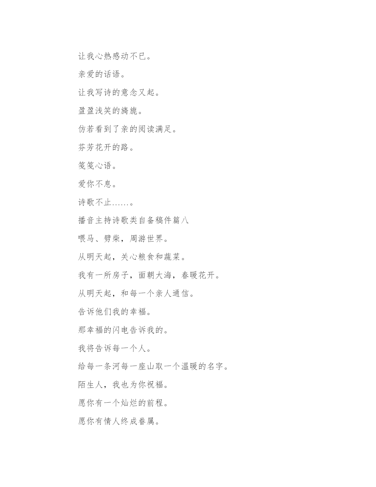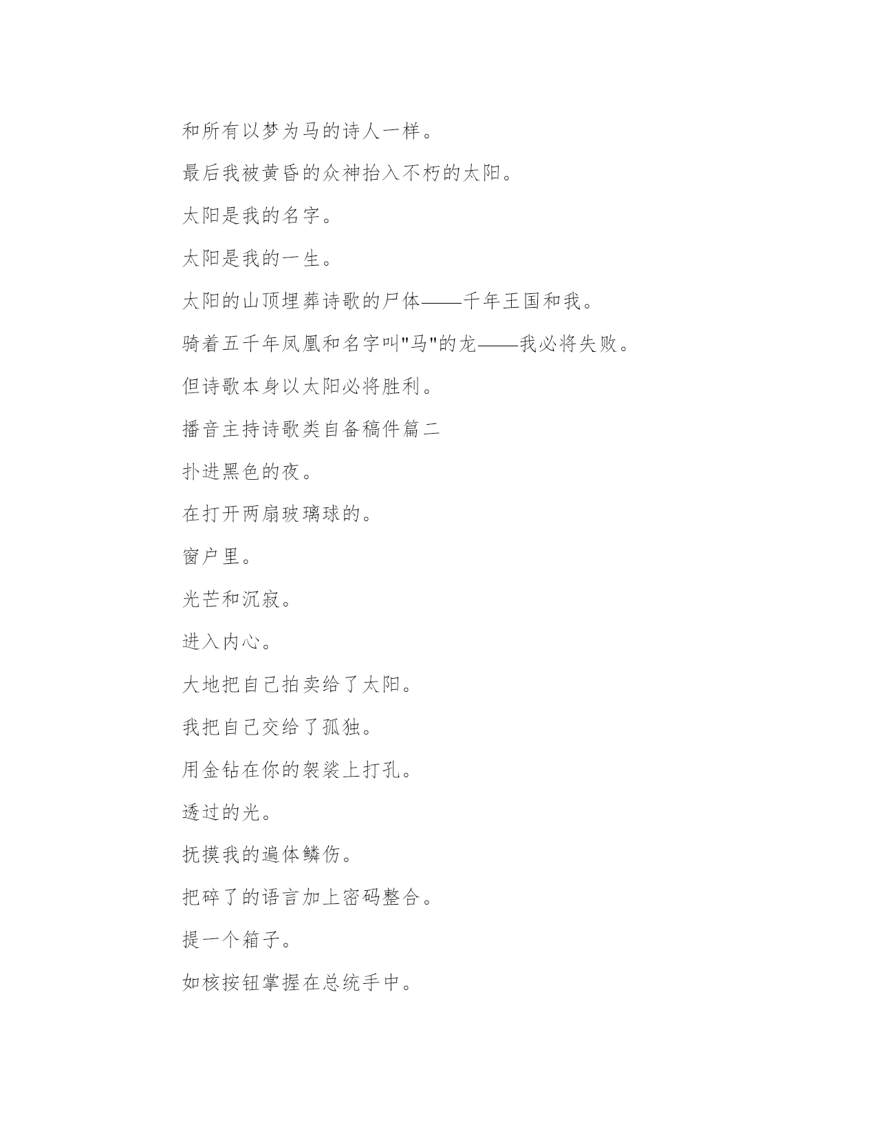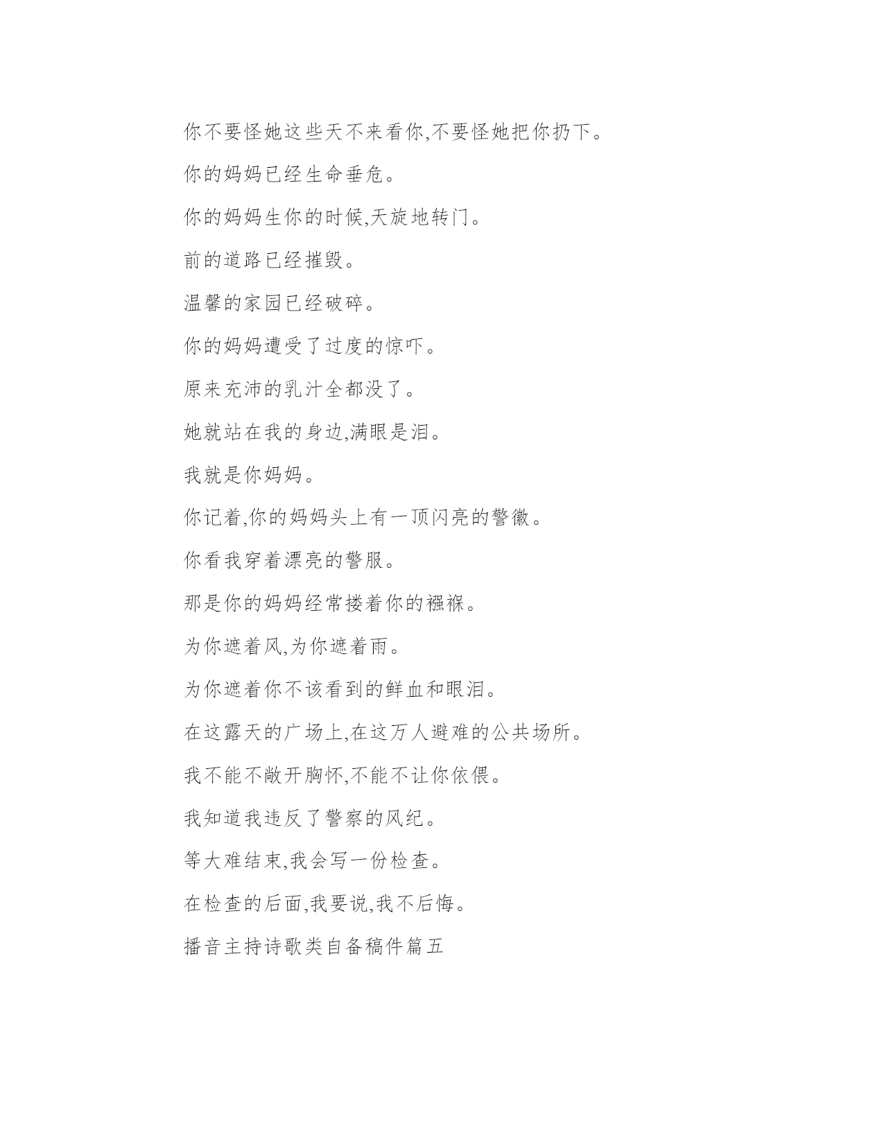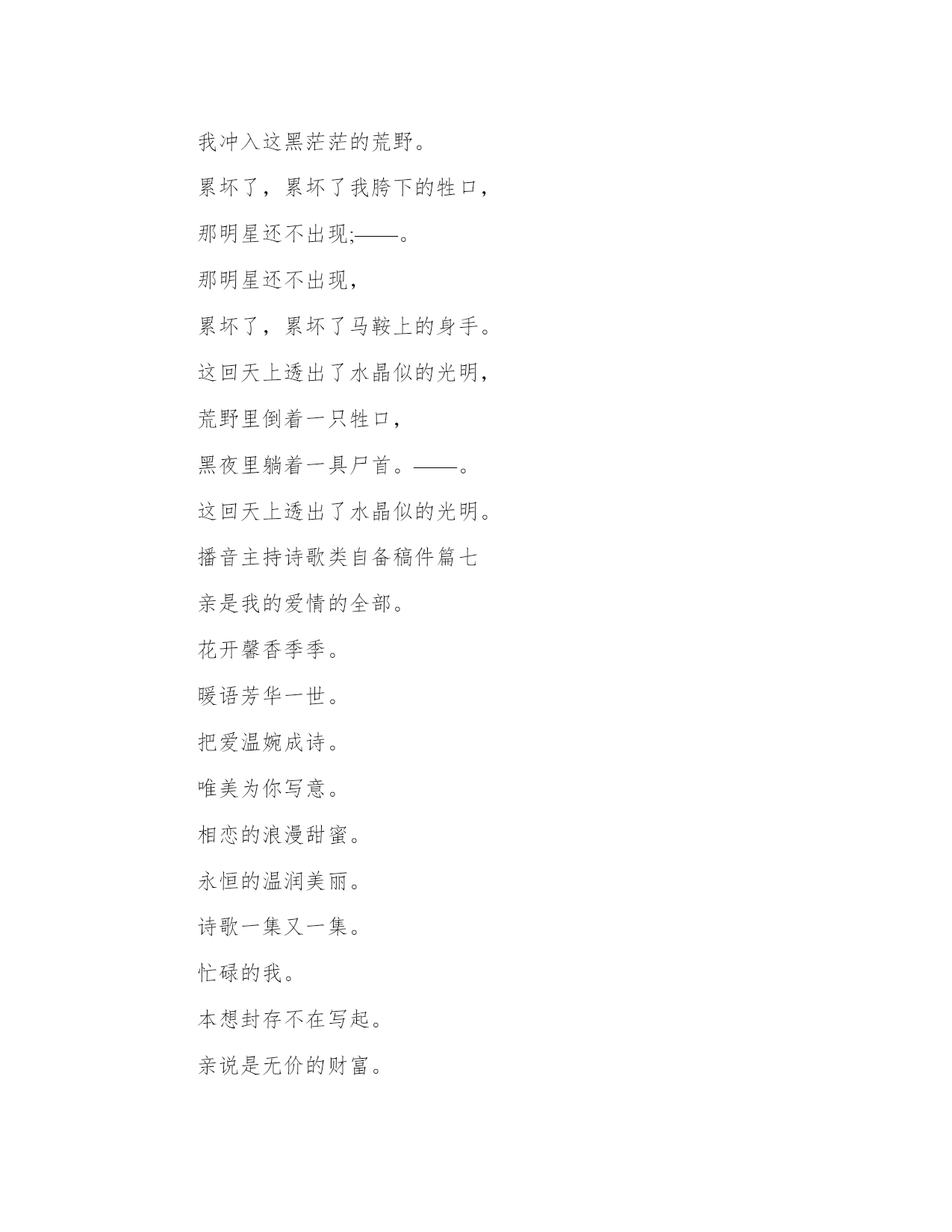 播音主持诗歌类自备稿件(精选10篇)无论是在学习还是工作上,我们都需要不断提升自己。总结不仅要描述事实,还要分析原因和总结经验。下面是一些总结范文的精选,供大家参考和学习。播音主持诗歌类自备稿件篇一和物质的短暂情人。和所有以梦为马的诗人一样。我不得不和烈士和小丑走在同一道路上。万人都要将火熄灭。我一人独将此火高高举起。此火为大开花落英于神圣的祖国。和所有以梦为马的诗人一样。我借此火得度一生的茫茫黑夜。此火为大祖国的语言和乱石投筑的梁山城寨。以梦为土的敦煌——那七月也会寒冷的骨骼。如雪白的柴和坚硬的条条白雪。横放在众神之山。和所有以梦为马的诗人一样。我投入此火这三者是囚禁我的灯盏吐出光辉。万人都要从我刀口走过去建筑祖国的语言。我甘愿一切从头开始。和所有以梦为马的诗人一样。我也愿将牢底坐穿。众神创造物中只有我最易朽带着不可抗拒的死亡的速度。只有粮食是我珍爱。我将她紧紧抱住抱住她在故乡生儿育女。和所有以梦为马的诗人一样。我也愿将自己埋葬在四周高高的山上守望平静的家园。面对大河我无限惭愧。我年华虚度空有一身疲倦。和所有以梦为马的诗人一样。岁月易逝一滴不剩。水滴中有一匹马儿一命归天。千年后如若我再生于祖国的河岸。千年后我再次拥有中国的稻田和周天子的雪山。天马踢踏。和所有以梦为马的诗人一样。我选择永恒的事业。我的事业就是要成为太阳的一生。他从古至今日。他无比辉煌无比光明。和所有以梦为马的诗人一样。最后我被黄昏的众神抬入不朽的太阳。太阳是我的名字。太阳是我的一生。太阳的山顶埋葬诗歌的尸体——千年王国和我。骑着五千年凤凰和名字叫"马"的龙——我必将失败。但诗歌本身以太阳必将胜利。播音主持诗歌类自备稿件篇二扑进黑色的夜。在打开两扇玻璃球的。窗户里。光芒和沉寂。进入内心。大地把自己拍卖给了太阳。我把自己交给了孤独。用金钻在你的袈裟上打孔。透过的光。抚摸我的遍体鳞伤。把碎了的语言加上密码整合。提一个箱子。如核按钮掌握在总统手中。核武器可以消灭肉体。你呀,可以拯救我的灵魂。敲击你嘴里的化石。我不是盗墓者。棺材里织就的云锦。在我的头上闪光。播音主持诗歌类自备稿件篇三人间不见天上有。西施魂。王嫱手。黛玉春心嫦娥袖。远似烟。一抹清淡几许愁。近如梦。万缕相思一茎柔。小饮三月杏花雨。绿在枝头。狂在心头。雨斜风悠悠。自在舞。俏藏羞。一身朴素。万种风流。耐得三九争九九。春未来。冬未走。四九。河边看柳。笑自雅。情自幽。离人无心插。眠芽着意抽。芬芳春梦醒难收。醉了草岸醉汀洲。绿报春。黄报秋。一身仃伶。报与人间风雪骤。不知君见否。村前后。溪左右。故乡处处有。柳柳柳……。播音主持诗歌类自备稿件篇四我就是你的妈妈。到我怀里来,静静靠着我的胸口。像妈妈一样温暖的胸口。有你熟悉的妈妈的气息。有你可口的妈妈的.乳汁。一样的芬芳,一样的甜美。让我看着你吃饱了乖乖的摸样。就像看到已经很久没有见面的。哪个在家里的儿子。已经六天了,九个婴儿,九个原因。突然断了母亲的奶水。五月的大地洒落无助的蓓蕾。那个把你生下来的妈妈。已经去天堂了。她真的是不想离开你,她知道天堂的路有多远。这一去就再不能回。你那在废墟中受伤的妈妈。一直在医院里昏迷不醒。她不能给你喂奶了。你不要怪她这些天不来看你,不要怪她把你扔下。你的妈妈已经生命垂危。你的妈妈生你的时候,天旋地转门。前的道路已经摧毁。温馨的家园已经破碎。你的妈妈遭受了过度的惊吓。原来充沛的乳汁全都没了。她就站在我的身边,满眼是泪。我就是你妈妈。你记着,你的妈妈头上有一顶闪亮的警徽。你看我穿着漂亮的警服。那是你的妈妈经常搂着你的襁褓。为你遮着风,为你遮着雨。为你遮着你不该看到的鲜血和眼泪。在这露天的广场上,在这万人避难的公共场所。我不能不敞开胸怀,不能不让你依偎。我知道我违反了警察的风纪。等大难结束,我会写一份检查。在检查的后面,我要说,我不后悔。播音主持诗歌类自备稿件篇五千里之行,始于足下。既然选择远方,唯有风雨兼程。人生的道路总是充满坎坷,荆棘丛生,没有那么一帆风顺,但是所有走过的路在往后都会渐渐沉淀,成为一笔宝贵财富。遇到分叉路时,莫慌张,取舍之间,游刃有余。走错路时,莫害怕,总能找到正确的那一条。走上坡路时,要坚韧不拔,谦虚谨慎。走下坡路时,也别失了尊严。人生路需要勇气,坚定不移的走下去,再苦自己尝,冷暖自知。人生路需要豁达,走到无路可走时,要相信“车到山前必有路”。人生路要有耐心,走稳一些,不急躁。有些路不可一步登天,走走停停,顺其自然。敢作敢为,豁达通透。
