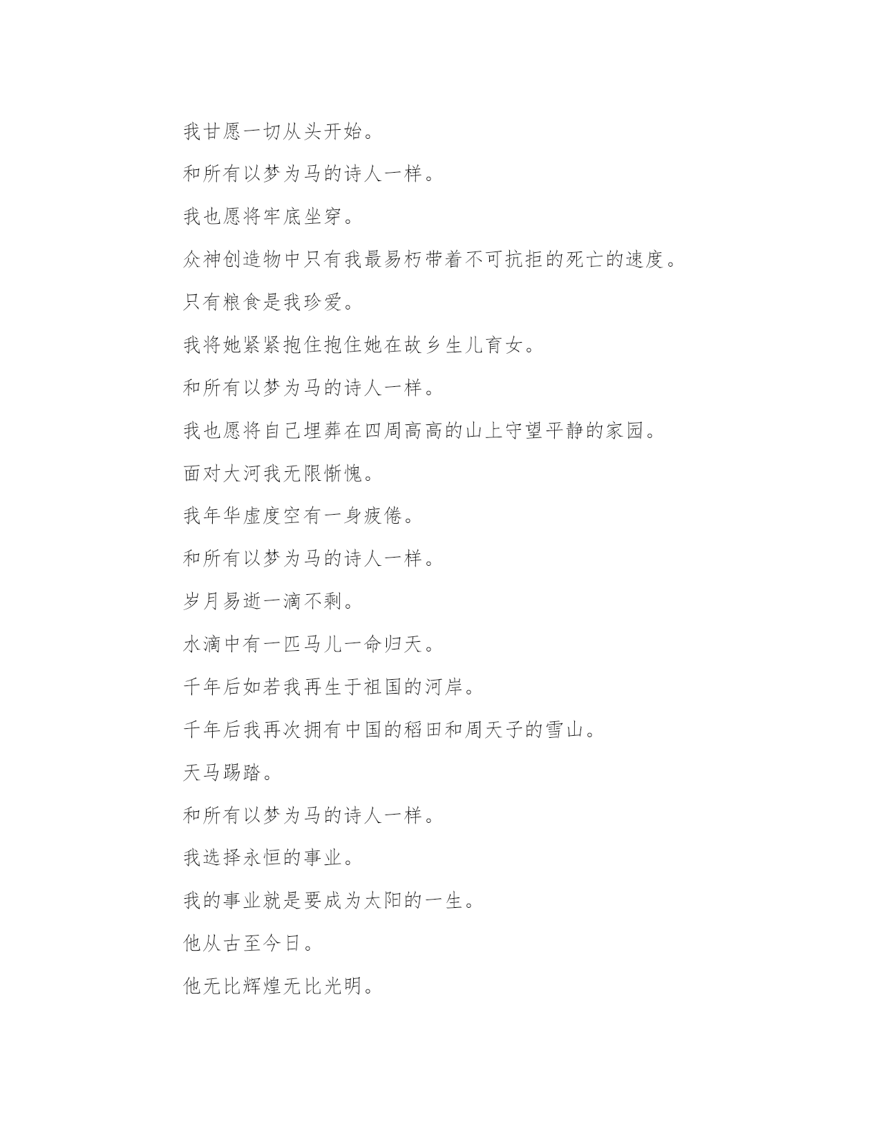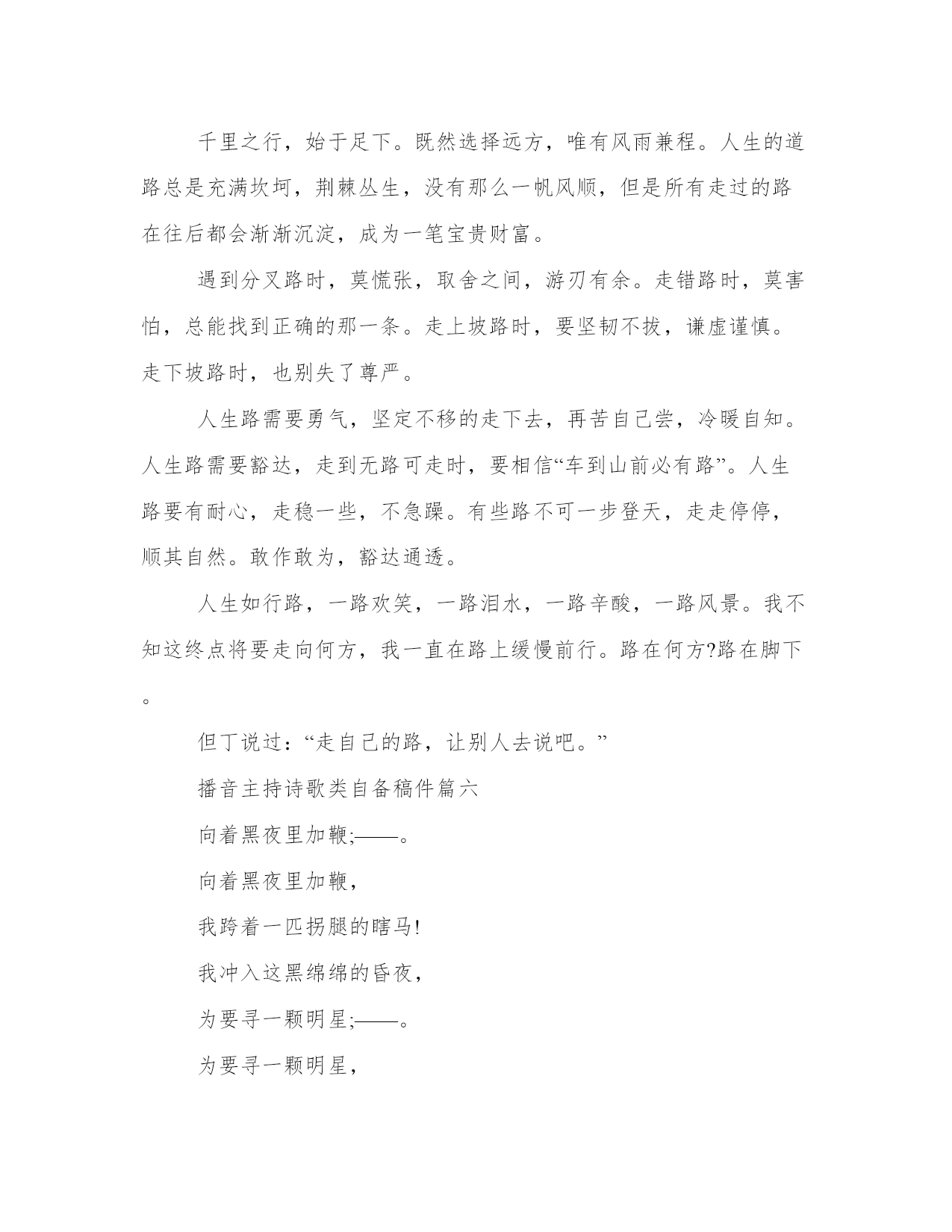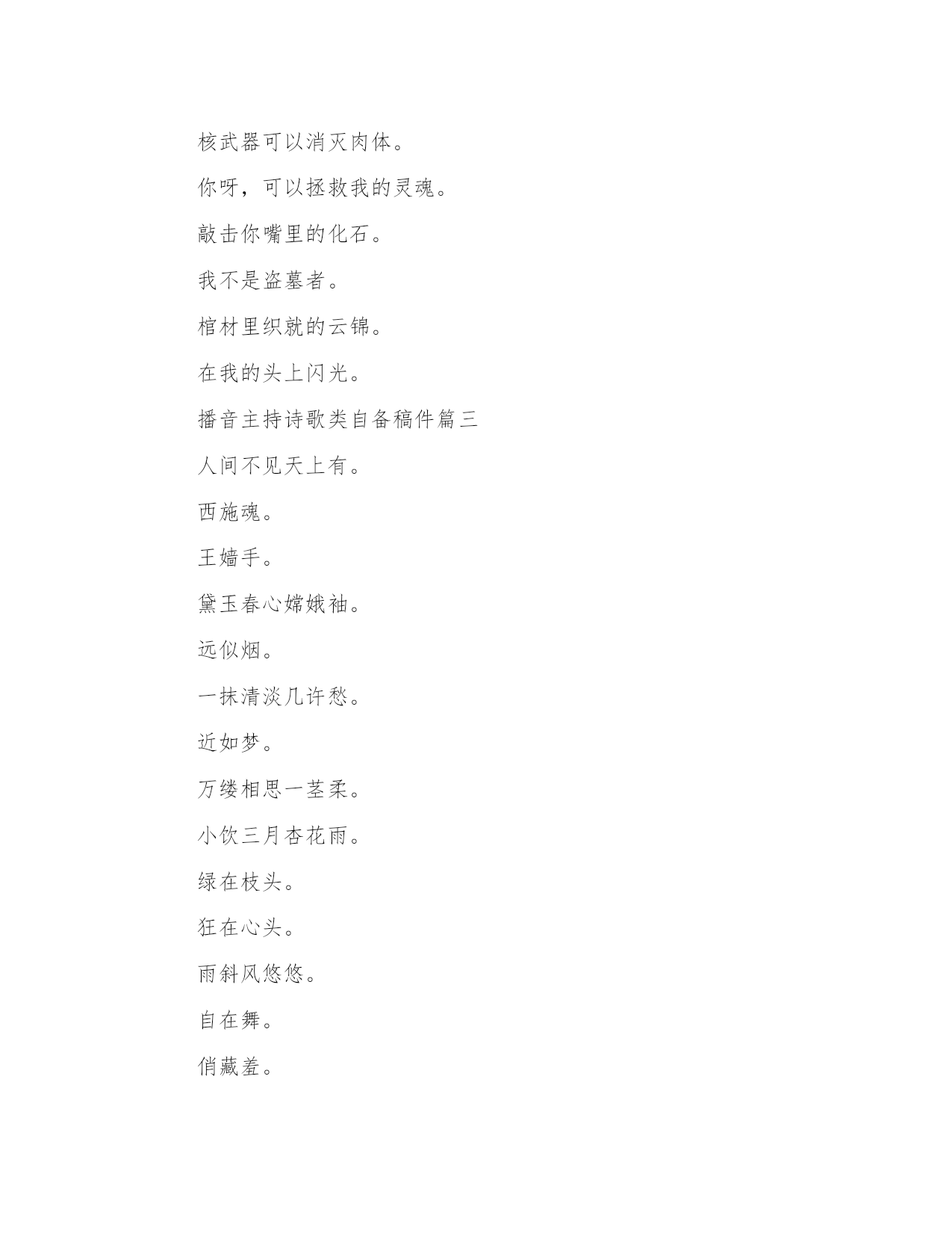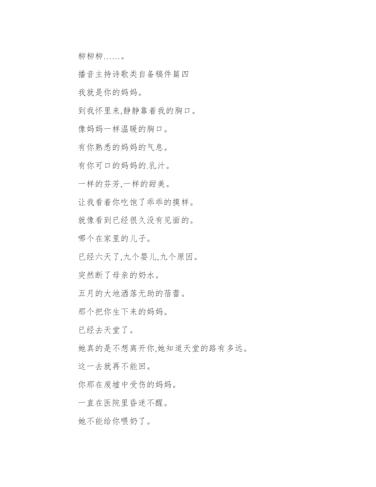 播音主持诗歌类自备稿件(精选10篇)无论是在学习还是工作上,我们都需要不断提升自己。总结不仅要描述事实,还要分析原因和总结经验。下面是一些总结范文的精选,供大家参考和学习。播音主持诗歌类自备稿件篇一和物质的短暂情人。和所有以梦为马的诗人一样。我不得不和烈士和小丑走在同一道路上。万人都要将火熄灭。我一人独将此火高高举起。此火为大开花落英于神圣的祖国。和所有以梦为马的诗人一样。我借此火得度一生的茫茫黑夜。此火为大祖国的语言和乱石投筑的梁山城寨。以梦为土的敦煌——那七月也会寒冷的骨骼。如雪白的柴和坚硬的条条白雪。横放在众神之山。和所有以梦为马的诗人一样。我投入此火这三者是囚禁我的灯盏吐出光辉。万人都要从我刀口走过去建筑祖国的语言。我甘愿一切从头开始。和所有以梦为马的诗人一样。我也愿将牢底坐穿。众神创造物中只有我最易朽带着不可抗拒的死亡的速度。只有粮食是我珍爱。我将她紧紧抱住抱住她在故乡生儿育女。和所有以梦为马的诗人一样。我也愿将自己埋葬在四周高高的山上守望平静的家园。面对大河我无限惭愧。我年华虚度空有一身疲倦。和所有以梦为马的诗人一样。岁月易逝一滴不剩。水滴中有一匹马儿一命归天。千年后如若我再生于祖国的河岸。千年后我再次拥有中国的稻田和周天子的雪山。天马踢踏。和所有以梦为马的诗人一样。我选择永恒的事业。我的事业就是要成为太阳的一生。他从古至今日。他无比辉煌无比光明。和所有以梦为马的诗人一样。最后我被黄昏的众神抬入不朽的太阳。太阳是我的名字。太阳是我的一生。太阳的山顶埋葬诗歌的尸体——千年王国和我。骑着五千年凤凰和名字叫"马"的龙——我必将失败。但诗歌本身以太阳必将胜利。播音主持诗歌类自备稿件篇二扑进黑色的夜。在打开两扇玻璃球的。窗户里。光芒和沉寂。进入内心。大地把自己拍卖给了太阳。我把自己交给了孤独。用金钻在你的袈裟上打孔。透过的光。抚摸我的遍体鳞伤。把碎了的语言加上密码整合。提一个箱子。如核按钮掌握在总统手中。核武器可以消灭肉体。你呀,可以拯救我的灵魂。敲击你嘴里的化石。我不是盗墓者。棺材里织就的云锦。在我的头上闪光。播音主持诗歌类自备稿件篇三人间不见天上有。西施魂。王嫱手。黛玉春心嫦娥袖。远似烟。一抹清淡几许愁。近如梦。万缕相思一茎柔。小饮三月杏花雨。绿在枝头。狂在心头。雨斜风悠悠。自在舞。俏藏羞。一身朴素。万种风流。耐得三九争九九。春未来。冬未走。四九。河边看柳。笑自雅。情自幽。离人无心插。眠芽着意抽。芬芳春梦醒难收。醉了草岸醉汀洲。绿报春。黄报秋。一身仃伶。报与人间风雪骤。不知君见否。村前后。溪左右。故乡处处有。柳柳柳……。播音主持诗歌类自备稿件篇四我就是你的妈妈。到我怀里来,静静靠着我的胸口。像妈妈一样温暖的胸口。有你熟悉的妈妈的气息。有你可口的妈妈的.乳汁。一样的芬芳,一样的甜美。让我看着你吃饱了乖乖的摸样。就像看到已经很久没有见面的。哪个在家里的儿子。已经六天了,九个婴儿,九个原因。突然断了母亲的奶水。五月的大地洒落无助的蓓蕾。那个把你生下来的妈妈。已经去天堂了。她真的是不想离开你,她知道天堂的路有多远。这一去就再不能回。你那在废墟中受伤的妈妈。一直在医院里昏迷不醒。她不能给你喂奶了。你不要怪她这些天不来看你,不要怪她把你扔下。你的妈妈已经生命垂危。你的妈妈生你的时候,天旋地转门。前的道路已经摧毁。温馨的家园已经破碎。你的妈妈遭受了过度的惊吓。原来充沛的乳汁全都没了。她就站在我的身边,满眼是泪。我就是你妈妈。你记着,你的妈妈头上有一顶闪亮的警徽。你看我穿着漂亮的警服。那是你的妈妈经常搂着你的襁褓。为你遮着风,为你遮着雨。为你遮着你不该看到的鲜血和眼泪。在这露天的广场上,在这万人避难的公共场所。我不能不敞开胸怀,不能不让你依偎。我知道我违反了警察的风纪。等大难结束,我会写一份检查。在检查的后面,我要说,我不后悔。播音主持诗歌类自备稿件篇五千里之行,始于足下。既然选择远方,唯有风雨兼程。人生的道路总是充满坎坷,荆棘丛生,没有那么一帆风顺,但是所有走过的路在往后都会渐渐沉淀,成为一笔宝贵财富。遇到分叉路时,莫慌张,取舍之间,游刃有余。走错路时,莫害怕,总能找到正确的那一条。走上坡路时,要坚韧不拔,谦虚谨慎。走下坡路时,也别失了尊严。人生路需要勇气,坚定不移的走下去,再苦自己尝,冷暖自知。人生路需要豁达,走到无路可走时,要相信“车到山前必有路”。人生路要有耐心,走稳一些,不急躁。有些路不可一步登天,走走停停,顺其自然。敢作敢为,豁达通透。