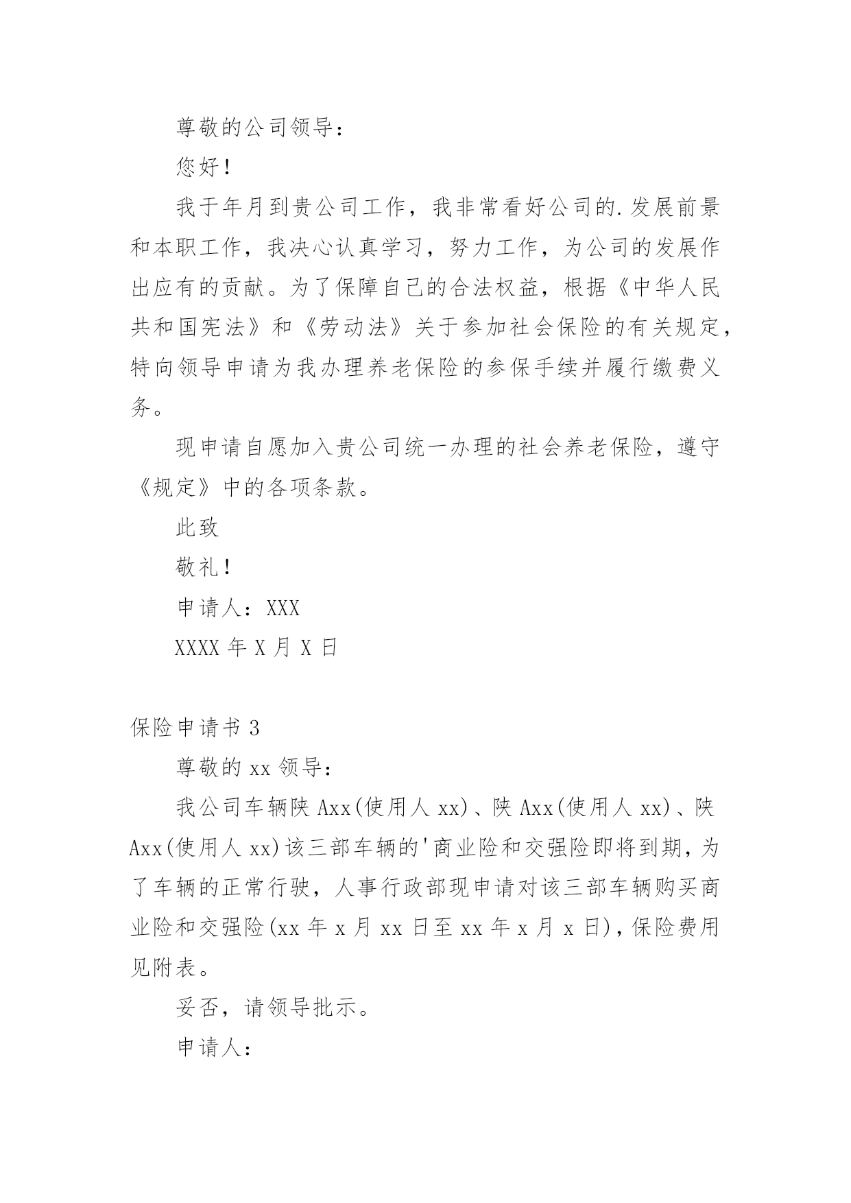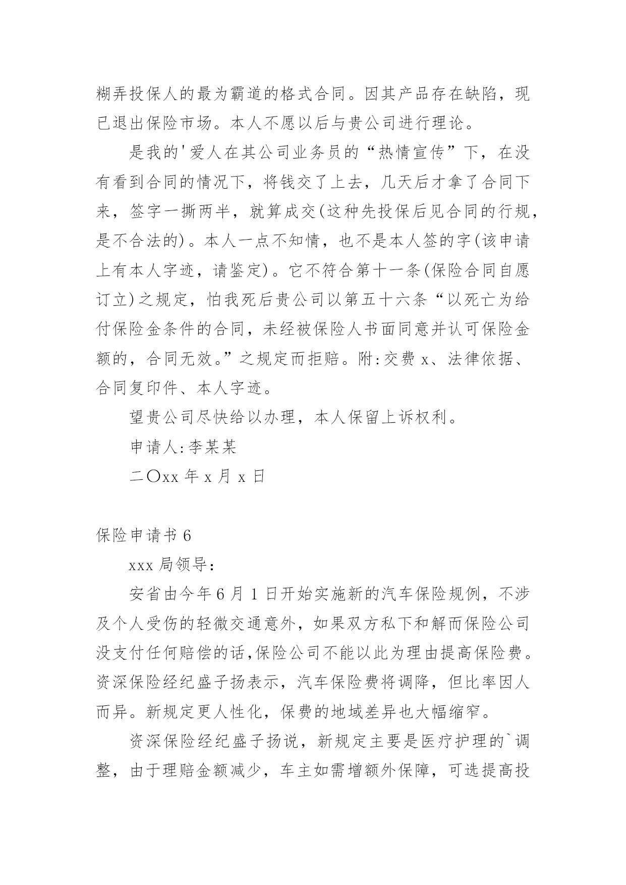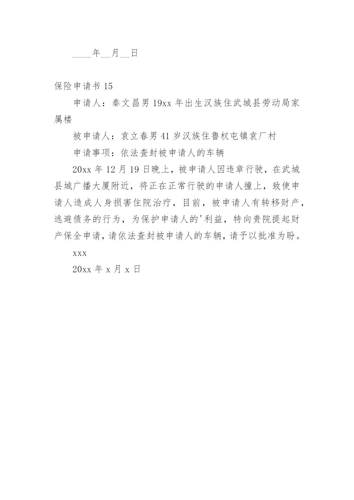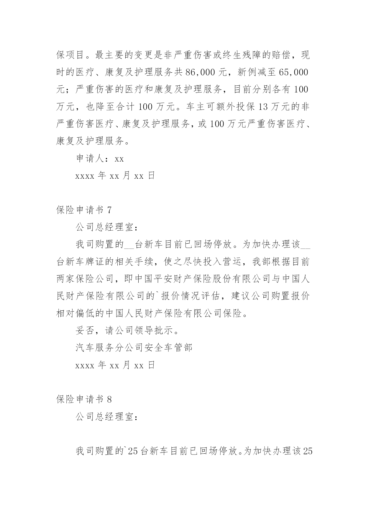 保险申请书保险申请书15篇随着社会在进步,申请书与我们的生活息息相关,我们在写申请书的时候要注意态度要诚恳、朴实。写申请书需要注意哪些问题呢?以下是小编收集整理的保险申请书,仅供参考,欢迎大家阅读。保险申请书1xxx市社会保险基金结算中心:xx市建筑工程公司是一家隶属于鄂州市住建委的二级建筑施工企业,目前公司的安全生产许可证于5月23日到期,需办理延期手续,延期材料中有一项要求达到150人工伤保险的指标性条件,如没有按期送达安全生产许可证的`延期报审资料,我公司所属的全部工程项目将面临停工停产的局面,特别是20zxz年市属的重点工程,这样势必会给各级领导造成不必要的麻烦和社会的不安定,为了保证企业能正常经营运转,确保市属项目正常交付使用和广大务工人员的安定,我公司特向贵中心申请办理工伤保险。请予批准为感!xx市建筑工程公司年月日保险申请书2尊敬的公司领导:您好!我于年月到贵公司工作,我非常看好公司的.发展前景和本职工作,我决心认真学习,努力工作,为公司的发展作出应有的贡献。为了保障自己的合法权益,根据《中华人民共和国宪法》和《劳动法》关于参加社会保险的有关规定,特向领导申请为我办理养老保险的参保手续并履行缴费义务。现申请自愿加入贵公司统一办理的社会养老保险,遵守《规定》中的各项条款。此致敬礼!申请人:XXXXXXX年X月X日保险申请书3尊敬的xx领导:我公司车辆陕Axx(使用人xx)、陕Axx(使用人xx)、陕Axx(使用人xx)该三部车辆的'商业险和交强险即将到期,为了车辆的正常行驶,人事行政部现申请对该三部车辆购买商业险和交强险(xx年x月xx日至xx年x月x日),保险费用见附表。妥否,请领导批示。申请人:xx年xx月xx日保险申请书4社会劳动保险局:本人xxx,性别,生于xxx年月日。属城镇居民,由于年老体弱、无固定经济收入,养老问题一直没有保障,虽然目前已超过参保年龄,但我参保缴费的愿望很迫切,仍想参加企业职工养老保险。依照相关政策规定,本个自愿申请延迟享受养老保险待遇(退休)时间,从xxx年月起补缴养老保险费,待缴费年限满十五年后办理相关手续,望贵局领导批准为盼。申请人:xx年x月x日保险申请书5尊敬的x××保险股份有限公司××区支公司:参保人:李某某,男。家住雁x区某中学宿舍。保险合同号:xx-xxxxx-sxxx-0000xxxx-x(1080。00元/年)和xx-xxxxx-sxxx-00000xxx-x(990。00元/年)。退保原因:有些条款中的表述意思含混不清,有一定的欺诈x。如“心脏病(心肌梗塞)”。该公司不守信誉,要投保人打官司才能获得赔付。条款中对心肌梗塞的诊断标准不公平、不合理。是一个糊弄投保人的最为霸道的格式合同。因其产品存在缺陷,现已退出保险市场。本人不愿以后与贵公司进行理论。是我的'爱人在其公司业务员的“热情宣传”下,在没有看到合同的情况下,将钱交了上去,几天后才拿了合同下来,签字一撕两半,就算成交(这种先投保后见合同的行规,是不合法的)。本人一点不知情,也不是本人签的字(该申请上有本人字迹,请鉴定)。它不符合第十一条(保险合同自愿订立)之规定,怕我死后贵公司以第五十六条“以死亡为给付保险金条件的合同,未经被保险人书面同意并认可保险金额的,合同无效。”之规定而拒赔。附:交费x、法律依据、合同复印件、本人字迹。望贵公司尽快给以办理,本人保留上诉权利。申请人:李某某二〇xx年x月x日保险申请书6xxx局领导:安省由今年6月1日开始实施新的汽车保险规例,不涉及个人受伤的轻微交通意外,如果双方私下和解而保险公司没支付任何赔偿的话,保险公司不能以此为理由提高保险费。资深保险经纪盛子扬表示,汽车保险费将调降,但比率因人而异。新规定更人性化,保费的地域差异也大幅缩窄。资深保险经纪盛子扬说,新规定主要是医疗护理的`调整,由于理赔金额减少,车主如需增额外保障,可选提高投保项目。最主要的变更是非严重伤害或终生残障的赔偿,现时的医疗、康复及护理服务共86,000元,新例减至65,000元;严重伤害的医疗和康复及护理服务,目前分别各有100万元,也降至合计100万元。车主可额外投保13万元的非严重伤害医疗、康复及护理服务,或100万元严重伤害医疗、康复及护理服务。申请人:xxxxxx年xx月xx日保险申请书7公司总经理室:我司购置的__台新车目前已回场停放。为加快办理该__台新车牌证的相关手续,使之尽快投入营运,我部根据目前两家保险公司,即中国平安财产保险股份有限公司与中国人民财产保险有限公司的`报价情况评估,建议公司购置报价相对偏低的中国人民财产保险有限公司保险。妥否,请公司领导批示。汽车服务分公司安全车管部xxxx年xx月xx日保险申请书8公司总经理室:我司购置的`25台新车目前已回场停放。为加快办理该25