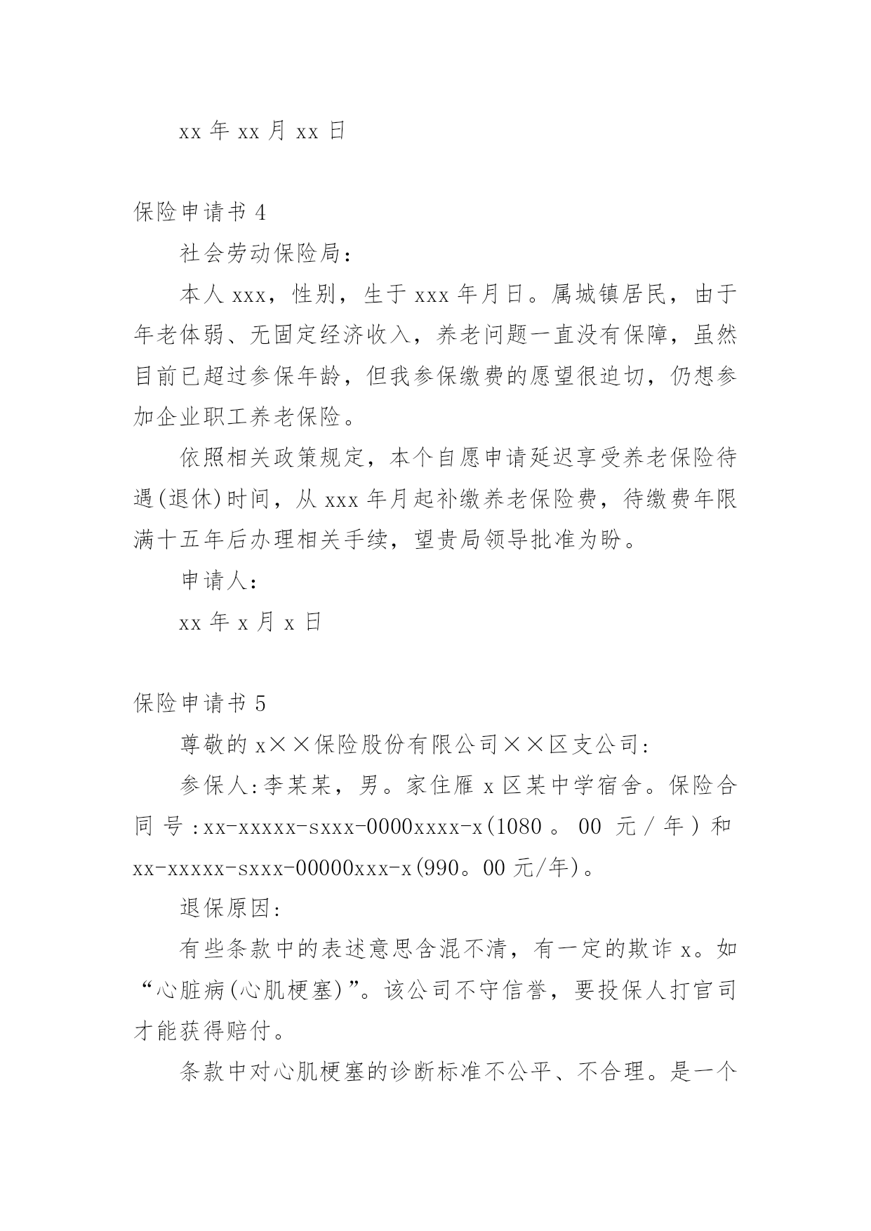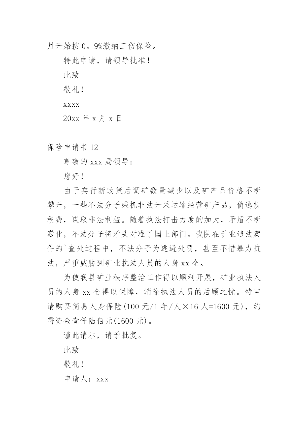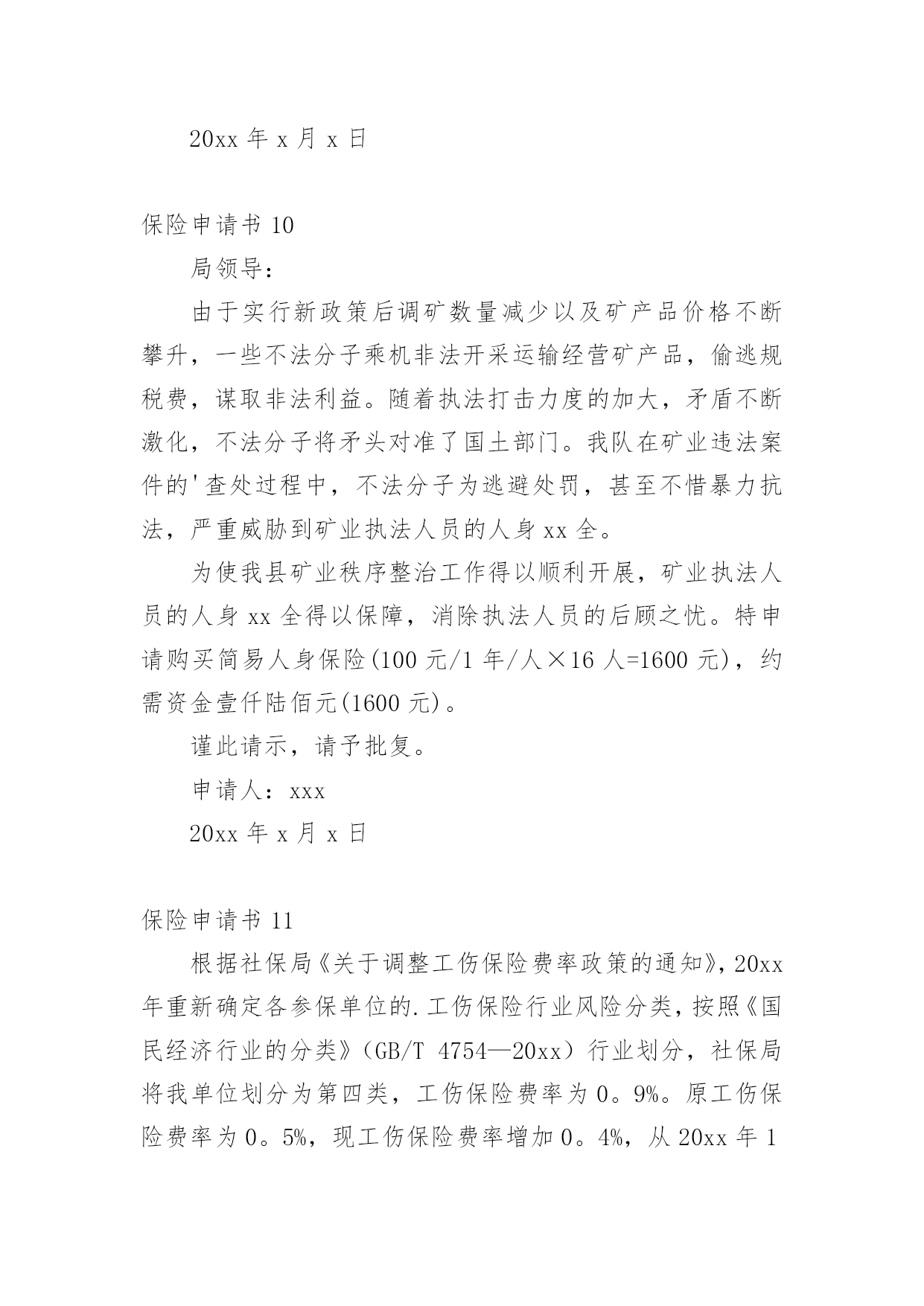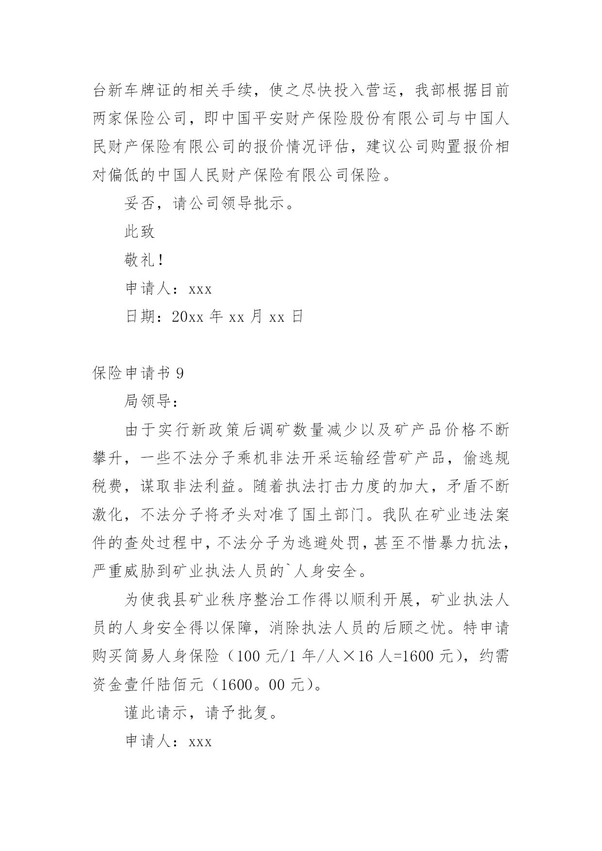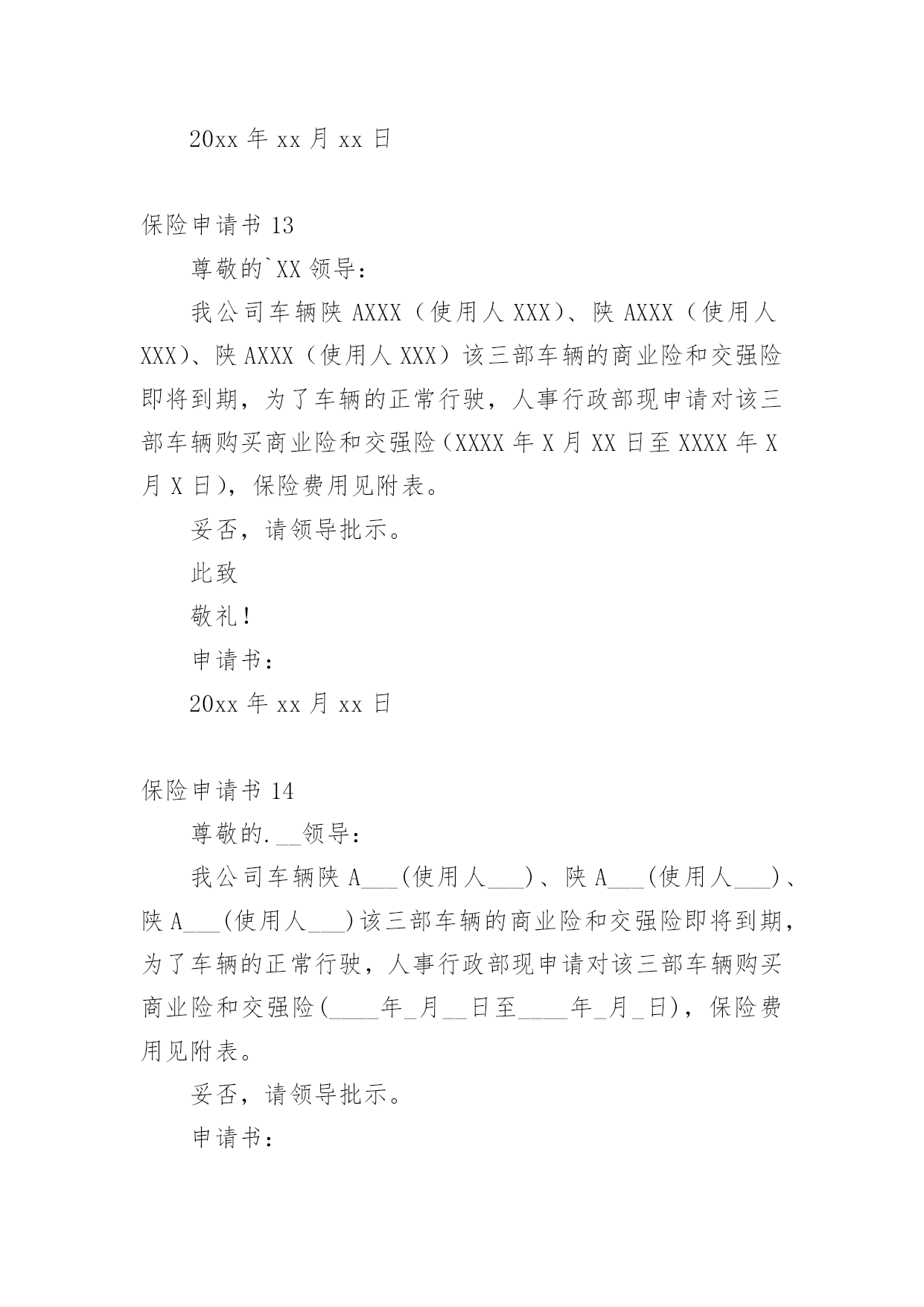 保险申请书保险申请书15篇随着社会在进步,申请书与我们的生活息息相关,我们在写申请书的时候要注意态度要诚恳、朴实。写申请书需要注意哪些问题呢?以下是小编收集整理的保险申请书,仅供参考,欢迎大家阅读。保险申请书1xxx市社会保险基金结算中心:xx市建筑工程公司是一家隶属于鄂州市住建委的二级建筑施工企业,目前公司的安全生产许可证于5月23日到期,需办理延期手续,延期材料中有一项要求达到150人工伤保险的指标性条件,如没有按期送达安全生产许可证的`延期报审资料,我公司所属的全部工程项目将面临停工停产的局面,特别是20zxz年市属的重点工程,这样势必会给各级领导造成不必要的麻烦和社会的不安定,为了保证企业能正常经营运转,确保市属项目正常交付使用和广大务工人员的安定,我公司特向贵中心申请办理工伤保险。请予批准为感!xx市建筑工程公司年月日保险申请书2尊敬的公司领导:您好!我于年月到贵公司工作,我非常看好公司的.发展前景和本职工作,我决心认真学习,努力工作,为公司的发展作出应有的贡献。为了保障自己的合法权益,根据《中华人民共和国宪法》和《劳动法》关于参加社会保险的有关规定,特向领导申请为我办理养老保险的参保手续并履行缴费义务。现申请自愿加入贵公司统一办理的社会养老保险,遵守《规定》中的各项条款。此致敬礼!申请人:XXXXXXX年X月X日保险申请书3尊敬的xx领导:我公司车辆陕Axx(使用人xx)、陕Axx(使用人xx)、陕Axx(使用人xx)该三部车辆的'商业险和交强险即将到期,为了车辆的正常行驶,人事行政部现申请对该三部车辆购买商业险和交强险(xx年x月xx日至xx年x月x日),保险费用见附表。妥否,请领导批示。申请人:xx年xx月xx日保险申请书4社会劳动保险局:本人xxx,性别,生于xxx年月日。属城镇居民,由于年老体弱、无固定经济收入,养老问题一直没有保障,虽然目前已超过参保年龄,但我参保缴费的愿望很迫切,仍想参加企业职工养老保险。依照相关政策规定,本个自愿申请延迟享受养老保险待遇(退休)时间,从xxx年月起补缴养老保险费,待缴费年限满十五年后办理相关手续,望贵局领导批准为盼。申请人:xx年x月x日保险申请书5尊敬的x××保险股份有限公司××区支公司:参保人:李某某,男。家住雁x区某中学宿舍。保险合同号:xx-xxxxx-sxxx-0000xxxx-x(1080。00元/年)和xx-xxxxx-sxxx-00000xxx-x(990。00元/年)。退保原因:有些条款中的表述意思含混不清,有一定的欺诈x。如“心脏病(心肌梗塞)”。该公司不守信誉,要投保人打官司才能获得赔付。条款中对心肌梗塞的诊断标准不公平、不合理。是一个糊弄投保人的最为霸道的格式合同。因其产品存在缺陷,现已退出保险市场。本人不愿以后与贵公司进行理论。是我的'爱人在其公司业务员的“热情宣传”下,在没有看到合同的情况下,将钱交了上去,几天后才拿了合同下来,签字一撕两半,就算成交(这种先投保后见合同的行规,是不合法的)。本人一点不知情,也不是本人签的字(该申请上有本人字迹,请鉴定)。它不符合第十一条(保险合同自愿订立)之规定,怕我死后贵公司以第五十六条“以死亡为给付保险金条件的合同,未经被保险人书面同意并认可保险金额的,合同无效。”之规定而拒赔。附:交费x、法律依据、合同复印件、本人字迹。望贵公司尽快给以办理,本人保留上诉权利。申请人:李某某二〇xx年x月x日保险申请书6xxx局领导:安省由今年6月1日开始实施新的汽车保险规例,不涉及个人受伤的轻微交通意外,如果双方私下和解而保险公司没支付任何赔偿的话,保险公司不能以此为理由提高保险费。资深保险经纪盛子扬表示,汽车保险费将调降,但比率因人而异。新规定更人性化,保费的地域差异也大幅缩窄。资深保险经纪盛子扬说,新规定主要是医疗护理的`调整,由于理赔金额减少,车主如需增额外保障,可选提高投保项目。最主要的变更是非严重伤害或终生残障的赔偿,现时的医疗、康复及护理服务共86,000元,新例减至65,000元;严重伤害的医疗和康复及护理服务,目前分别各有100万元,也降至合计100万元。车主可额外投保13万元的非严重伤害医疗、康复及护理服务,或100万元严重伤害医疗、康复及护理服务。申请人:xxxxxx年xx月xx日保险申请书7公司总经理室:我司购置的__台新车目前已回场停放。为加快办理该__台新车牌证的相关手续,使之尽快投入营运,我部根据目前两家保险公司,即中国平安财产保险股份有限公司与中国人民财产保险有限公司的`报价情况评估,建议公司购置报价相对偏低的中国人民财产保险有限公司保险。妥否,请公司领导批示。汽车服务分公司安全车管部xxxx年xx月xx日保险申请书8公司总经理室:我司购置的`25台新车目前已回场停放。为加快办理该25