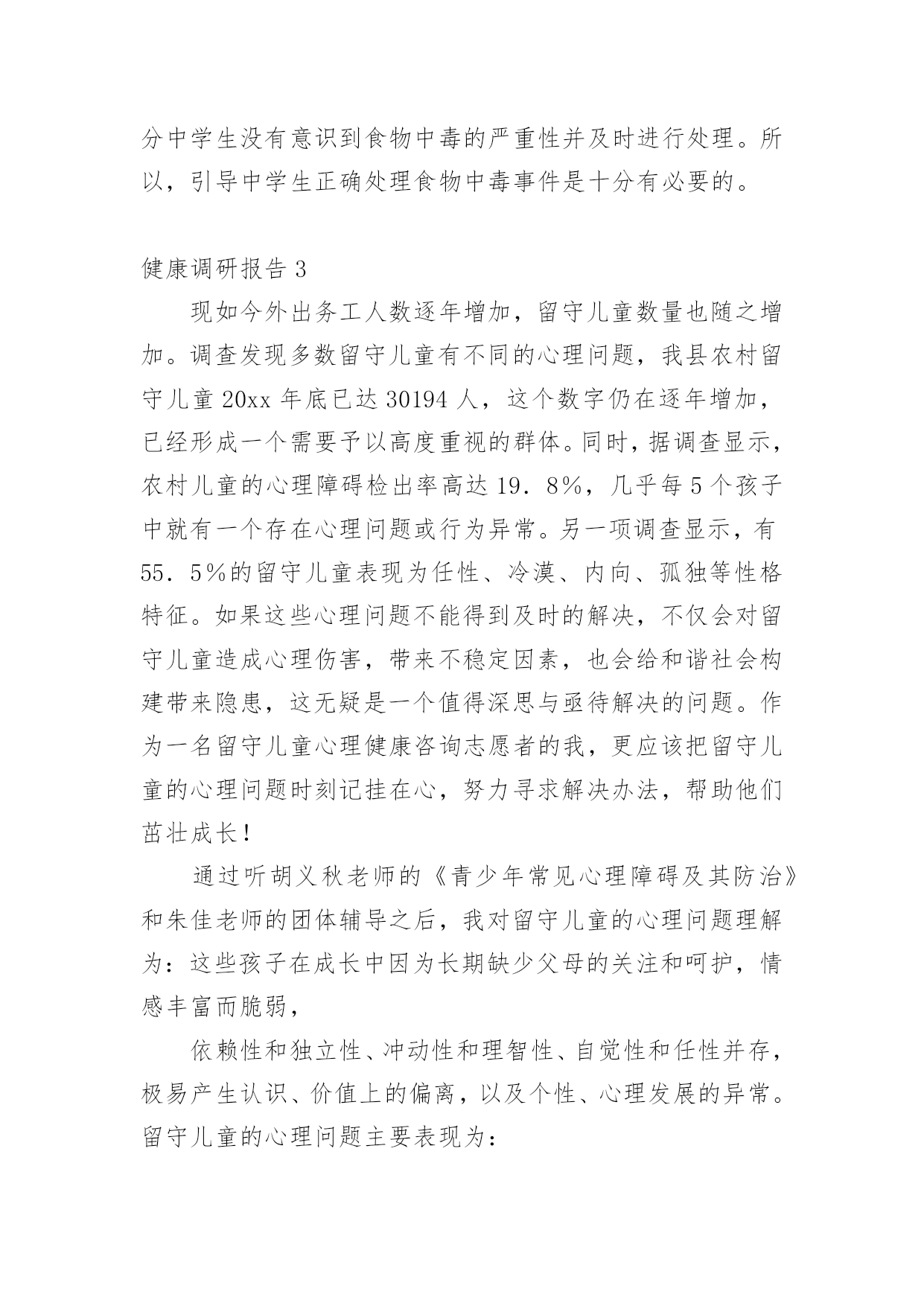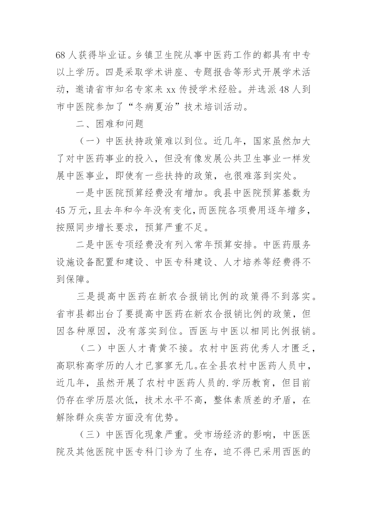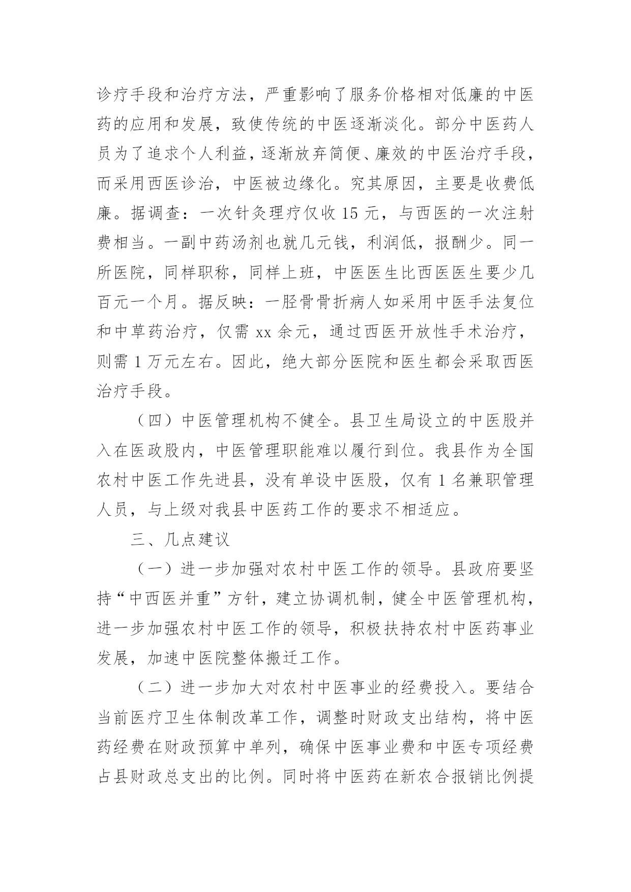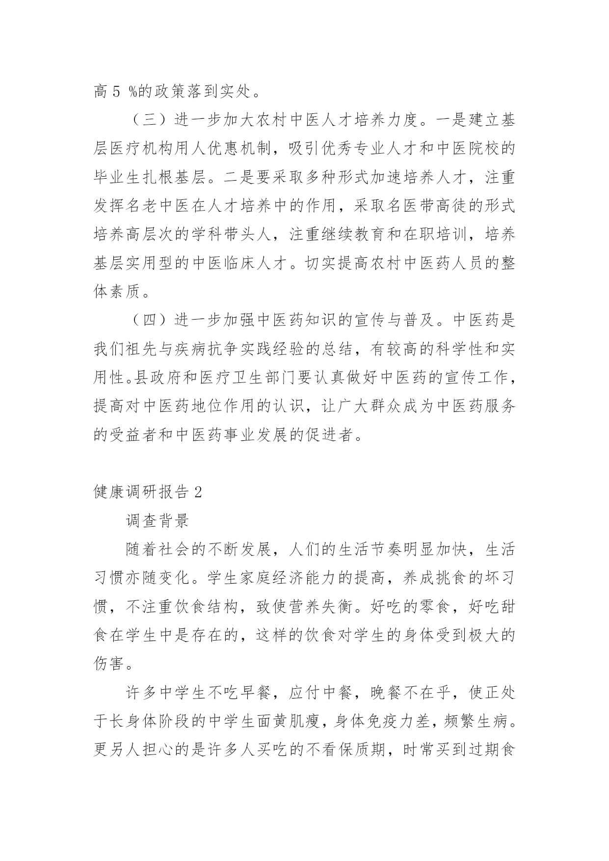健康调研报告在当下这个社会中,大家逐渐认识到报告的重要性,报告具有成文事后性的特点。我敢肯定,大部分人都对写报告很是头疼的,以下是小编帮大家整理的健康调研报告,供大家参考借鉴,希望可以帮助到有需要的朋友。健康调研报告1根据主任会议安排,xx县人大教科文卫工委于7月中下旬对以中医药事业发展为主题的“xx农民健康行”xx活动开展情况进行了调查,听取了县卫生局情况汇报,抽查了县合管办相关档案,召开了中医药从业人员座谈会,先后深入到县中医院、xxx卫生院、xx卫生院、xx中心卫生院等医疗单位实地查看了农村中医工作开展情况。现将调查情况汇报如下:一、主要工作成绩(一)突出政策扶持,中医药发展环境逐步优化。县政府按照省市相关文件要求,把中医药工作列入“xx农民健康行”活动主题,成立了“xx农民健康行”xx活动领导小组。制定出台了中医药事业“xxx”发展规划等政策文件。同时按照《湖南省中医管理条例》的要求,制定了扶持中医药事业发展的优惠政策,将中医院纳入新农合、城镇职工医保、城镇居民医保定点医疗机构和突发公共卫生事件紧急救援网络体系;提高了中医药在新型农村合作医疗中的地位。将中医院整体搬迁工作纳入了县城建设整体规划并提到议事日程,中医院经费实行了财政预算,今年预算安排45万元。xx年,我县被国家中医药管理局评为“全国农村中医工作先进县”。(二)突出网络建设,中医药服务领域不断扩大。一是加强中医院建设。目前中医院拥有业务用房9400平方米,开放病床101张,年门诊7万人次,年收治住院病人近4000人次,年手术1500台次。全院有专业技术人员184人,中高级职称人员比例达到35%。xx年与xx年相比,中医院资产总值由1700万元增加到2100万元,增长23%。为适应中医药事业发展要求,县政府决定将县中医院整体搬迁到马鞍新区,计划征地30亩,建筑总面积15000平方米,开设病床200张,总投资4000多万元。目前已完成可行性论证和环评工作,省发改委已立项呈报国家发改委,征地工作、建筑设计正在抓紧进行。二是加强基层中医药服务网络建设。全县60%以上的乡镇卫生院均设有中医科、中药房。3家乡镇卫生院创建为“湖南省乡镇卫生院中医兴院示范单位”。治河渡卫生院地处城郊,面对县级医院的竞争压力,通过发挥中医药特色优势,走出了一条不断发展壮大的新路子。该院桥头门诊部全部为中医药科室,其中医药收入占全院业务收入的20%。团洲卫生院有中医药技术人员10人,占全院医药人员的30%。能提供中草药300多种,中成药100多种,同时,注重中医药知识的宣传和普及,建立了辖区内农民健康档案,针对个体差异,为农民提供高血压、糖尿病等慢性病中医药治疗方案。全县50%的村卫生室均能运用中医药治疗常见病,多发病和参与预防保健。基本形成了县乡村三级中医药服务体系。(三)突出专科建设,中医药特色优势逐年显现。通过专科建设,极大提高了我县农村中医药服务比重和服务能力。目前,全县共创建省级重点中医专科4个。其中,县中医院的骨伤科是该院的拳头科室,也是省级重点专科。该科室年收治病人占全院病人总数的40%。中医院的针灸康复科、颅脑外科、中风专科日益受到全县人民信任。治河渡卫生院的肝病专科已开设10多年,在全县享有盛誉,曾治愈了大量危重肝病患者。县注市中心卫生院设有中医骨伤科、中医肝病专科、风湿理疗专科、慢性颈肩腰腿疼痛科等四个中医特色专科,开展了针灸、推拿按摩、牵引、小针刀和封闭等项目的综合治疗,特别是中医的定点介入治疗对慢性颈肩腰腿疼痛的患者取得了非常显著的效果。元至6月份,中医定点介入治疗患者234人次,中医中药治疗患者245人。xx年上半年全院中药收入43.1万元。通过专科的建设,中医药服务功能进一步完善。(四)突出人才培养,中医药人员素质逐步提高。一是培养临床技术骨干和学科带头人。采取师承教育、外出进修等形式,培养12名县级中医药技术骨干。二是培养基层中医药人员。以集中脱产培训,继续教育等形式,共培训乡镇卫生院中医临床技术骨干17人。三是加大学历教育力度。共选送110人参加了中医药大中专学历教育,已有68人获得毕业证。乡镇卫生院从事中医药工作的都具有中专以上学历。四是采取学术讲座、专题报告等形式开展学术活动,邀请省市知名专家来xx传授学术经验。并选派48人到市中医院参加了“冬病夏治”技术培训活动。二、困难和问题(一)中医扶持政策难以到位。近几年,国家虽然加大了对中医药事业的投入,但没有像发展公共卫生事业一样发展中医事业,即使有一些扶持的政策,也很难落到实处。一是中医院预算经费没有增加。我县中医院预算基数为45万元,且去年和今年没有变化,而医院各项费用逐年增多,按照同步增长要求,预算严重不足。二是中医专项经费没有列入常年预算安排。中医药服务设施设备配置和建设、中医专科建设、人才培养等经费