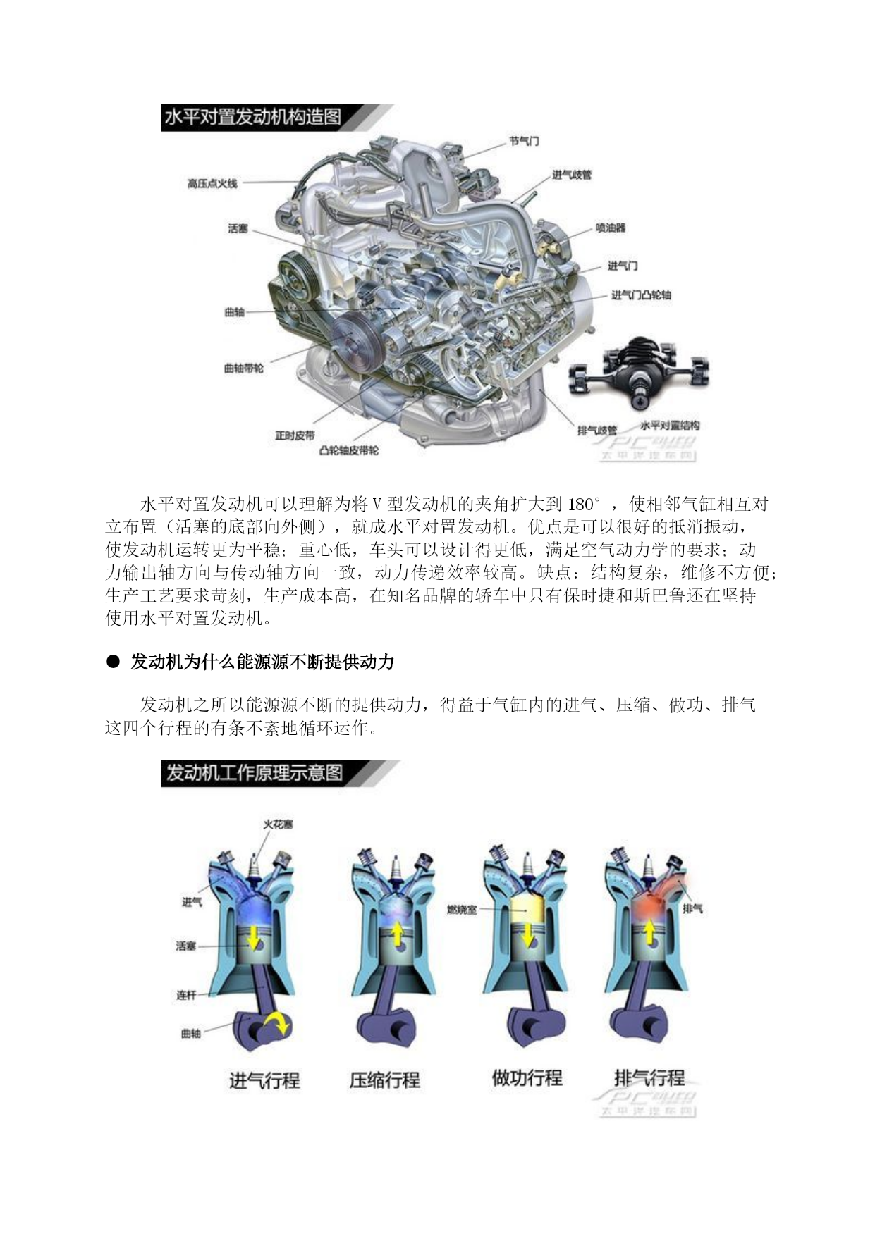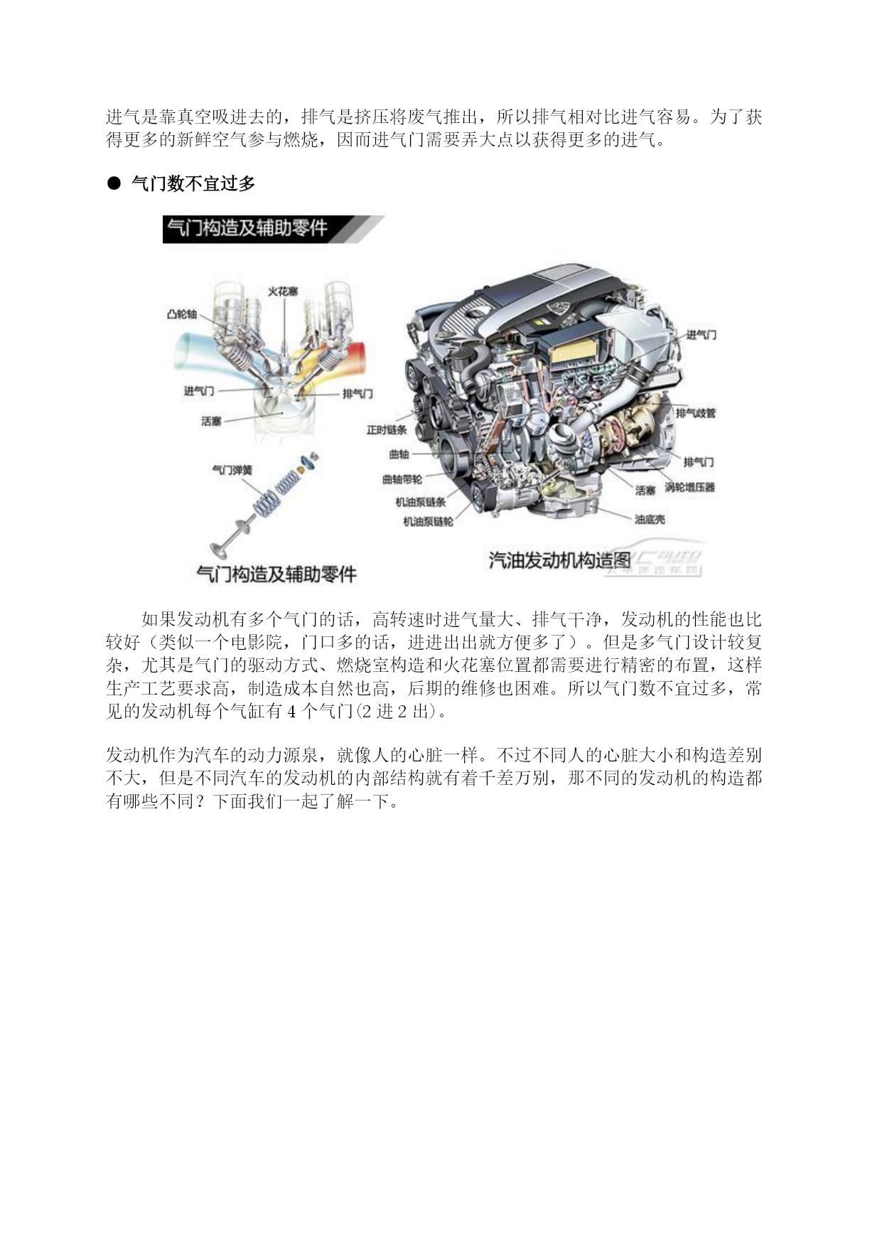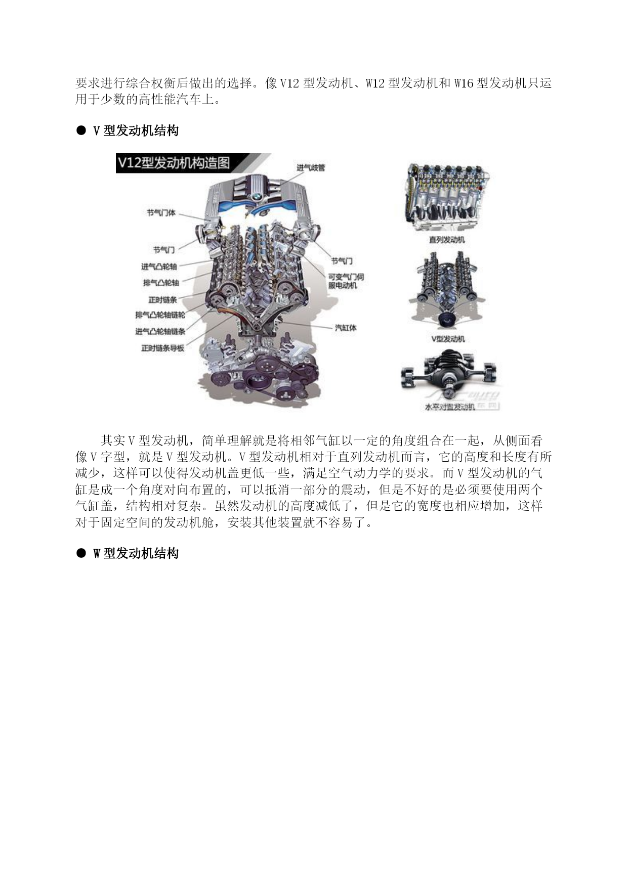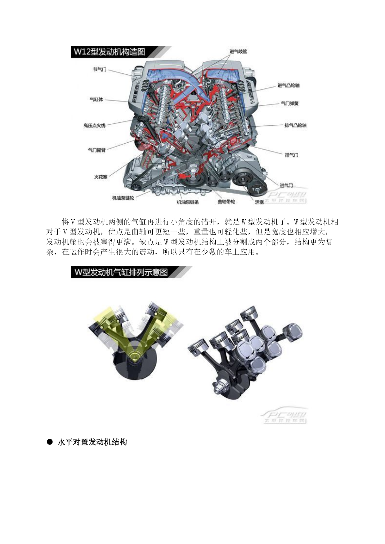 汽车发动机结构种类解析发动机作为汽车的动力源泉,就像人的心脏一样。不过不同人的心脏大小和构造差别不大,但是不同汽车的发动机的内部结构就有着千差万别,那不同的发动机的构造都有哪些不同?下面我们一起了解一下。阅读提示:PCauto技术频道图解类文章都可以使用全新的高清图解形式进行阅读。大家可以通过点击上面图片链接跳转到图解模式。高清大图面积提升3倍,看着更清晰更爽,赶紧来体验吧!●汽车动力的来源汽车的动力源泉就是发动机,而发动机的动力则来源于气缸内部。发动机气缸就是一个把燃料的内能转化为动能的场所,可以简单理解为,燃料在汽缸内燃烧,产生巨大压力推动活塞上下运动,通过连杆把力传给曲轴,最终转化为旋转运动,再通过变速器和传动轴,把动力传递到驱动车轮上,从而推动汽车前进。●气缸数不能过多一般的汽车都是以四缸和六缸发动机居多,既然发动机的动力主要是来源于气缸,那是不是气缸越多就越好呢?其实不然,随着汽缸数的增加,发动机的零部件也相应的增加,发动机的结构会更为复杂,这也降低发动机的可靠性,另外也会提高发动机制造成本和后期的维护费用。所以,汽车发动机的汽缸数都是根据发动机的用途和性能要求进行综合权衡后做出的选择。像V12型发动机、W12型发动机和W16型发动机只运用于少数的高性能汽车上。●V型发动机结构其实V型发动机,简单理解就是将相邻气缸以一定的角度组合在一起,从侧面看像V字型,就是V型发动机。V型发动机相对于直列发动机而言,它的高度和长度有所减少,这样可以使得发动机盖更低一些,满足空气动力学的要求。而V型发动机的气缸是成一个角度对向布置的,可以抵消一部分的震动,但是不好的是必须要使用两个气缸盖,结构相对复杂。虽然发动机的高度减低了,但是它的宽度也相应增加,这样对于固定空间的发动机舱,安装其他装置就不容易了。●W型发动机结构将V型发动机两侧的气缸再进行小角度的错开,就是W型发动机了。W型发动机相对于V型发动机,优点是曲轴可更短一些,重量也可轻化些,但是宽度也相应增大,发动机舱也会被塞得更满。缺点是W型发动机结构上被分割成两个部分,结构更为复杂,在运作时会产生很大的震动,所以只有在少数的车上应用。●水平对置发动机结构水平对置发动机可以理解为将V型发动机的夹角扩大到180°,使相邻气缸相互对立布置(活塞的底部向外侧),就成水平对置发动机。优点是可以很好的抵消振动,使发动机运转更为平稳;重心低,车头可以设计得更低,满足空气动力学的要求;动力输出轴方向与传动轴方向一致,动力传递效率较高。缺点:结构复杂,维修不方便;生产工艺要求苛刻,生产成本高,在知名品牌的轿车中只有保时捷和斯巴鲁还在坚持使用水平对置发动机。●发动机为什么能源源不断提供动力发动机之所以能源源不断的提供动力,得益于气缸内的进气、压缩、做功、排气这四个行程的有条不紊地循环运作。进气行程,活塞从气缸内上止点移动至下止点时,进气门打开,排气门关闭,新鲜的空气和汽油混合气被吸入气缸内。压缩行程,进排气门关闭,活塞从下止点移动至上止点,将混合气体压缩至气缸顶部,以提高混合气的温度,为做功行程做准备。做功行程,火花塞将压缩的气体点燃,混合气体在气缸内发生“爆炸”产生巨大压力,将活塞从上止点推至下止点,通过连杆推动曲轴旋转。排气行程,活塞从下止点移至上止点,此时进气门关闭,排气门打开,将燃烧后的废气通过排气歧管排出气缸外。●发动机动力源于爆炸发动机能产生动力其实是源于气缸内的“爆炸力”。在密封气缸燃烧室内,火花塞将一定比例汽油和空气的混合气体在合适的时刻里瞬间点燃,就会产生一个巨大的爆炸力,而燃烧室是顶部是固定的,巨大的压力迫使活塞向下运动,通过连杆推动曲轴,在通过一系列机构把动力传到驱动轮上,最终推动汽车。●火花塞是“引爆”高手要想气缸内的“爆炸”威力更大,适时的点火就非常重要了,而气缸内的火花塞就是扮演“引爆”的角色。其实火花塞点火的原理有点类似雷电,火花塞头部有中心电极和侧电极(相于两朵带相反极性离子的云),两个电极之间有个很小的间隙(称为点火间隙),当通电时能产生高达1万多伏的电火花,可以瞬间“引爆”气缸内的混合气体。●进气门要比排气门大要想气缸内不断的发生“爆炸”,必须不断的输入新的燃料和及时排出废气,进、排气门在这过程中就扮演了重要角色。进、排气门是由凸轮控制的,适时的执行“开门”和“关门”这两个动作。为什么看到的进气门都会比排气门大一些呢?因为一般进气是靠真空吸进去的,排气是挤压将废气推出,所以排气相对比进气容易。为了获得更多的新鲜空气参与燃烧,因而进气门需要弄大点以获得更多的进气。●气门数不宜过多如果发动机有多个气门的话,高转速时进气量大、排气干净,发动机的性能也比较好(类似一个电影院,门口多的话,进