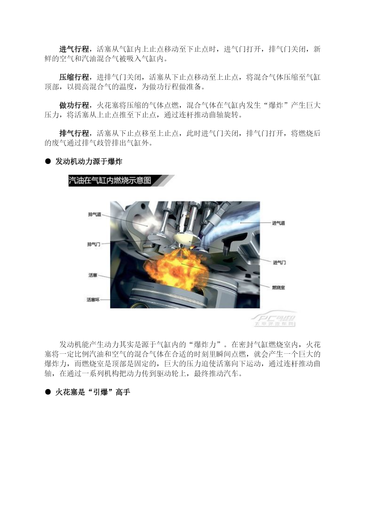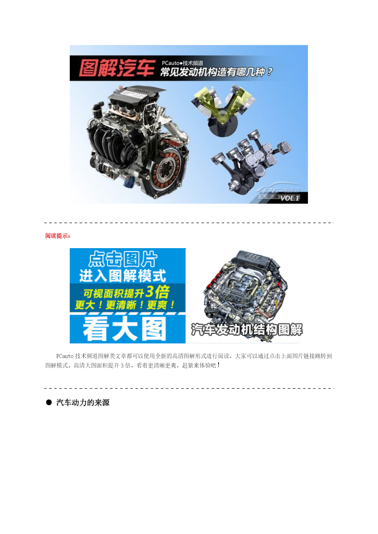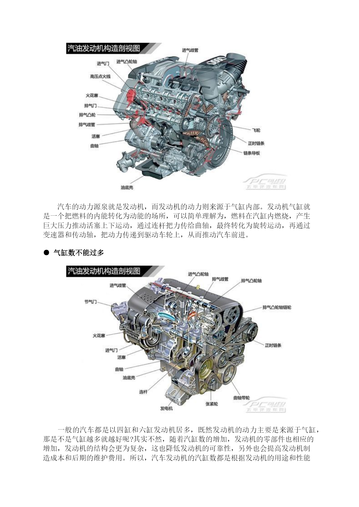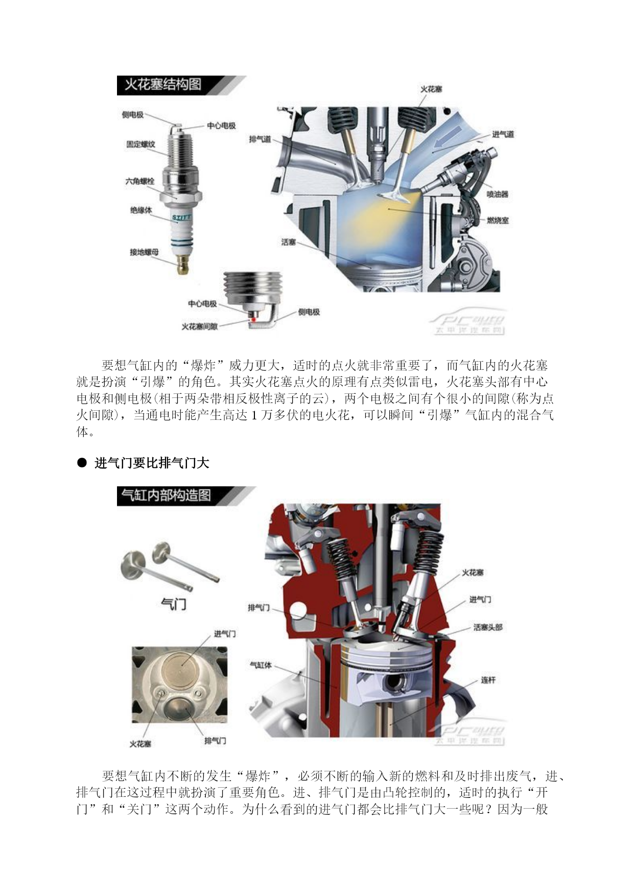 汽车发动机结构种类解析发动机作为汽车的动力源泉,就像人的心脏一样。不过不同人的心脏大小和构造差别不大,但是不同汽车的发动机的内部结构就有着千差万别,那不同的发动机的构造都有哪些不同?下面我们一起了解一下。阅读提示:PCauto技术频道图解类文章都可以使用全新的高清图解形式进行阅读。大家可以通过点击上面图片链接跳转到图解模式。高清大图面积提升3倍,看着更清晰更爽,赶紧来体验吧!●汽车动力的来源汽车的动力源泉就是发动机,而发动机的动力则来源于气缸内部。发动机气缸就是一个把燃料的内能转化为动能的场所,可以简单理解为,燃料在汽缸内燃烧,产生巨大压力推动活塞上下运动,通过连杆把力传给曲轴,最终转化为旋转运动,再通过变速器和传动轴,把动力传递到驱动车轮上,从而推动汽车前进。●气缸数不能过多一般的汽车都是以四缸和六缸发动机居多,既然发动机的动力主要是来源于气缸,那是不是气缸越多就越好呢?其实不然,随着汽缸数的增加,发动机的零部件也相应的增加,发动机的结构会更为复杂,这也降低发动机的可靠性,另外也会提高发动机制造成本和后期的维护费用。所以,汽车发动机的汽缸数都是根据发动机的用途和性能要求进行综合权衡后做出的选择。像V12型发动机、W12型发动机和W16型发动机只运用于少数的高性能汽车上。●V型发动机结构其实V型发动机,简单理解就是将相邻气缸以一定的角度组合在一起,从侧面看像V字型,就是V型发动机。V型发动机相对于直列发动机而言,它的高度和长度有所减少,这样可以使得发动机盖更低一些,满足空气动力学的要求。而V型发动机的气缸是成一个角度对向布置的,可以抵消一部分的震动,但是不好的是必须要使用两个气缸盖,结构相对复杂。虽然发动机的高度减低了,但是它的宽度也相应增加,这样对于固定空间的发动机舱,安装其他装置就不容易了。●W型发动机结构将V型发动机两侧的气缸再进行小角度的错开,就是W型发动机了。W型发动机相对于V型发动机,优点是曲轴可更短一些,重量也可轻化些,但是宽度也相应增大,发动机舱也会被塞得更满。缺点是W型发动机结构上被分割成两个部分,结构更为复杂,在运作时会产生很大的震动,所以只有在少数的车上应用。●水平对置发动机结构水平对置发动机可以理解为将V型发动机的夹角扩大到180°,使相邻气缸相互对立布置(活塞的底部向外侧),就成水平对置发动机。优点是可以很好的抵消振动,使发动机运转更为平稳;重心低,车头可以设计得更低,满足空气动力学的要求;动力输出轴方向与传动轴方向一致,动力传递效率较高。缺点:结构复杂,维修不方便;生产工艺要求苛刻,生产成本高,在知名品牌的轿车中只有保时捷和斯巴鲁还在坚持使用水平对置发动机。●发动机为什么能源源不断提供动力发动机之所以能源源不断的提供动力,得益于气缸内的进气、压缩、做功、排气这四个行程的有条不紊地循环运作。进气行程,活塞从气缸内上止点移动至下止点时,进气门打开,排气门关闭,新鲜的空气和汽油混合气被吸入气缸内。压缩行程,进排气门关闭,活塞从下止点移动至上止点,将混合气体压缩至气缸顶部,以提高混合气的温度,为做功行程做准备。做功行程,火花塞将压缩的气体点燃,混合气体在气缸内发生“爆炸”产生巨大压力,将活塞从上止点推至下止点,通过连杆推动曲轴旋转。排气行程,活塞从下止点移至上止点,此时进气门关闭,排气门打开,将燃烧后的废气通过排气歧管排出气缸外。●发动机动力源于爆炸发动机能产生动力其实是源于气缸内的“爆炸力”。在密封气缸燃烧室内,火花塞将一定比例汽油和空气的混合气体在合适的时刻里瞬间点燃,就会产生一个巨大的爆炸力,而燃烧室是顶部是固定的,巨大的压力迫使活塞向下运动,通过连杆推动曲轴,在通过一系列机构把动力传到驱动轮上,最终推动汽车。●火花塞是“引爆”高手要想气缸内的“爆炸”威力更大,适时的点火就非常重要了,而气缸内的火花塞就是扮演“引爆”的角色。其实火花塞点火的原理有点类似雷电,火花塞头部有中心电极和侧电极(相于两朵带相反极性离子的云),两个电极之间有个很小的间隙(称为点火间隙),当通电时能产生高达1万多伏的电火花,可以瞬间“引爆”气缸内的混合气体。●进气门要比排气门大要想气缸内不断的发生“爆炸”,必须不断的输入新的燃料和及时排出废气,进、排气门在这过程中就扮演了重要角色。进、排气门是由凸轮控制的,适时的执行“开门”和“关门”这两个动作。为什么看到的进气门都会比排气门大一些呢?因为一般进气是靠真空吸进去的,排气是挤压将废气推出,所以排气相对比进气容易。为了获得更多的新鲜空气参与燃烧,因而进气门需要弄大点以获得更多的进气。●气门数不宜过多如果发动机有多个气门的话,高转速时进气量大、排气干净,发动机的性能也比较好(类似一个电影院,门口多的话,进