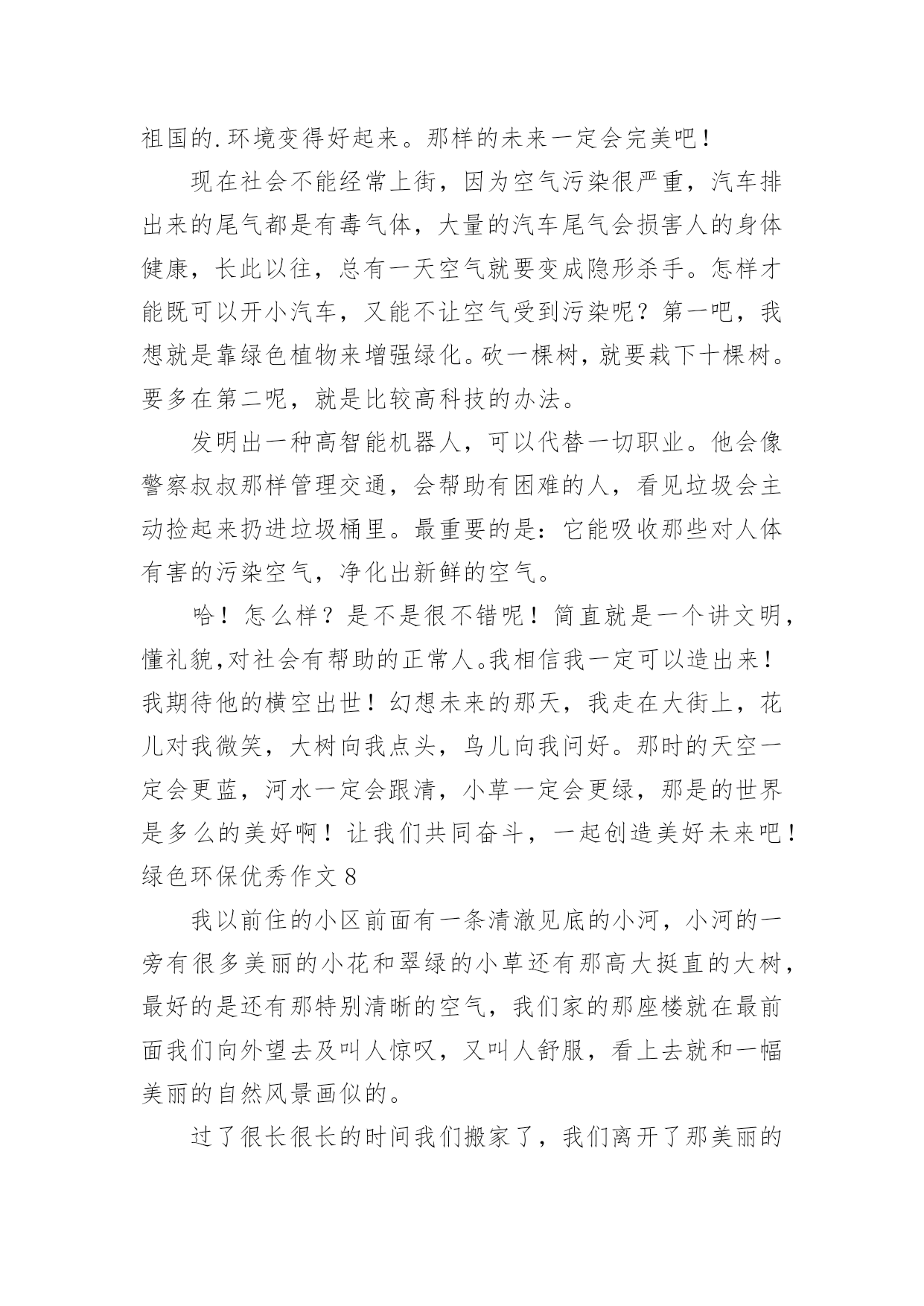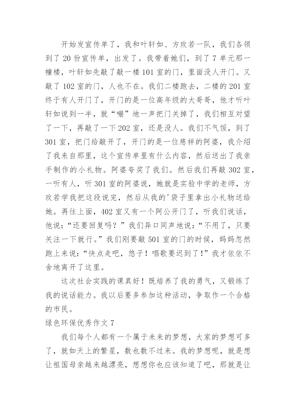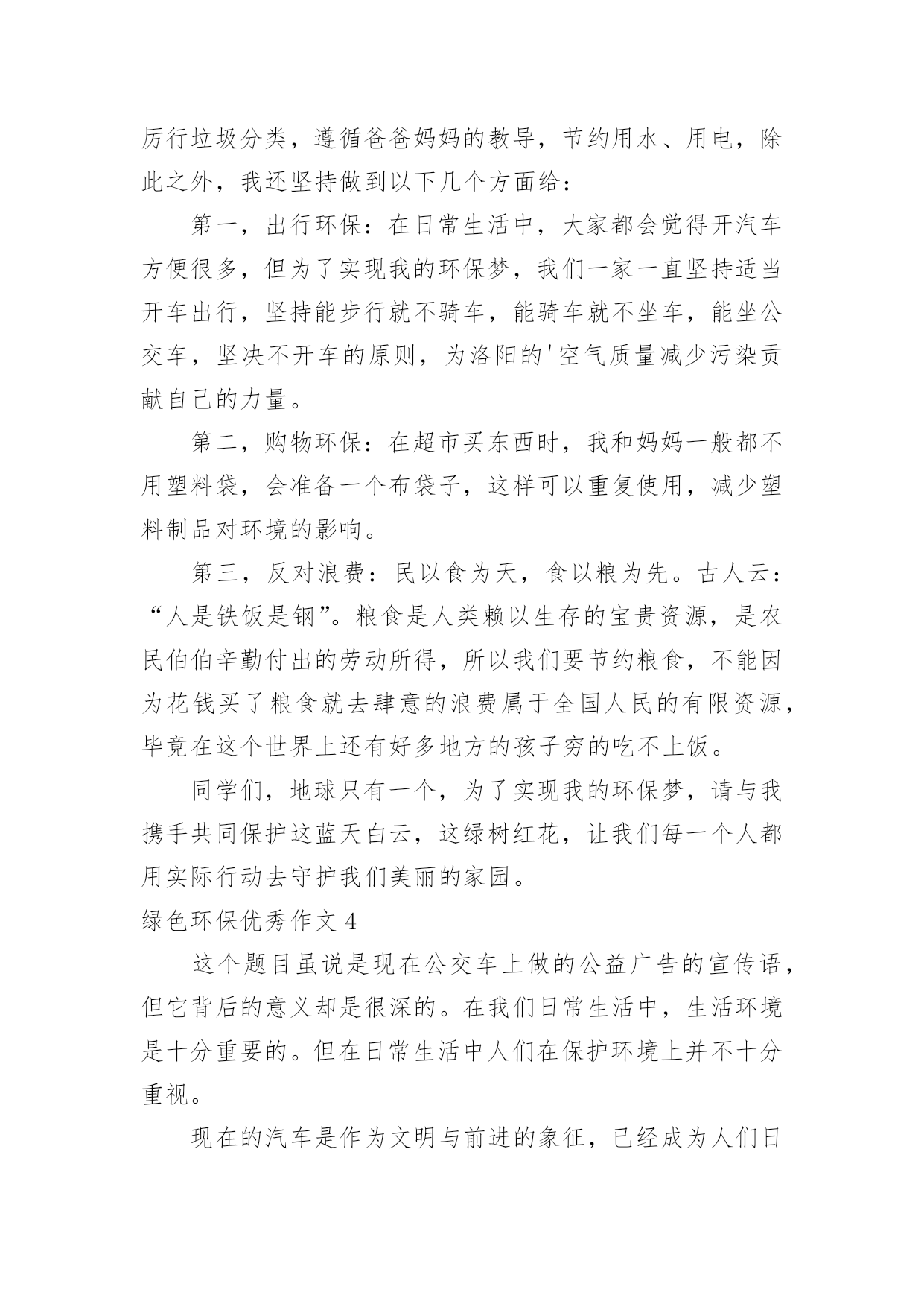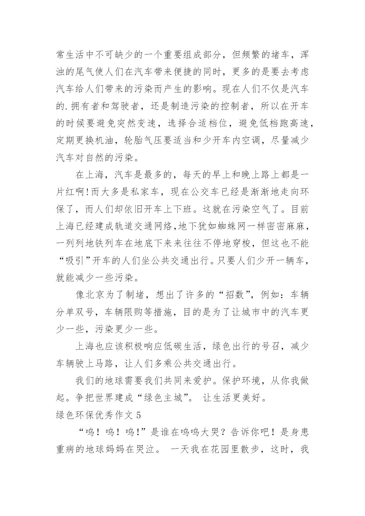 绿色环保优秀作文绿色环保优秀作文在学习、工作、生活中,大家都不可避免地会接触到作文吧,作文是一种言语活动,具有高度的综合性和创造性。你知道作文怎样才能写的好吗?以下是小编整理的绿色环保优秀作文,希望对大家有所帮助。绿色环保优秀作文1在我的记忆里,以前,天空格外的蓝,小草格外的绿,花儿格外的红,马路俩旁排列整整齐齐的大树,个个精神抖擞地挺立着,树叶绿油油地,放眼望去,就像俩列整齐的绿旗,把公路改装成了一条林荫大道,鸟儿在高大的树上盖了窝,安适的住着。早晨,推开窗,打开门,一阵清新的空气扑鼻而来,多么清爽的早晨啊!可是现在,绿油油的小草,高大茂盛的树木,红艳艳的花儿,蓝蓝的天空,它们都不再轻易的出现,取而代之的是那一株株落满灰尘的小草,孤零零的树木,奄奄一息的花儿,灰蒙蒙的天空,污浊的空气。如果这样下去的话,会对我们的身体产生极大的伤害。保护环境,就要从小事做起,从我做起,为了能让空气清新一点,我上学,放学坚持步行,或骑自行车。少用塑料袋,可以用环保的布袋,为了能让环境干净一点,我把垃圾分类,不随地乱扔垃圾。为了保护水资源,我节约用水,为了保护树木,我不用一次性筷子,节约用纸,多植树,多种花,不对树木乱砍乱伐。虽然我一个人的'力量不会引起多大的作用,但我相信,如果大家一起来保护环境,一定会使我们的空气清新许多,让环境干净许多,让水资源清澈许多,让树木美丽许多。我们的国家发展的很快,但是,我们决不能以破坏我们的家园为代价。为了保护环境,我们国家1949年在西北,华北,东北风沙危害,水土流失严重的地区,建设了大型防护林工程——三北防护林,又称“绿色万里长城”以求能锁住风沙,减轻自然灾害,现在我们的生活已经有了很大的改善。同学们啊让我们把我们的绿洲呈现在大家面前吧!绿色环保优秀作文2经常在电视里看到有关白色污染的事,确实整个地球遭受的白色污染已经到了非常严重的地步了。因此,我们国家从20xx年6月1日起,颁布了商场里不再免费提供塑料袋的规定,并积极提倡人们使用环保口袋。我想:这下白色污染就得败下阵来,新的“士兵”——绿色环保袋就要闪亮登场喽!来,听听我设计的未来新型绿色环保多功能袋吧!大家一定会想,口袋无非是用来放东西的吗?但我设计的.那可是多功能口袋,不仅有最基本的功能,最主要的是它还可以进行功能变换,给你意想不到的惊喜呢!比如,碰到下雨天,它就可以变成一顶伞为你挡风遮雨;你走累了,它就可以折叠成一把椅子让你休息。而且你还可以把它当成一件件衣服来穿,既美化环保,还可以自动调节体温,让你永远感受冬暖夏凉的舒适。怎么样,我的想法不错吧!别急,我还要让它发挥更大的功能呢!就拿我们现在住的房子来说吧,都是用水泥、砖头、木材等建成的,不仅费时又耗费大自然的资源,最难的是拆房子,又麻烦又危险。我想,如果用环保袋来造房子,那是既温馨又舒适。房屋里没有电线,一切都靠太阳能来发电板,只要你按一下遥控器,环保袋里的小口袋就会弹出环保彩电、厨房、卧室等家具和家电。如果你想搬家,就可以轻轻松松地搬到自己喜欢的地方,多方便呀!最绝的是它还可以“定时”。只要你想好要在这座房子里住上几年,你就把程序输进去,到时房子就会自动化掉,成为植物的养分,你就可以再换一座漂亮的房子了。对了,用这种方法还可以来造轮船、飞机等交通工具,真可谓是“小材大用”啊!相信在不久的将来,我们就能梦想成真!绿色环保优秀作文3我有一个美好的梦想:瓦蓝的天空上,飘着几朵悠闲的云,太阳的金晖洒在远方的天际,路边的小溪中可爱的鱼儿尽情的嬉戏,而我就躺在旁边的绿油油的草地上,呼吸着新鲜的空气,欣赏着远方的美景。当然为了实现我的环保梦,我经常提醒自己要注意环境卫生,在学校我积极完成老师布置给我的劳动任务,认真值日,维持教室内环境卫生,在家里我主动帮爸爸妈妈做家务,厉行垃圾分类,遵循爸爸妈妈的教导,节约用水、用电,除此之外,我还坚持做到以下几个方面给:第一,出行环保:在日常生活中,大家都会觉得开汽车方便很多,但为了实现我的环保梦,我们一家一直坚持适当开车出行,坚持能步行就不骑车,能骑车就不坐车,能坐公交车,坚决不开车的原则,为洛阳的'空气质量减少污染贡献自己的力量。第二,购物环保:在超市买东西时,我和妈妈一般都不用塑料袋,会准备一个布袋子,这样可以重复使用,减少塑料制品对环境的影响。第三,反对浪费:民以食为天,食以粮为先。古人云:“人是铁饭是钢”。粮食是人类赖以生存的宝贵资源,是农民伯伯辛勤付出的劳动所得,所以我们要节约粮食,不能因为花钱买了粮食就去肆意的浪费属于全国人民的有限资源,毕竟在这个世界上还有好多地方的孩子穷的吃不上饭。同学们,地球只有一个,为了实现我的环保梦,请与我携手共同保护这蓝天白云,这绿树红花,让我们每一个人都用实际行动去守护我们美丽的家园。绿色环保优秀作文4这个题目虽说是现在公交车
