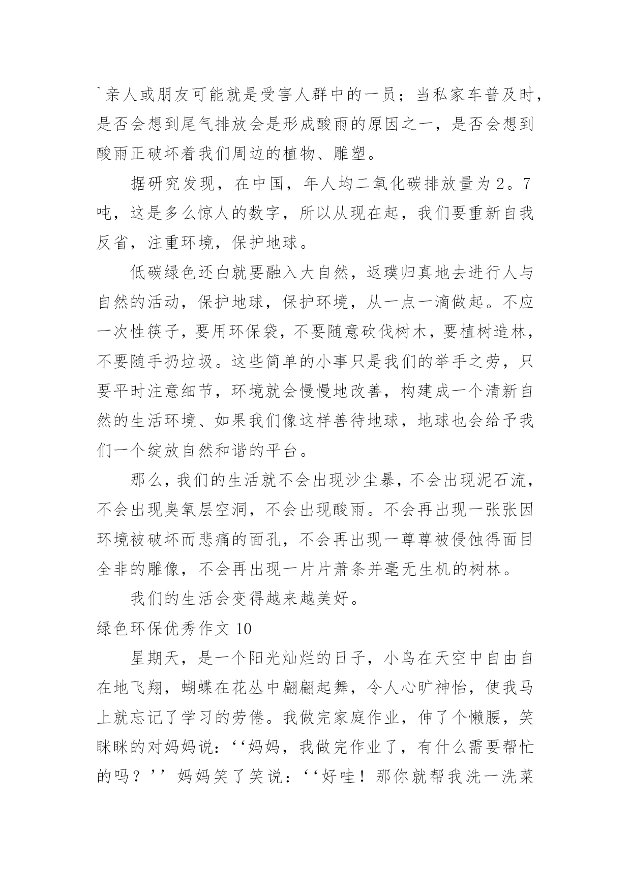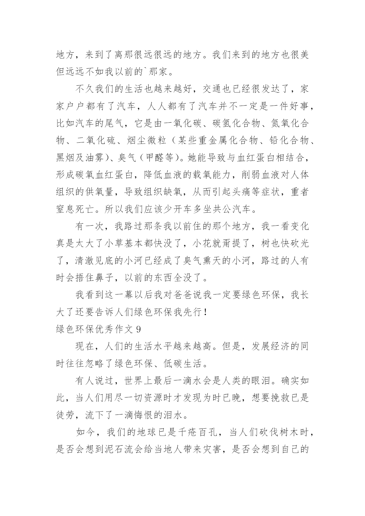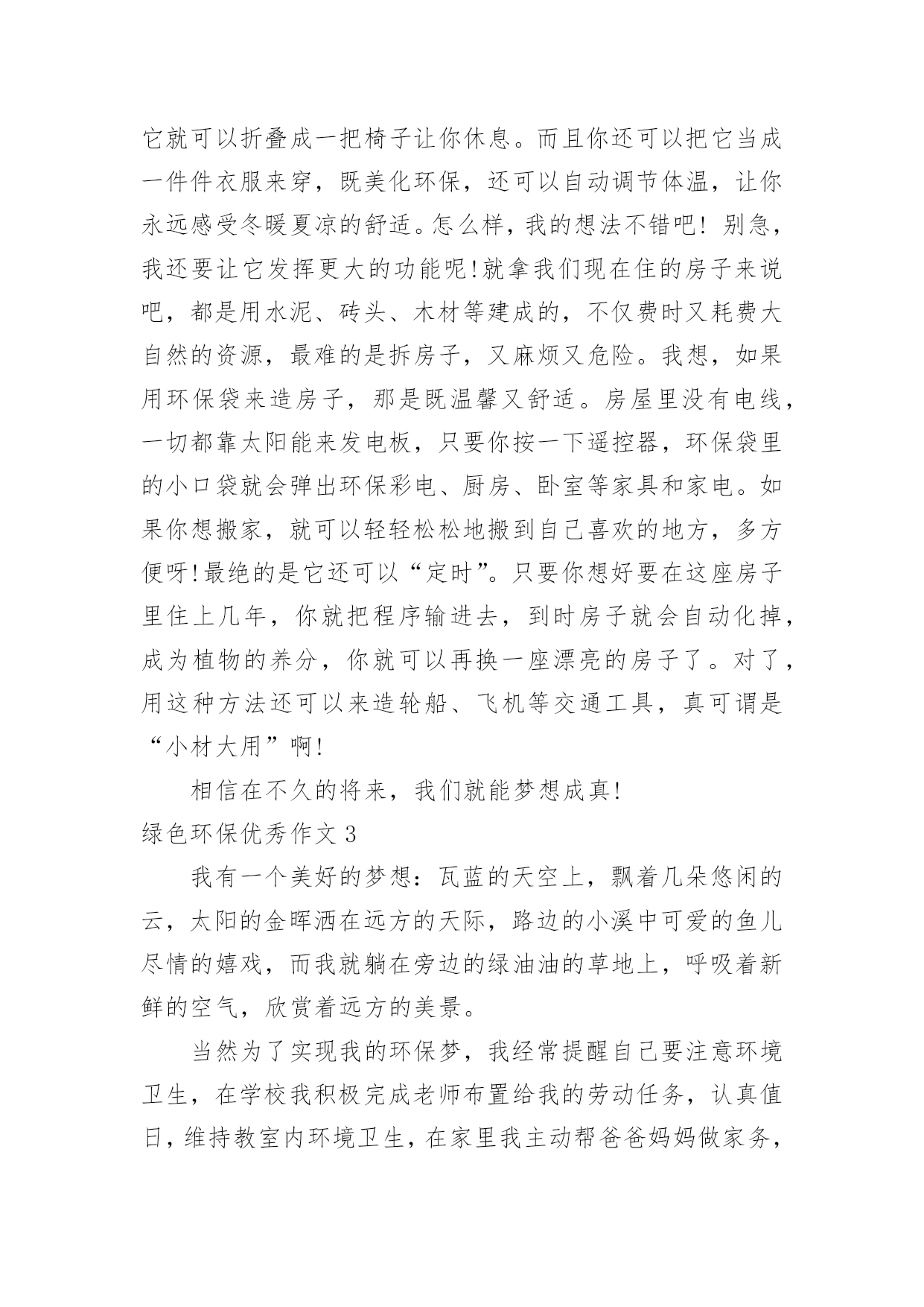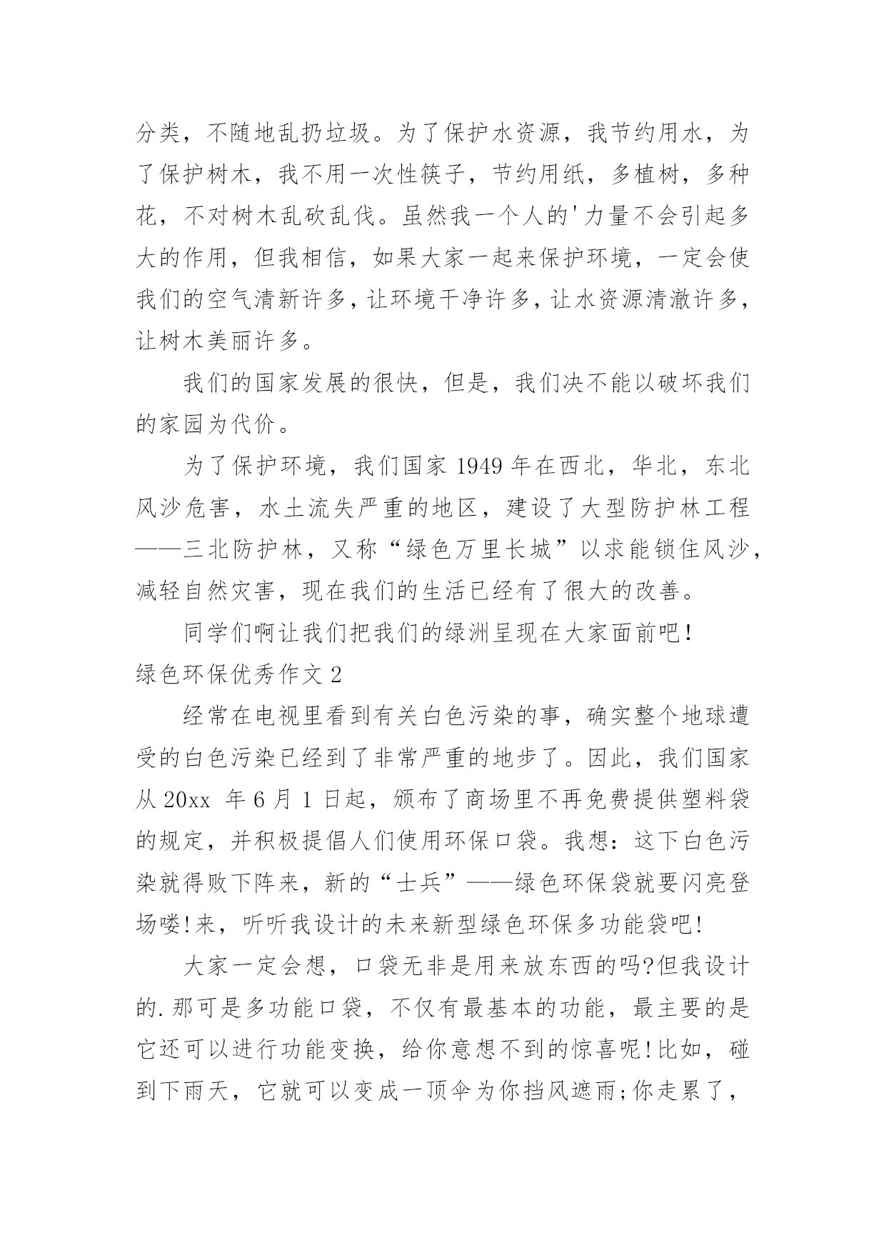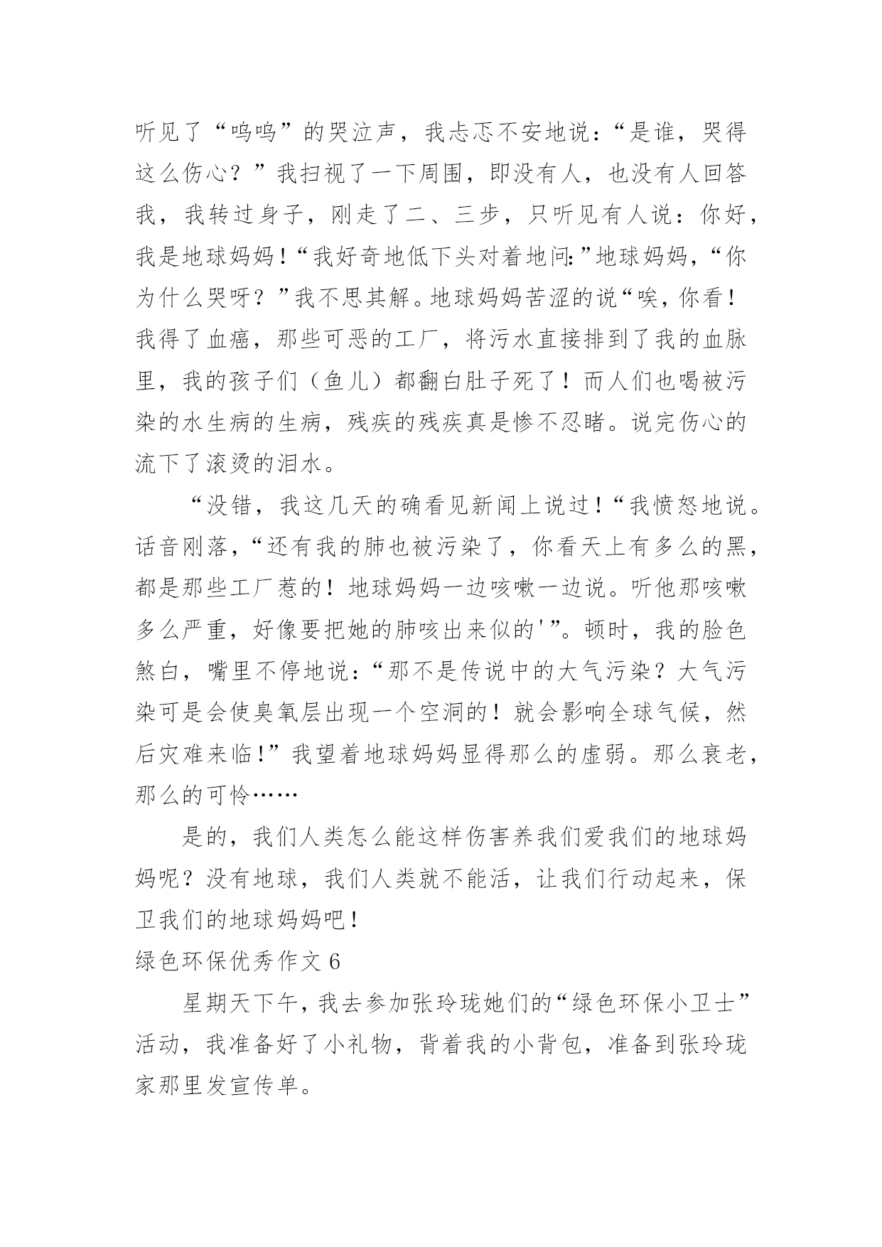 绿色环保优秀作文绿色环保优秀作文在学习、工作、生活中,大家都不可避免地会接触到作文吧,作文是一种言语活动,具有高度的综合性和创造性。你知道作文怎样才能写的好吗?以下是小编整理的绿色环保优秀作文,希望对大家有所帮助。绿色环保优秀作文1在我的记忆里,以前,天空格外的蓝,小草格外的绿,花儿格外的红,马路俩旁排列整整齐齐的大树,个个精神抖擞地挺立着,树叶绿油油地,放眼望去,就像俩列整齐的绿旗,把公路改装成了一条林荫大道,鸟儿在高大的树上盖了窝,安适的住着。早晨,推开窗,打开门,一阵清新的空气扑鼻而来,多么清爽的早晨啊!可是现在,绿油油的小草,高大茂盛的树木,红艳艳的花儿,蓝蓝的天空,它们都不再轻易的出现,取而代之的是那一株株落满灰尘的小草,孤零零的树木,奄奄一息的花儿,灰蒙蒙的天空,污浊的空气。如果这样下去的话,会对我们的身体产生极大的伤害。保护环境,就要从小事做起,从我做起,为了能让空气清新一点,我上学,放学坚持步行,或骑自行车。少用塑料袋,可以用环保的布袋,为了能让环境干净一点,我把垃圾分类,不随地乱扔垃圾。为了保护水资源,我节约用水,为了保护树木,我不用一次性筷子,节约用纸,多植树,多种花,不对树木乱砍乱伐。虽然我一个人的'力量不会引起多大的作用,但我相信,如果大家一起来保护环境,一定会使我们的空气清新许多,让环境干净许多,让水资源清澈许多,让树木美丽许多。我们的国家发展的很快,但是,我们决不能以破坏我们的家园为代价。为了保护环境,我们国家1949年在西北,华北,东北风沙危害,水土流失严重的地区,建设了大型防护林工程——三北防护林,又称“绿色万里长城”以求能锁住风沙,减轻自然灾害,现在我们的生活已经有了很大的改善。同学们啊让我们把我们的绿洲呈现在大家面前吧!绿色环保优秀作文2经常在电视里看到有关白色污染的事,确实整个地球遭受的白色污染已经到了非常严重的地步了。因此,我们国家从20xx年6月1日起,颁布了商场里不再免费提供塑料袋的规定,并积极提倡人们使用环保口袋。我想:这下白色污染就得败下阵来,新的“士兵”——绿色环保袋就要闪亮登场喽!来,听听我设计的未来新型绿色环保多功能袋吧!大家一定会想,口袋无非是用来放东西的吗?但我设计的.那可是多功能口袋,不仅有最基本的功能,最主要的是它还可以进行功能变换,给你意想不到的惊喜呢!比如,碰到下雨天,它就可以变成一顶伞为你挡风遮雨;你走累了,它就可以折叠成一把椅子让你休息。而且你还可以把它当成一件件衣服来穿,既美化环保,还可以自动调节体温,让你永远感受冬暖夏凉的舒适。怎么样,我的想法不错吧!别急,我还要让它发挥更大的功能呢!就拿我们现在住的房子来说吧,都是用水泥、砖头、木材等建成的,不仅费时又耗费大自然的资源,最难的是拆房子,又麻烦又危险。我想,如果用环保袋来造房子,那是既温馨又舒适。房屋里没有电线,一切都靠太阳能来发电板,只要你按一下遥控器,环保袋里的小口袋就会弹出环保彩电、厨房、卧室等家具和家电。如果你想搬家,就可以轻轻松松地搬到自己喜欢的地方,多方便呀!最绝的是它还可以“定时”。只要你想好要在这座房子里住上几年,你就把程序输进去,到时房子就会自动化掉,成为植物的养分,你就可以再换一座漂亮的房子了。对了,用这种方法还可以来造轮船、飞机等交通工具,真可谓是“小材大用”啊!相信在不久的将来,我们就能梦想成真!绿色环保优秀作文3我有一个美好的梦想:瓦蓝的天空上,飘着几朵悠闲的云,太阳的金晖洒在远方的天际,路边的小溪中可爱的鱼儿尽情的嬉戏,而我就躺在旁边的绿油油的草地上,呼吸着新鲜的空气,欣赏着远方的美景。当然为了实现我的环保梦,我经常提醒自己要注意环境卫生,在学校我积极完成老师布置给我的劳动任务,认真值日,维持教室内环境卫生,在家里我主动帮爸爸妈妈做家务,厉行垃圾分类,遵循爸爸妈妈的教导,节约用水、用电,除此之外,我还坚持做到以下几个方面给:第一,出行环保:在日常生活中,大家都会觉得开汽车方便很多,但为了实现我的环保梦,我们一家一直坚持适当开车出行,坚持能步行就不骑车,能骑车就不坐车,能坐公交车,坚决不开车的原则,为洛阳的'空气质量减少污染贡献自己的力量。第二,购物环保:在超市买东西时,我和妈妈一般都不用塑料袋,会准备一个布袋子,这样可以重复使用,减少塑料制品对环境的影响。第三,反对浪费:民以食为天,食以粮为先。古人云:“人是铁饭是钢”。粮食是人类赖以生存的宝贵资源,是农民伯伯辛勤付出的劳动所得,所以我们要节约粮食,不能因为花钱买了粮食就去肆意的浪费属于全国人民的有限资源,毕竟在这个世界上还有好多地方的孩子穷的吃不上饭。同学们,地球只有一个,为了实现我的环保梦,请与我携手共同保护这蓝天白云,这绿树红花,让我们每一个人都用实际行动去守护我们美丽的家园。绿色环保优秀作文4这个题目虽说是现在公交车