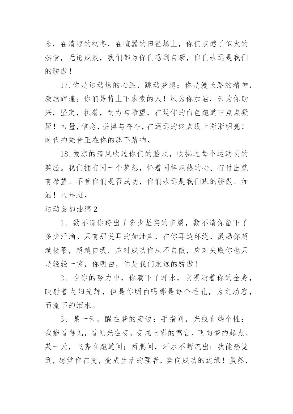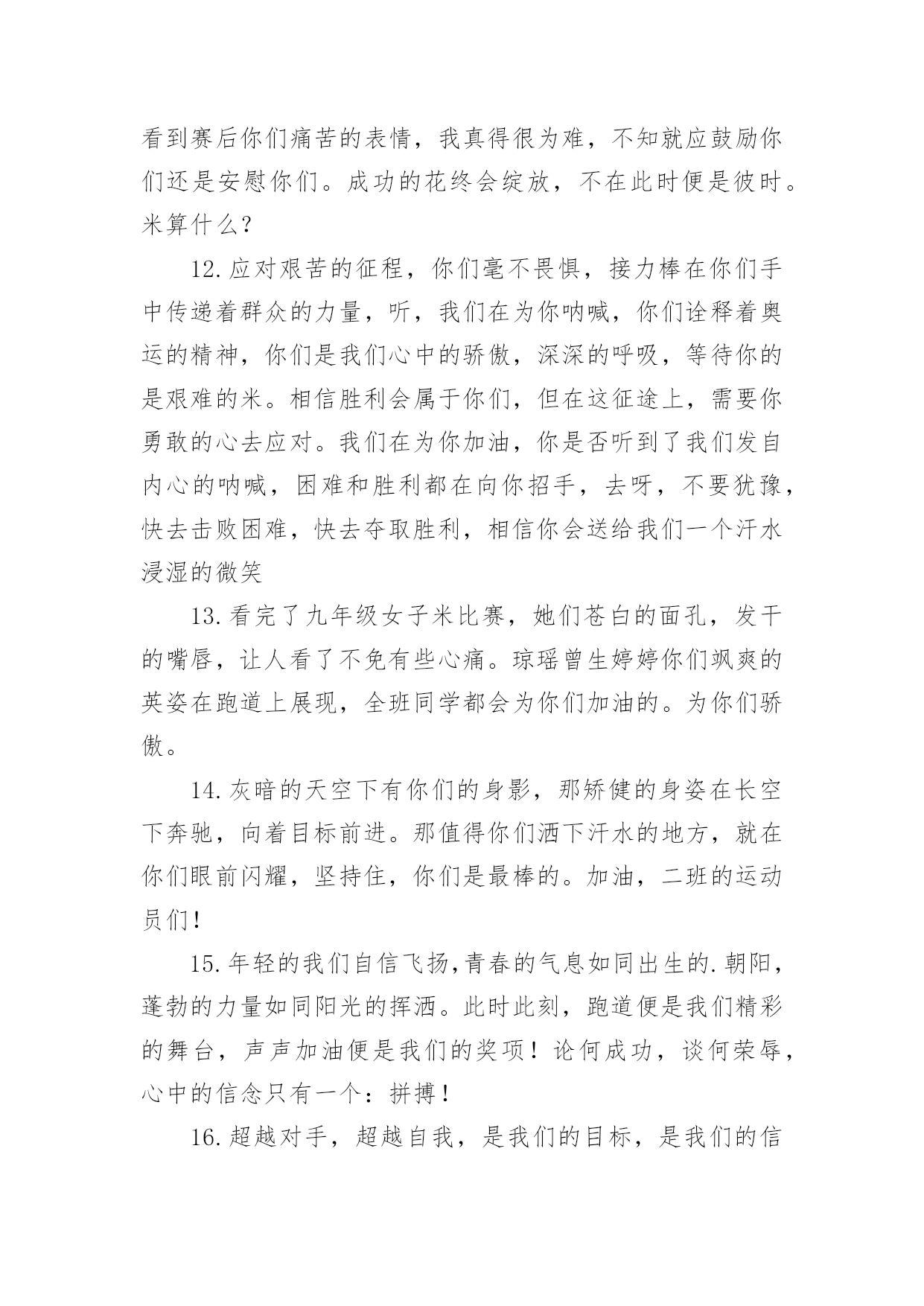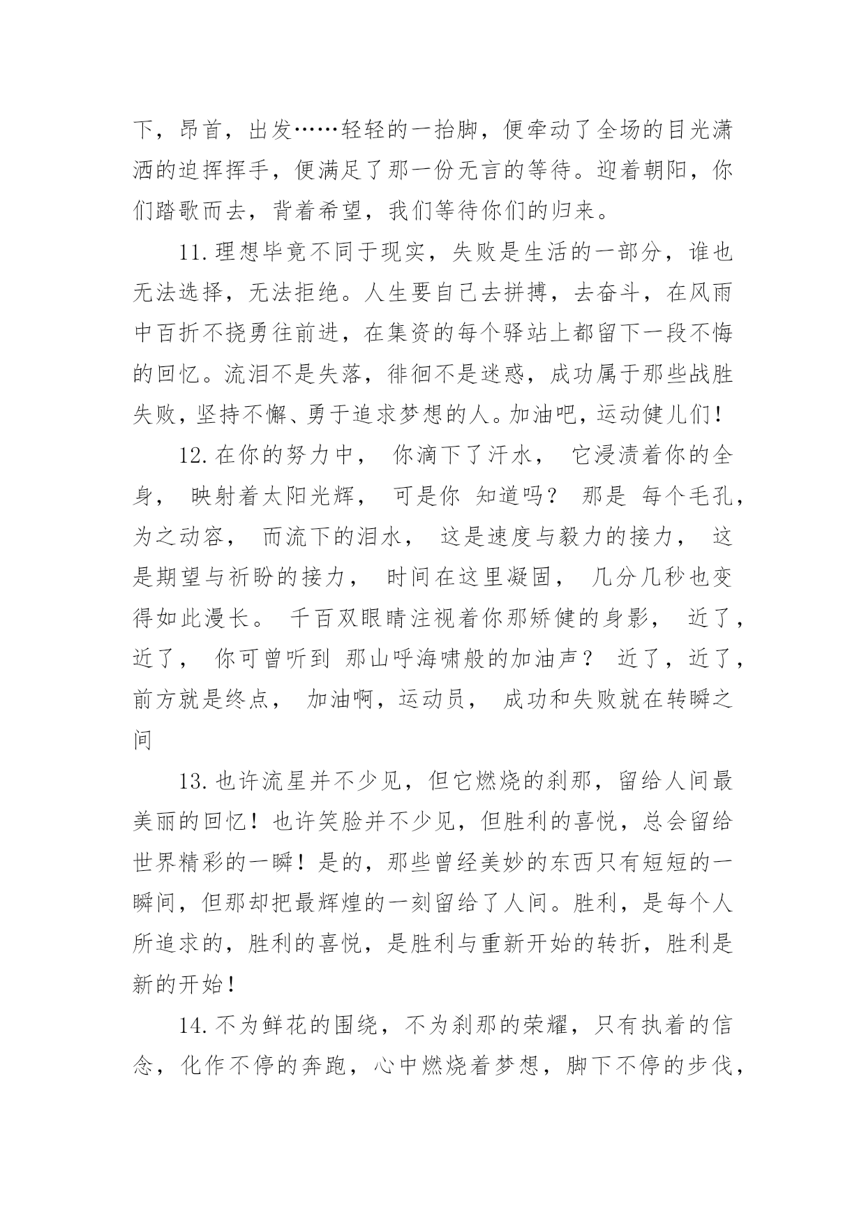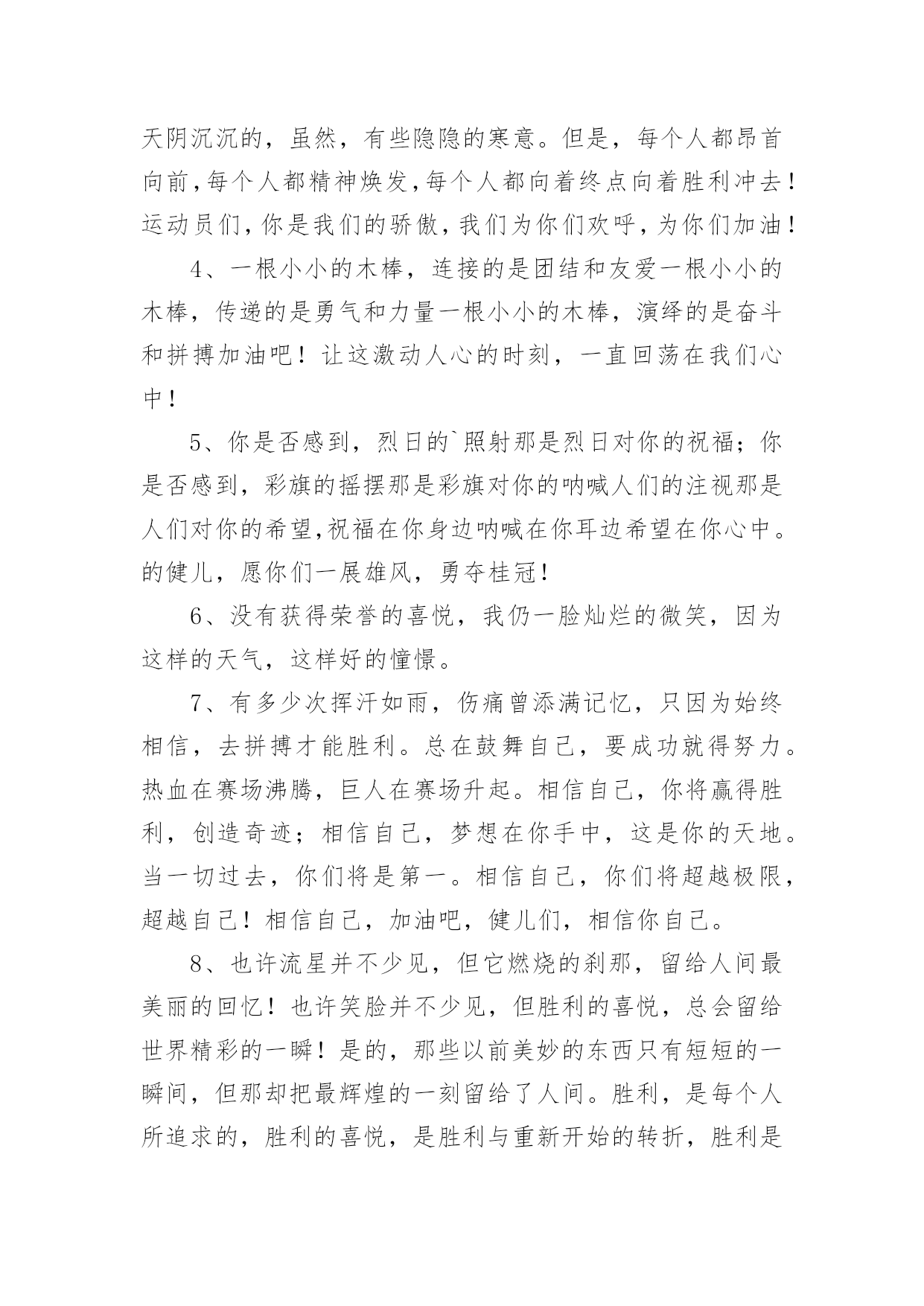 运动会加油稿运动会加油稿在生活中,我们使用上加油稿的情况与日俱增,借助加油稿可以激起人的希望,催人奋进。你知道加油稿怎样才能写的好吗?下面是小编收集整理的运动会加油稿,欢迎阅读与收藏。运动会加油稿11.亲爱的班健儿们,你们要充满自信。比赛中没有挡风的墙,没有遮风的伞,也没有撑船的帆,更没有拉船的纤。事在人为,人定胜天。原你们养精蓄锐,对充满爱意的世界说:“我自信,我拼搏,我会赢。2.时间在流逝,赛道在延伸,成功在你面前展现心脏的跳动,热血在沸腾,辉煌在你脚下铸就。加油吧,健儿们!3.数不请你跨出了多少坚实的步履,数不请你留下了多少汗滴。只有那悦耳的加油声,在你耳边环绕,激励你超越极限,超越自我。应对成功你从不自傲,应对失败你也只是轻轻一笑,你知道,你是我们永远的骄傲!4.我们班可爱的“梁老大”“吴宝鸡”,我们会在身后默默支持你的!会永远记住你们标志性的动作的,无二,那将会是运动场上的亮点!5.是体育场上游走的火焰,是来去不息的脚步,是风中飞舞的树叶折射的金色光芒,藉此,能够诠释运动员兴奋的脸庞。那轻盈的步伐似飞鸟的翅膀,那清脆的枪声响彻天际,它粲然升起那跃动的渴望,起跑加速超越冲刺,一步一步延向胜利的曙光。那是力的比拼,素质的较量,是石榴树上,跃动的心脏。6.这是意志的拼搏。这是速度的挑战。胜利在向你们招手/胜利在向你们呼唤。7.你们快如离弦之箭;疾似撒疆野马;你们的速度让我们惊叹;你们的精神让我们钦佩;流汗千日,只为今日一搏;疾踏百步,只为终点一触;胜利再向你微笑;成功在向你招手;加油啊!健儿们!8.汗水,泪水;笑声,歌声;我们尽情挥洒。开幕式上,运动场上,我们尽情展现,多少艰辛,多少困苦,我们勇敢承担。因为年轻,因为张扬,因为我们知道:用今日的汗水换来明天的微笑9.萧瑟的秋风,挡不住你们破竹的锐气,10.也许流星并不少见,但它燃烧的刹那,留给人间最美丽的回忆!也许笑脸并不少见,但胜利的喜悦,总会留给世界精彩的一瞬!是的,那些以前美妙的东西只有短短的一瞬间,但那却把最辉煌的一刻留给了人间。胜利,是每个人所追求的,胜利的喜悦,是胜利与重新开始的转折,胜利是新的开始!11.看到你们努力的样貌,我真得很感动。美华新蕾,多谢你们的坚持。我明白成功并不是每个运动员都能获得,看到赛后你们痛苦的表情,我真得很为难,不知就应鼓励你们还是安慰你们。成功的花终会绽放,不在此时便是彼时。米算什么?12.应对艰苦的征程,你们毫不畏惧,接力棒在你们手中传递着群众的力量,听,我们在为你呐喊,你们诠释着奥运的精神,你们是我们心中的骄傲,深深的呼吸,等待你的是艰难的米。相信胜利会属于你们,但在这征途上,需要你勇敢的心去应对。我们在为你加油,你是否听到了我们发自内心的呐喊,困难和胜利都在向你招手,去呀,不要犹豫,快去击败困难,快去夺取胜利,相信你会送给我们一个汗水浸湿的微笑13.看完了九年级女子米比赛,她们苍白的面孔,发干的嘴唇,让人看了不免有些心痛。琼瑶曾生婷婷你们飒爽的英姿在跑道上展现,全班同学都会为你们加油的。为你们骄傲。14.灰暗的天空下有你们的身影,那矫健的身姿在长空下奔驰,向着目标前进。那值得你们洒下汗水的地方,就在你们眼前闪耀,坚持住,你们是最棒的。加油,二班的运动员们!15.年轻的我们自信飞扬,青春的气息如同出生的.朝阳,蓬勃的力量如同阳光的挥洒。此时此刻,跑道便是我们精彩的舞台,声声加油便是我们的奖项!论何成功,谈何荣辱,心中的信念只有一个:拼搏!16.超越对手,超越自我,是我们的目标,是我们的信念,在清凉的初冬,在喧嚣的田径场上,你们点燃了似火的热情,无论成败,我们都为你们感到自豪,你们永远是我们的骄傲!17.你是运动场的心脏,跳动梦想;你是漫长路的精神,激励辉煌;你们是将上下求索的人!风为你加油,云为你助兴,坚定,执着,耐力与希望,在延伸的白色跑道中点点凝聚!力量,信念,拼搏与奋斗,在遥远的终点线上渐渐明亮!时代的强音正在你的脚下踏响。18.微凉的清风吹过你们的脸颊,吹拂过每个运动员的笑脸。我们拥有同一个梦想,怀着同样炽热的心。有付出就有希望。不管你们是否成功,你们永远是我们班的骄傲。加油!八年班。运动会加油稿21、数不请你跨出了多少坚实的步履,数不请你留下了多少汗滴。只有那悦耳的加油声,在你耳边环绕,激励你超越极限,超越自我。应对成功你从不自傲,应对失败你也只是轻轻一笑,你明白,你是我们永远的骄傲!2、在你的努力中,你滴下了汗水,它浸渍着你的全身,映射着太阳光辉,但是你明白吗那是每个毛孔,为之动容,而流下的泪水。3、某一天,醒在梦的旁边;手指间,光线有些个性;我能看得见,看见光在变,变成七彩的寓言,飞向梦的起点。某一天,飞奔在跑道间;两腮间,汗水不断流出;我能感觉到,感觉你在变,变成生活的强者,奔向成功的边缘!虽然,天阴沉沉的,虽