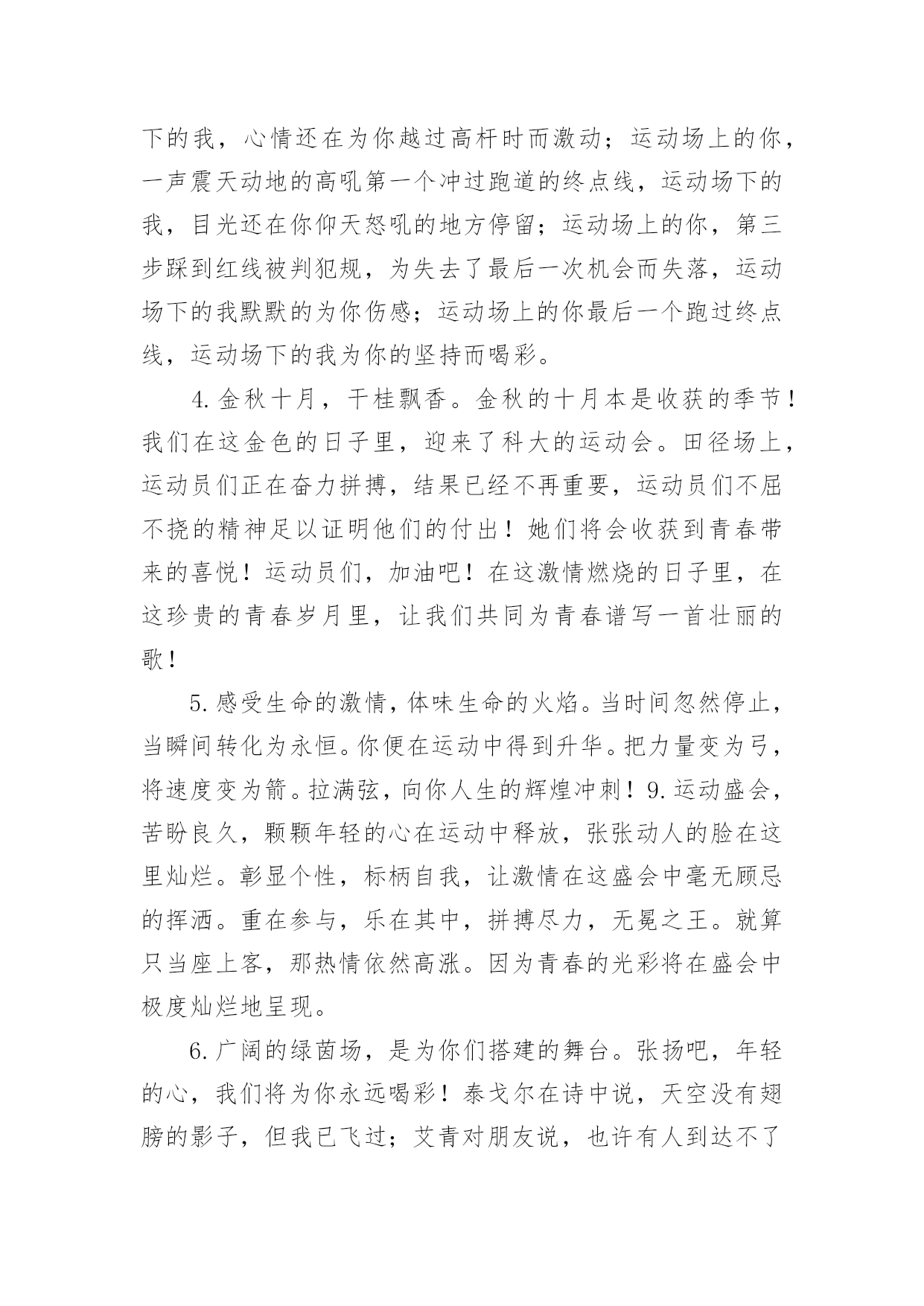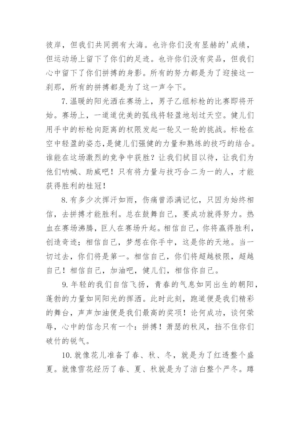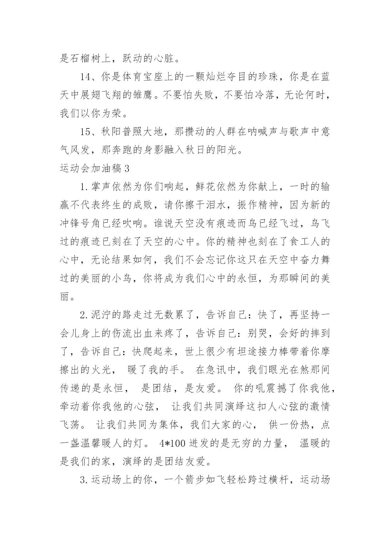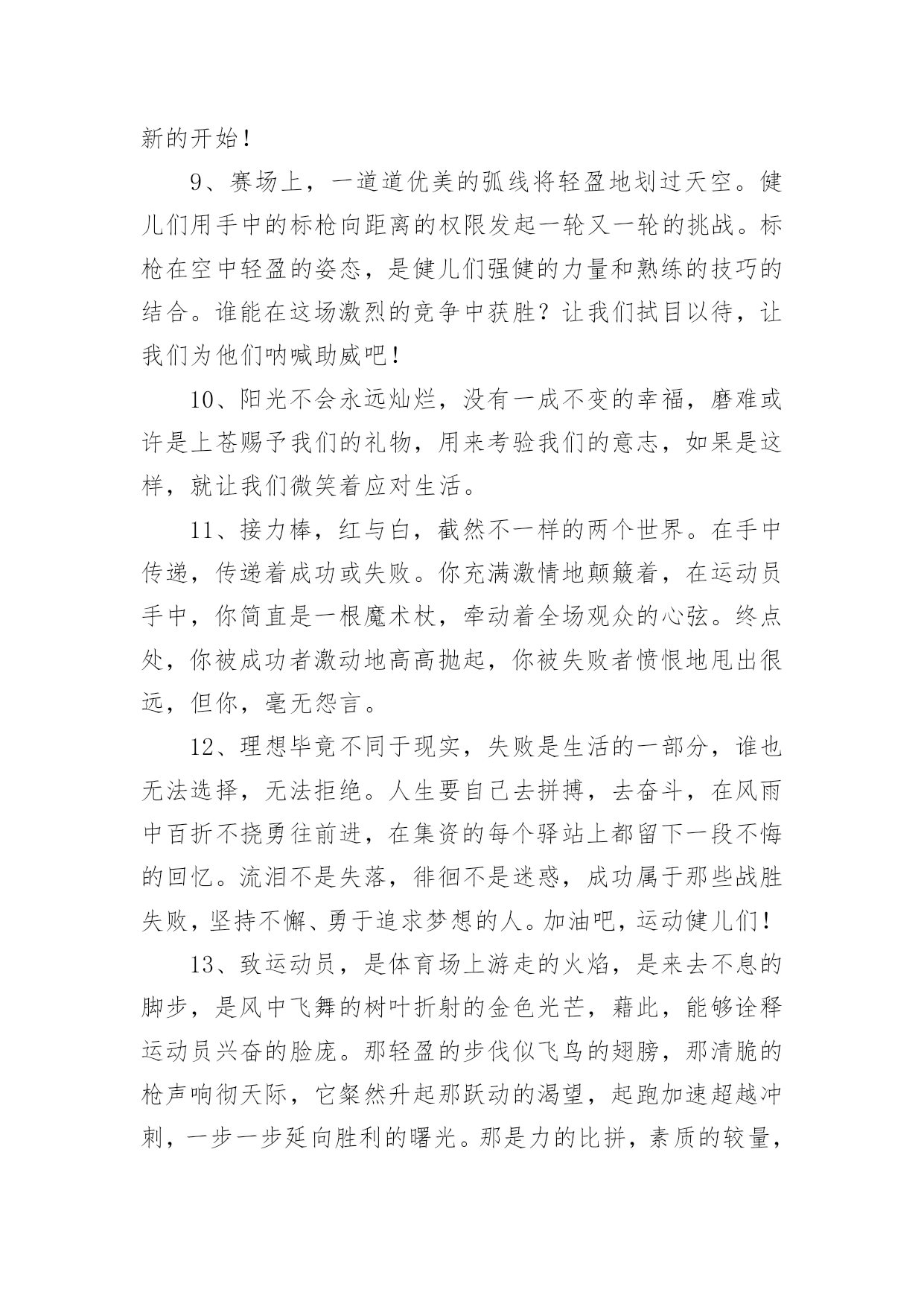 运动会加油稿运动会加油稿在生活中,我们使用上加油稿的情况与日俱增,借助加油稿可以激起人的希望,催人奋进。你知道加油稿怎样才能写的好吗?下面是小编收集整理的运动会加油稿,欢迎阅读与收藏。运动会加油稿11.亲爱的班健儿们,你们要充满自信。比赛中没有挡风的墙,没有遮风的伞,也没有撑船的帆,更没有拉船的纤。事在人为,人定胜天。原你们养精蓄锐,对充满爱意的世界说:“我自信,我拼搏,我会赢。2.时间在流逝,赛道在延伸,成功在你面前展现心脏的跳动,热血在沸腾,辉煌在你脚下铸就。加油吧,健儿们!3.数不请你跨出了多少坚实的步履,数不请你留下了多少汗滴。只有那悦耳的加油声,在你耳边环绕,激励你超越极限,超越自我。应对成功你从不自傲,应对失败你也只是轻轻一笑,你知道,你是我们永远的骄傲!4.我们班可爱的“梁老大”“吴宝鸡”,我们会在身后默默支持你的!会永远记住你们标志性的动作的,无二,那将会是运动场上的亮点!5.是体育场上游走的火焰,是来去不息的脚步,是风中飞舞的树叶折射的金色光芒,藉此,能够诠释运动员兴奋的脸庞。那轻盈的步伐似飞鸟的翅膀,那清脆的枪声响彻天际,它粲然升起那跃动的渴望,起跑加速超越冲刺,一步一步延向胜利的曙光。那是力的比拼,素质的较量,是石榴树上,跃动的心脏。6.这是意志的拼搏。这是速度的挑战。胜利在向你们招手/胜利在向你们呼唤。7.你们快如离弦之箭;疾似撒疆野马;你们的速度让我们惊叹;你们的精神让我们钦佩;流汗千日,只为今日一搏;疾踏百步,只为终点一触;胜利再向你微笑;成功在向你招手;加油啊!健儿们!8.汗水,泪水;笑声,歌声;我们尽情挥洒。开幕式上,运动场上,我们尽情展现,多少艰辛,多少困苦,我们勇敢承担。因为年轻,因为张扬,因为我们知道:用今日的汗水换来明天的微笑9.萧瑟的秋风,挡不住你们破竹的锐气,10.也许流星并不少见,但它燃烧的刹那,留给人间最美丽的回忆!也许笑脸并不少见,但胜利的喜悦,总会留给世界精彩的一瞬!是的,那些以前美妙的东西只有短短的一瞬间,但那却把最辉煌的一刻留给了人间。胜利,是每个人所追求的,胜利的喜悦,是胜利与重新开始的转折,胜利是新的开始!11.看到你们努力的样貌,我真得很感动。美华新蕾,多谢你们的坚持。我明白成功并不是每个运动员都能获得,看到赛后你们痛苦的表情,我真得很为难,不知就应鼓励你们还是安慰你们。成功的花终会绽放,不在此时便是彼时。米算什么?12.应对艰苦的征程,你们毫不畏惧,接力棒在你们手中传递着群众的力量,听,我们在为你呐喊,你们诠释着奥运的精神,你们是我们心中的骄傲,深深的呼吸,等待你的是艰难的米。相信胜利会属于你们,但在这征途上,需要你勇敢的心去应对。我们在为你加油,你是否听到了我们发自内心的呐喊,困难和胜利都在向你招手,去呀,不要犹豫,快去击败困难,快去夺取胜利,相信你会送给我们一个汗水浸湿的微笑13.看完了九年级女子米比赛,她们苍白的面孔,发干的嘴唇,让人看了不免有些心痛。琼瑶曾生婷婷你们飒爽的英姿在跑道上展现,全班同学都会为你们加油的。为你们骄傲。14.灰暗的天空下有你们的身影,那矫健的身姿在长空下奔驰,向着目标前进。那值得你们洒下汗水的地方,就在你们眼前闪耀,坚持住,你们是最棒的。加油,二班的运动员们!15.年轻的我们自信飞扬,青春的气息如同出生的.朝阳,蓬勃的力量如同阳光的挥洒。此时此刻,跑道便是我们精彩的舞台,声声加油便是我们的奖项!论何成功,谈何荣辱,心中的信念只有一个:拼搏!16.超越对手,超越自我,是我们的目标,是我们的信念,在清凉的初冬,在喧嚣的田径场上,你们点燃了似火的热情,无论成败,我们都为你们感到自豪,你们永远是我们的骄傲!17.你是运动场的心脏,跳动梦想;你是漫长路的精神,激励辉煌;你们是将上下求索的人!风为你加油,云为你助兴,坚定,执着,耐力与希望,在延伸的白色跑道中点点凝聚!力量,信念,拼搏与奋斗,在遥远的终点线上渐渐明亮!时代的强音正在你的脚下踏响。18.微凉的清风吹过你们的脸颊,吹拂过每个运动员的笑脸。我们拥有同一个梦想,怀着同样炽热的心。有付出就有希望。不管你们是否成功,你们永远是我们班的骄傲。加油!八年班。运动会加油稿21、数不请你跨出了多少坚实的步履,数不请你留下了多少汗滴。只有那悦耳的加油声,在你耳边环绕,激励你超越极限,超越自我。应对成功你从不自傲,应对失败你也只是轻轻一笑,你明白,你是我们永远的骄傲!2、在你的努力中,你滴下了汗水,它浸渍着你的全身,映射着太阳光辉,但是你明白吗那是每个毛孔,为之动容,而流下的泪水。3、某一天,醒在梦的旁边;手指间,光线有些个性;我能看得见,看见光在变,变成七彩的寓言,飞向梦的起点。某一天,飞奔在跑道间;两腮间,汗水不断流出;我能感觉到,感觉你在变,变成生活的强者,奔向成功的边缘!虽然,天阴沉沉的,虽