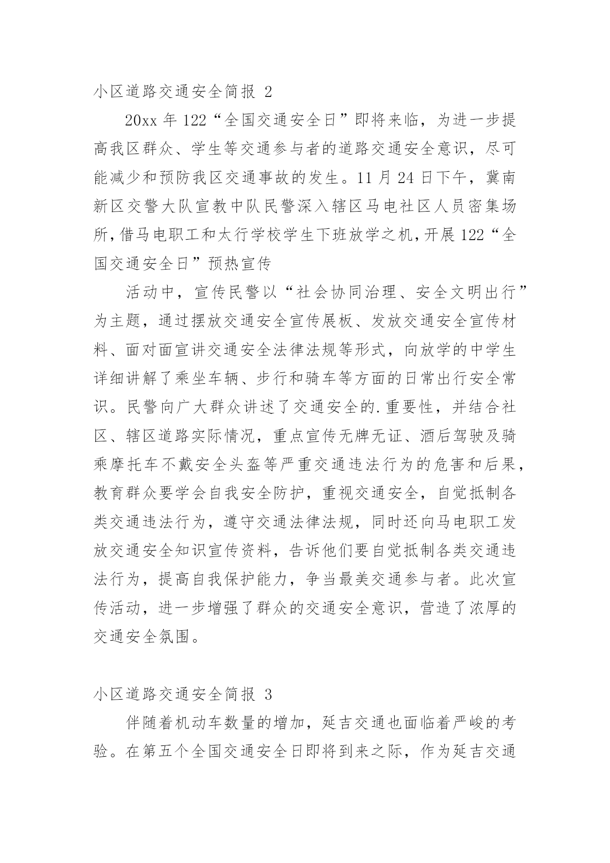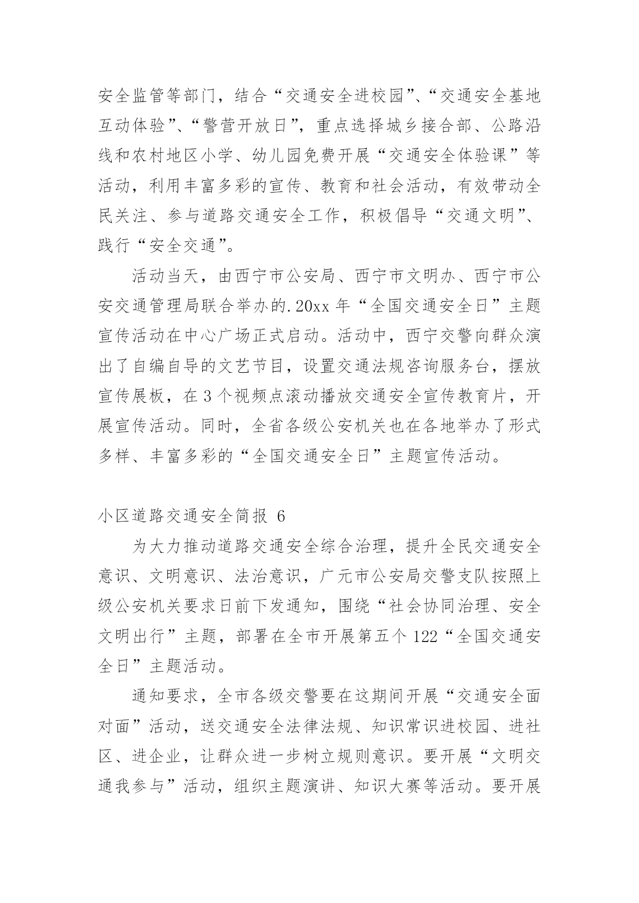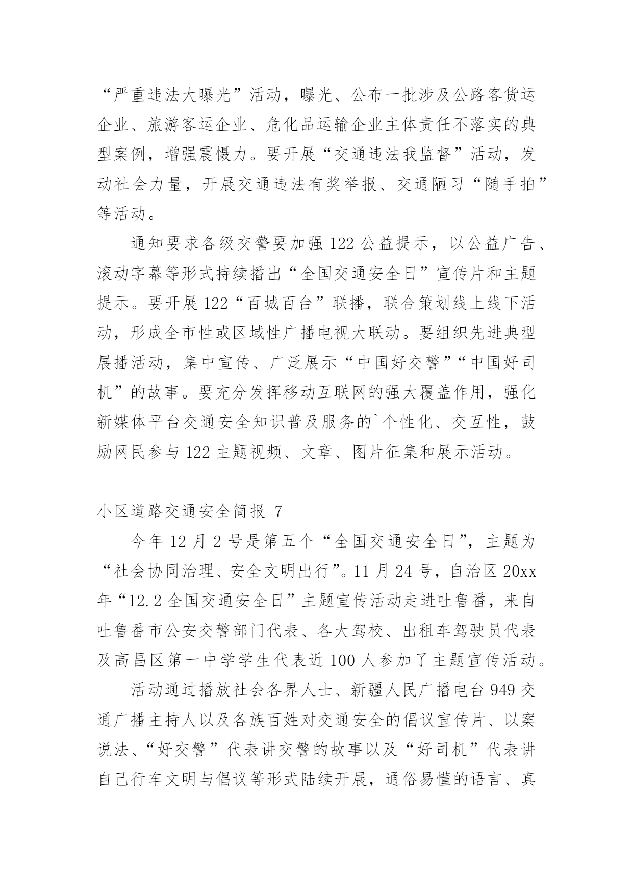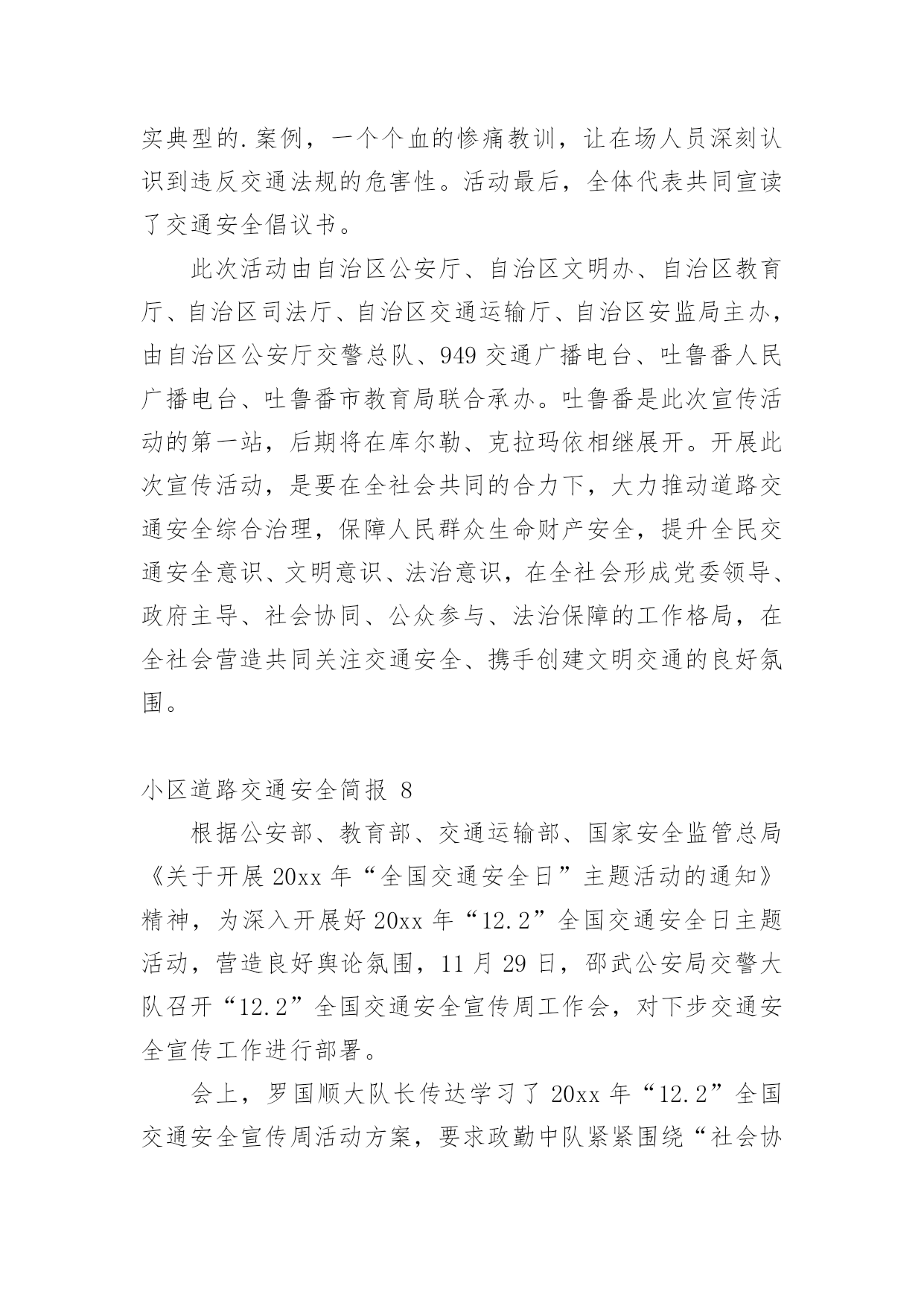 小区道路交通安全简报小区道路交通安全简报范文(通用21篇)在日新月异的现代社会中,许多人对一些广为流传的简报都不陌生吧,简报是简要的调查报告,简要的情况报告,简要的工作报告,简要的消息报道等。那么,怎么去写简报呢?以下是小编为大家收集的小区道路交通安全简报范文,希望对大家有所帮助。小区道路交通安全简报1为切实增强广大师生的冬季交通安全意识,提高学生的自我保护能力,有效预防和减少辖区师生道路交通事故的发生,近日,直属大队组织民警走倒淌河寄宿制小学,以学生喜闻乐见的`方式开展交通安全宣传工作。民警在课堂上用藏汉双语,通俗易懂的语言为学生讲解交通安全知识,展示宣传图片,并向学生发放大队印制的《致家长的一封信》。通过提问交通安全知识的`方式,与学生展开互动环节,使学生们在交流互动中了解更多的交通安全知识,同时,号召同学们“小手拉大手”要求同学们认真阅读宣传资料并传达给家长,告知家长了解学习交通法规的重要性和必要性,和家长一起学习交通安全法规。通过宣传进一步增强广大师生冬季出行交通安全意识、文明出行意识和自我保护能力,有效预防交通事故的发生。小区道路交通安全简报220xx年122“全国交通安全日”即将来临,为进一步提高我区群众、学生等交通参与者的道路交通安全意识,尽可能减少和预防我区交通事故的发生。11月24日下午,冀南新区交警大队宣教中队民警深入辖区马电社区人员密集场所,借马电职工和太行学校学生下班放学之机,开展122“全国交通安全日”预热宣传活动中,宣传民警以“社会协同治理、安全文明出行”为主题,通过摆放交通安全宣传展板、发放交通安全宣传材料、面对面宣讲交通安全法律法规等形式,向放学的中学生详细讲解了乘坐车辆、步行和骑车等方面的日常出行安全常识。民警向广大群众讲述了交通安全的.重要性,并结合社区、辖区道路实际情况,重点宣传无牌无证、酒后驾驶及骑乘摩托车不戴安全头盔等严重交通违法行为的危害和后果,教育群众要学会自我安全防护,重视交通安全,自觉抵制各类交通违法行为,遵守交通法律法规,同时还向马电职工发放交通安全知识宣传资料,告诉他们要自觉抵制各类交通违法行为,提高自我保护能力,争当最美交通参与者。此次宣传活动,进一步增强了群众的交通安全意识,营造了浓厚的交通安全氛围。小区道路交通安全简报3伴随着机动车数量的增加,延吉交通也面临着严峻的考验。在第五个全国交通安全日即将到来之际,作为延吉交通的参与者、管理者等群体,他们怎么理解“交通安全日”,他们眼中最讨厌的交通陋习又是哪些?记者走上街头,逐一进行采访。公交车司机郑师傅每天驾驶着公交车穿梭在延吉的大街小巷之中,通过广播他知道每年的12月2号是全国交通安全日。他对于交通陋习很有感触。郑师傅告诉记者,出租车在公交站点靠活、私家车将车停到站点附近,最让他头疼,郑师傅说:“你就看这11路站点和15路站点,私家车都给占满了,11路没招就点停大道儿边。车到这边没地方停就调头走吧,发车走了,没地方停车往哪里停。”由于车辆的增加,每天固定几个时段,延吉市区内多个路段就会出现车辆拥堵的情况。交警在路面上的疏导,多少缓解了拥堵状况。可在交警眼中,其实很多拥堵可以避免,只要行车人能够做到文明开车、文明出行。延吉市交警大队河北中队中队长崔东海解说:“像四中很多时候为什么堵,我们有时候在那发现有逆向行驶的,有闯红灯的,造成路口交通拥堵。现在,延吉市普遍存在的一些违法停车,不按规定停车的.现象特别多。就像我们现在在延边医院治理,天天拖也天天有停车的。很多司机路口允许停车,他也不按正规要求停车,都是斜着停的车,那个现象特别严重。”今年全国交通安全日的主题是“社会协同治理,安全文明出行”。从主题上也不难看出,营造一个安全、畅通的交通环境,需要的力量不是一个人,更不是一个部门。它需要所有交通参与者、交通管理者共同协作完成。作为全州最专业的交通媒体,延边人民广播电台交通文艺广播也深知这一点,并一直在与交通参与者、交通管理者一起,为营造和谐、安全的交通环境努力着。延边人民广播电台交通文艺广播主持人慕韬说:“今年的12月2日是第x个“122全国交通安全日”,近期我们搭建了交通安全方面的建言献策的平台,把一些好的交通方面的合理化意见和建议反映给交通的管理部门和政府有关职能部门。今年交通日的主题是“社会协同治理、安全文明出行”。我觉得作为交通媒体的工作者,我们的责任很重,我们也希望能够和交通管理者、交通参与者一道,创造文明、和谐的交通安全环境。”小区道路交通安全简报4为全面推动第五个“全国交通安全日”宣传活动的开展,在全社会营造共同关注交通安全、携手创建文明交通的良好氛围,辽宁省公安厅交通安全管理局、大连市公安局交通警察支队结合今年“社会协同治理、安全文明出行”这一主题,于11月30日下午,在大连理工大学举办了“关爱高校学子畅享平