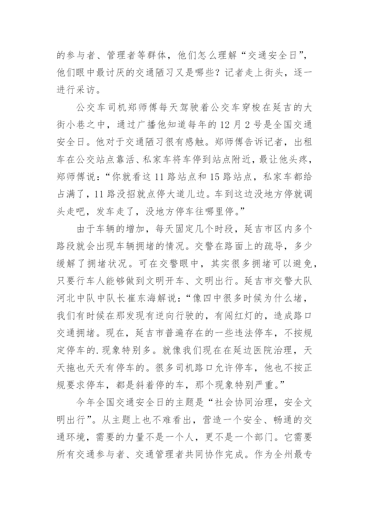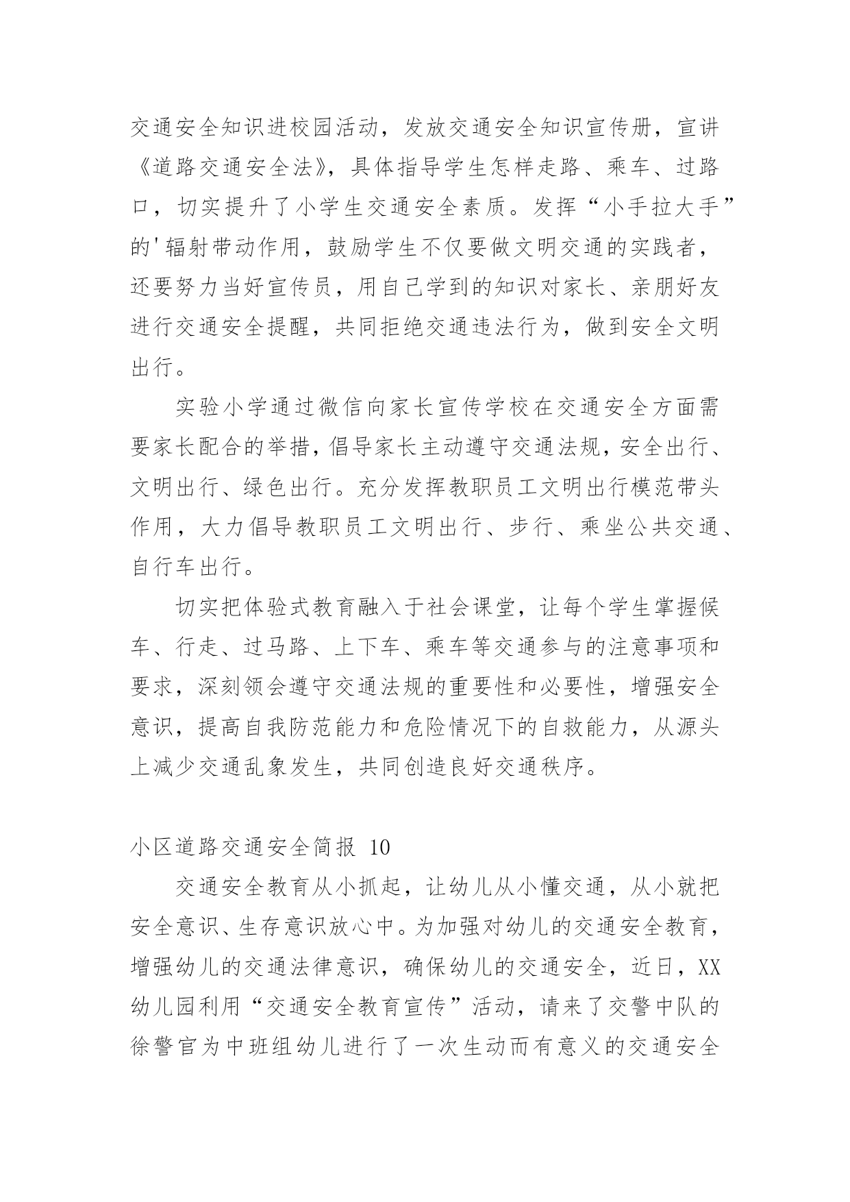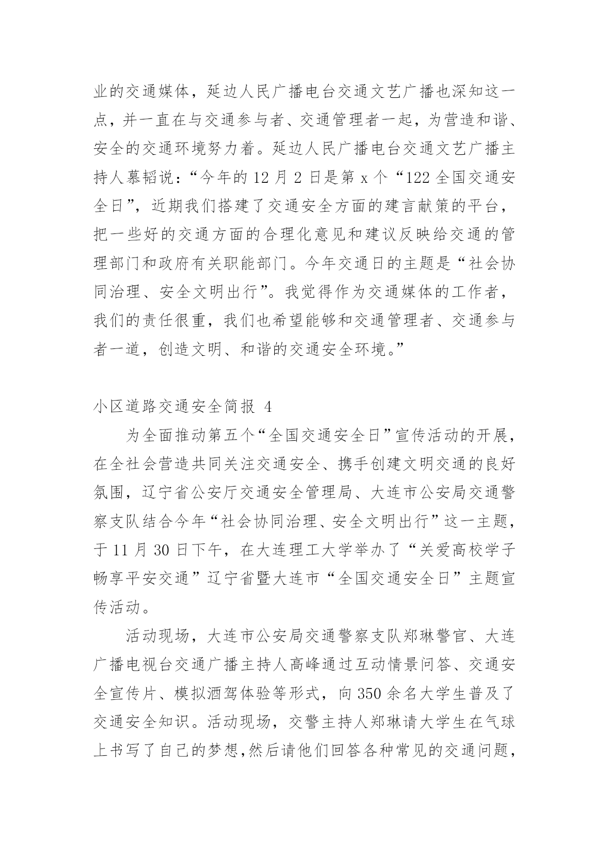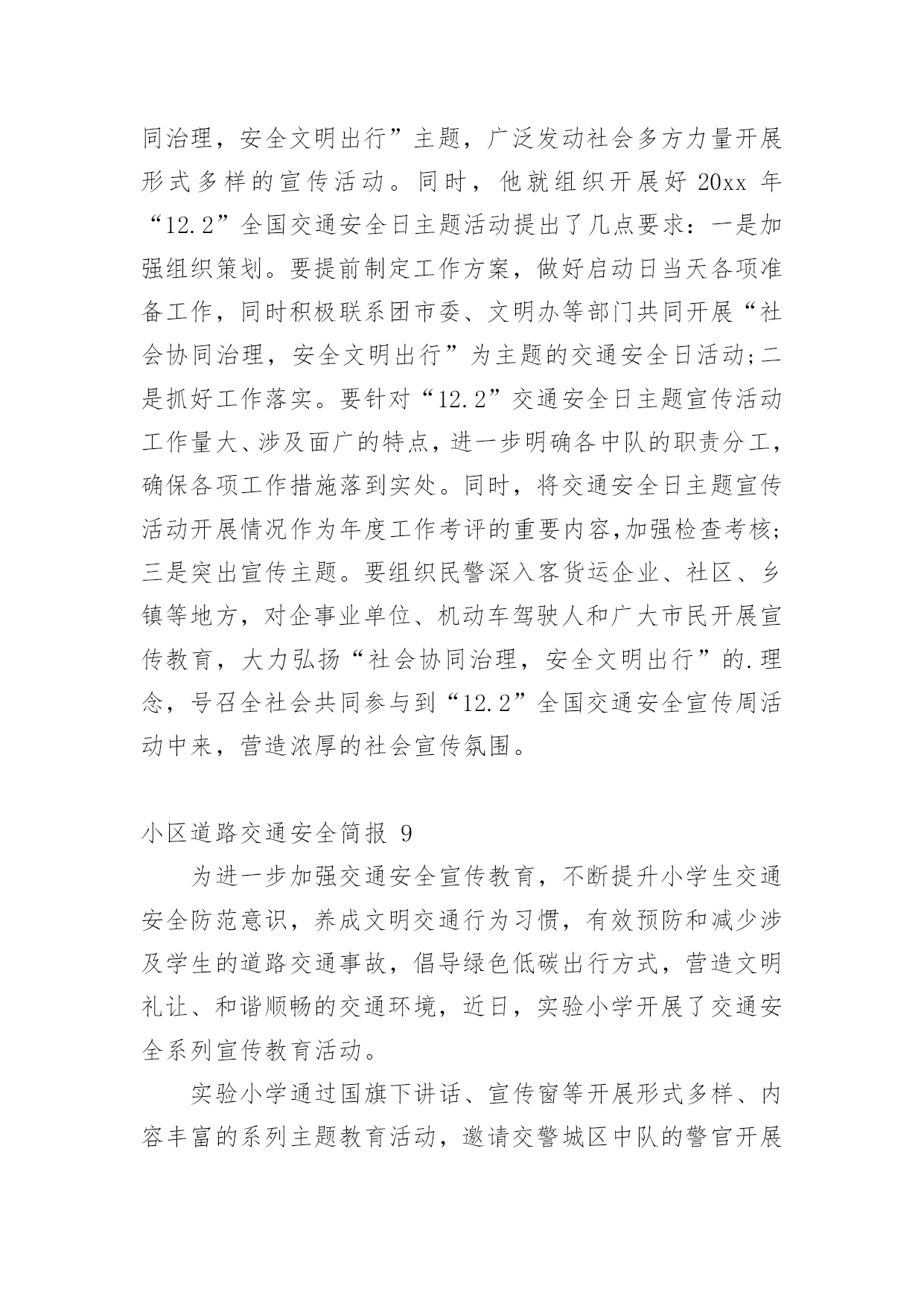 小区道路交通安全简报小区道路交通安全简报范文(通用21篇)在日新月异的现代社会中,许多人对一些广为流传的简报都不陌生吧,简报是简要的调查报告,简要的情况报告,简要的工作报告,简要的消息报道等。那么,怎么去写简报呢?以下是小编为大家收集的小区道路交通安全简报范文,希望对大家有所帮助。小区道路交通安全简报1为切实增强广大师生的冬季交通安全意识,提高学生的自我保护能力,有效预防和减少辖区师生道路交通事故的发生,近日,直属大队组织民警走倒淌河寄宿制小学,以学生喜闻乐见的`方式开展交通安全宣传工作。民警在课堂上用藏汉双语,通俗易懂的语言为学生讲解交通安全知识,展示宣传图片,并向学生发放大队印制的《致家长的一封信》。通过提问交通安全知识的`方式,与学生展开互动环节,使学生们在交流互动中了解更多的交通安全知识,同时,号召同学们“小手拉大手”要求同学们认真阅读宣传资料并传达给家长,告知家长了解学习交通法规的重要性和必要性,和家长一起学习交通安全法规。通过宣传进一步增强广大师生冬季出行交通安全意识、文明出行意识和自我保护能力,有效预防交通事故的发生。小区道路交通安全简报220xx年122“全国交通安全日”即将来临,为进一步提高我区群众、学生等交通参与者的道路交通安全意识,尽可能减少和预防我区交通事故的发生。11月24日下午,冀南新区交警大队宣教中队民警深入辖区马电社区人员密集场所,借马电职工和太行学校学生下班放学之机,开展122“全国交通安全日”预热宣传活动中,宣传民警以“社会协同治理、安全文明出行”为主题,通过摆放交通安全宣传展板、发放交通安全宣传材料、面对面宣讲交通安全法律法规等形式,向放学的中学生详细讲解了乘坐车辆、步行和骑车等方面的日常出行安全常识。民警向广大群众讲述了交通安全的.重要性,并结合社区、辖区道路实际情况,重点宣传无牌无证、酒后驾驶及骑乘摩托车不戴安全头盔等严重交通违法行为的危害和后果,教育群众要学会自我安全防护,重视交通安全,自觉抵制各类交通违法行为,遵守交通法律法规,同时还向马电职工发放交通安全知识宣传资料,告诉他们要自觉抵制各类交通违法行为,提高自我保护能力,争当最美交通参与者。此次宣传活动,进一步增强了群众的交通安全意识,营造了浓厚的交通安全氛围。小区道路交通安全简报3伴随着机动车数量的增加,延吉交通也面临着严峻的考验。在第五个全国交通安全日即将到来之际,作为延吉交通的参与者、管理者等群体,他们怎么理解“交通安全日”,他们眼中最讨厌的交通陋习又是哪些?记者走上街头,逐一进行采访。公交车司机郑师傅每天驾驶着公交车穿梭在延吉的大街小巷之中,通过广播他知道每年的12月2号是全国交通安全日。他对于交通陋习很有感触。郑师傅告诉记者,出租车在公交站点靠活、私家车将车停到站点附近,最让他头疼,郑师傅说:“你就看这11路站点和15路站点,私家车都给占满了,11路没招就点停大道儿边。车到这边没地方停就调头走吧,发车走了,没地方停车往哪里停。”由于车辆的增加,每天固定几个时段,延吉市区内多个路段就会出现车辆拥堵的情况。交警在路面上的疏导,多少缓解了拥堵状况。可在交警眼中,其实很多拥堵可以避免,只要行车人能够做到文明开车、文明出行。延吉市交警大队河北中队中队长崔东海解说:“像四中很多时候为什么堵,我们有时候在那发现有逆向行驶的,有闯红灯的,造成路口交通拥堵。现在,延吉市普遍存在的一些违法停车,不按规定停车的.现象特别多。就像我们现在在延边医院治理,天天拖也天天有停车的。很多司机路口允许停车,他也不按正规要求停车,都是斜着停的车,那个现象特别严重。”今年全国交通安全日的主题是“社会协同治理,安全文明出行”。从主题上也不难看出,营造一个安全、畅通的交通环境,需要的力量不是一个人,更不是一个部门。它需要所有交通参与者、交通管理者共同协作完成。作为全州最专业的交通媒体,延边人民广播电台交通文艺广播也深知这一点,并一直在与交通参与者、交通管理者一起,为营造和谐、安全的交通环境努力着。延边人民广播电台交通文艺广播主持人慕韬说:“今年的12月2日是第x个“122全国交通安全日”,近期我们搭建了交通安全方面的建言献策的平台,把一些好的交通方面的合理化意见和建议反映给交通的管理部门和政府有关职能部门。今年交通日的主题是“社会协同治理、安全文明出行”。我觉得作为交通媒体的工作者,我们的责任很重,我们也希望能够和交通管理者、交通参与者一道,创造文明、和谐的交通安全环境。”小区道路交通安全简报4为全面推动第五个“全国交通安全日”宣传活动的开展,在全社会营造共同关注交通安全、携手创建文明交通的良好氛围,辽宁省公安厅交通安全管理局、大连市公安局交通警察支队结合今年“社会协同治理、安全文明出行”这一主题,于11月30日下午,在大连理工大学举办了“关爱高校学子畅享平