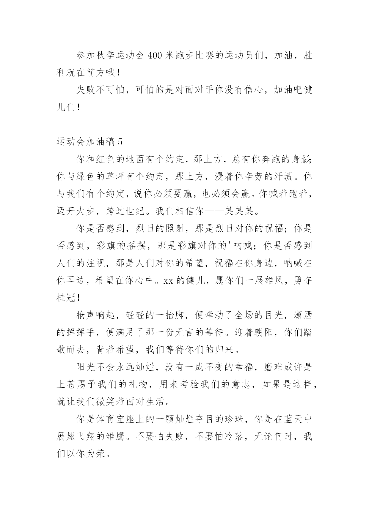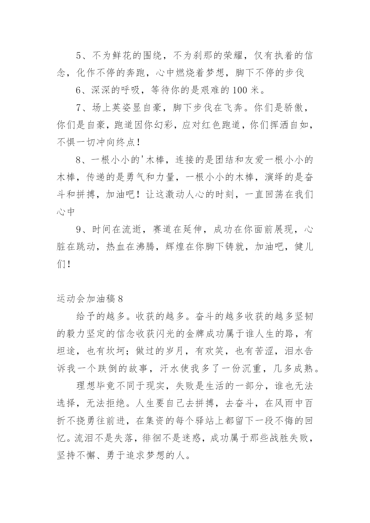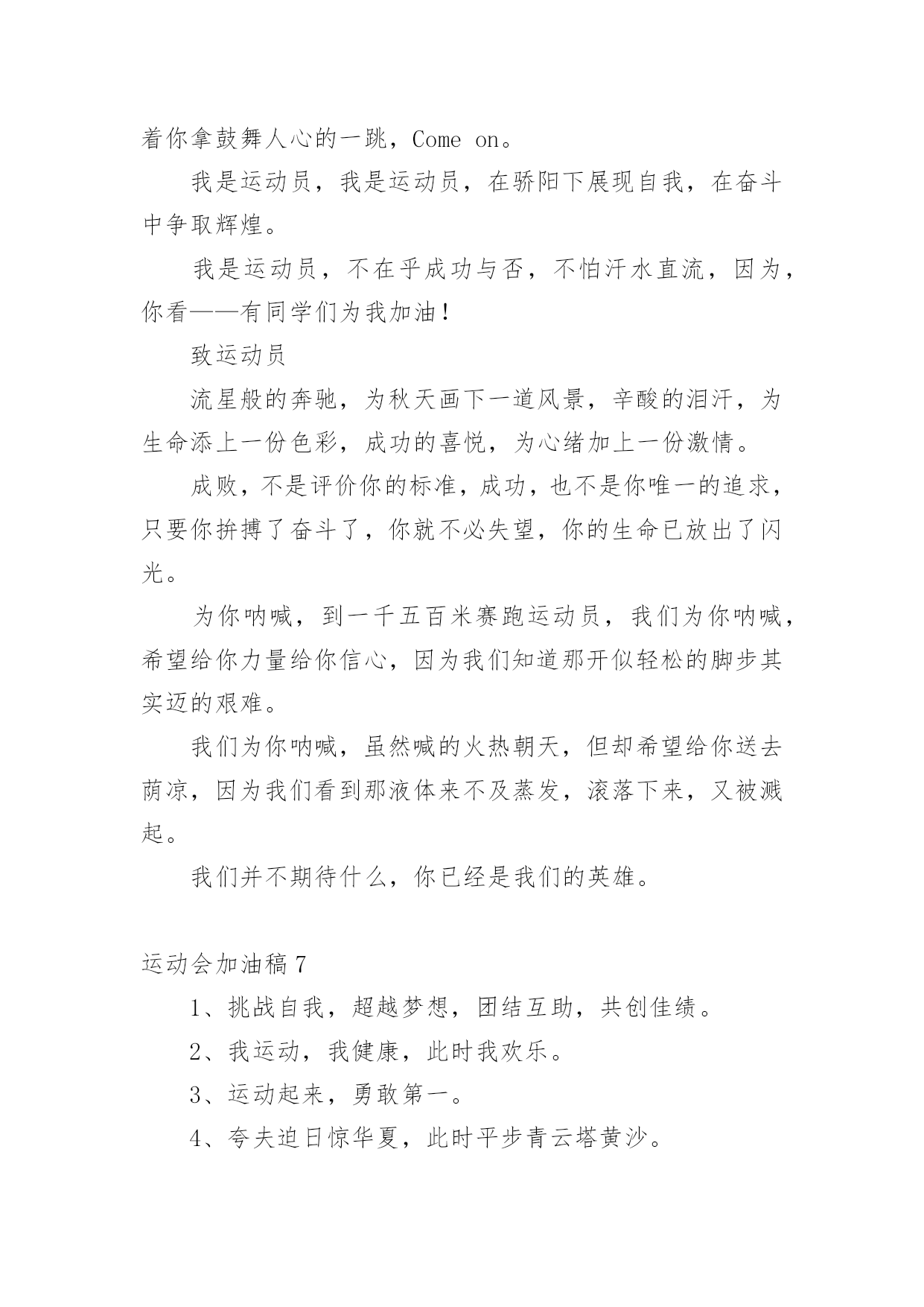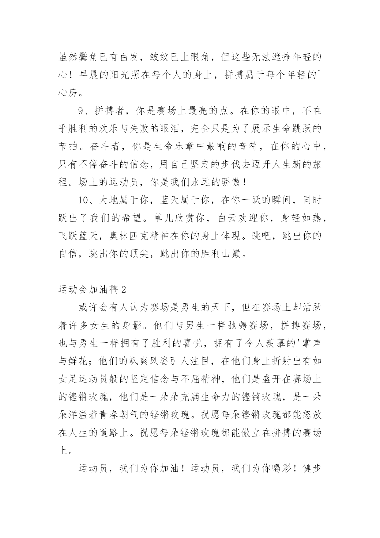 运动会加油稿运动会加油稿(集锦15篇)在现在的社会生活中,我们很多时候都不得不用到加油稿,加油稿可以给予对方克服困难的勇气和信心。你所见过的加油稿是什么样的呢?以下是小编为大家整理的运动会加油稿,希望能够帮助到大家。运动会加油稿11、奥林匹克精神佳,运动健将拼搏强。在运动场上的运动健儿们,发挥你们的特长,展示你们的风采,让你们的身影在运动场上留下优美的风景线,让你们的雄心壮志在运动场上发挥的淋漓尽致。2、山不在高,有仙则名;水不在深,有龙则灵;人不在多,有你则行。运动员们,你们那英姿飒爽豪迈的步履,深深地牵引着我们这些观众的心,让我们不分班级情不自禁的为你们呐喊,不由自主的为你们的胜利而兴奋。你们——运动场上的灵魂,你们——烈日下的主宰者,你们——我们之中的佼佼者,你们——我们骄傲的理由……因为有你,我们感到自豪。因支持,我们必胜!3、在生活中,有成功,也会有失败。因此,我们要放飞生命,也许远方很渺茫,也许我们要被“倾覆于人生的荆棘”刺伤,但我们仍无怨无悔。放飞,即使是黄昏,也必然布满歌唱的流霞,因为我们坚信,不经过战斗的舍弃是虚伪的,不经过劫难磨炼的超脱是轻佻的,逃避显示的明哲是卑怯的。4、谁能在这场激烈的竞争中获胜?让我们拭目以待,让我们为他们呐喊助威吧!只有将力量与技巧合二为一的人,才能获得胜利的桂冠!5、不到最后一刻,绝不轻言放弃,责成了你们的信仰,也成了我们的信仰,运动员们,飞吧!翅膀属于你。致百米运动员最想目睹的是你的风姿,最想倾听的是你的呼吸,最想感觉的是你呼啸而过的骤风,今日,你们是焦点;今日,你们是骄傲;今日,我们看你们创造辉煌。6、有多少次挥汗如雨,伤+痛曾添满记忆,只因为始终相信,去拼搏才能胜利。总在鼓舞自己,要成功就得努力。热血在赛场沸腾,巨人在赛场升起。相信自己,你将赢得胜利,创造奇迹;相信自己,梦想在你手中,这是你的天地。当一切过去,你们将是第一。相信自己,你们将超越极限,超越自己!相信自己,加油吧,健儿们,相信你自己。7、可敬的运动员,努力吧,前进吧,你们是强者,能战胜困难,奋勇进取;你们是鲜花,能给我班增添一道亮丽的风景线;你们是水滴的源泉,愿你们能发挥出令人意想不到的成绩;你们是佼佼者,是独一无二的,加油吧!我们的希望都寄托在你们的身上。8、在操场上,除了同学以外,还有我们的老师。今日在操场上,他们以自己的行动,为我们树立努力拼搏的榜样。虽然鬓角已有白发,皱纹已上眼角,但这些无法遮掩年轻的心!早晨的阳光照在每个人的身上,拼搏属于每个年轻的`心房。9、拼搏者,你是赛场上最亮的点。在你的眼中,不在乎胜利的欢乐与失败的眼泪,完全只是为了展示生命跳跃的节拍。奋斗者,你是生命乐章中最响的音符,在你的心中,只有不停奋斗的信念,用自己坚定的步伐去迈开人生新的旅程。场上的运动员,你是我们永远的骄傲!10、大地属于你,蓝天属于你,在你一跃的瞬间,同时跃出了我们的希望。草儿欣赏你,白云欢迎你,身轻如燕,飞跃蓝天,奥林匹克精神在你的身上体现。跳吧,跳出你的自信,跳出你的顶尖,跳出你的胜利山巅。运动会加油稿2或许会有人认为赛场是男生的天下,但在赛场上却活跃着许多女生的身影。他们与男生一样驰骋赛场,拼搏赛场,也与男生一样拥有了胜利的喜悦,拥有了令人羡慕的'掌声与鲜花;他们的飒爽风姿引人注目,在他们身上折射出有如女足运动员般的坚定信念与不屈精神,他们是盛开在赛场上的铿锵玫瑰,他们是一朵朵充满生命力的铿锵玫瑰,是一朵朵洋溢着青春朝气的铿锵玫瑰。祝愿每朵铿锵玫瑰都能怒放在人生的道路上。祝愿每朵铿锵玫瑰都能傲立在拼搏的赛场上。运动员,我们为你加油!运动员,我们为你喝彩!健步腾飞,冲向终点之路不再遥远;英姿飒爽,诚挚欢呼之声因你嘹亮;奋勇冲刺,宽阔天空之美更加湛蓝。运动健儿们,我们为你欢呼,脚下红色的跑道是你驰骋的战场。啊!激情澎湃,血液沸腾。释放心中积蓄的豪情,敞开钦慕的心扉,我们尽情欢呼。运动健将们,终点就在眼前,加油,加油!成功就在脚下。运动会加油稿3磨练的是非凡的毅力,较量的是超常的体力,拚搏的是出类拔萃的耐力,把长长的跑道跑成一段漫漫的征程。听,呼啸的风在为你喝彩;看,猎猎的彩旗在为你加油!加油吧,为了那辉煌的一瞬间!为你们骄傲,为你们喝彩。运动场上有你们的步伐,那是辛苦汗水的.抒发,你就像天边的云端,有彩霞的绚丽色彩。奔驰的骏马,飞奔的步伐让你的胜利在前方等待。为你们祝福,为你们喝彩!1500米不算长,人生贵在拼一场。健儿奔跑比健康,同龄同路谁最强!风采撒满跑道上,赛场佳绩美名扬!起跑线上你们一字排开健美的肌肉蕴含着爆发力量坚定的目光中充满了自信枪响了。你们开始了并不长的征程笔直的跑道上有你们稳健的足迹不远的终点,将留下你们冲刺时矫捷的背影,加油吧!掌声将为你响起!加油吧!胜利和鲜花终将属于你们。如海上的浪花,似
