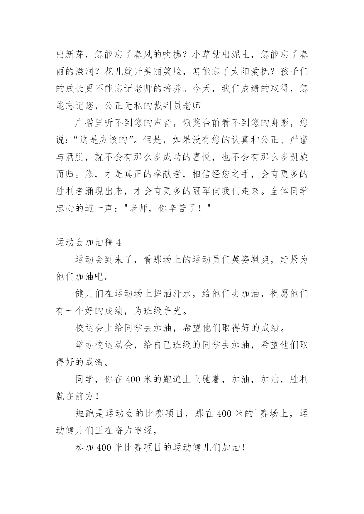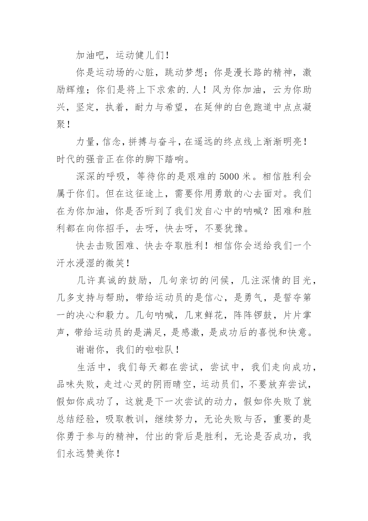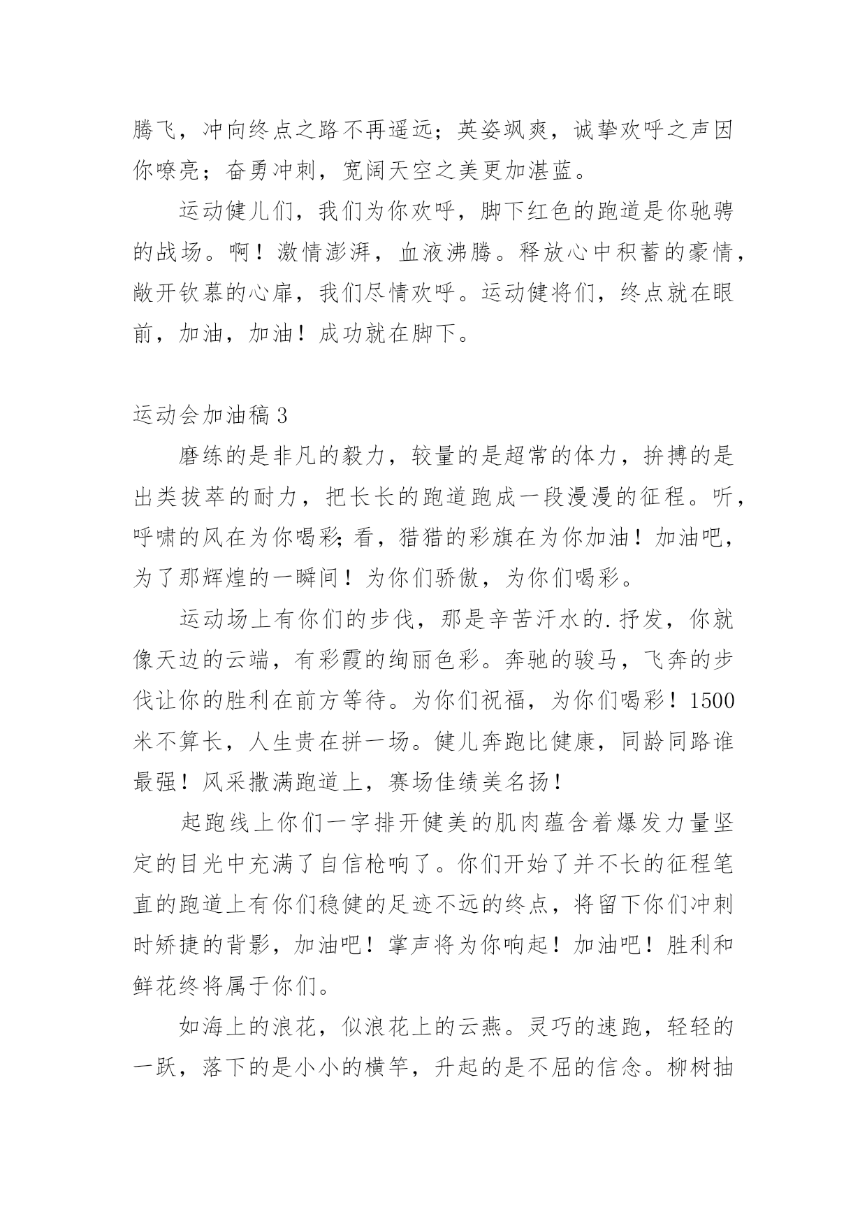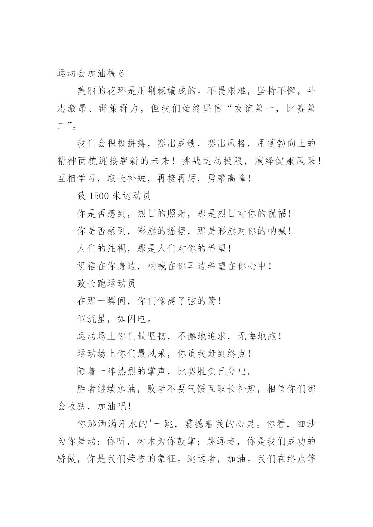 运动会加油稿运动会加油稿(集锦15篇)在现在的社会生活中,我们很多时候都不得不用到加油稿,加油稿可以给予对方克服困难的勇气和信心。你所见过的加油稿是什么样的呢?以下是小编为大家整理的运动会加油稿,希望能够帮助到大家。运动会加油稿11、奥林匹克精神佳,运动健将拼搏强。在运动场上的运动健儿们,发挥你们的特长,展示你们的风采,让你们的身影在运动场上留下优美的风景线,让你们的雄心壮志在运动场上发挥的淋漓尽致。2、山不在高,有仙则名;水不在深,有龙则灵;人不在多,有你则行。运动员们,你们那英姿飒爽豪迈的步履,深深地牵引着我们这些观众的心,让我们不分班级情不自禁的为你们呐喊,不由自主的为你们的胜利而兴奋。你们——运动场上的灵魂,你们——烈日下的主宰者,你们——我们之中的佼佼者,你们——我们骄傲的理由……因为有你,我们感到自豪。因支持,我们必胜!3、在生活中,有成功,也会有失败。因此,我们要放飞生命,也许远方很渺茫,也许我们要被“倾覆于人生的荆棘”刺伤,但我们仍无怨无悔。放飞,即使是黄昏,也必然布满歌唱的流霞,因为我们坚信,不经过战斗的舍弃是虚伪的,不经过劫难磨炼的超脱是轻佻的,逃避显示的明哲是卑怯的。4、谁能在这场激烈的竞争中获胜?让我们拭目以待,让我们为他们呐喊助威吧!只有将力量与技巧合二为一的人,才能获得胜利的桂冠!5、不到最后一刻,绝不轻言放弃,责成了你们的信仰,也成了我们的信仰,运动员们,飞吧!翅膀属于你。致百米运动员最想目睹的是你的风姿,最想倾听的是你的呼吸,最想感觉的是你呼啸而过的骤风,今日,你们是焦点;今日,你们是骄傲;今日,我们看你们创造辉煌。6、有多少次挥汗如雨,伤+痛曾添满记忆,只因为始终相信,去拼搏才能胜利。总在鼓舞自己,要成功就得努力。热血在赛场沸腾,巨人在赛场升起。相信自己,你将赢得胜利,创造奇迹;相信自己,梦想在你手中,这是你的天地。当一切过去,你们将是第一。相信自己,你们将超越极限,超越自己!相信自己,加油吧,健儿们,相信你自己。7、可敬的运动员,努力吧,前进吧,你们是强者,能战胜困难,奋勇进取;你们是鲜花,能给我班增添一道亮丽的风景线;你们是水滴的源泉,愿你们能发挥出令人意想不到的成绩;你们是佼佼者,是独一无二的,加油吧!我们的希望都寄托在你们的身上。8、在操场上,除了同学以外,还有我们的老师。今日在操场上,他们以自己的行动,为我们树立努力拼搏的榜样。虽然鬓角已有白发,皱纹已上眼角,但这些无法遮掩年轻的心!早晨的阳光照在每个人的身上,拼搏属于每个年轻的`心房。9、拼搏者,你是赛场上最亮的点。在你的眼中,不在乎胜利的欢乐与失败的眼泪,完全只是为了展示生命跳跃的节拍。奋斗者,你是生命乐章中最响的音符,在你的心中,只有不停奋斗的信念,用自己坚定的步伐去迈开人生新的旅程。场上的运动员,你是我们永远的骄傲!10、大地属于你,蓝天属于你,在你一跃的瞬间,同时跃出了我们的希望。草儿欣赏你,白云欢迎你,身轻如燕,飞跃蓝天,奥林匹克精神在你的身上体现。跳吧,跳出你的自信,跳出你的顶尖,跳出你的胜利山巅。运动会加油稿2或许会有人认为赛场是男生的天下,但在赛场上却活跃着许多女生的身影。他们与男生一样驰骋赛场,拼搏赛场,也与男生一样拥有了胜利的喜悦,拥有了令人羡慕的'掌声与鲜花;他们的飒爽风姿引人注目,在他们身上折射出有如女足运动员般的坚定信念与不屈精神,他们是盛开在赛场上的铿锵玫瑰,他们是一朵朵充满生命力的铿锵玫瑰,是一朵朵洋溢着青春朝气的铿锵玫瑰。祝愿每朵铿锵玫瑰都能怒放在人生的道路上。祝愿每朵铿锵玫瑰都能傲立在拼搏的赛场上。运动员,我们为你加油!运动员,我们为你喝彩!健步腾飞,冲向终点之路不再遥远;英姿飒爽,诚挚欢呼之声因你嘹亮;奋勇冲刺,宽阔天空之美更加湛蓝。运动健儿们,我们为你欢呼,脚下红色的跑道是你驰骋的战场。啊!激情澎湃,血液沸腾。释放心中积蓄的豪情,敞开钦慕的心扉,我们尽情欢呼。运动健将们,终点就在眼前,加油,加油!成功就在脚下。运动会加油稿3磨练的是非凡的毅力,较量的是超常的体力,拚搏的是出类拔萃的耐力,把长长的跑道跑成一段漫漫的征程。听,呼啸的风在为你喝彩;看,猎猎的彩旗在为你加油!加油吧,为了那辉煌的一瞬间!为你们骄傲,为你们喝彩。运动场上有你们的步伐,那是辛苦汗水的.抒发,你就像天边的云端,有彩霞的绚丽色彩。奔驰的骏马,飞奔的步伐让你的胜利在前方等待。为你们祝福,为你们喝彩!1500米不算长,人生贵在拼一场。健儿奔跑比健康,同龄同路谁最强!风采撒满跑道上,赛场佳绩美名扬!起跑线上你们一字排开健美的肌肉蕴含着爆发力量坚定的目光中充满了自信枪响了。你们开始了并不长的征程笔直的跑道上有你们稳健的足迹不远的终点,将留下你们冲刺时矫捷的背影,加油吧!掌声将为你响起!加油吧!胜利和鲜花终将属于你们。如海上的浪花,似