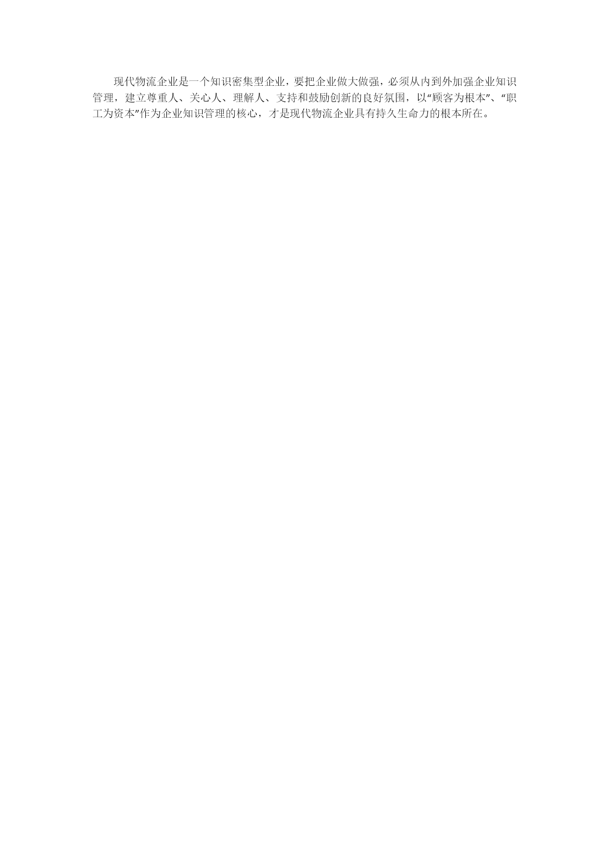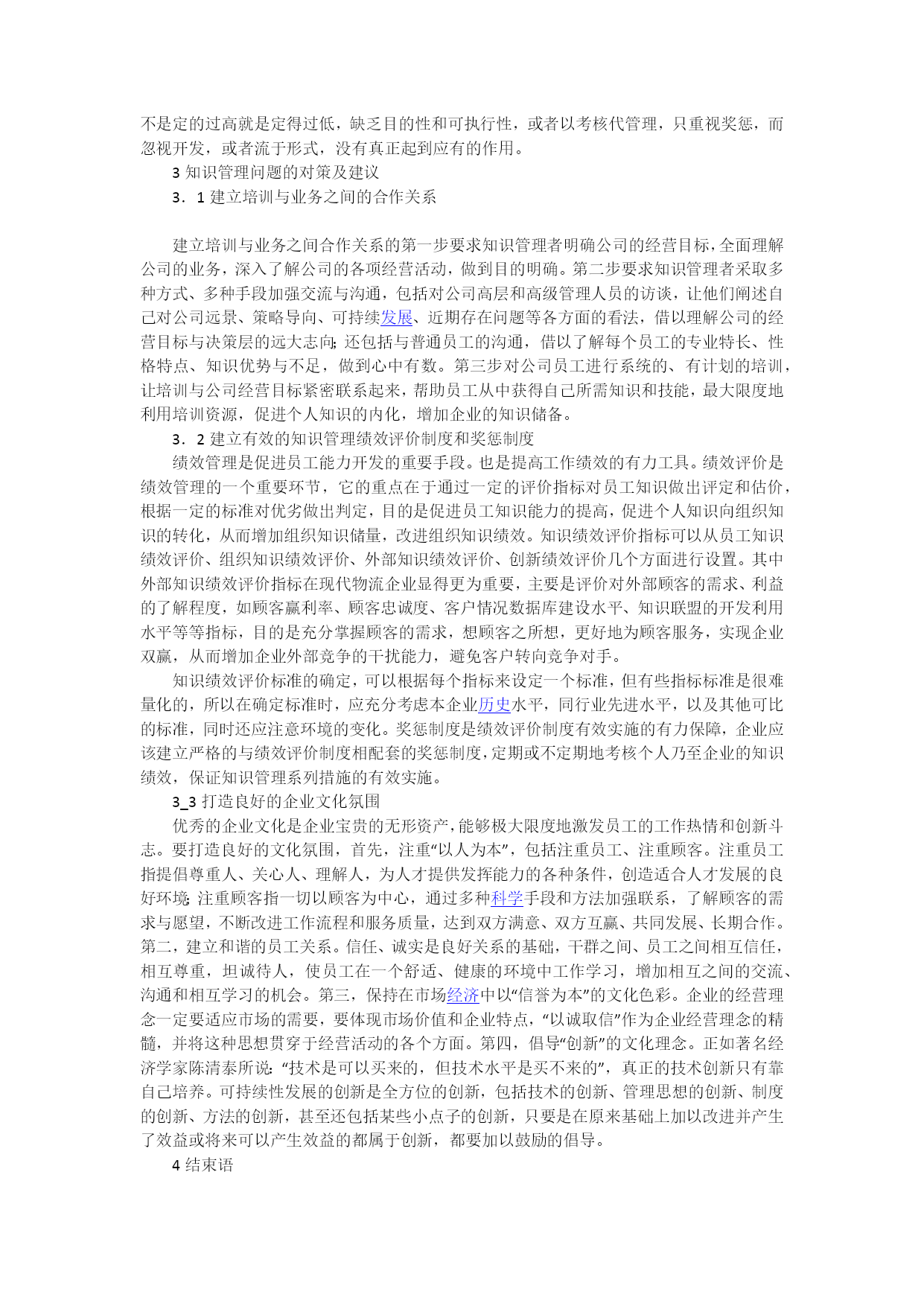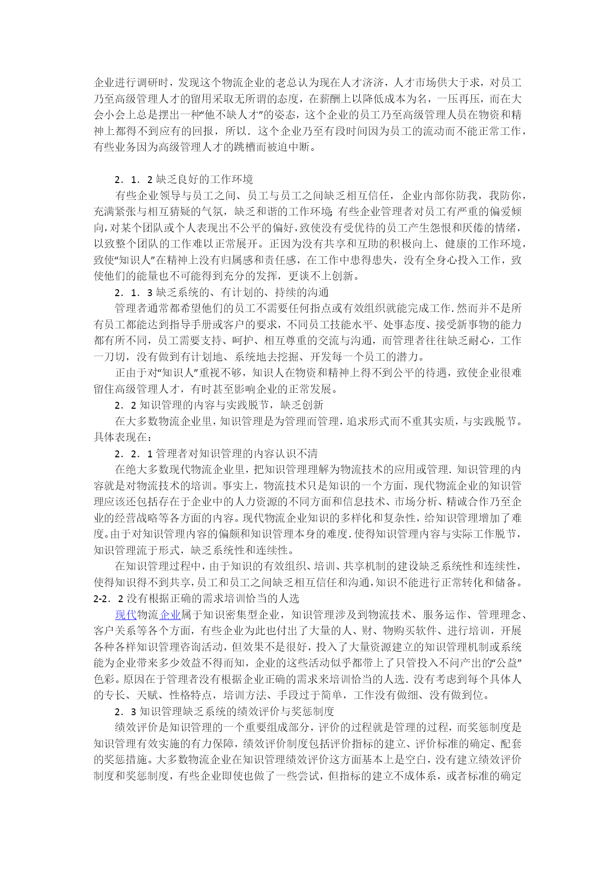 现代物流企业知识管理问题分析HYPERLINK"http://www.studa.net/"论文关键词:HYPERLINK"http://www.studa.net/dangdai/"现代物流HYPERLINK"http://www.studa.net/company/"企业知识管理}存在问题对策及建议论文摘要:从分析现代物流企业知识、知识管理的特点出发,指出了现代物流企业在知识管理过程中存在的主要问题,并从培训、绩效评价、文化氛围三个方面提出了改进建议。在知识HYPERLINK"http://www.studa.net/Economic/"经济时代,知识及知识管理被认为是企业最具竞争力的有力保障。现代物流企业是集物流运作现代化、物流技术现代化、物流管理现代化于一体的现代物流服务型企业,面对知识经济的浪潮,知识资源的管理在现代物流企业管理中显得尤为重要。l现代物流企业知识管理的特征1.1现代物流企业的特征现代物流企业是相对于传统物流企业而言的,是指以信息技术为支撑,借助现代HYPERLINK"http://www.studa.net/gongxue/"科学技术,将运输、仓储、包装、配送等功能实行高效率有机结合起来的一个价值链。现代物流企业的物流运作、物流管理是十分复杂的体系,各方面的配合十分严密,必须使用先进的技术、设备与现代化的管理手段,是一个知识密集、技术密集的经济实体,知识已替代实物资本成为企业增长的根本动力、成为增强企业核心竞争力的主要源泉。1.2现代物流企业知识及知识管理的特征1.2.1现代物流企业知识的特征知识包括显性知识和隐性知识两类。显性知识指可用语言、文字或符号表达的知识,如书本知识、物流企业的制度、法规等,隐性知识指那些非正式的、难以用文字和语言表达的技能、技巧、经验和诀窍等。显性知识容易通过HYPERLINK"http://www.studa.net/pc/"计算机进行整理和存储,而隐性知识则难以掌握,它存储在各个雇员的大脑里,是雇员的个人经验。在现代物流企业中。制度、法规、管理诀窍、经营理念等显性知识是企业生存、HYPERLINK"http://www.studa.net/fazhan/"发展乃至具有核心竞争力的基石。各种物流技术人才、管理人员及基层操作人员互相配合,通过交互式学习和知识共享,共同贡献知识智慧,增加组织知识储量,最终转变成现代物流企业生产力,这是现代物流企业知识的特点。1.2.2现代物流企业知识管理的特征知识管理指对知识资源进行组织、利用和再生产的过程_1_。针对现代物流企业而言,知识管理就是物流技术人才、物流管理人员、基层操作人员乃至客户互相配合,通过交互式学习和知识共享,共同贡献知识智慧,增加企业知识储备,最终转变成现代物流企业生产力的过程。在知识共享和交流的过程中,“人”在其中起着关键和决定性的作用,在知识创造和传播的每一个阶段都离不开人的参与。所以现代物流企业在进行知识管理的过程中要强调“以人为本”的理念,注重员工知识和组织知识的更新,加强与客户的联系,避免企业的短期行为,保证企业的可持续性发展。2现代物流企业知识管理过程中存在的主要问题2.1对“知识人”重视不够,缺乏高级管理人才在很多物流企业里,对“知识人”重视不够,思想理念还停留在HYPERLINK"http://www.studa.net/gongxue/"工业经济时代,对员工智力资本的认同停留在口头或形式上,没有真正落到实处。具体表现在:2.1.1忽视“知识人”的价值“人”是知识资本的载体,是知识资本的所有者和运用者。在现代物流企业,以“顾客为根本”、以“职工为资本”是企业保持长久生命力的有力武器I2l。对知识资本的收益权利和应承担的责任和义务不对等,员工知识资本往往得不到公平的回报,尽管大多数企业让员工参股,让知识资本参与企业剩余财产的分配,但知识资本所创造的财富与应得到的回报往往差距悬殊。另外,有些企业在某些领导和员工自己的潜意识里,对“知识人”能创造的价值认识不清、重视不够,“知识人”在人格和精神上得不到应有的尊重。例如笔者到长沙的某一物流企业进行调研时,发现这个物流企业的老总认为现在人才济济,人才市场供大于求,对员工乃至高级管理人才的留用采取无所谓的态度,在薪酬上以降低成本为名,一压再压,而在大会小会上总是摆出一种“他不缺人才”的姿态,这个企业的员工乃至高级管理人员在物资和精神上都得不到应有的回报,所以.这个企业乃至有段时间因为员工的流动而不能正常工作,有些业务因为高级管理人才的跳槽而被迫中断。2.1.2缺乏良好的工作环境有些企业领导与员工之间、员工与员工之间缺乏相互信任,企业内部你防我,我防你,充满紧张与相互猜疑的气氛,缺乏和谐的工作环境;有些企业管理者对员工有