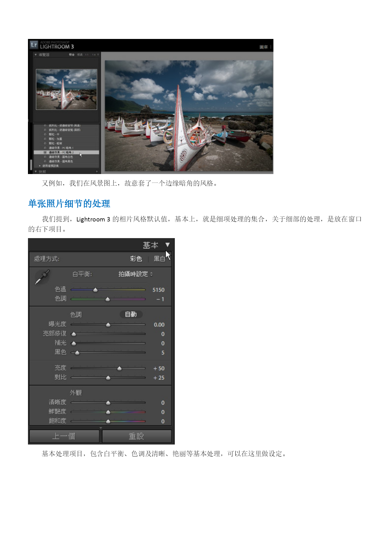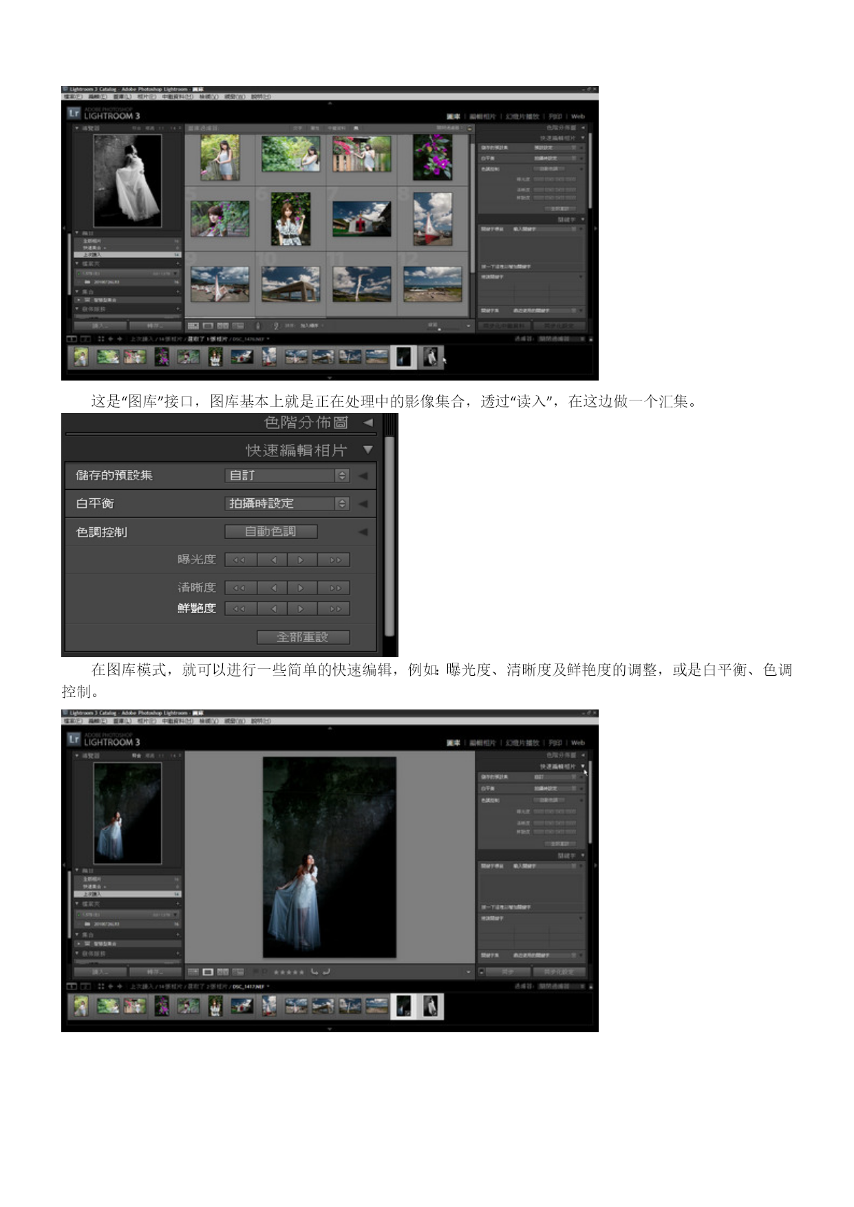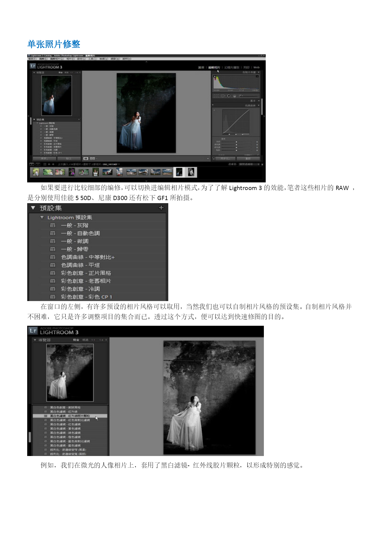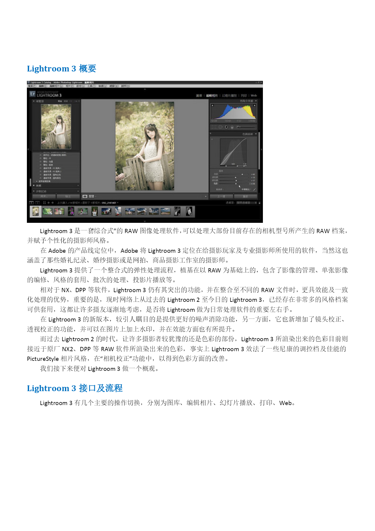 Lightroom3中文教程-数码暗房基础操作概述目录TOC\o"1-3"\h\z\uHYPERLINK\l"_Toc280161245"Lightroom3中文教程-数码暗房基础操作概述PAGEREF_Toc280161245\h1HYPERLINK\l"_Toc280161246"Lightroom3概要PAGEREF_Toc280161246\h1HYPERLINK\l"_Toc280161247"Lightroom3接口及流程PAGEREF_Toc280161247\h1HYPERLINK\l"_Toc280161248"单张照片修整PAGEREF_Toc280161248\h3HYPERLINK\l"_Toc280161249"单张照片细节的处理PAGEREF_Toc280161249\h4HYPERLINK\l"_Toc280161250"存成风格预设PAGEREF_Toc280161250\h8HYPERLINK\l"_Toc280161251"添加水印PAGEREF_Toc280161251\h9HYPERLINK\l"_Toc280161252"几个实战测试PAGEREF_Toc280161252\h10HYPERLINK\l"_Toc280161253"除噪点PAGEREF_Toc280161253\h10HYPERLINK\l"_Toc280161254"色调曲线PAGEREF_Toc280161254\h11HYPERLINK\l"_Toc280161255"编辑佳能照片文件PAGEREF_Toc280161255\h12HYPERLINK\l"_Toc280161256"相片风格的套用PAGEREF_Toc280161256\h13HYPERLINK\l"_Toc280161257"亮部的修复PAGEREF_Toc280161257\h13HYPERLINK\l"_Toc280161258"小结PAGEREF_Toc280161258\h14Lightroom3概要Lightroom3是一套“综合式”的HYPERLINK"http://www.photops.com/Article/xsjc/20100713035634.html"\t"_blank"RAW图像处理软件,可以处理大部份目前存在的相机型号所产生的RAW档案,并赋予个性化的HYPERLINK"http://www.photops.com/Article/zpps/Index.html"\t"_blank"摄影师风格。在Adobe的产品线定位中,Adobe将Lightroom3定位在给摄影玩家及专业摄影师所使用的软件,当然这也涵盖了那些婚礼纪录、婚纱摄影或是网拍、商品摄影工作室的摄影师。Lightroom3提供了一个整合式的弹性处理流程,植基在以RAW为基础上的,包含了影像的管理、单张影像的编修、风格的套用、批次的处理、投影片播放等。相对于NX、DPP等软件,Lightroom3仍有其突出的功能,并在整合至不同的RAW文件时,更具效能及一致化处理的优势,重要的是,现时网络上从过去的Lightroom2至今日的Lightroom3,已经存在非常多的风格档案可供套用,这都让许多摄友逐渐地考虑,是否将Lightroom做为日常处理软件的重要左右手。在Lightroom3的新版本,较引人瞩目的是提供更好的噪声消除功能,另一方面,它也新增加了镜头校正、透视校正的功能,并可以在图片上加上水印,并在效能方面也有所提升。而过去Lightroom2的时代,让许多摄影者较犹豫的还是色彩的部份,Lightroom3所渲染出来的色彩目前则接近于原厂NX2、DPP等RAW软件所渲染出来的色彩,事实上Lightroom3效法了一些尼康的调控档及佳能的PictureStyle相片风格,在“相机校正”功能中,以得到色彩方面的改善。我们接下来便对Lightroom3做一个概观。Lightroom3接口及流程Lightroom3有几个主要的操作切换,分别为图库、编辑相片、幻灯片播放、打印、Web。这是“图库”接口,图库基本上就是正在处理中的影像集合,透过“读入”,在这边做一个汇集。在图库模式,就可以进行一些简单的快速编辑,例如:曝光度、清晰度及鲜艳度的调整,或是白平衡、色调控制。单张照片修整如果要进行比较细部的编修,可以切换进编辑