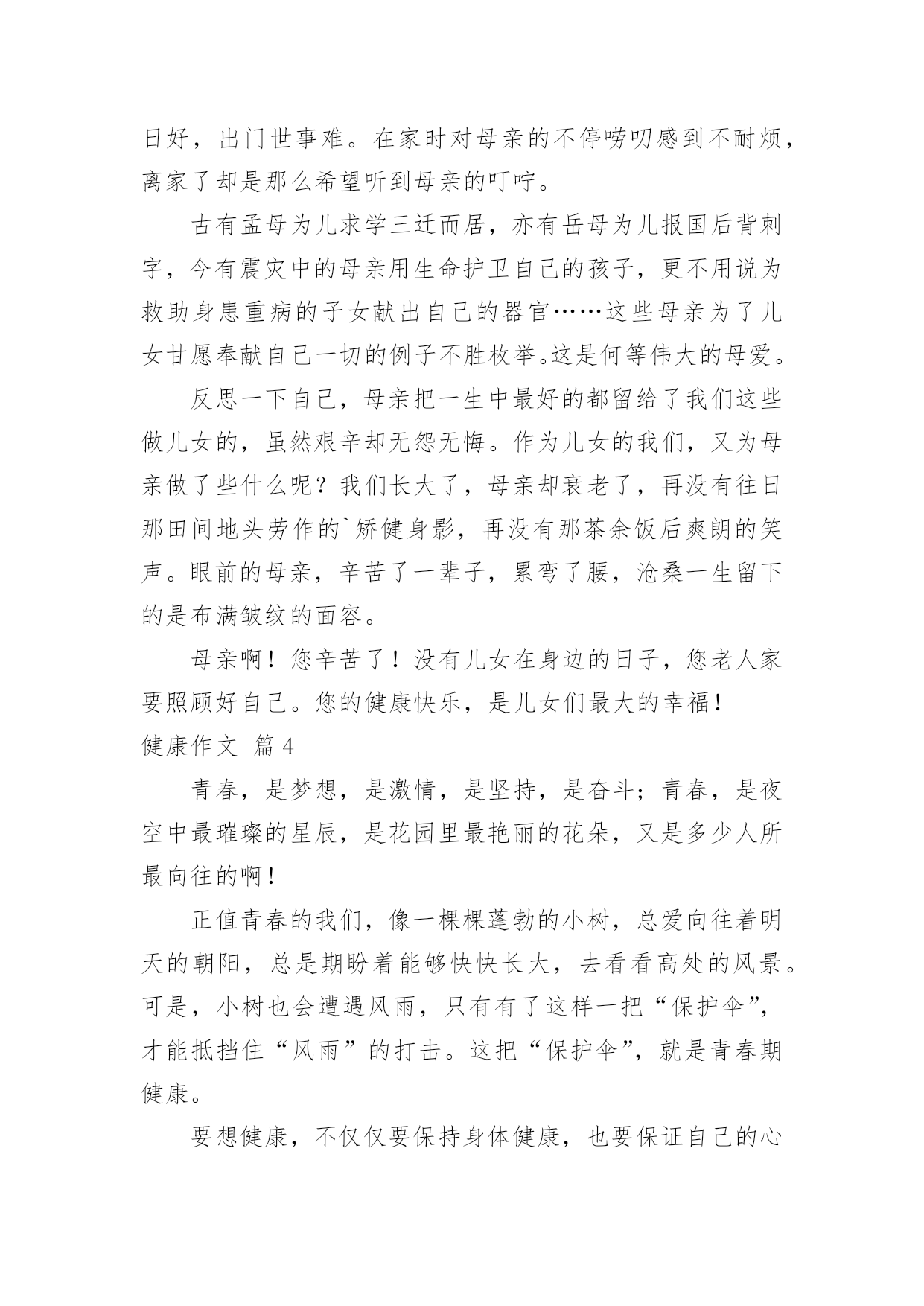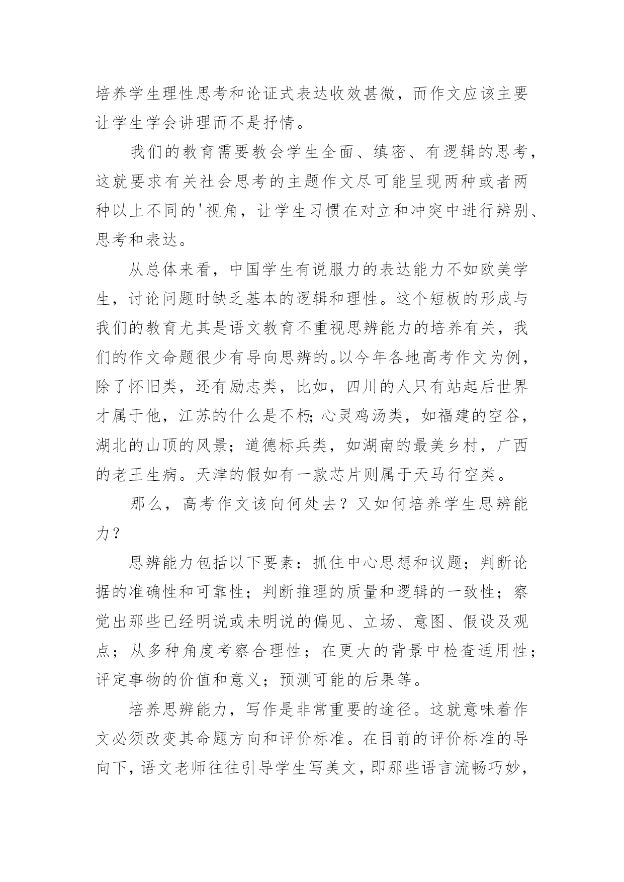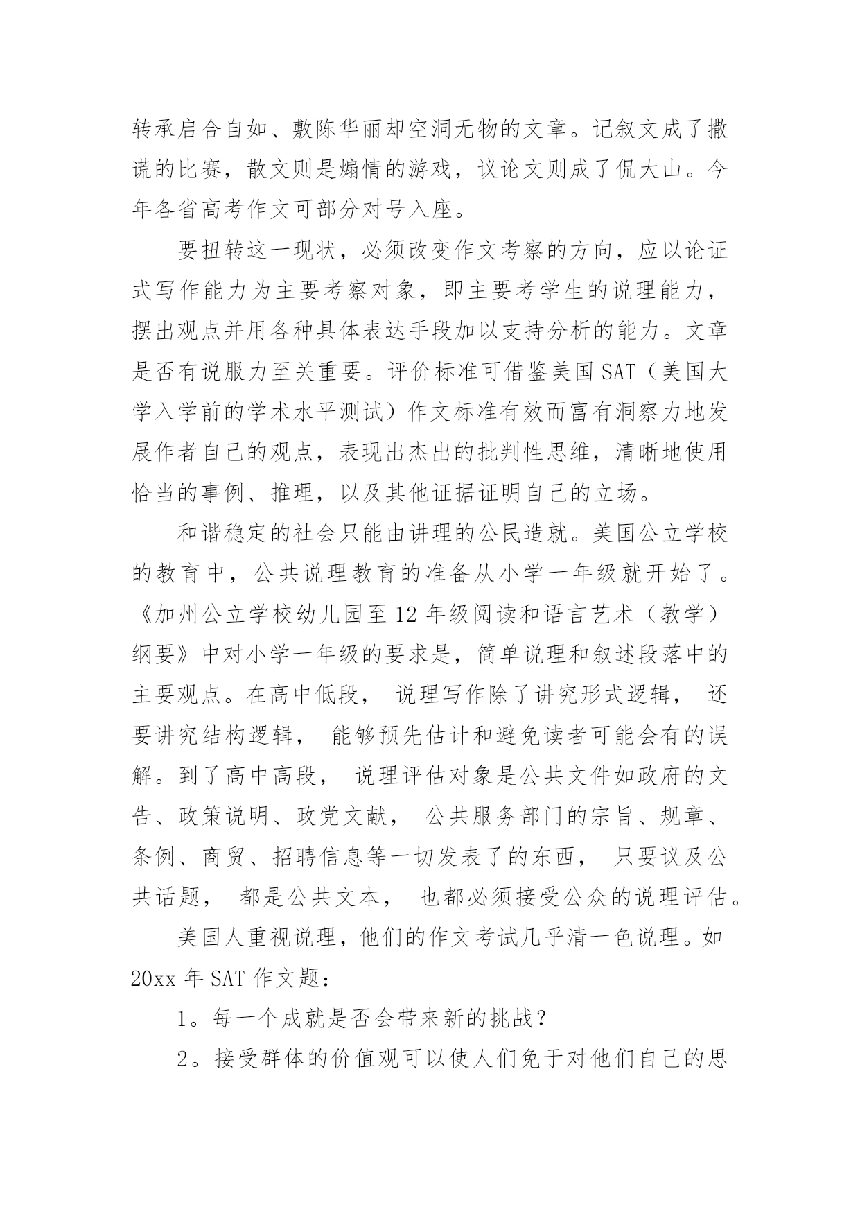 健康作文在平日的学习、工作和生活里,大家都有写作文的经历,对作文很是熟悉吧,借助作文人们可以实现文化交流的目的。如何写一篇有思想、有文采的作文呢?以下是小编为大家收集的健康作文5篇,供大家参考借鉴,希望可以帮助到有需要的朋友。健康作文篇1北京的高考作文题目是老规矩,上海的则是穿越沙漠和自由,前者涉及个人修养,关注的是私人领域;后者涉及自由的内涵和前提,关注的是公共话题。当然,关注私域或者公域并无高下之分,只要有料,都可以成为好作文题。北京卷的作文题呼唤老规矩的复兴,而缺乏对老规矩的反省和批判,给出的材料几乎全是值得保留的老规矩,例如,吃菜不许满盘子乱挑、不许管闲事儿、笑不露齿,话不高声、站有站相,坐有坐相、忠厚传世,勤俭持家等,很容易导向老规矩的丢失,很可惜这样的结论。事实上,老规矩中有很多是应该被淘汰的,命题者只是单方面地传达老规矩的正面信息,而不提及它负面的信息,这样只能唤起考生怀旧式的抒情和对现代社会的简单批判,缺少思维含量。如果我们的作文材料只给出一个维度的内容,思考社会问题浪漫化和文艺化的趋势将继续泛滥。思考社会问题文艺化是长期以来的毛病,在很大程度上,这是高考命题导向和作文评价标准所致,它除了让学生学会咏物抒情以外,对于培养学生理性思考和论证式表达收效甚微,而作文应该主要让学生学会讲理而不是抒情。我们的教育需要教会学生全面、缜密、有逻辑的思考,这就要求有关社会思考的主题作文尽可能呈现两种或者两种以上不同的'视角,让学生习惯在对立和冲突中进行辨别、思考和表达。从总体来看,中国学生有说服力的表达能力不如欧美学生,讨论问题时缺乏基本的逻辑和理性。这个短板的形成与我们的教育尤其是语文教育不重视思辨能力的培养有关,我们的作文命题很少有导向思辨的。以今年各地高考作文为例,除了怀旧类,还有励志类,比如,四川的人只有站起后世界才属于他,江苏的什么是不朽;心灵鸡汤类,如福建的空谷,湖北的山顶的风景;道德标兵类,如湖南的最美乡村,广西的老王生病。天津的假如有一款芯片则属于天马行空类。那么,高考作文该向何处去?又如何培养学生思辨能力?思辨能力包括以下要素:抓住中心思想和议题;判断论据的准确性和可靠性;判断推理的质量和逻辑的一致性;察觉出那些已经明说或未明说的偏见、立场、意图、假设及观点;从多种角度考察合理性;在更大的背景中检查适用性;评定事物的价值和意义;预测可能的后果等。培养思辨能力,写作是非常重要的途径。这就意味着作文必须改变其命题方向和评价标准。在目前的评价标准的导向下,语文老师往往引导学生写美文,即那些语言流畅巧妙,转承启合自如、敷陈华丽却空洞无物的文章。记叙文成了撒谎的比赛,散文则是煽情的游戏,议论文则成了侃大山。今年各省高考作文可部分对号入座。要扭转这一现状,必须改变作文考察的方向,应以论证式写作能力为主要考察对象,即主要考学生的说理能力,摆出观点并用各种具体表达手段加以支持分析的能力。文章是否有说服力至关重要。评价标准可借鉴美国SAT(美国大学入学前的学术水平测试)作文标准有效而富有洞察力地发展作者自己的观点,表现出杰出的批判性思维,清晰地使用恰当的事例、推理,以及其他证据证明自己的立场。和谐稳定的社会只能由讲理的公民造就。美国公立学校的教育中,公共说理教育的准备从小学一年级就开始了。《加州公立学校幼儿园至12年级阅读和语言艺术(教学)纲要》中对小学一年级的要求是,简单说理和叙述段落中的主要观点。在高中低段,说理写作除了讲究形式逻辑,还要讲究结构逻辑,能够预先估计和避免读者可能会有的误解。到了高中高段,说理评估对象是公共文件如政府的文告、政策说明、政党文献,公共服务部门的宗旨、规章、条例、商贸、招聘信息等一切发表了的东西,只要议及公共话题,都是公共文本,也都必须接受公众的说理评估。美国人重视说理,他们的作文考试几乎清一色说理。如20xx年SAT作文题:1。每一个成就是否会带来新的挑战?2。接受群体的价值观可以使人们免于对他们自己的思想和行为负责吗?3。鼓励不一致和不同意见的群体是否比不鼓励那样做的群体运行得更好?20xx的AP英语考试即大学先修课的语文考试,则要求在阅读托马斯潘恩的著作《人的权利》中的一段文字后写一篇文章,谈谈当今的美国是否达到了潘恩心中的美国标准,并用适当的证据来支持论点。我以为,高考作文改革不单单涉及到培养学生怎么进行健康表达的问题,更涉及到未来社会的走向问题。从根本上来说,作文的评价标准体现了一个民族的精神气质和价值追求,告别羸弱而暴戾、敏感而虚伪的气质,应该从培养健康、理性的表达开始。=健康作文篇2现在生活条件好了,很多人却把健康抛到了九霄云外。殊不知,生命是珍宝,健康是本钱。就在上一个星期,我的外公突然在回家的路上晕倒了。听到这个令人紧张的消息,妈妈和舅舅心急如焚地来到医院。医生说外公是因为过