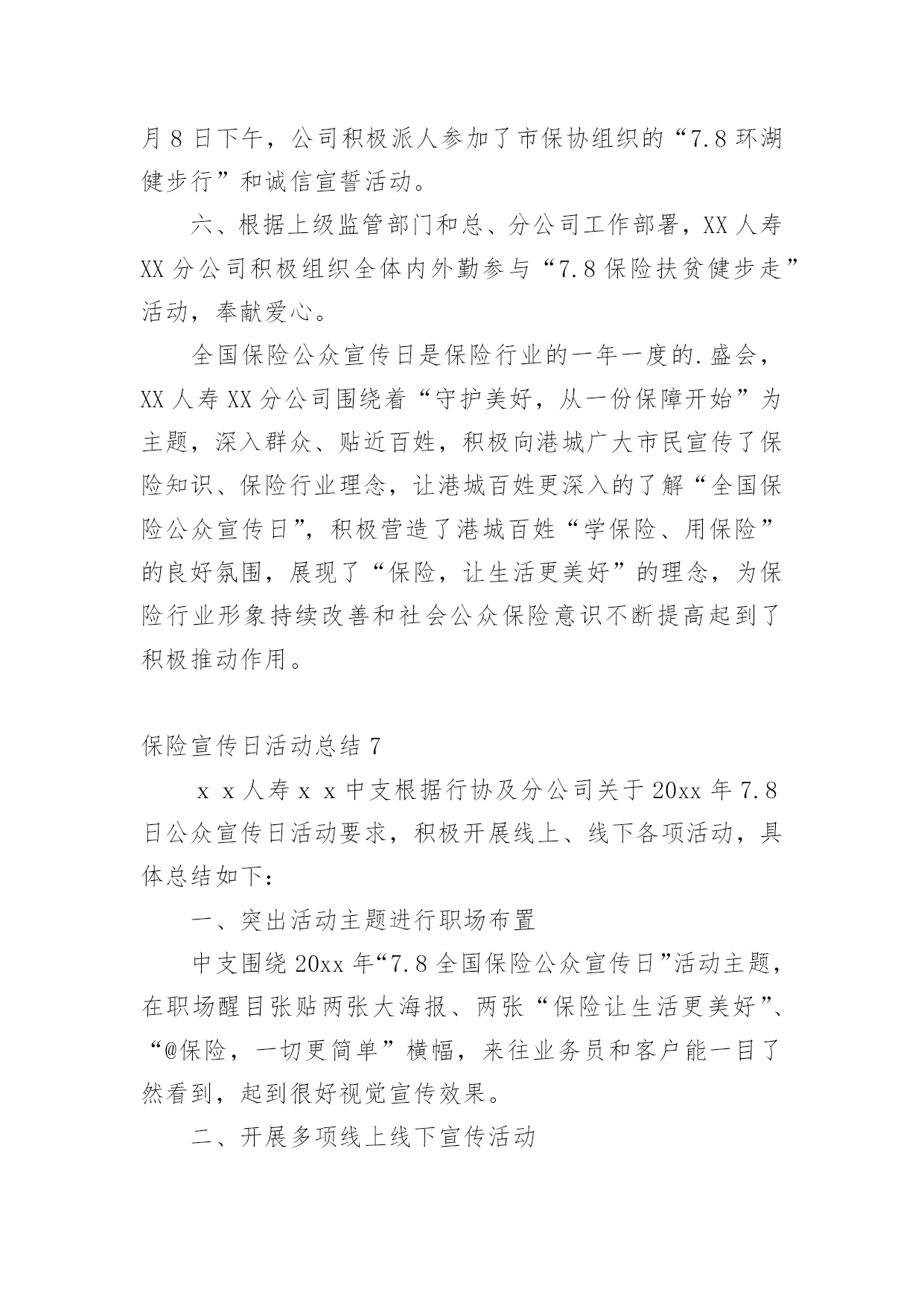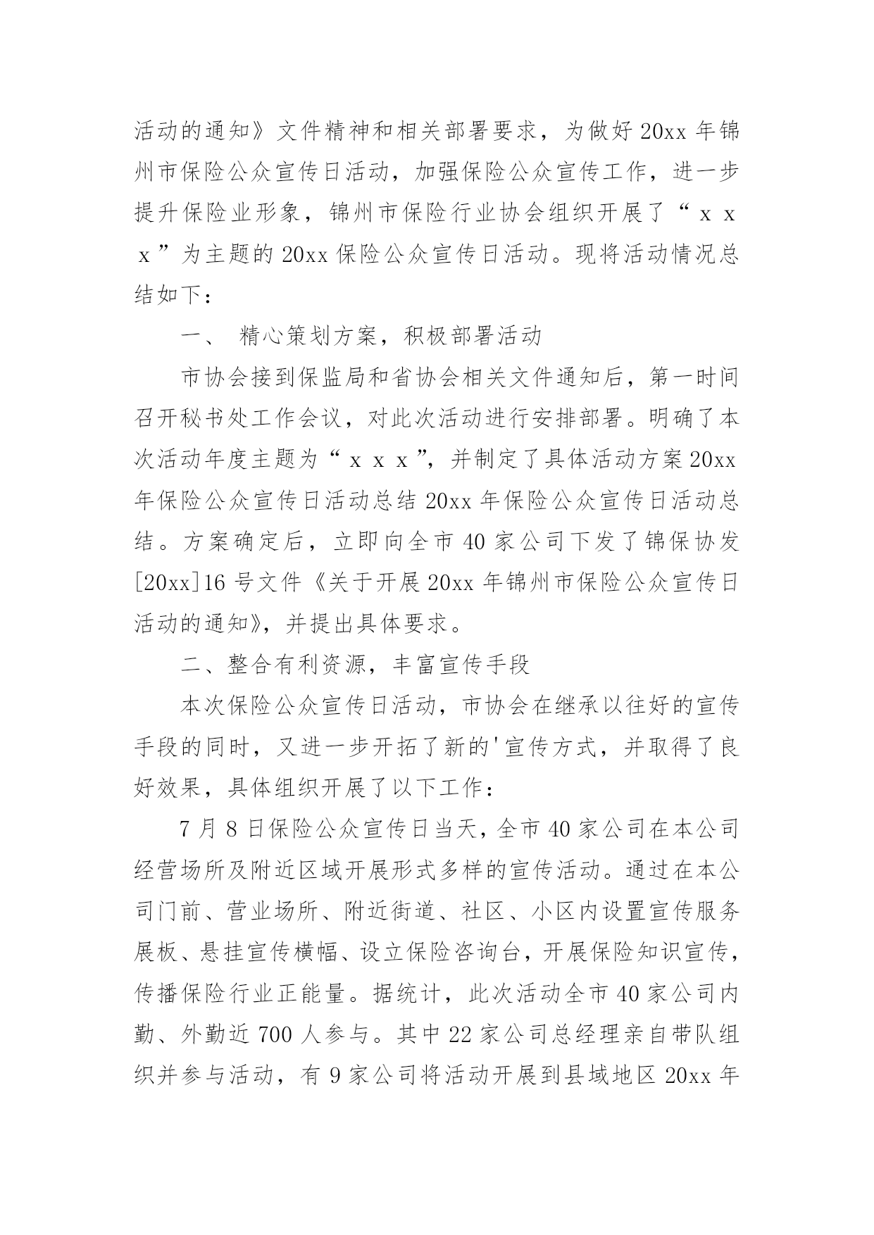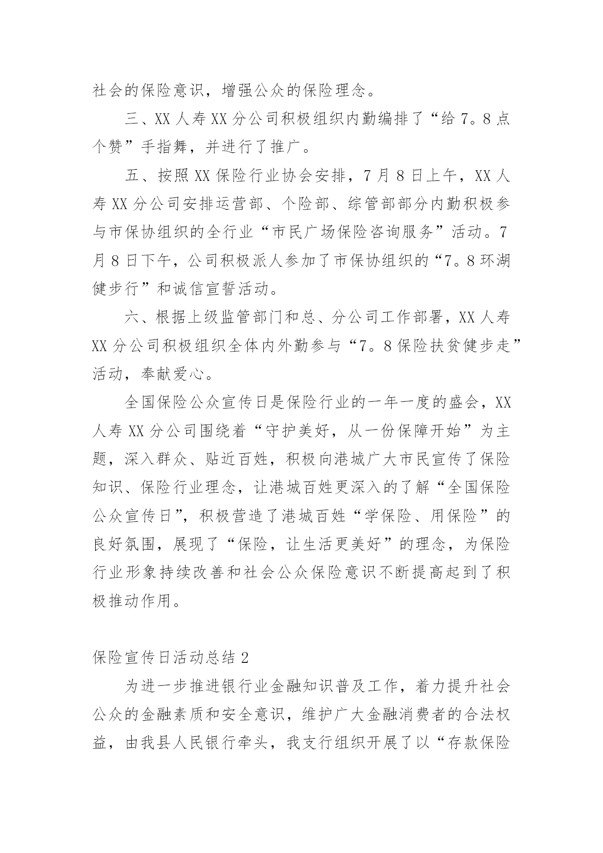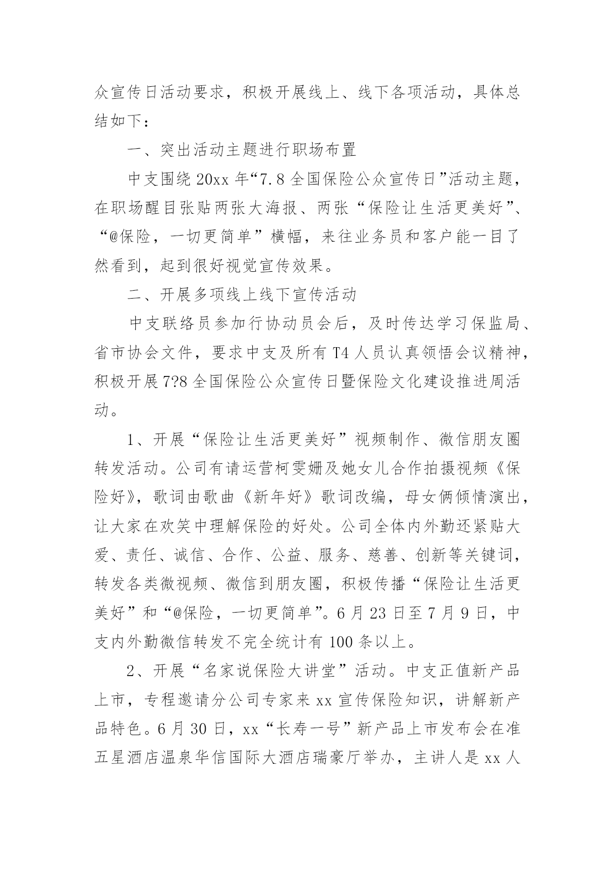 保险宣传日活动总结保险宣传日活动总结【锦集15篇】总结是把一定阶段内的有关情况分析研究,做出有指导性结论的书面材料,它可以促使我们思考,不妨让我们认真地完成总结吧。那么总结要注意有什么内容呢?以下是小编精心整理的保险宣传日活动总结,仅供参考,大家一起来看看吧。保险宣传日活动总结1为进一步强化保险业的公众宣传意识,推动行业形象持续改善和社会公众保险意识不断提高,XX人寿XX分公司高度重视,精心筹备,围绕着“守护美好,从一份保障开始”为主题积极开展了一系列宣传活动。一、公司积极利用电子屏滚动播放“守护美好,从一份保障开始”、“保险让生活更美好”等宣传标语,全辖各机构都在职场内悬挂了“守护美好,从一份保障开始”宣传条幅、张贴了“守护美好,从一份保障开始”宣传海报,营造了浓厚的全国保险宣传日氛围,拉开了20xx年“7。8全国保险公众宣传日”活动的序幕。二、公司辖内各四级机构积极邀请新老客户走进公司,并开展了现场咨询、保险知识小贴士推送、保险理赔知识讲座等各种形式宣传活动,不断向公众传递“守信用、担风险、重服务、合规范”的`保险行业核心价值理念,旨在提高全社会的保险意识,增强公众的保险理念。三、XX人寿XX分公司积极组织内勤编排了“给7。8点个赞”手指舞,并进行了推广。五、按照XX保险行业协会安排,7月8日上午,XX人寿XX分公司安排运营部、个险部、综管部部分内勤积极参与市保协组织的全行业“市民广场保险咨询服务”活动。7月8日下午,公司积极派人参加了市保协组织的“7。8环湖健步行”和诚信宣誓活动。六、根据上级监管部门和总、分公司工作部署,XX人寿XX分公司积极组织全体内外勤参与“7。8保险扶贫健步走”活动,奉献爱心。全国保险公众宣传日是保险行业的一年一度的盛会,XX人寿XX分公司围绕着“守护美好,从一份保障开始”为主题,深入群众、贴近百姓,积极向港城广大市民宣传了保险知识、保险行业理念,让港城百姓更深入的了解“全国保险公众宣传日”,积极营造了港城百姓“学保险、用保险”的良好氛围,展现了“保险,让生活更美好”的理念,为保险行业形象持续改善和社会公众保险意识不断提高起到了积极推动作用。保险宣传日活动总结2为进一步推进银行业金融知识普及工作,着力提升社会公众的金融素质和安全意识,维护广大金融消费者的合法权益,由我县人民银行牵头,我支行组织开展了以“存款保险保护您珍贵的存款”为主题的宣传活动。一、成立活动小组,确保活动的顺利开展支行高度重视此次宣传活动,为确保此次活动的有序进行,成立了专门的宣传活动小组,负责宣传活动方案的制定和实施,并组织协调各部室,支持此次活动的`顺利开展。二、充分准备活动宣传,确保宣传落到实处我支行以网点为宣传阵地,通过营业网点LED屏播放相关宣传标语,营业厅电视播放存款保险宣传片,在营业网点设置宣传点摆放宣传单。20xx年5月支行利用夕会时间组织学习强调本次宣传的重要性,并于5月8日派出了工作人员在公园等多处进行现场宣讲和资料派发,并在营业厅门口及附近商铺集中宣传,宣传主要是以发放存款保险宣传折页,现场宣解存款保险制度规定为主,让人民群众更多的了解存款保险金融知识.三、宣传经验及总结针对此次宣传活动,我网点及时总结宣传经验,对宣传规模和效果进行评价,根据已经宣传的情况,对宣传材料数量进行预估,以便为下一个宣传主题选择更合适的宣传地点,采用更有效地宣传方式和手段。我行在日常经营活动中坚持消费者教育服务活动,维护广大消费者合法权益,确保广大客户的财产安全。保险宣传日活动总结3xx人寿xx中支根据行协及分公司关于20xx年7.8日公众宣传日活动要求,积极开展线上、线下各项活动,具体总结如下:一、突出活动主题进行职场布置中支围绕20xx年“7.8全国保险公众宣传日”活动主题,在职场醒目张贴两张大海报、两张“保险让生活更美好”、“@保险,一切更简单”横幅,来往业务员和客户能一目了然看到,起到很好视觉宣传效果。二、开展多项线上线下宣传活动中支联络员参加行协动员会后,及时传达学习保监局、省市协会文件,要求中支及所有T4人员认真领悟会议精神,积极开展7?8全国保险公众宣传日暨保险文化建设推进周活动。1、开展“保险让生活更美好”视频制作、微信朋友圈转发活动。公司有请运营柯雯姗及她女儿合作拍摄视频《保险好》,歌词由歌曲《新年好》歌词改编,母女俩倾情演出,让大家在欢笑中理解保险的好处。公司全体内外勤还紧贴大爱、责任、诚信、合作、公益、服务、慈善、创新等关键词,转发各类微视频、微信到朋友圈,积极传播“保险让生活更美好”和“@保险,一切更简单”。6月23日至7月9日,中支内外勤微信转发不完全统计有100条以上。2、开展“名家说保险大讲堂”活动。中支正值新产品上市,专程邀请分公司专家来xx宣传保险知识,讲解新产品特色。6月30日,xx“长寿一号
