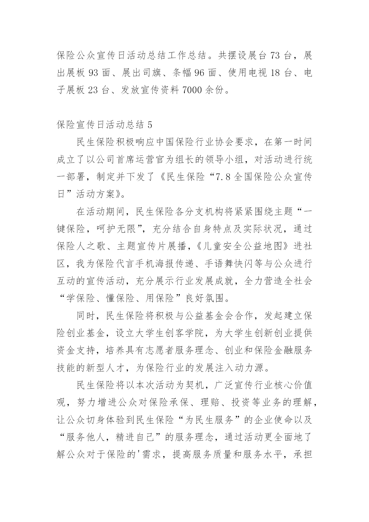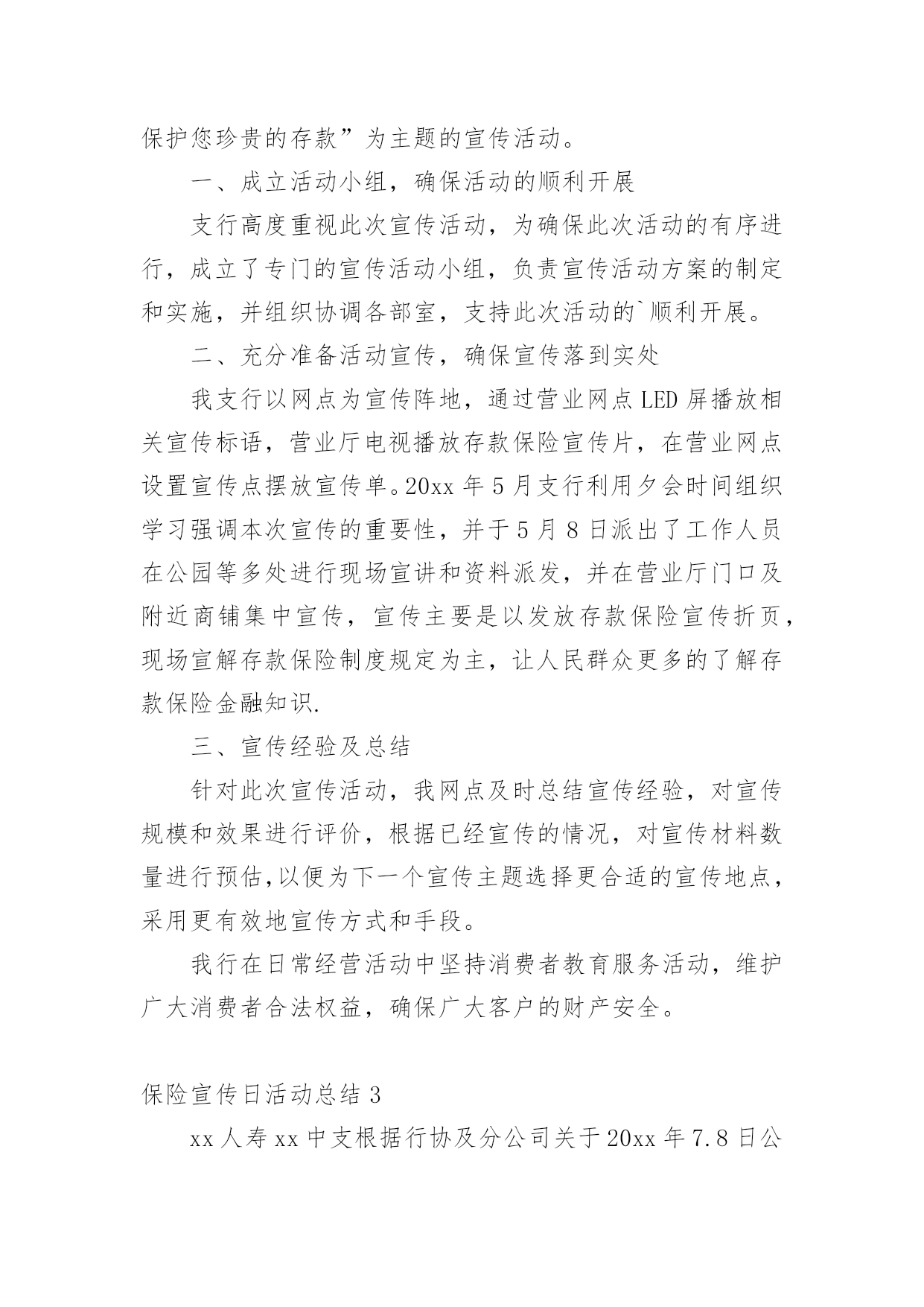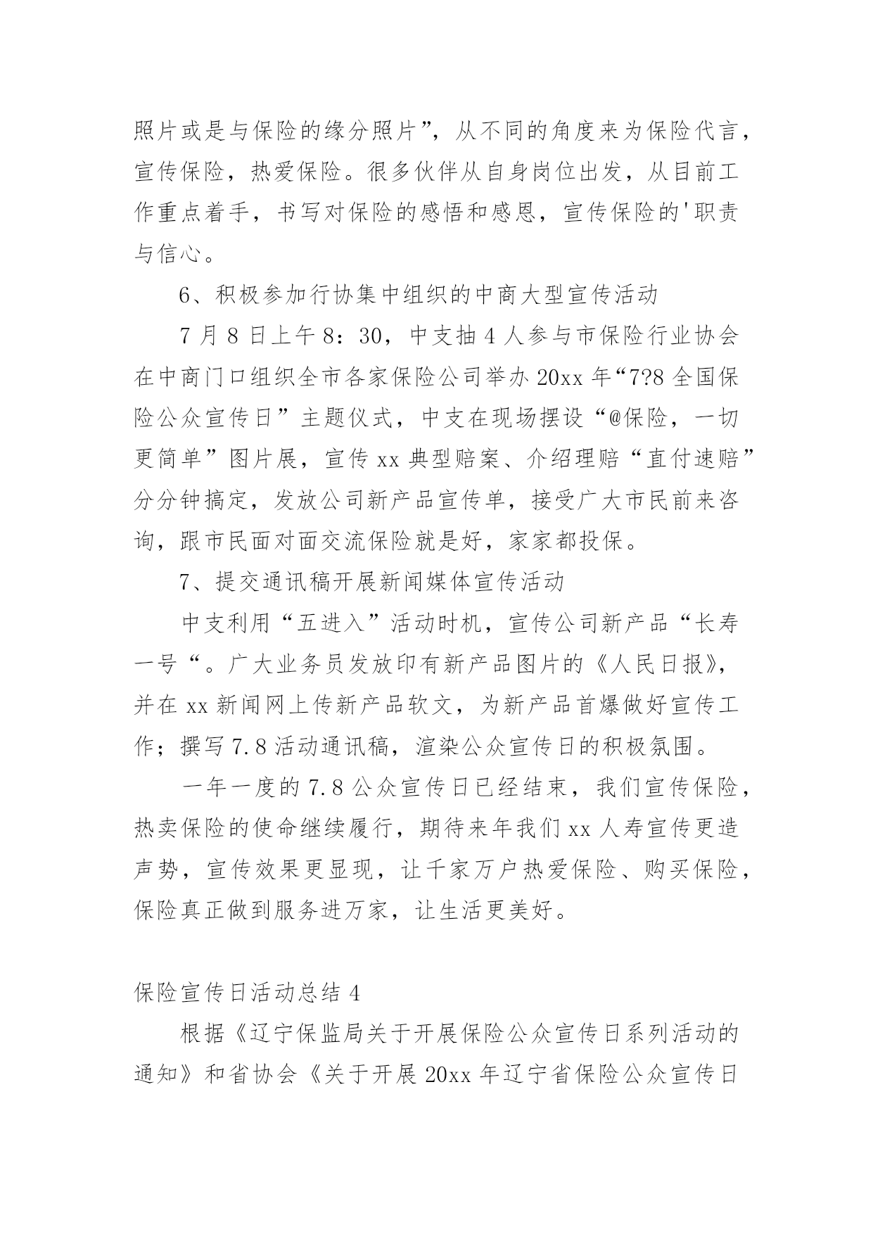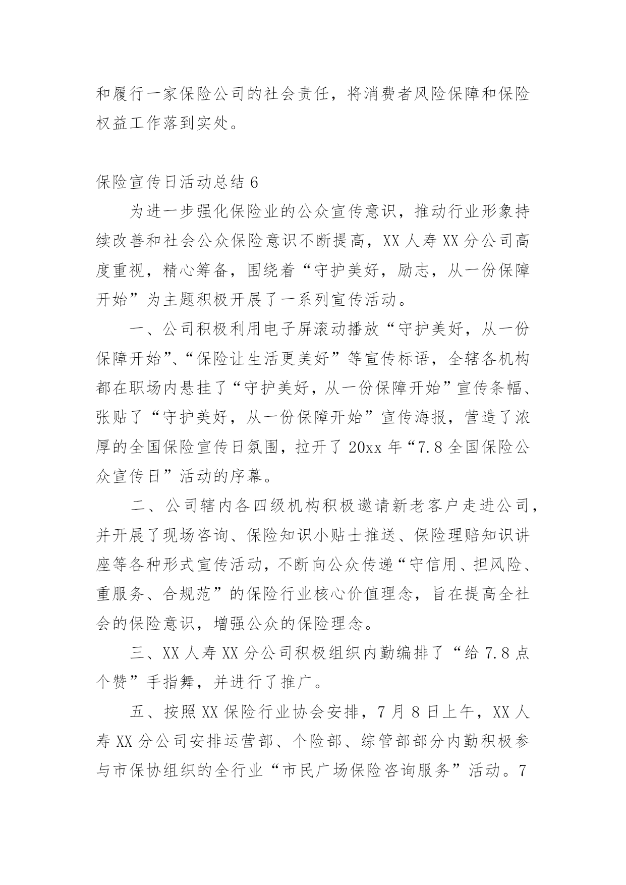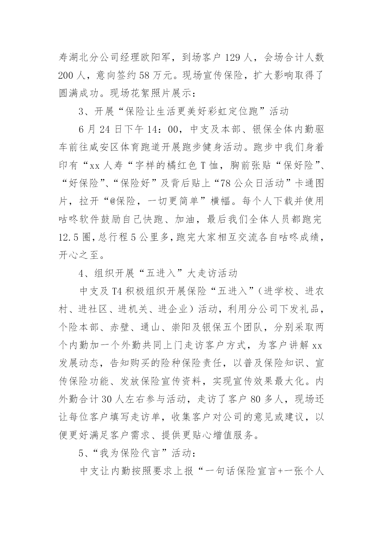 保险宣传日活动总结保险宣传日活动总结【锦集15篇】总结是把一定阶段内的有关情况分析研究,做出有指导性结论的书面材料,它可以促使我们思考,不妨让我们认真地完成总结吧。那么总结要注意有什么内容呢?以下是小编精心整理的保险宣传日活动总结,仅供参考,大家一起来看看吧。保险宣传日活动总结1为进一步强化保险业的公众宣传意识,推动行业形象持续改善和社会公众保险意识不断提高,XX人寿XX分公司高度重视,精心筹备,围绕着“守护美好,从一份保障开始”为主题积极开展了一系列宣传活动。一、公司积极利用电子屏滚动播放“守护美好,从一份保障开始”、“保险让生活更美好”等宣传标语,全辖各机构都在职场内悬挂了“守护美好,从一份保障开始”宣传条幅、张贴了“守护美好,从一份保障开始”宣传海报,营造了浓厚的全国保险宣传日氛围,拉开了20xx年“7。8全国保险公众宣传日”活动的序幕。二、公司辖内各四级机构积极邀请新老客户走进公司,并开展了现场咨询、保险知识小贴士推送、保险理赔知识讲座等各种形式宣传活动,不断向公众传递“守信用、担风险、重服务、合规范”的`保险行业核心价值理念,旨在提高全社会的保险意识,增强公众的保险理念。三、XX人寿XX分公司积极组织内勤编排了“给7。8点个赞”手指舞,并进行了推广。五、按照XX保险行业协会安排,7月8日上午,XX人寿XX分公司安排运营部、个险部、综管部部分内勤积极参与市保协组织的全行业“市民广场保险咨询服务”活动。7月8日下午,公司积极派人参加了市保协组织的“7。8环湖健步行”和诚信宣誓活动。六、根据上级监管部门和总、分公司工作部署,XX人寿XX分公司积极组织全体内外勤参与“7。8保险扶贫健步走”活动,奉献爱心。全国保险公众宣传日是保险行业的一年一度的盛会,XX人寿XX分公司围绕着“守护美好,从一份保障开始”为主题,深入群众、贴近百姓,积极向港城广大市民宣传了保险知识、保险行业理念,让港城百姓更深入的了解“全国保险公众宣传日”,积极营造了港城百姓“学保险、用保险”的良好氛围,展现了“保险,让生活更美好”的理念,为保险行业形象持续改善和社会公众保险意识不断提高起到了积极推动作用。保险宣传日活动总结2为进一步推进银行业金融知识普及工作,着力提升社会公众的金融素质和安全意识,维护广大金融消费者的合法权益,由我县人民银行牵头,我支行组织开展了以“存款保险保护您珍贵的存款”为主题的宣传活动。一、成立活动小组,确保活动的顺利开展支行高度重视此次宣传活动,为确保此次活动的有序进行,成立了专门的宣传活动小组,负责宣传活动方案的制定和实施,并组织协调各部室,支持此次活动的`顺利开展。二、充分准备活动宣传,确保宣传落到实处我支行以网点为宣传阵地,通过营业网点LED屏播放相关宣传标语,营业厅电视播放存款保险宣传片,在营业网点设置宣传点摆放宣传单。20xx年5月支行利用夕会时间组织学习强调本次宣传的重要性,并于5月8日派出了工作人员在公园等多处进行现场宣讲和资料派发,并在营业厅门口及附近商铺集中宣传,宣传主要是以发放存款保险宣传折页,现场宣解存款保险制度规定为主,让人民群众更多的了解存款保险金融知识.三、宣传经验及总结针对此次宣传活动,我网点及时总结宣传经验,对宣传规模和效果进行评价,根据已经宣传的情况,对宣传材料数量进行预估,以便为下一个宣传主题选择更合适的宣传地点,采用更有效地宣传方式和手段。我行在日常经营活动中坚持消费者教育服务活动,维护广大消费者合法权益,确保广大客户的财产安全。保险宣传日活动总结3xx人寿xx中支根据行协及分公司关于20xx年7.8日公众宣传日活动要求,积极开展线上、线下各项活动,具体总结如下:一、突出活动主题进行职场布置中支围绕20xx年“7.8全国保险公众宣传日”活动主题,在职场醒目张贴两张大海报、两张“保险让生活更美好”、“@保险,一切更简单”横幅,来往业务员和客户能一目了然看到,起到很好视觉宣传效果。二、开展多项线上线下宣传活动中支联络员参加行协动员会后,及时传达学习保监局、省市协会文件,要求中支及所有T4人员认真领悟会议精神,积极开展7?8全国保险公众宣传日暨保险文化建设推进周活动。1、开展“保险让生活更美好”视频制作、微信朋友圈转发活动。公司有请运营柯雯姗及她女儿合作拍摄视频《保险好》,歌词由歌曲《新年好》歌词改编,母女俩倾情演出,让大家在欢笑中理解保险的好处。公司全体内外勤还紧贴大爱、责任、诚信、合作、公益、服务、慈善、创新等关键词,转发各类微视频、微信到朋友圈,积极传播“保险让生活更美好”和“@保险,一切更简单”。6月23日至7月9日,中支内外勤微信转发不完全统计有100条以上。2、开展“名家说保险大讲堂”活动。中支正值新产品上市,专程邀请分公司专家来xx宣传保险知识,讲解新产品特色。6月30日,xx“长寿一号