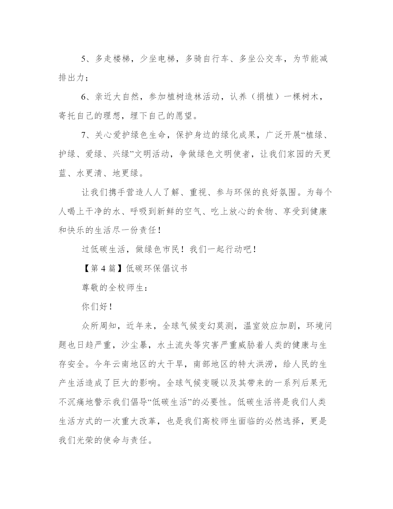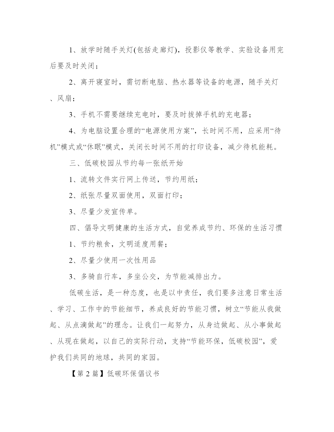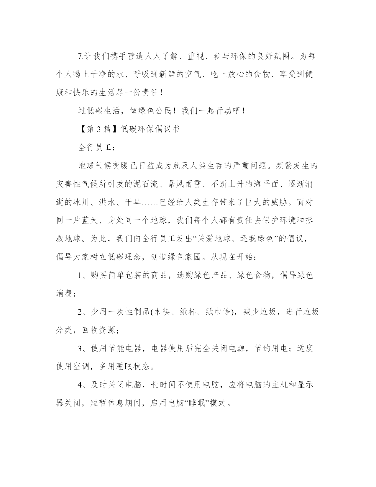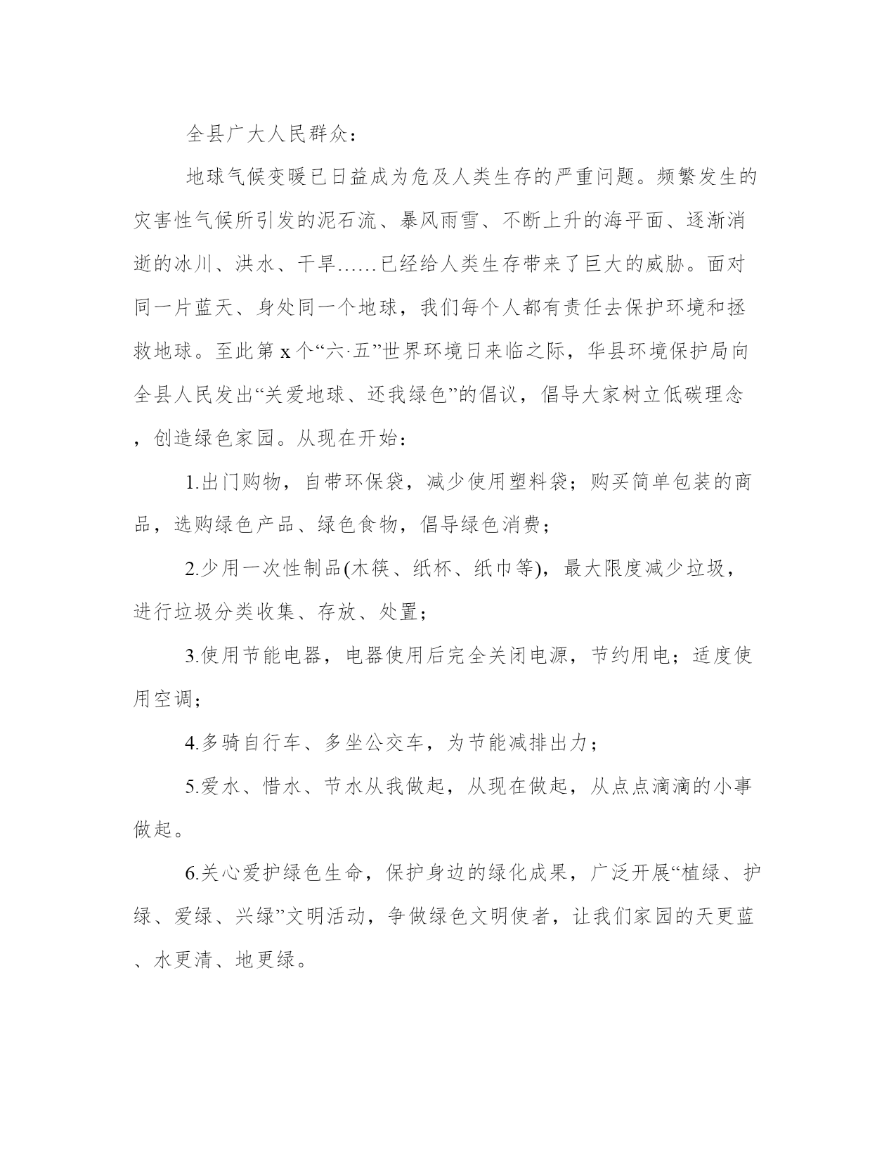 低碳环保倡议书大全【第1篇】低碳环保倡议书敬爱的老师,亲爱的同学们:当你们在舒适整洁的校园工作和学习时,当你们享受着科技现代化给你们带来的种种便利时,你们是否越来越真切的感受到,气候的变幻无常、环境的恶化、资源能源的枯竭、污染的日益严重已经开始威胁我们的生活?节能要从大处着眼,从小处着手。为进一步增强我校全体师生的能源忧患意识和环保意识,创建低碳校园,营造良好的节约型校园氛围。集美大学学生环保协会呼吁更多的老师、同学参与到节能减排的队伍中来,为了我们赖以生存的地球,更是为了明天的美好生活,让我们一起从节约“一滴水,一度电,一张纸”做起,共同做到:一、低碳校园从节约每一滴水开始1、在学习和教学过程中要注重行为节水,杜绝水龙头长流水和实验结束后用水设备仍然运行灯浪费现象,养成良好的节水习惯;2、拖把坚持快速搓洗,洗手、洗涤美术用具不要直接用长流水冲,这样每月每人能节约用水1.2吨左右;3、校园内尽量少喝瓶装饮料,喝学校供应的饮用水。二、低碳校园从节约每一度电开始1、放学时随手关灯(包括走廊灯),投影仪等教学、实验设备用完后要及时关闭;2、离开寝室时,需切断电脑、热水器等设备的电源,随手关灯、风扇;3、手机不需要继续充电时,要及时拔掉手机的充电器;4、为电脑设置合理的“电源使用方案”,长时间不用,应采用“待机”模式或“休眠”模式,关闭长时间不用的打印设备,减少待机能耗。三、低碳校园从节约每一张纸开始1、流转文件实行网上传送,节约用纸;2、纸张尽量双面使用,双面打印;3、尽量少发宣传单。四、倡导文明健康的生活方式,自觉养成节约、环保的生活习惯1、节约粮食,文明适度用餐;2、尽量少使用一次性用品3、多骑自行车,多坐公交,为节能减排出力。低碳生活,是一种态度,也是以中责任,我们要多注意日常生活、学习、工作中的节能细节,养成良好的节能习惯,树立“节能从我做起、从点滴做起”的理念。让我们一起努力,从身边做起、从小事做起、从现在做起,以自己的实际行动,支持“节能环保,低碳校园”,爱护我们共同的地球,共同的家园。【第2篇】低碳环保倡议书全县广大人民群众:地球气候变暖已日益成为危及人类生存的严重问题。频繁发生的灾害性气候所引发的泥石流、暴风雨雪、不断上升的海平面、逐渐消逝的冰川、洪水、干旱……已经给人类生存带来了巨大的威胁。面对同一片蓝天、身处同一个地球,我们每个人都有责任去保护环境和拯救地球。至此第x个“六·五”世界环境日来临之际,华县环境保护局向全县人民发出“关爱地球、还我绿色”的倡议,倡导大家树立低碳理念,创造绿色家园。从现在开始:1.出门购物,自带环保袋,减少使用塑料袋;购买简单包装的商品,选购绿色产品、绿色食物,倡导绿色消费;2.少用一次性制品(木筷、纸杯、纸巾等),最大限度减少垃圾,进行垃圾分类收集、存放、处置;3.使用节能电器,电器使用后完全关闭电源,节约用电;适度使用空调;4.多骑自行车、多坐公交车,为节能减排出力;5.爱水、惜水、节水从我做起,从现在做起,从点点滴滴的小事做起。6.关心爱护绿色生命,保护身边的绿化成果,广泛开展“植绿、护绿、爱绿、兴绿”文明活动,争做绿色文明使者,让我们家园的天更蓝、水更清、地更绿。7.让我们携手营造人人了解、重视、参与环保的良好氛围。为每个人喝上干净的水、呼吸到新鲜的空气、吃上放心的食物、享受到健康和快乐的生活尽一份责任!过低碳生活,做绿色公民!我们一起行动吧!【第3篇】低碳环保倡议书全行员工:地球气候变暖已日益成为危及人类生存的严重问题。频繁发生的灾害性气候所引发的泥石流、暴风雨雪、不断上升的海平面、逐渐消逝的冰川、洪水、干旱……已经给人类生存带来了巨大的威胁。面对同一片蓝天、身处同一个地球,我们每个人都有责任去保护环境和拯救地球。为此,我们向全行员工发出“关爱地球、还我绿色”的倡议,倡导大家树立低碳理念,创造绿色家园。从现在开始:1、购买简单包装的商品,选购绿色产品、绿色食物,倡导绿色消费;2、少用一次性制品(木筷、纸杯、纸巾等),减少垃圾,进行垃圾分类,回收资源;3、使用节能电器,电器使用后完全关闭电源,节约用电;适度使用空调,多用睡眠状态。4、及时关闭电脑,长时间不使用电脑,应将电脑的主机和显示器关闭,短暂休息期间,启用电脑“睡眠”模式。5、多走楼梯,少坐电梯,多骑自行车、多坐公交车,为节能减排出力;6、亲近大自然,参加植树造林活动,认养(捐植)一棵树木,寄托自己的理想,埋下自己的愿望。7、关心爱护绿色生命,保护身边的绿化成果,广泛开展“植绿、护绿、爱绿、兴绿”文明活动,争做绿色文明使者,让我们家园的天更蓝、水更清、地更绿。让我们携手营造人人了解、重视、参与环保的良好氛围。为每个人喝上干净的水、呼吸到