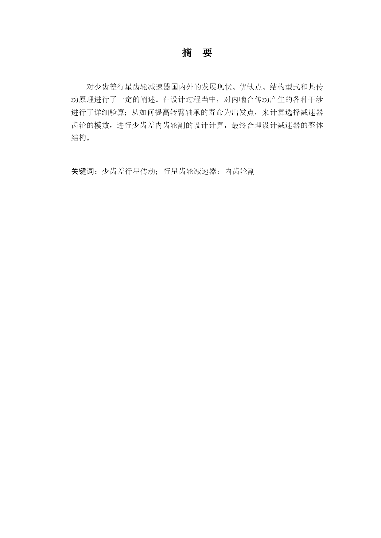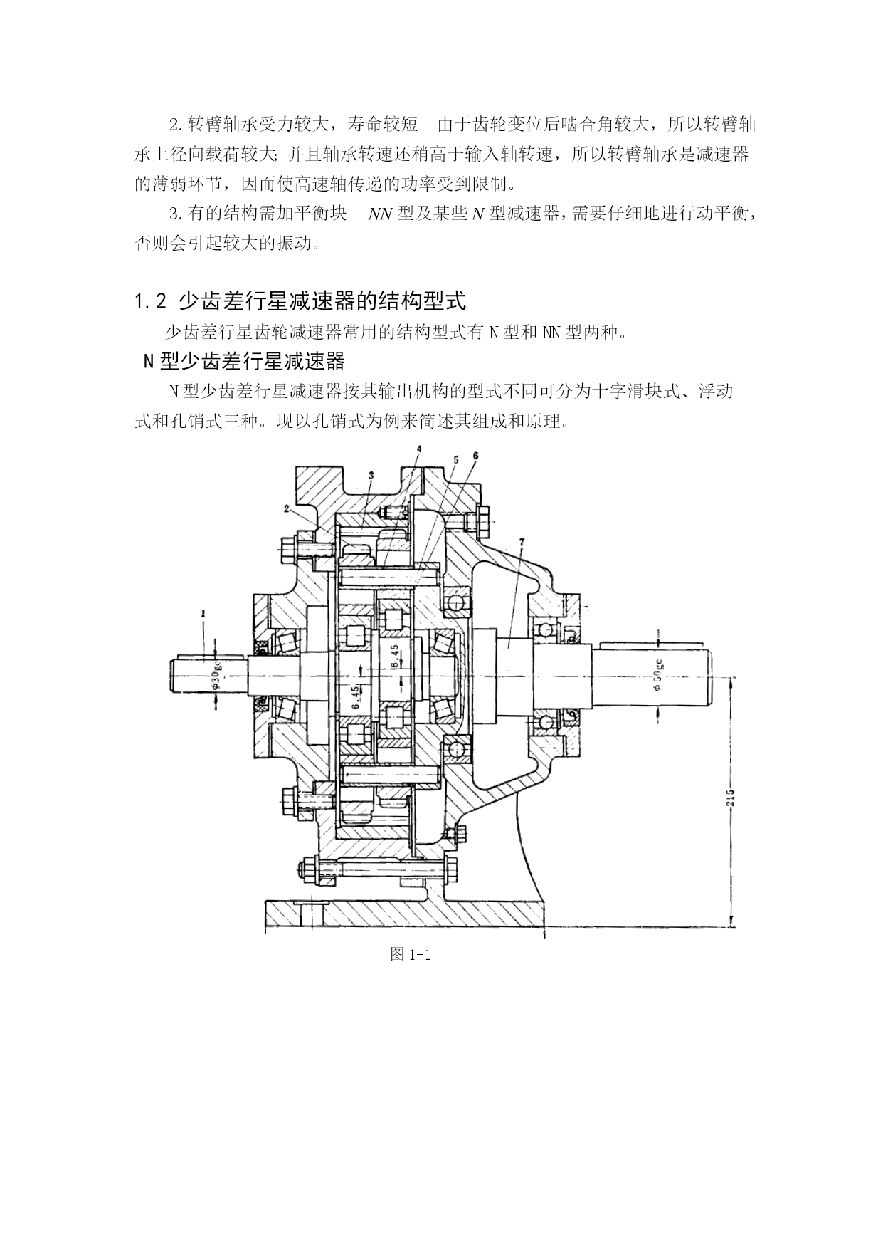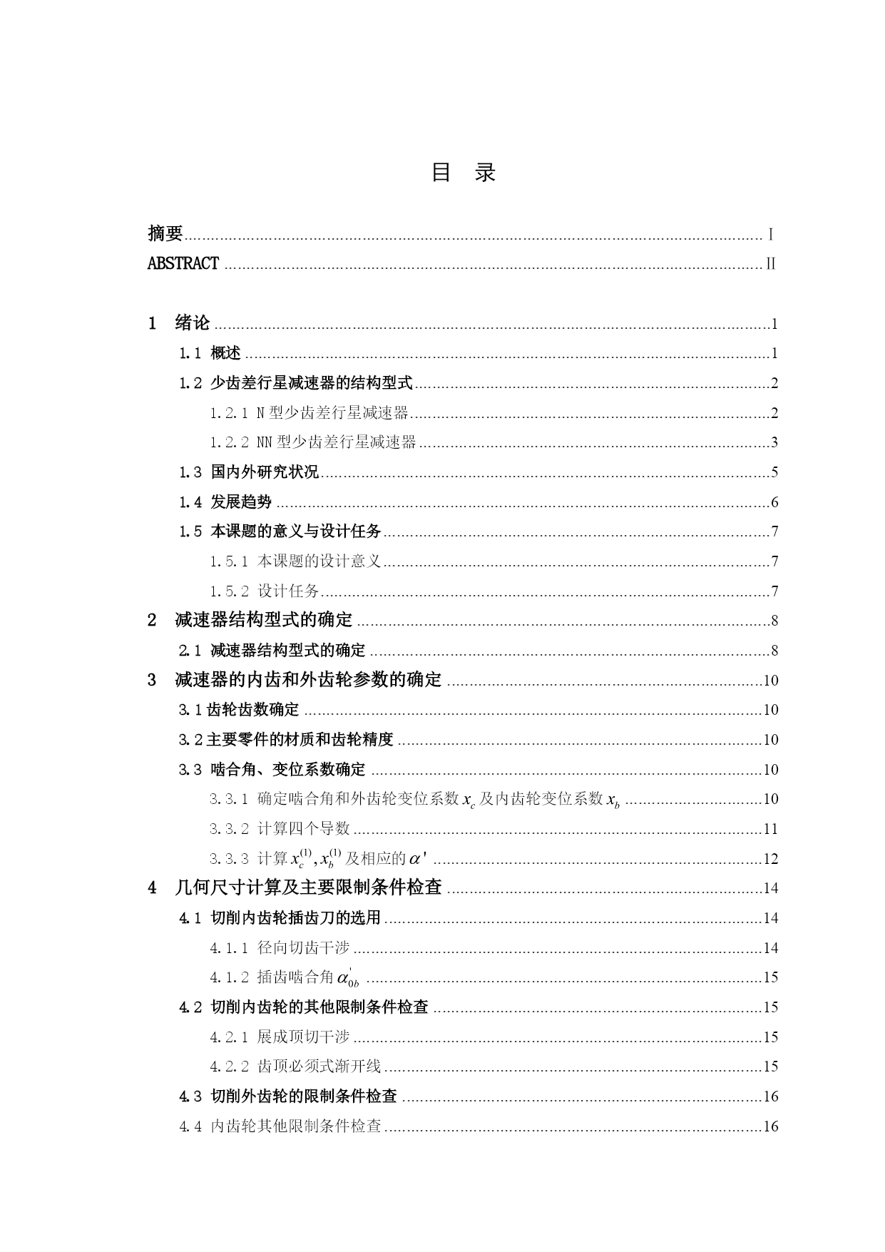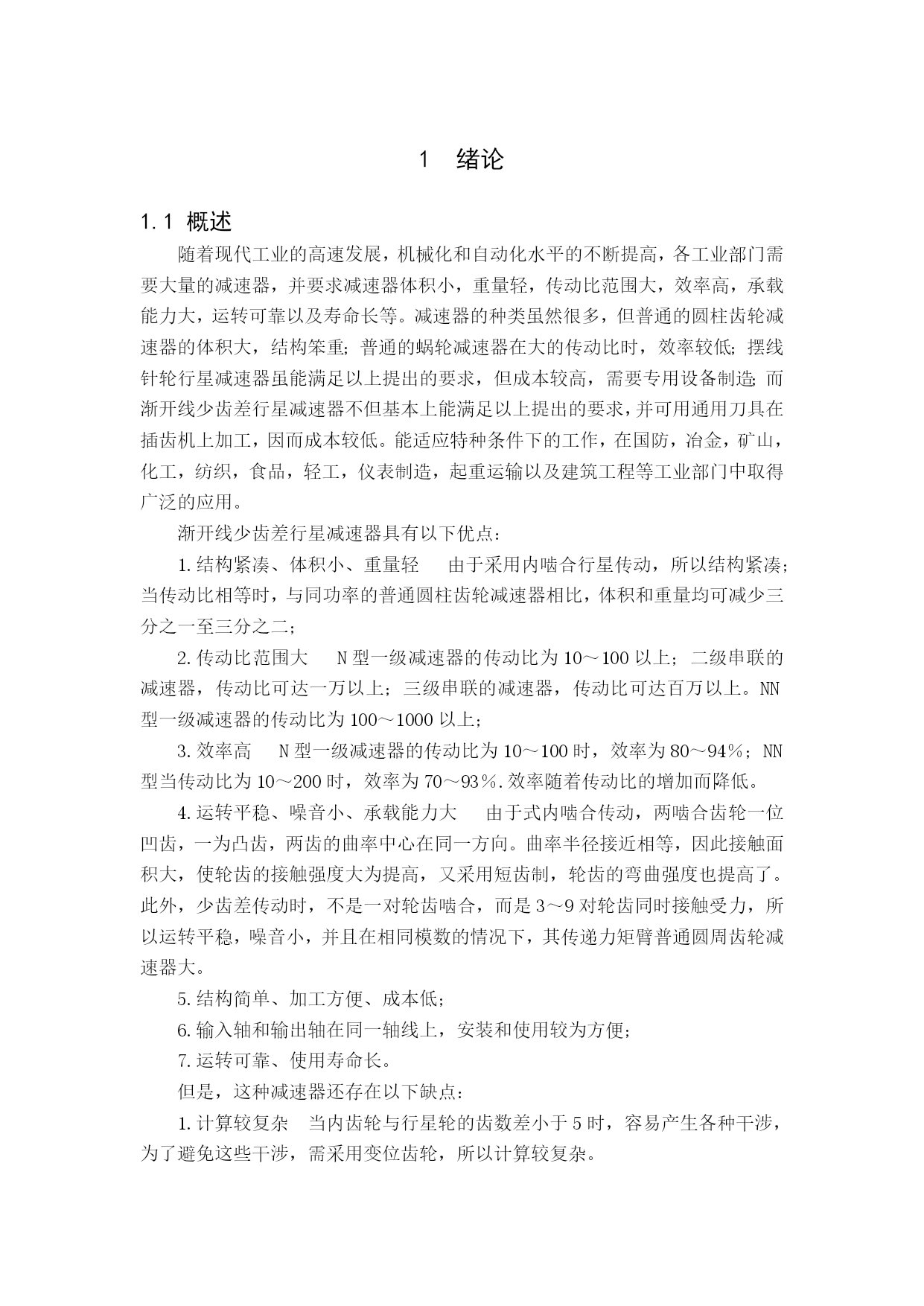 少齿差行星齿轮减速器的设计毕业设计(常用版)(可以直接使用,可编辑完整版资料,欢迎下载)****本科毕业设计(论文)少齿差行星齿轮减速器的设计学生姓名:学生学号:院(系):机电工程学院年级专业:机械设计制造及其自动化指导教师:助理指导教师:二〇一年月摘要对少齿差行星齿轮减速器国内外的发展现状、优缺点、结构型式和其传动原理进行了一定的阐述。在设计过程当中,对内啮合传动产生的各种干涉进行了详细验算;从如何提高转臂轴承的寿命为出发点,来计算选择减速器齿轮的模数,进行少齿差内齿轮副的设计计算,最终合理设计减速器的整体结构。关键词:少齿差行星传动;行星齿轮减速器;内齿轮副AbstractHavingexpoundedtheplanetarygearreducerofafew-toothdifferenceaboutitsdevelopmentofthestatusquoathomeandabroad,theadvantagesanddisadvantages,structuraltypeandprincipleofitstransmission.Amongtheprocessofdesigning,havingcheckeddetailedlyabouttheinterferencewhichgeneratedbyinternalmeshtransmission.Fromhowtoimprovethelifeofbearingarmstothestartingpoint,choosingandcalculatingthemodulusofthegearreducerfordesigningtheinternalgearpairofafew-toothdifferenceandthefinaloverallstructureofthereducer.Keywords:Smalltoothnumberdifferenceplanettransmission;Planetarygearreducer;Annulargear目录TOC\o"1-3"\h\z\uHYPERLINK\l"_Toc263192666"摘要ⅠHYPERLINK\l"_Toc263192667"ABSTRACTⅡHYPERLINK\l"_Toc263192668"1绪论PAGEREF_Toc263192668\h1HYPERLINK\l"_Toc263192669"1.1概述PAGEREF_Toc263192669\h1HYPERLINK\l"_Toc263192670"1.2少齿差行星减速器的结构型式PAGEREF_Toc263192670\h2HYPERLINK\l"_Toc263192671"1.2.1N型少齿差行星减速器PAGEREF_Toc263192671\h2HYPERLINK\l"_Toc263192672"1.2.2NN型少齿差行星减速器PAGEREF_Toc263192672\h3HYPERLINK\l"_Toc263192673"1.3国内外研究状况PAGEREF_Toc263192673\h5HYPERLINK\l"_Toc263192674"1.4发展趋势PAGEREF_Toc263192674\h6HYPERLINK\l"_Toc263192675"1.5本课题的意义与设计任务PAGEREF_Toc263192675\h7HYPERLINK\l"_Toc263192676"1.5.1本课题的设计意义PAGEREF_Toc263192676\h7HYPERLINK\l"_Toc263192677"1.5.2设计任务PAGEREF_Toc263192677\h7HYPERLINK\l"_Toc263192678"2减速器结构型式的确定PAGEREF_Toc263192678\h8HYPERLINK\l"_Toc263192679"2.1减速器结构型式的确定PAGEREF_Toc263192679\h8HYPERLINK\l"_Toc263192680"3减速器的内齿和外齿轮参数的确定PAGEREF_Toc263192680\h10HYPERLINK\l"_Toc263192681"3.1齿轮齿数确定PAGEREF_Toc263192681\h10HYPERLINK\l"_Toc263192682"3.2主要零件的材质和齿轮