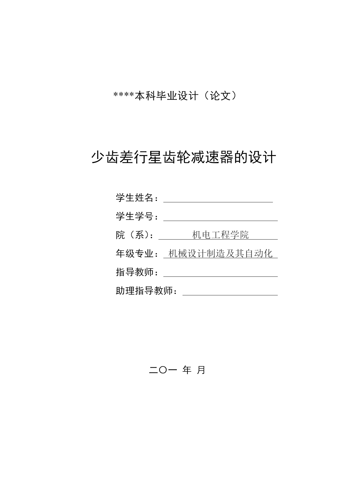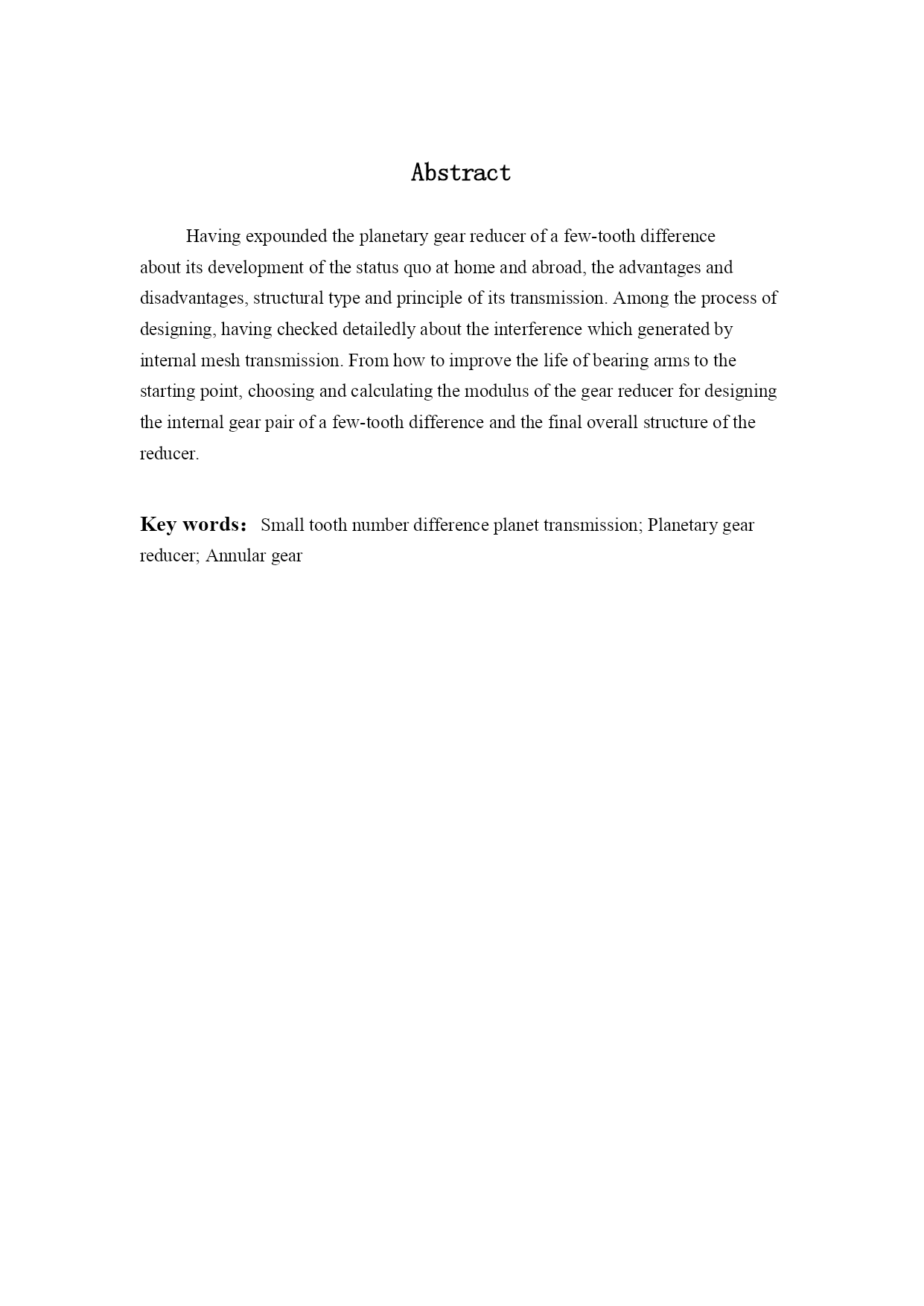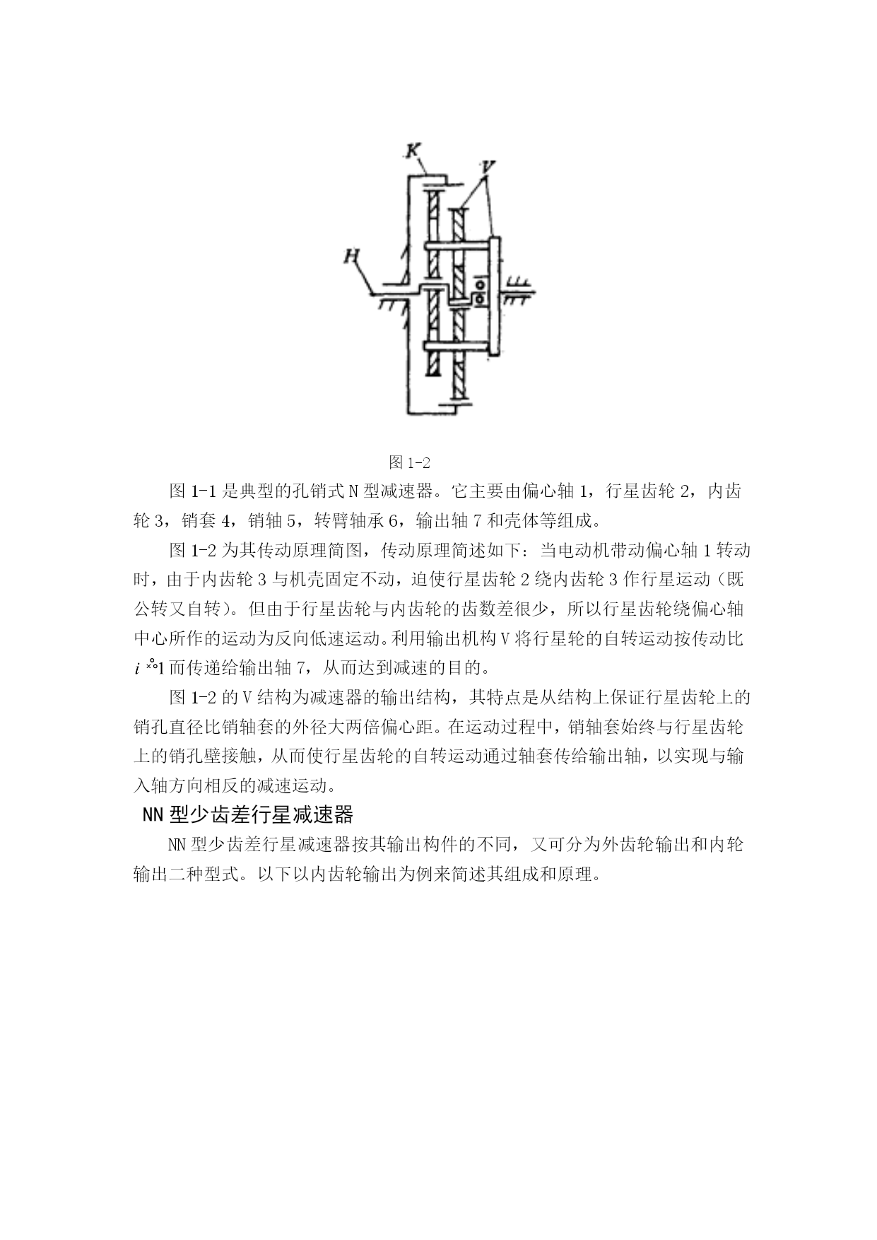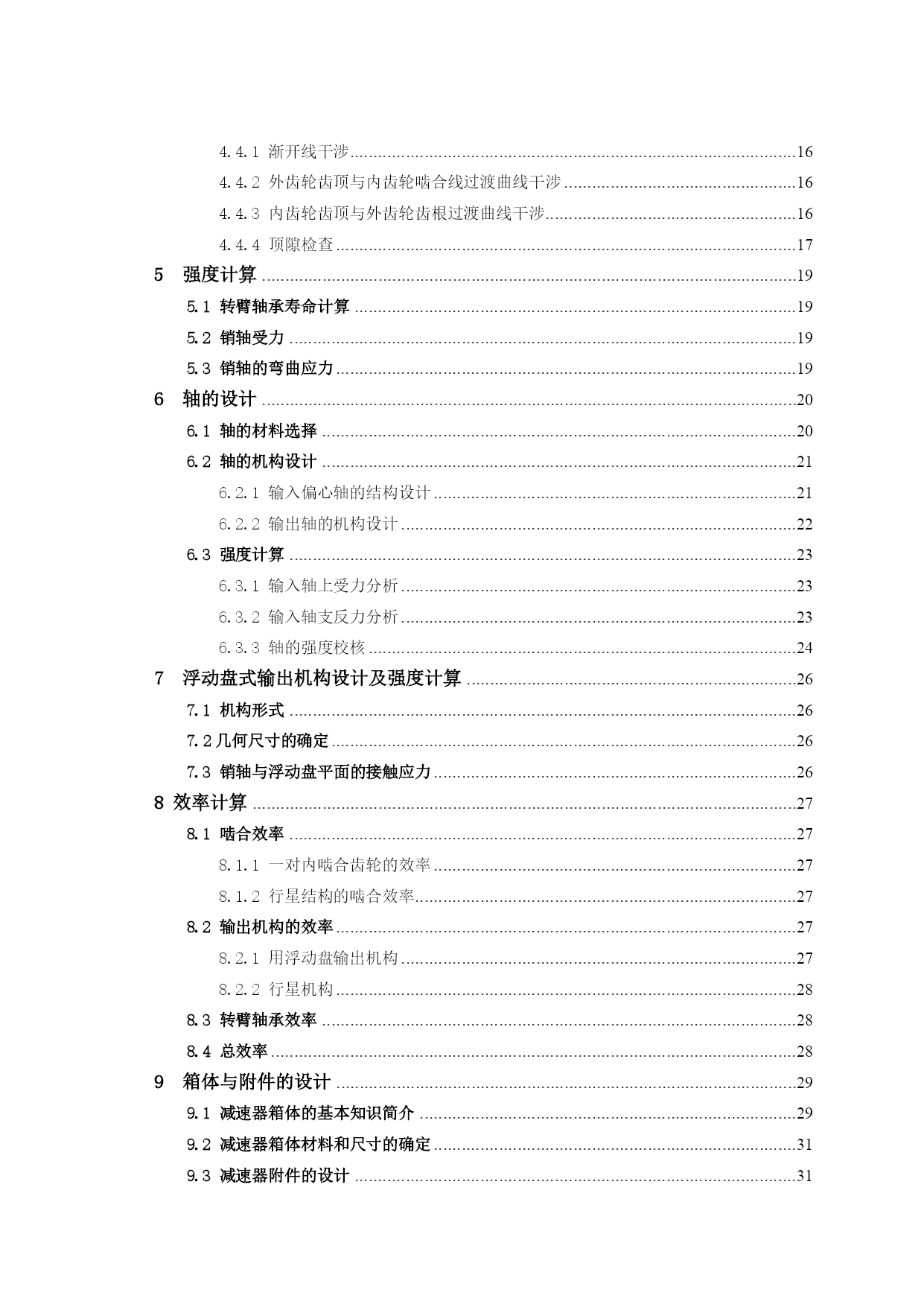 少齿差行星齿轮减速器的设计毕业设计(常用版)(可以直接使用,可编辑完整版资料,欢迎下载)****本科毕业设计(论文)少齿差行星齿轮减速器的设计学生姓名:学生学号:院(系):机电工程学院年级专业:机械设计制造及其自动化指导教师:助理指导教师:二〇一年月摘要对少齿差行星齿轮减速器国内外的发展现状、优缺点、结构型式和其传动原理进行了一定的阐述。在设计过程当中,对内啮合传动产生的各种干涉进行了详细验算;从如何提高转臂轴承的寿命为出发点,来计算选择减速器齿轮的模数,进行少齿差内齿轮副的设计计算,最终合理设计减速器的整体结构。关键词:少齿差行星传动;行星齿轮减速器;内齿轮副AbstractHavingexpoundedtheplanetarygearreducerofafew-toothdifferenceaboutitsdevelopmentofthestatusquoathomeandabroad,theadvantagesanddisadvantages,structuraltypeandprincipleofitstransmission.Amongtheprocessofdesigning,havingcheckeddetailedlyabouttheinterferencewhichgeneratedbyinternalmeshtransmission.Fromhowtoimprovethelifeofbearingarmstothestartingpoint,choosingandcalculatingthemodulusofthegearreducerfordesigningtheinternalgearpairofafew-toothdifferenceandthefinaloverallstructureofthereducer.Keywords:Smalltoothnumberdifferenceplanettransmission;Planetarygearreducer;Annulargear目录TOC\o"1-3"\h\z\uHYPERLINK\l"_Toc263192666"摘要ⅠHYPERLINK\l"_Toc263192667"ABSTRACTⅡHYPERLINK\l"_Toc263192668"1绪论PAGEREF_Toc263192668\h1HYPERLINK\l"_Toc263192669"1.1概述PAGEREF_Toc263192669\h1HYPERLINK\l"_Toc263192670"1.2少齿差行星减速器的结构型式PAGEREF_Toc263192670\h2HYPERLINK\l"_Toc263192671"1.2.1N型少齿差行星减速器PAGEREF_Toc263192671\h2HYPERLINK\l"_Toc263192672"1.2.2NN型少齿差行星减速器PAGEREF_Toc263192672\h3HYPERLINK\l"_Toc263192673"1.3国内外研究状况PAGEREF_Toc263192673\h5HYPERLINK\l"_Toc263192674"1.4发展趋势PAGEREF_Toc263192674\h6HYPERLINK\l"_Toc263192675"1.5本课题的意义与设计任务PAGEREF_Toc263192675\h7HYPERLINK\l"_Toc263192676"1.5.1本课题的设计意义PAGEREF_Toc263192676\h7HYPERLINK\l"_Toc263192677"1.5.2设计任务PAGEREF_Toc263192677\h7HYPERLINK\l"_Toc263192678"2减速器结构型式的确定PAGEREF_Toc263192678\h8HYPERLINK\l"_Toc263192679"2.1减速器结构型式的确定PAGEREF_Toc263192679\h8HYPERLINK\l"_Toc263192680"3减速器的内齿和外齿轮参数的确定PAGEREF_Toc263192680\h10HYPERLINK\l"_Toc263192681"3.1齿轮齿数确定PAGEREF_Toc263192681\h10HYPERLINK\l"_Toc263192682"3.2主要零件的材质和齿轮