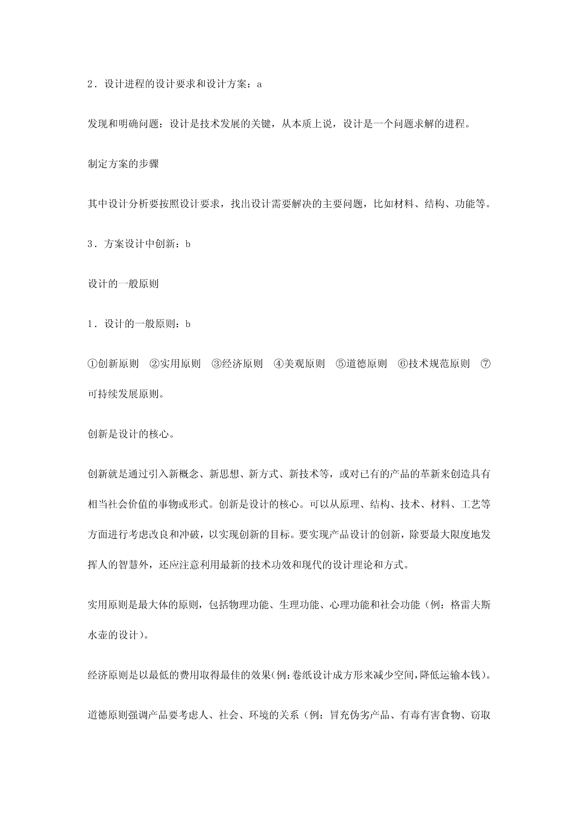 高中通用技术会考知识点总结技术与设计1第一章走进技术世界技术的价值一、技术对人类的价值:a技术是人类为知足自身的需求和愿望对大自然进行的改造。它具有保护人、解放人和发展人的作用[保护人](例:原始人随身拾磨制好的石器,现代人对疟疾、天花、肺结核等疾病再也不恐慌)[解放人](例:体力解放:自行车、内燃动力、电力,电话——信息传递)[发展人](例:爱迪生、袁隆平)二、技术对生活、生产、文化等方面的影响:a技术增进社会的发展;技术丰硕社会文化内容;技术改变社会生活方式;是推动社会发展和文明进步的主要动力之一。3、技术对自然的价值:c(1)依托技术,人类得以利用自然和改造,并与自然维持和谐共处的友好关系。(例:都江堰、南水北调、西气东输)(2)人类利用技术开发、改造自然时,应把握合理的尺度,要注意对自然的保护,不能轻忽技术或产品对环境可能造成的负面影响。(3)技术的发展给自然环境带来了问题,但也给解决这些问题提供了可能(例:物料的再循环工艺)技术的性质技术的大体特性:目的性、创新性、综合性、两面性、专利性。一、技术的发展与发明和革新关系:b创新是技术发展的核心。每一项技术的问世都是创新的结果。技术的发展需要创新,技术创新表现为技术革新和技术发明。技术创新是一个艰难而曲折的历程。(例:显示器的不断发展属于技术革新,王选发明激光照排系统属于技术发明。)2.技术的两面性:a任何事物客观上都有两面性,技术也不例外。它既可以给人们带来福音,也可能给人们带来危害。(例:电池可以带来光明和动力,也可以带来严重的环境污染。网络技术方便人们交流沟通,但也有人利用网络犯法。B超技术可以用于医疗,但也有人进行胎儿辨别)3.技术与科学的区别与联系:b技术与科学的区别与联系科学是通过各类方式和实验,从而发现规律、理论,并予以验证和公式化的知识体系。如:牛顿发现万有引力、达尔文发现进化论、居里夫人发现镭等。技术则是人类为了知足自身的需要和愿望对大自然进行的改造。如:瓦特发明蒸汽机、贝尔发明、恩格尔巴特发明鼠标、爱迪生发明电灯泡等科学回答“是什么”“为何”的问题技术则更多地回答“怎么办”的问题科学增进了技术的发展,技术推动了科学的进步。4.知识产权在技术领域的重要作用:a知识产权是人们基于自己的智力活动创造的功效和经营活动的标记、信用而依法享有的权利。狭义的知识产权包括高作权、专利权、商标权三部份。专利在产权保护制度下对技术活动的重要性知识产权制度允许专利所有权人对专利技术具有必然的性,使其专利技术和产品在一按时间内独占市场,从而取得丰厚的回报,维持发明创造的踊跃性,使技术创新活动趋向良性循环专利的特性:独占性、时间性、地域性?专利申请步骤:提交申请阶段→受理阶段→初审阶段→发布阶段→实审阶段→授权阶段技术的未来技术的发展趋势,对技术的情感和理性态度:b对“技术的未来”的追思和向往,既不需要技术迷惘中的旷世悲怆,也不需要技术崇拜中盲目乐观。理性地看待技术,应以负责、更有远见、更有具道德的方式利用技术。技术的未来既充满希望,也隐含要挟,理性地看待技术的未来,才不至于迷失在技术的世界里。第二章技术世界中的设计技术与设计的关系1.设计的内涵:b设计是基于必然假想的、有目的的计划及创造活动。(例:书写工具的发展、电动剃须刀的发展。)2.技术与设计的关系:b①设计是技术功效转化的桥梁和纽带。(例:白色污染和可降解餐具)②设计增进技术的革新。③技术是设计的平台,没有技术作基础,设计将难以表现和实现。(例:早在16世纪达芬奇就设计了飞行器,但那时技术水平不够,致使飞行器难以实现)④技术更新为设计提供更广漠的发展空间。(例:电灯发明以后,人们设计出了各类各样的灯泡)⑤技术进步还增进人们设计思维和手腕的发展。发展的技术不断丰硕着人们的设计手腕和方式。(例:计算机、打印机的发展改变了设计的手腕)技术设计偏重于功能、结构、材料、工艺等,艺术设计偏重于色彩、造型、审美等设计中的人机关系1.人机关系的含义:b当咱们利用物品时,物品就与人产生了一种彼此关系。这种彼此的关系就称为人机关系。当人们身处某一环境的时候,这时的人机关系就表现为人与环境的彼此关系。“机”是指计算机、机械、工具、仪器、仪表、设备、设施、家具、交通车辆和劳动保护用具等等。在人机关系中,往往存在复杂的多方面关系。不必然要有接触。(例:开门、乘电梯)2.人机关系在设计中要实现的目标:a①高效人机协调,提供人的工作效率。