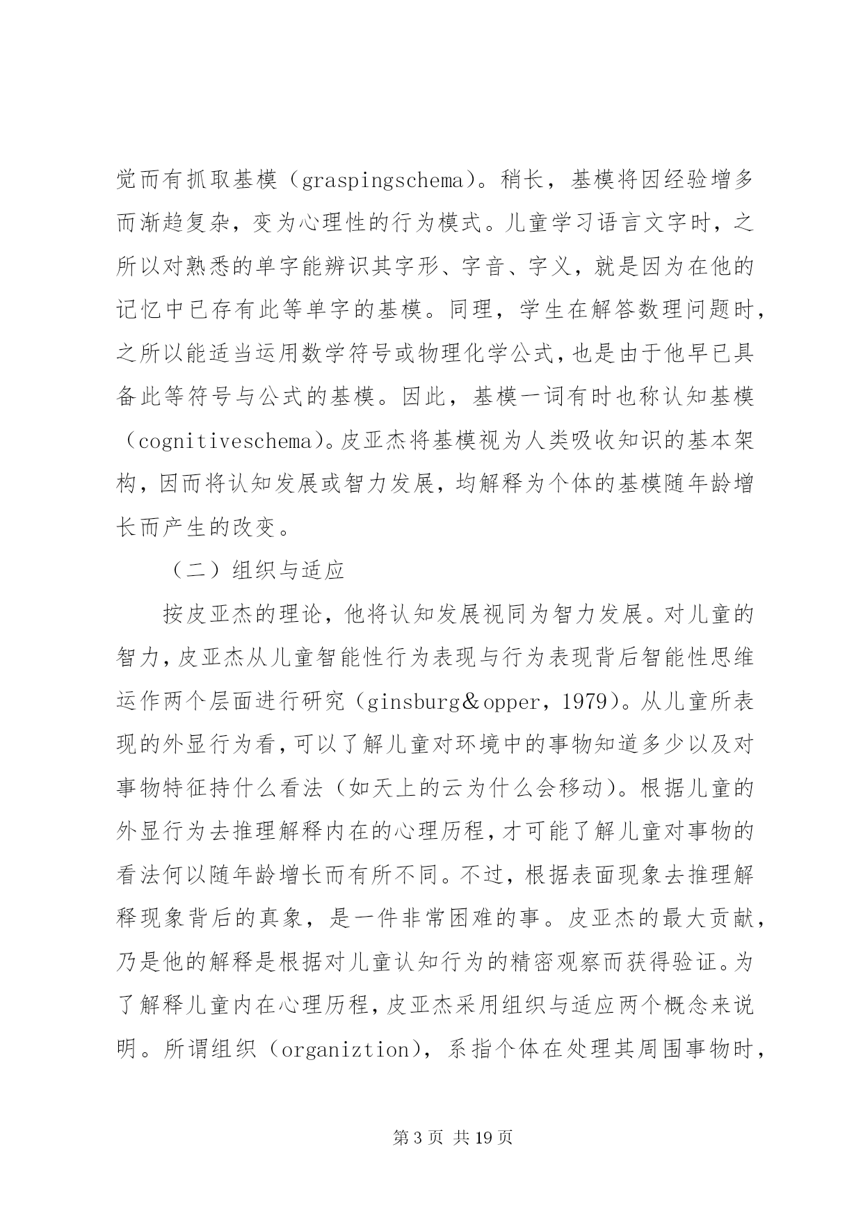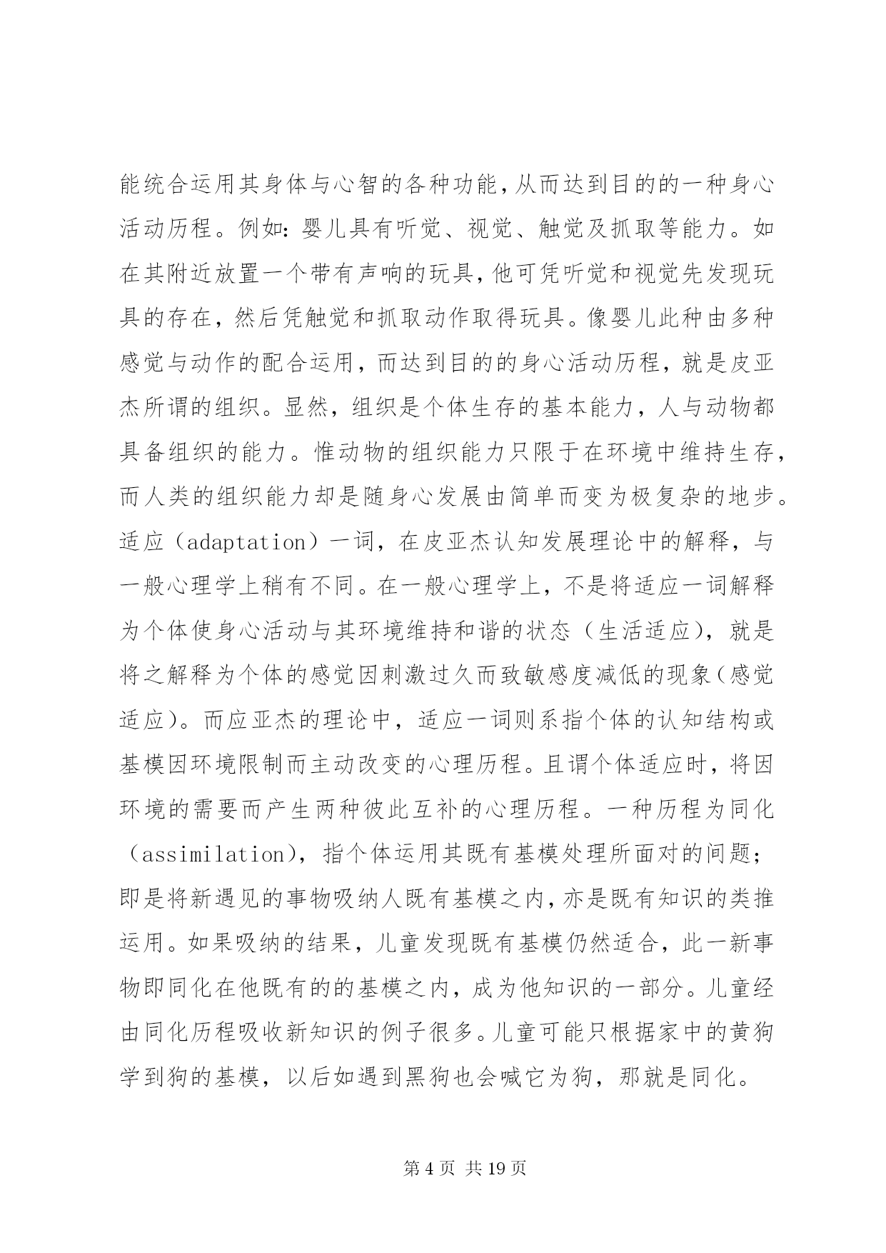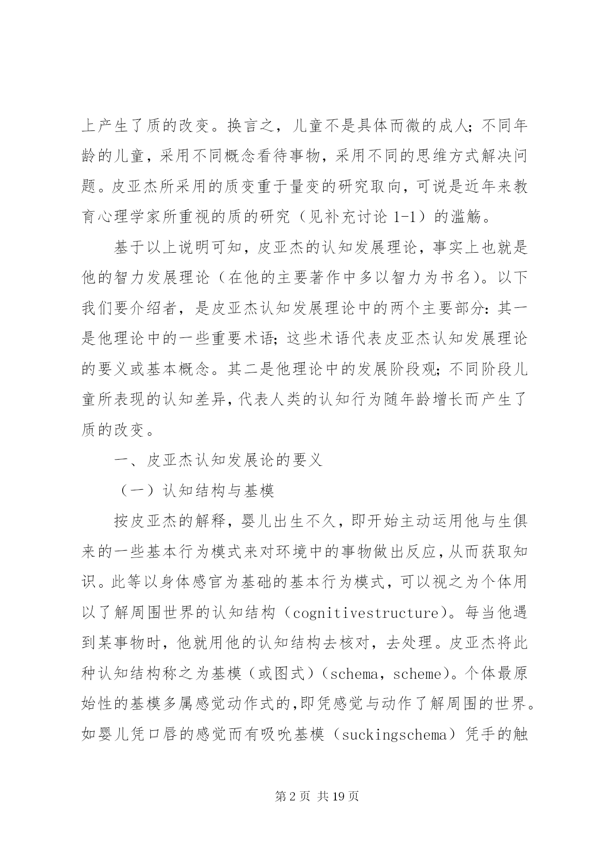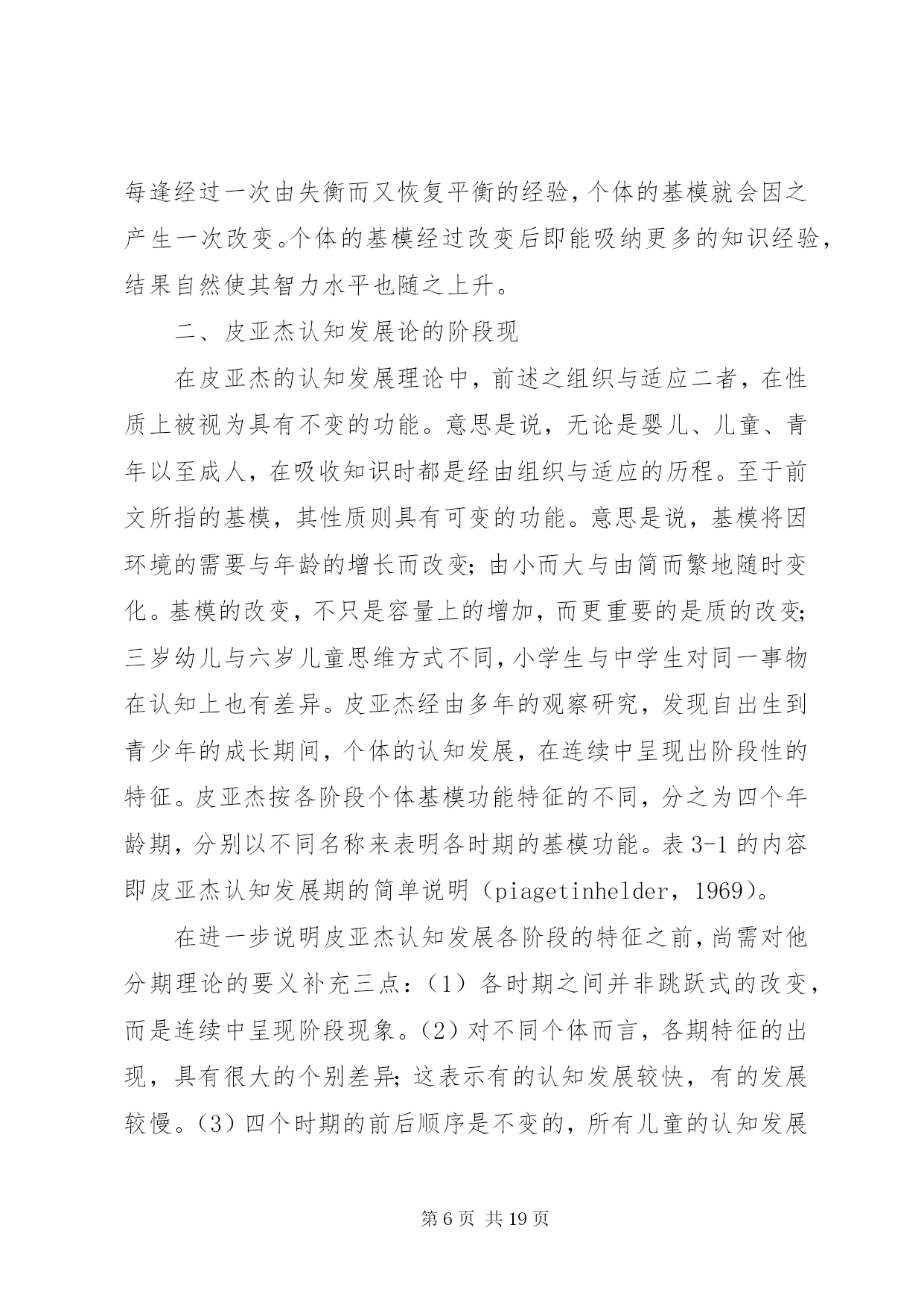 第PAGE\*Arabic\*MERGEFORMAT19页共NUMPAGES\*MERGEFORMAT19页对皮亚杰认知发展理论的学习心得皮亚杰的认知发展论瑞士儿童心理学家皮亚杰(jeanpiaget,1896~1980)(见图3-1)的认知发展论(cognitive-developmentaltheory),被公认为20世纪发展心理学上最权威的理论。皮亚杰对儿童心理发展的研究,最重大的贡献是在儿童的认知发展与道德发展两方面。有关皮亚杰道德发展理论,我们留待第四章社会发展主题之下再行讨论。在此先介绍他的认知发展理论。皮亚杰对儿童认知发展的研究,始自20世纪的30年代,但他的研究成就之被世界(尤其是在美国)心理学家们肯定,却是在多年后的60年代期间。形成此种现象的原因,除皮亚杰的著作全系以法文撰写不如英文易于传播之外,主要还是他采用的方法和对人类智力发展(见第十章)理念与其他多数心理学家不同使然。皮亚杰不采用当时心理学主流行为主义心理学家们(见第五章)所强调的等组实验以及根据多数人资料统计结果推论解释的方法。而是只对个别的儿童(主要是他自己的三个孩子),在相当自然的情境下细密地、连续地观察记录他们对事物处理时所表现的智能性反应,从而分析儿童们的智能表现与其年龄的关系。皮亚杰对儿童心智活动的解释,与当时其他心理学家有异;他认为儿童的思维或心智活动异于成人,儿童随年龄增长而产生的智力发展,并非表现于他的知识在量上有所增加,而是在思维方式上产生了质的改变。换言之,儿童不是具体而微的成人;不同年龄的儿童,采用不同概念看待事物,采用不同的思维方式解决问题。皮亚杰所采用的质变重于量变的研究取向,可说是近年来教育心理学家所重视的质的研究(见补充讨论1-1)的滥觞。基于以上说明可知,皮亚杰的认知发展理论,事实上也就是他的智力发展理论(在他的主要著作中多以智力为书名)。以下我们要介绍者,是皮亚杰认知发展理论中的两个主要部分:其一是他理论中的一些重要术语;这些术语代表皮亚杰认知发展理论的要义或基本概念。其二是他理论中的发展阶段观;不同阶段儿童所表现的认知差异,代表人类的认知行为随年龄增长而产生了质的改变。一、皮亚杰认知发展论的要义(一)认知结构与基模按皮亚杰的解释,婴儿出生不久,即开始主动运用他与生俱来的一些基本行为模式来对环境中的事物做出反应,从而获取知识。此等以身体感官为基础的基本行为模式,可以视之为个体用以了解周围世界的认知结构(cognitivestructure)。每当他遇到某事物时,他就用他的认知结构去核对,去处理。皮亚杰将此种认知结构称之为基模(或图式)(schema,scheme)。个体最原始性的基模多属感觉动作式的,即凭感觉与动作了解周围的世界。如婴儿凭口唇的感觉而有吸吮基模(suckingschema)凭手的触觉而有抓取基模(graspingschema)。稍长,基模将因经验增多而渐趋复杂,变为心理性的行为模式。儿童学习语言文字时,之所以对熟悉的单字能辨识其字形、字音、字义,就是因为在他的记忆中已存有此等单字的基模。同理,学生在解答数理问题时,之所以能适当运用数学符号或物理化学公式,也是由于他早已具备此等符号与公式的基模。因此,基模一词有时也称认知基模(cognitiveschema)。皮亚杰将基模视为人类吸收知识的基本架构,因而将认知发展或智力发展,均解释为个体的基模随年龄增长而产生的改变。(二)组织与适应按皮亚杰的理论,他将认知发展视同为智力发展。对儿童的智力,皮亚杰从儿童智能性行为表现与行为表现背后智能性思维运作两个层面进行研究(ginsburg&opper,1979)。从儿童所表现的外显行为看,可以了解儿童对环境中的事物知道多少以及对事物特征持什么看法(如天上的云为什么会移动)。根据儿童的外显行为去推理解释内在的心理历程,才可能了解儿童对事物的看法何以随年龄增长而有所不同。不过,根据表面现象去推理解释现象背后的真象,是一件非常困难的事。皮亚杰的最大贡献,乃是他的解释是根据对儿童认知行为的精密观察而获得验证。为了解释儿童内在心理历程,皮亚杰采用组织与适应两个概念来说明。所谓组织(organiztion),系指个体在处理其周围事物时,能统合运用其身体与心智的各种功能,从而达到目的的一种身心活动历程。例如:婴儿具有听觉、视觉、触觉及抓取等能力。如在其附近放置一个带有声响的玩具,他可凭听觉和视觉先发现玩具的存在,然后凭触觉和抓取动作取得玩具。像婴儿此种由多种感觉与动作的配合运用,而达到目的的身心活动历程,就是皮亚杰所谓的组织。显然,组织是个体生存的基本能力,人与动物都具备组织的能力。惟动物的组织能力只限于在环境中维持生存,而人类的组织能力却是随身心发展由简单而变为极复杂的地步。适应(adaptation