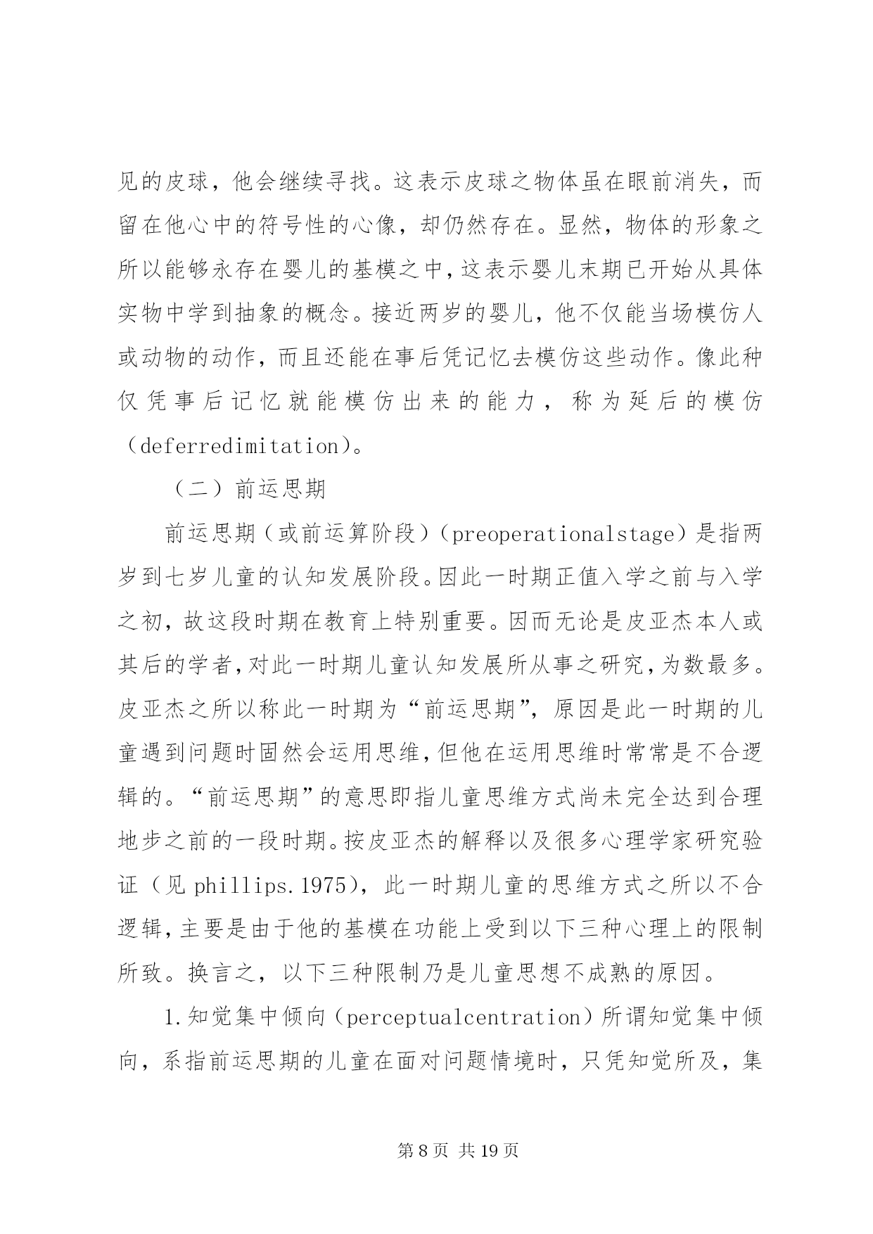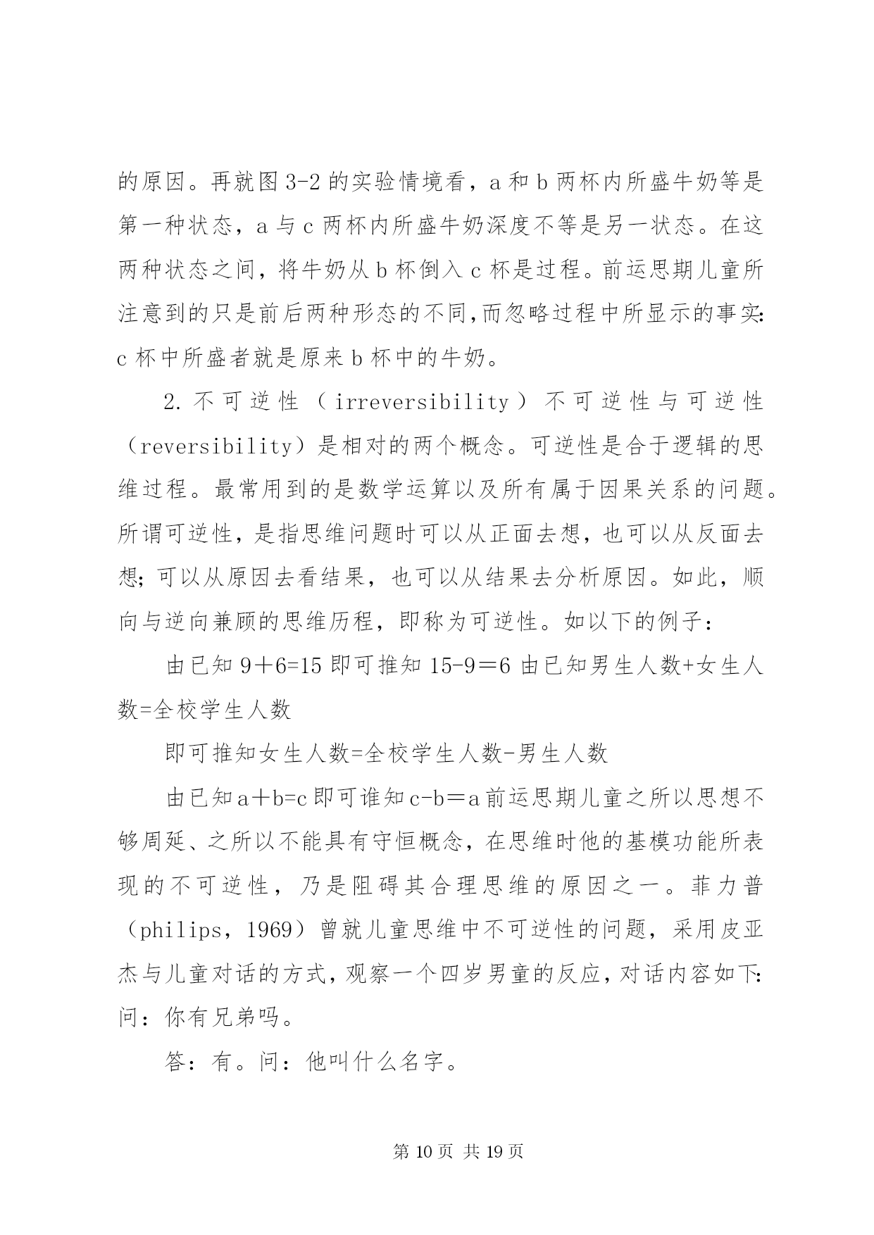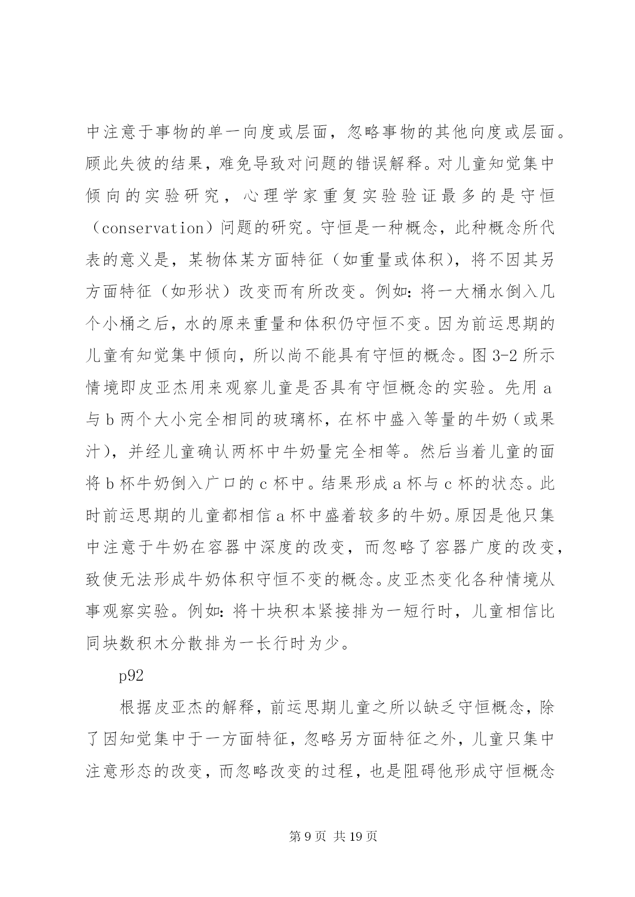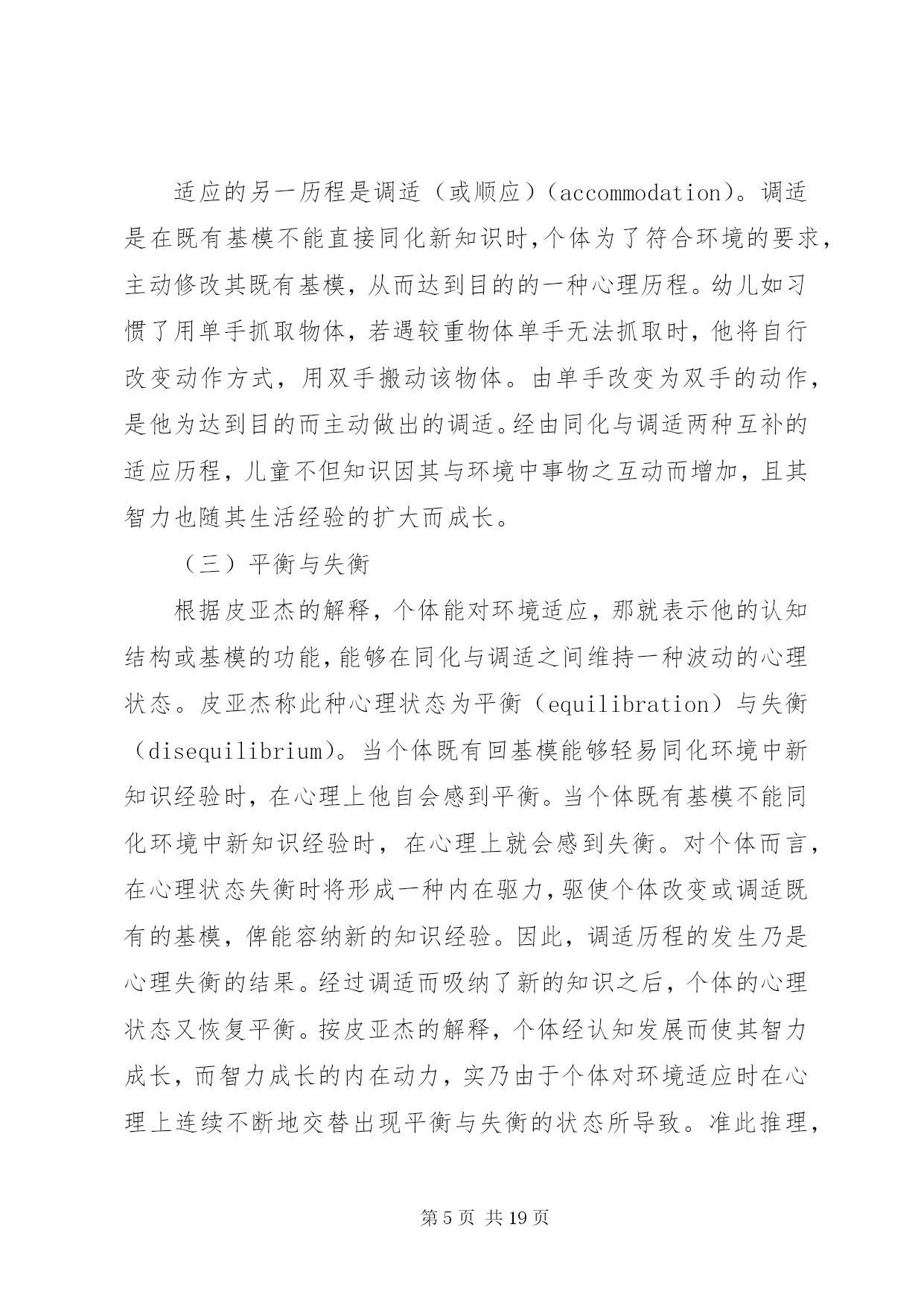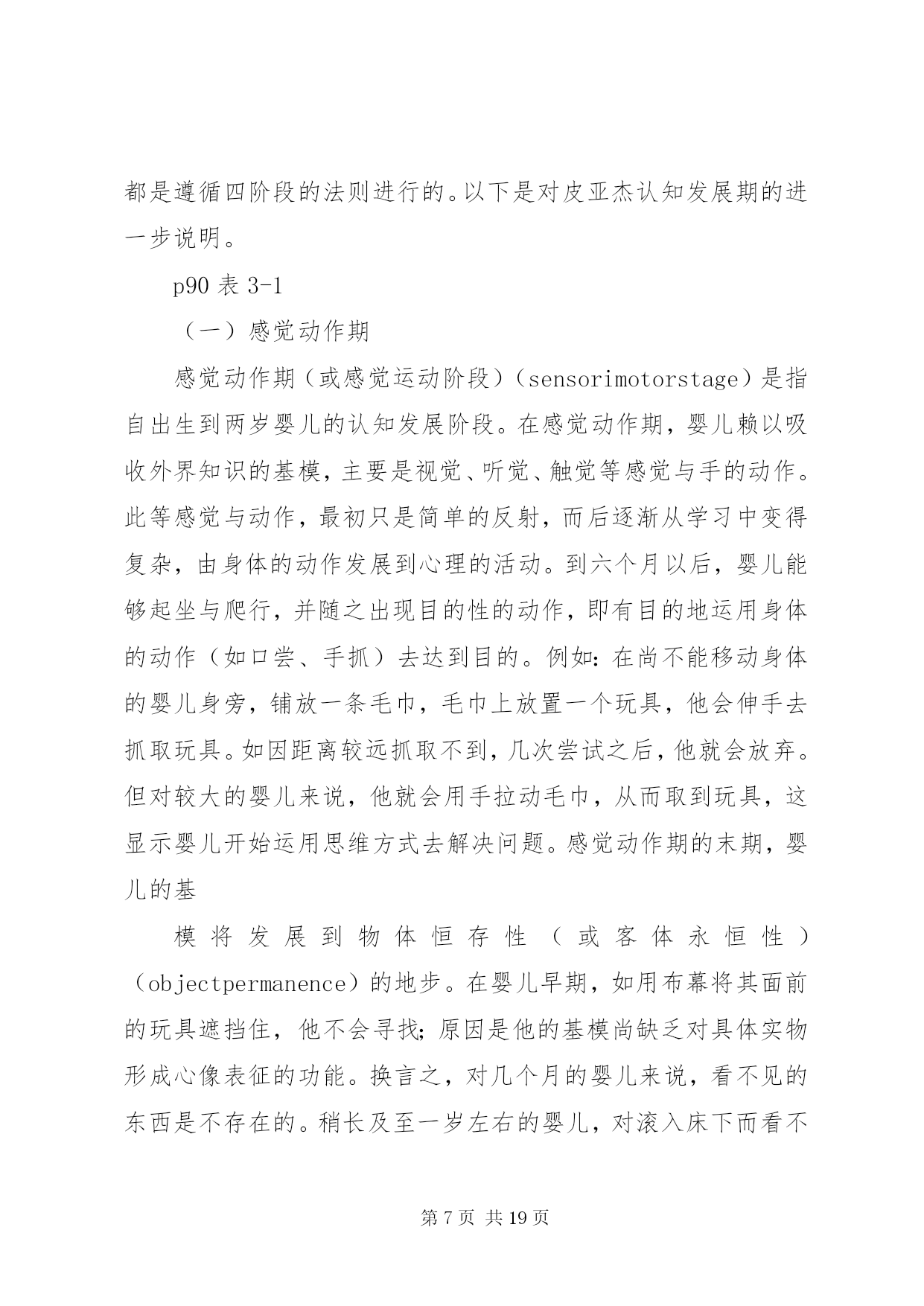 第PAGE\*Arabic\*MERGEFORMAT19页共NUMPAGES\*MERGEFORMAT19页对皮亚杰认知发展理论的学习心得皮亚杰的认知发展论瑞士儿童心理学家皮亚杰(jeanpiaget,1896~1980)(见图3-1)的认知发展论(cognitive-developmentaltheory),被公认为20世纪发展心理学上最权威的理论。皮亚杰对儿童心理发展的研究,最重大的贡献是在儿童的认知发展与道德发展两方面。有关皮亚杰道德发展理论,我们留待第四章社会发展主题之下再行讨论。在此先介绍他的认知发展理论。皮亚杰对儿童认知发展的研究,始自20世纪的30年代,但他的研究成就之被世界(尤其是在美国)心理学家们肯定,却是在多年后的60年代期间。形成此种现象的原因,除皮亚杰的著作全系以法文撰写不如英文易于传播之外,主要还是他采用的方法和对人类智力发展(见第十章)理念与其他多数心理学家不同使然。皮亚杰不采用当时心理学主流行为主义心理学家们(见第五章)所强调的等组实验以及根据多数人资料统计结果推论解释的方法。而是只对个别的儿童(主要是他自己的三个孩子),在相当自然的情境下细密地、连续地观察记录他们对事物处理时所表现的智能性反应,从而分析儿童们的智能表现与其年龄的关系。皮亚杰对儿童心智活动的解释,与当时其他心理学家有异;他认为儿童的思维或心智活动异于成人,儿童随年龄增长而产生的智力发展,并非表现于他的知识在量上有所增加,而是在思维方式上产生了质的改变。换言之,儿童不是具体而微的成人;不同年龄的儿童,采用不同概念看待事物,采用不同的思维方式解决问题。皮亚杰所采用的质变重于量变的研究取向,可说是近年来教育心理学家所重视的质的研究(见补充讨论1-1)的滥觞。基于以上说明可知,皮亚杰的认知发展理论,事实上也就是他的智力发展理论(在他的主要著作中多以智力为书名)。以下我们要介绍者,是皮亚杰认知发展理论中的两个主要部分:其一是他理论中的一些重要术语;这些术语代表皮亚杰认知发展理论的要义或基本概念。其二是他理论中的发展阶段观;不同阶段儿童所表现的认知差异,代表人类的认知行为随年龄增长而产生了质的改变。一、皮亚杰认知发展论的要义(一)认知结构与基模按皮亚杰的解释,婴儿出生不久,即开始主动运用他与生俱来的一些基本行为模式来对环境中的事物做出反应,从而获取知识。此等以身体感官为基础的基本行为模式,可以视之为个体用以了解周围世界的认知结构(cognitivestructure)。每当他遇到某事物时,他就用他的认知结构去核对,去处理。皮亚杰将此种认知结构称之为基模(或图式)(schema,scheme)。个体最原始性的基模多属感觉动作式的,即凭感觉与动作了解周围的世界。如婴儿凭口唇的感觉而有吸吮基模(suckingschema)凭手的触觉而有抓取基模(graspingschema)。稍长,基模将因经验增多而渐趋复杂,变为心理性的行为模式。儿童学习语言文字时,之所以对熟悉的单字能辨识其字形、字音、字义,就是因为在他的记忆中已存有此等单字的基模。同理,学生在解答数理问题时,之所以能适当运用数学符号或物理化学公式,也是由于他早已具备此等符号与公式的基模。因此,基模一词有时也称认知基模(cognitiveschema)。皮亚杰将基模视为人类吸收知识的基本架构,因而将认知发展或智力发展,均解释为个体的基模随年龄增长而产生的改变。(二)组织与适应按皮亚杰的理论,他将认知发展视同为智力发展。对儿童的智力,皮亚杰从儿童智能性行为表现与行为表现背后智能性思维运作两个层面进行研究(ginsburg&opper,1979)。从儿童所表现的外显行为看,可以了解儿童对环境中的事物知道多少以及对事物特征持什么看法(如天上的云为什么会移动)。根据儿童的外显行为去推理解释内在的心理历程,才可能了解儿童对事物的看法何以随年龄增长而有所不同。不过,根据表面现象去推理解释现象背后的真象,是一件非常困难的事。皮亚杰的最大贡献,乃是他的解释是根据对儿童认知行为的精密观察而获得验证。为了解释儿童内在心理历程,皮亚杰采用组织与适应两个概念来说明。所谓组织(organiztion),系指个体在处理其周围事物时,能统合运用其身体与心智的各种功能,从而达到目的的一种身心活动历程。例如:婴儿具有听觉、视觉、触觉及抓取等能力。如在其附近放置一个带有声响的玩具,他可凭听觉和视觉先发现玩具的存在,然后凭触觉和抓取动作取得玩具。像婴儿此种由多种感觉与动作的配合运用,而达到目的的身心活动历程,就是皮亚杰所谓的组织。显然,组织是个体生存的基本能力,人与动物都具备组织的能力。惟动物的组织能力只限于在环境中维持生存,而人类的组织能力却是随身心发展由简单而变为极复杂的地步。适应(adaptation