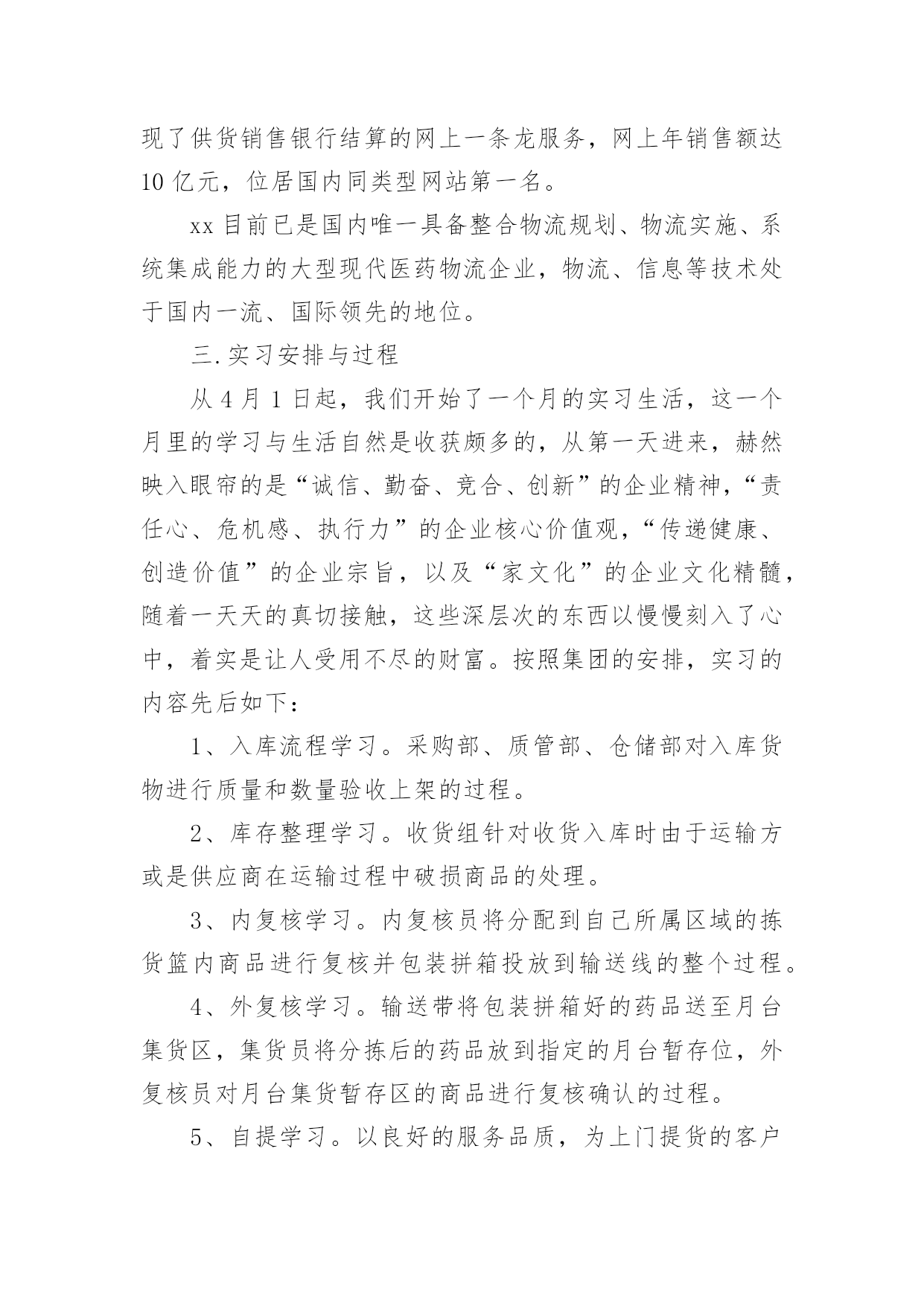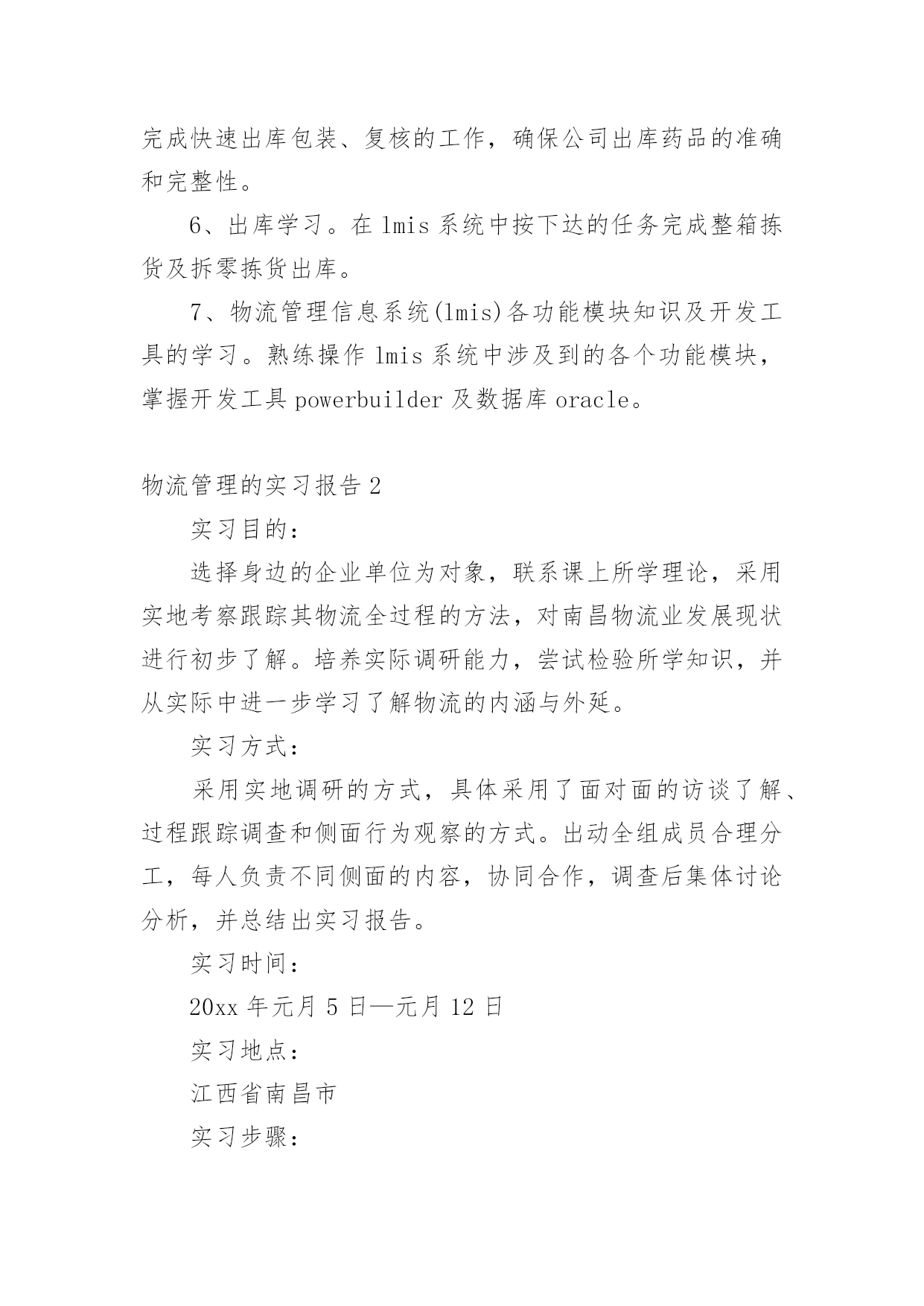物流管理的实习报告在现在社会,我们使用报告的情况越来越多,写报告的时候要注意内容的完整。在写之前,可以先参考范文,下面是小编精心整理的物流管理的实习报告,仅供参考,大家一起来看看吧。物流管理的实习报告1一.实习目的与要求:本次在xx集团股份有限公司实习的目的主要是熟悉物流流程及物流管理信息系统在整个过程中的应用,通过此次实习将自己在校期间所学的理论联系实践,通过对日常业务流程、物流管理信息系统(lmis)运行以及开发工具与数据库的学习,达到系统维护与实施的基本要求,以及为将来的系统开发积累基础。实习期间集团要求严格按照实习计划组织学习,保质保量完成实习任务,并顺利通过实习考核。二.实习单位简介:xx集团股份有限公司发轫于改革开放之初的1985年,是一家以药品和医疗器械批发、物流配送、零售连锁以及电子商务为核心业务的股份制企业。xx在国内开创的“低成本、高效率”的医药商业模式被中国医药界誉为“九州通模式”,并成为中国医药物流发展的主流模式,铸就了享誉中国医药行业的九州通品牌。xx在行业内率先建立了电子商务平台九州通医药网,实现了供货销售银行结算的网上一条龙服务,网上年销售额达10亿元,位居国内同类型网站第一名。xx目前已是国内唯一具备整合物流规划、物流实施、系统集成能力的大型现代医药物流企业,物流、信息等技术处于国内一流、国际领先的地位。三.实习安排与过程从4月1日起,我们开始了一个月的实习生活,这一个月里的学习与生活自然是收获颇多的,从第一天进来,赫然映入眼帘的是“诚信、勤奋、竞合、创新”的企业精神,“责任心、危机感、执行力”的企业核心价值观,“传递健康、创造价值”的企业宗旨,以及“家文化”的企业文化精髓,随着一天天的真切接触,这些深层次的东西以慢慢刻入了心中,着实是让人受用不尽的财富。按照集团的安排,实习的内容先后如下:1、入库流程学习。采购部、质管部、仓储部对入库货物进行质量和数量验收上架的过程。2、库存整理学习。收货组针对收货入库时由于运输方或是供应商在运输过程中破损商品的处理。3、内复核学习。内复核员将分配到自己所属区域的拣货篮内商品进行复核并包装拼箱投放到输送线的整个过程。4、外复核学习。输送带将包装拼箱好的药品送至月台集货区,集货员将分拣后的药品放到指定的月台暂存位,外复核员对月台集货暂存区的商品进行复核确认的过程。5、自提学习。以良好的服务品质,为上门提货的客户完成快速出库包装、复核的工作,确保公司出库药品的准确和完整性。6、出库学习。在lmis系统中按下达的任务完成整箱拣货及拆零拣货出库。7、物流管理信息系统(lmis)各功能模块知识及开发工具的学习。熟练操作lmis系统中涉及到的各个功能模块,掌握开发工具powerbuilder及数据库oracle。物流管理的实习报告2实习目的:选择身边的企业单位为对象,联系课上所学理论,采用实地考察跟踪其物流全过程的方法,对南昌物流业发展现状进行初步了解。培养实际调研能力,尝试检验所学知识,并从实际中进一步学习了解物流的内涵与外延。实习方式:采用实地调研的方式,具体采用了面对面的访谈了解、过程跟踪调查和侧面行为观察的方式。出动全组成员合理分工,每人负责不同侧面的内容,协同合作,调查后集体讨论分析,并总结出实习报告。实习时间:20xx年元月5日—元月12日实习地点:江西省南昌市实习步骤:一、前期准备工作1、元月4日下午2:00在北—b104教室参加本专业认识实习周动员大会。2、元月5日上午10:00在一食堂召开小组会议,商讨实习方式、调查对象,对小组成员进行明确分工,并拟定实习计划。3、元月5日下午通过登录网站、查阅报纸、杂志等方式寻找调查对象,并争取专业物流公司或单位的支持和协助。到系办公室开介绍信。4、准备校徽、红帽子、数码相机、笔记本等实习所需物品。二、开展实习活动1、元月6日,走访南昌市物流行业协会。2、元月8日,参观、调查江西交远物流有限公司。3、元月9日,走访江西省南昌商业储运总公司。4、元月11日—12日收集并整理资料,收集各成员的初稿,统一商讨分析并定稿。实习内容:(一)备战认识实习,英雄所见略同。——准备工作篇元月4日下午2:00我们参加了本专业认识实习周动员大会,大会由物流管理专业班主任蒯海章老师主持,易老师在会上对本次实习周工作做了详细的指导,并提出了这次实习的目的、方法及注意事项。蒯老师又提出了这次实习的要求和希望。元月5日上午10:00,我们小组在一食堂召开小组准备会议,组长根据各成员的特点,从摄影、记录、财务、安全保障、撰稿方面进行了明确分工,大家一起讨论实习方式、调查对象,并拟定实习计划。(二)山穷水尽疑无路,柳岸花明又一村。——寻找对象篇元月5日下午我们开始寻找调查对象,通过登录网站、查阅报纸、杂志等方式寻找专业物流公司,在江西物流网上我们