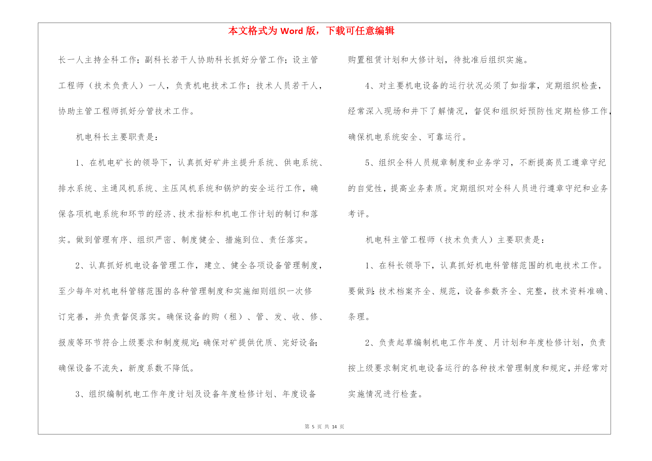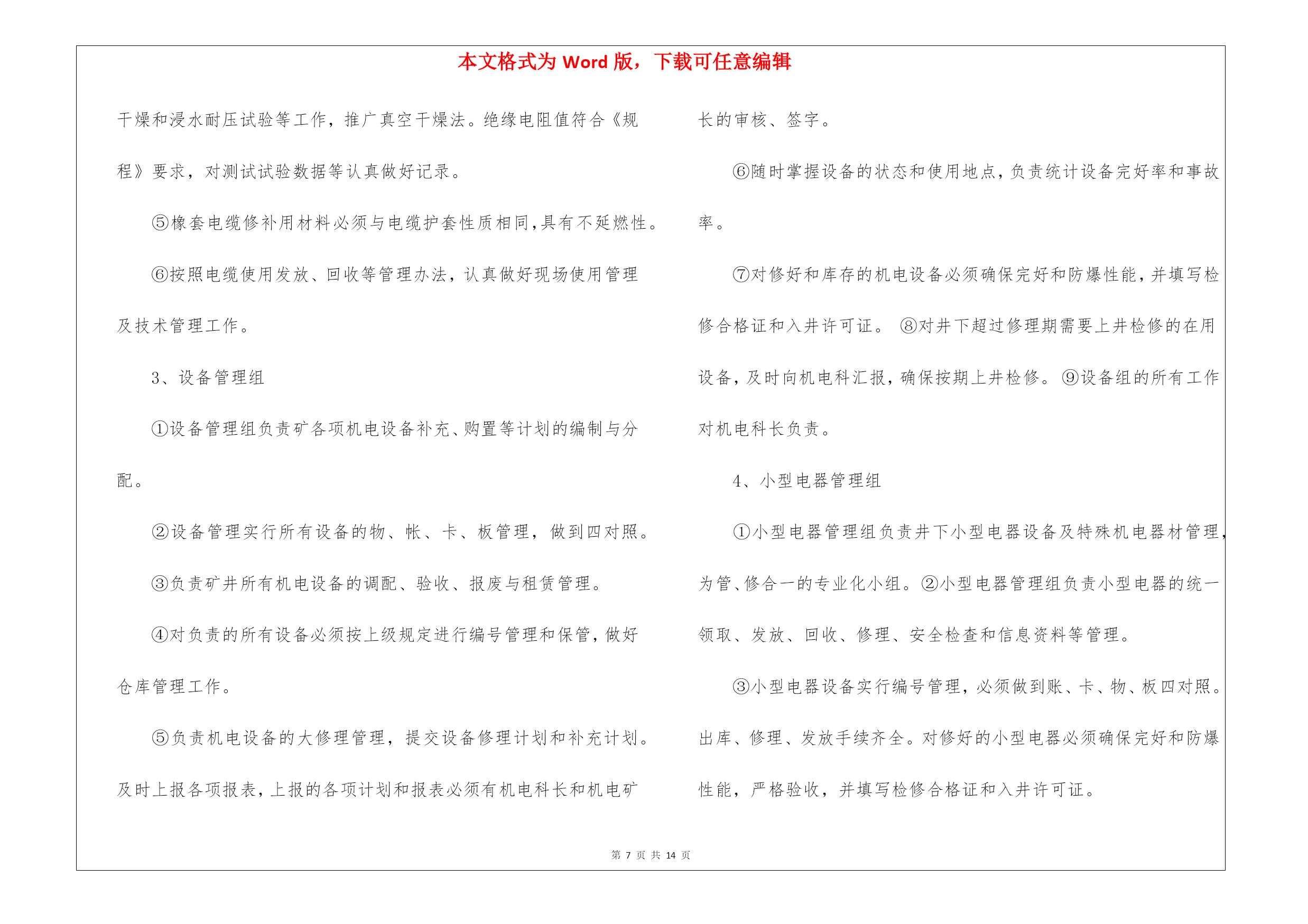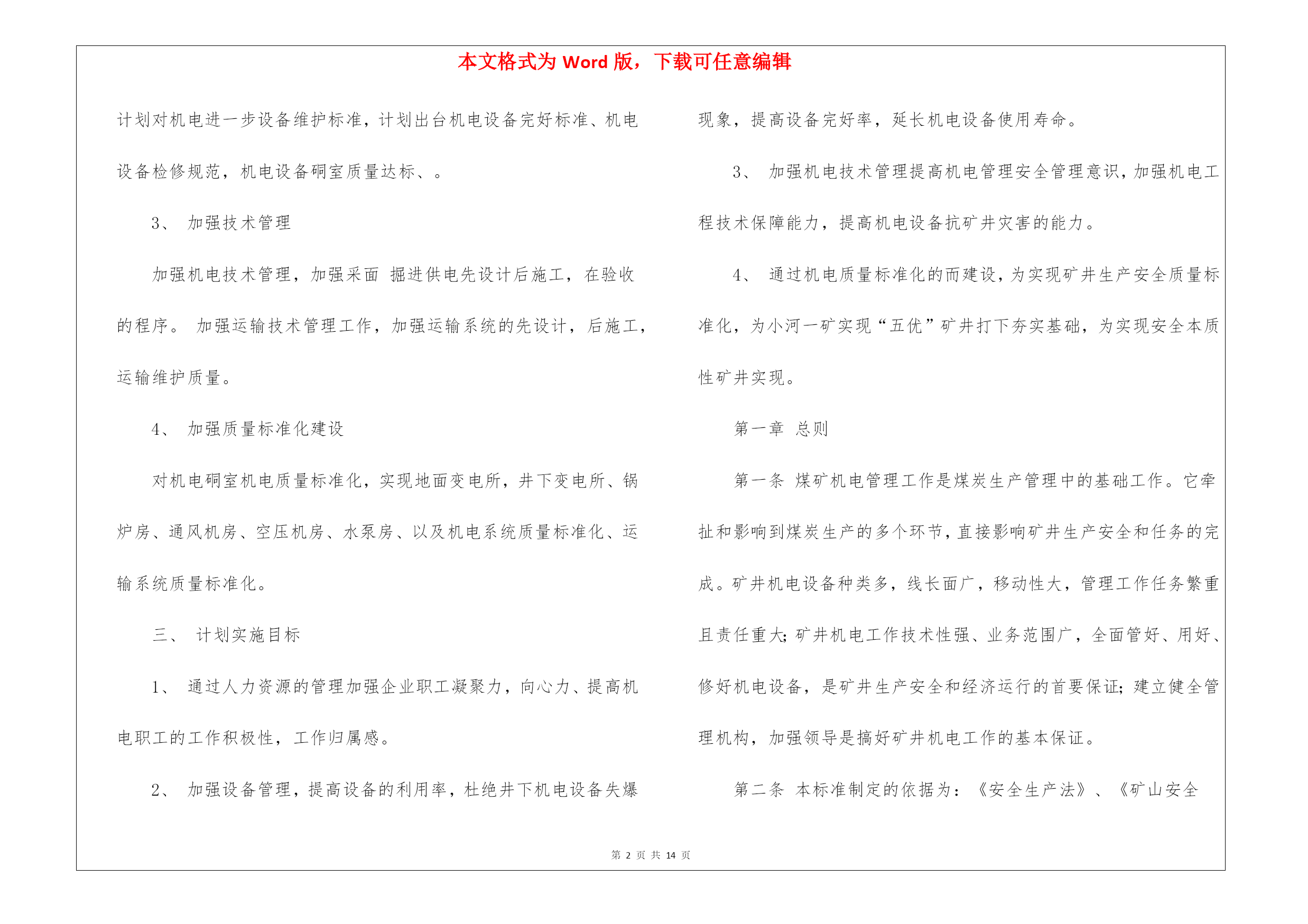 本文格式为Word版,下载可任意编辑第PAGE\*MERGEFORMAT14页共NUMPAGES\*MERGEFORMAT14页机电年度工作计划三篇机电年度工作计划三篇日子如同白驹过隙,不经意间,相信大家对即将到来的工作生活满心期待吧!该好好计划一下接下来的工作了!相信大家又在为写计划犯愁了?以下是我为大家编写的机电年度工作计划3篇,仅供参考,希望能够帮助到大家。机电年度工作计划篇1一、总则为加快机电系统安全、快捷、高效运行,提高设备运行率、减少损失、增大设备使用年限,提高设备重复利用率,提高机电人员安全操作水平,加强机电完好标准,加大设备检修规范,为实现安全本质性矿井打下坚实基础。二、运行管理计划1、人力资源管理人是社会发展的第一要素,现代企业竞争,最终是人力资源的竞争。现代煤矿已经有过去的手镐落煤采煤工艺改为综合机械化采煤和综合机械连续采煤工艺,煤矿机电工人在以后煤矿生产中将起到巨大推动作用。加强机电职工归属感,责任感是机电系统重中之中,通过聘用机电技师工作。机电职工月度评先工作,机电职工内部比武提高机电职工责任感。通过技术培训工作提高职工安全素质,操作技能,通过对机电职工节能改造工作的表扬和奖励,对机电职工责任感和荣誉感的认可,提高机电职工的工作积极性和责任心。2、加强设备管理“工欲善其事,必先利其器,君若利其器,首当顺其治”讲的是企业要保持最强的核心竞争能力,必须要有先进的设备,要让先进的设备流畅运行,发挥最大功效,必须要实施最优秀的管理。设备管理的创新、模式创新让设备管理成为煤矿安全、高效生产的推进器。计划对机电进一步设备维护标准,计划出台机电设备完好标准、机电设备检修规范,机电设备硐室质量达标、。3、加强技术管理加强机电技术管理,加强采面掘进供电先设计后施工,在验收的程序。加强运输技术管理工作,加强运输系统的先设计,后施工,运输维护质量。4、加强质量标准化建设对机电硐室机电质量标准化,实现地面变电所,井下变电所、锅炉房、通风机房、空压机房、水泵房、以及机电系统质量标准化、运输系统质量标准化。三、计划实施目标1、通过人力资源的管理加强企业职工凝聚力,向心力、提高机电职工的工作积极性,工作归属感。2、加强设备管理,提高设备的利用率,杜绝井下机电设备失爆现象,提高设备完好率,延长机电设备使用寿命。3、加强机电技术管理提高机电管理安全管理意识,加强机电工程技术保障能力,提高机电设备抗矿井灾害的能力。4、通过机电质量标准化的而建设,为实现矿井生产安全质量标准化,为小河一矿实现“五优”矿井打下夯实基础,为实现安全本质性矿井实现。第一章总则第一条煤矿机电管理工作是煤炭生产管理中的基础工作。它牵扯和影响到煤炭生产的多个环节,直接影响矿井生产安全和任务的完成。矿井机电设备种类多,线长面广,移动性大,管理工作任务繁重且责任重大;矿井机电工作技术性强、业务范围广,全面管好、用好、修好机电设备,是矿井生产安全和经济运行的首要保证;建立健全管理机构,加强领导是搞好矿井机电工作的基本保证。第二条本标准制定的依据为:《安全生产法》、《矿山安全法》、《煤矿安全规程》、《生产矿井质量标准化标准》、《煤矿机电设备完好标准》、《煤矿矿井机电设备检修标准》以及集团公司有关矿井机电管理的文件、规定等相关条文。第三条本标准适用于集团公司所属各生产矿井机电管理以及机电部门所管理的大型固定设备、采掘移动设备、井上下供电系统等。主要包括:1、大型固定设备(包括矿井主提升机、主扇风机、主空压机、主排水泵、锅炉等设备及附属设施、系统和控制等。)2、矿井主要变供电设备(包括变压器、高低压开关柜、供电系统线路、附属防护装置、控制装置和设备等)。3、井下变供电设备(包括矿用防爆变压器、防爆高低压开关、磁力起动器、防爆电动机、小型电气设备、矿用电力电缆等设备和线路及其保护、控制装置等)。4、矿井采掘移动机电设备和照明、通信、监测等设备设施。第二章矿井机电管理机构设置及责任第四条各矿井必须建立矿、区(科)、班、组四级“机电安全管理工作责任制”,明确工作范围和管理责任。第五条各生产矿井设机电矿长主管机电运输工作,负责矿井机电运输管理及安全运行管理工作。主要职责为:1、在矿长的领导下,负责矿井机电运输的全面管理工作。工作中必须认真贯彻执行党和国家的路线、方针、政策和法令;认真贯彻执行上级和上级主管部门的有关规定、决议,善于结合本矿实际作好矿井机电运输管理工作。并针对本矿情况制定出相应的各种管理制度和执行细则,督促贯彻执行。每年组织修订完善一次各种管理制度及细则。2、落实安全生产方针,认真抓好全矿机电运输系统和设备的安全、高效和经济运行工作,认真抓好机电运输系统的预防性定期检查、检测和检修工作,确保机电运输系统的安全、可靠运行。3、定期主持召开矿井机电运输专业会议