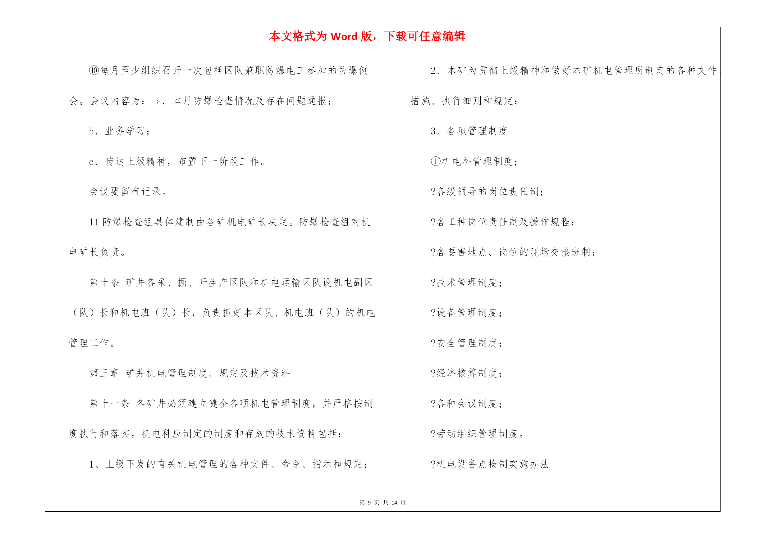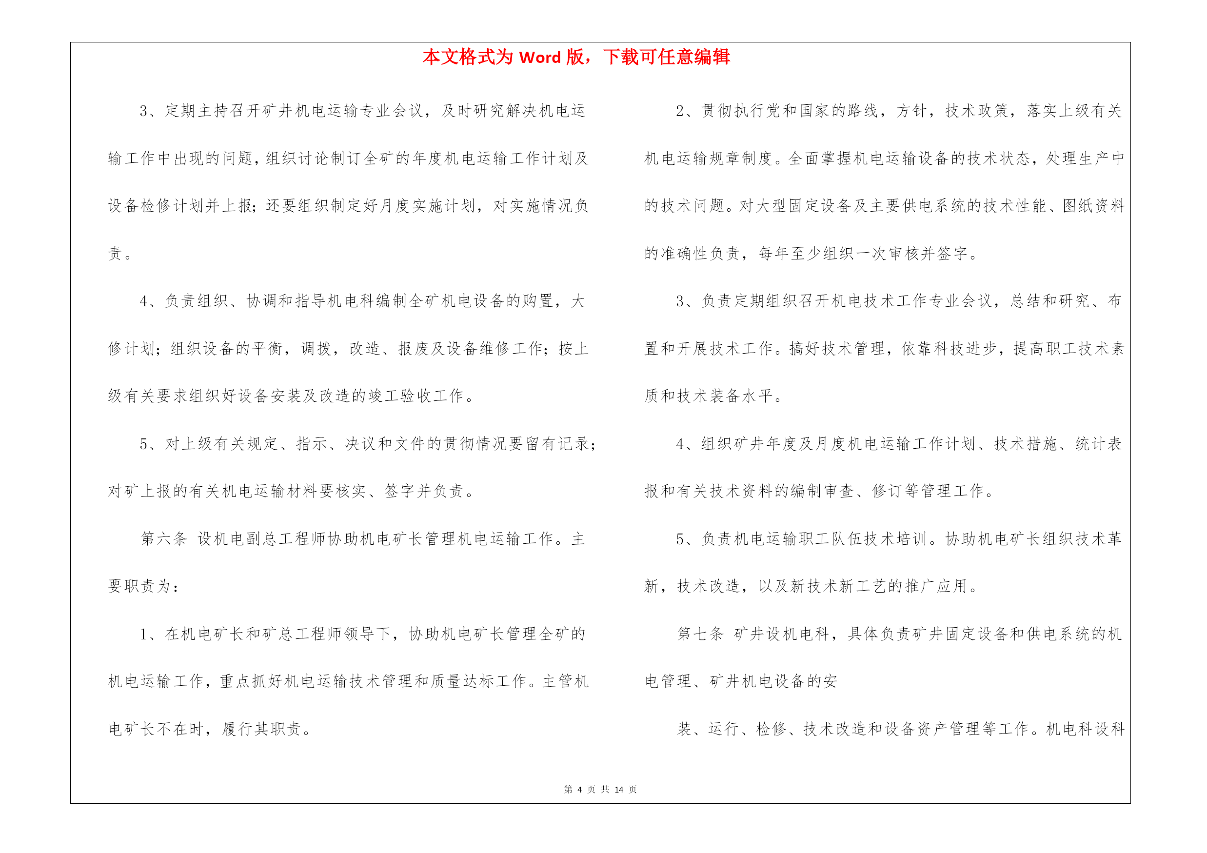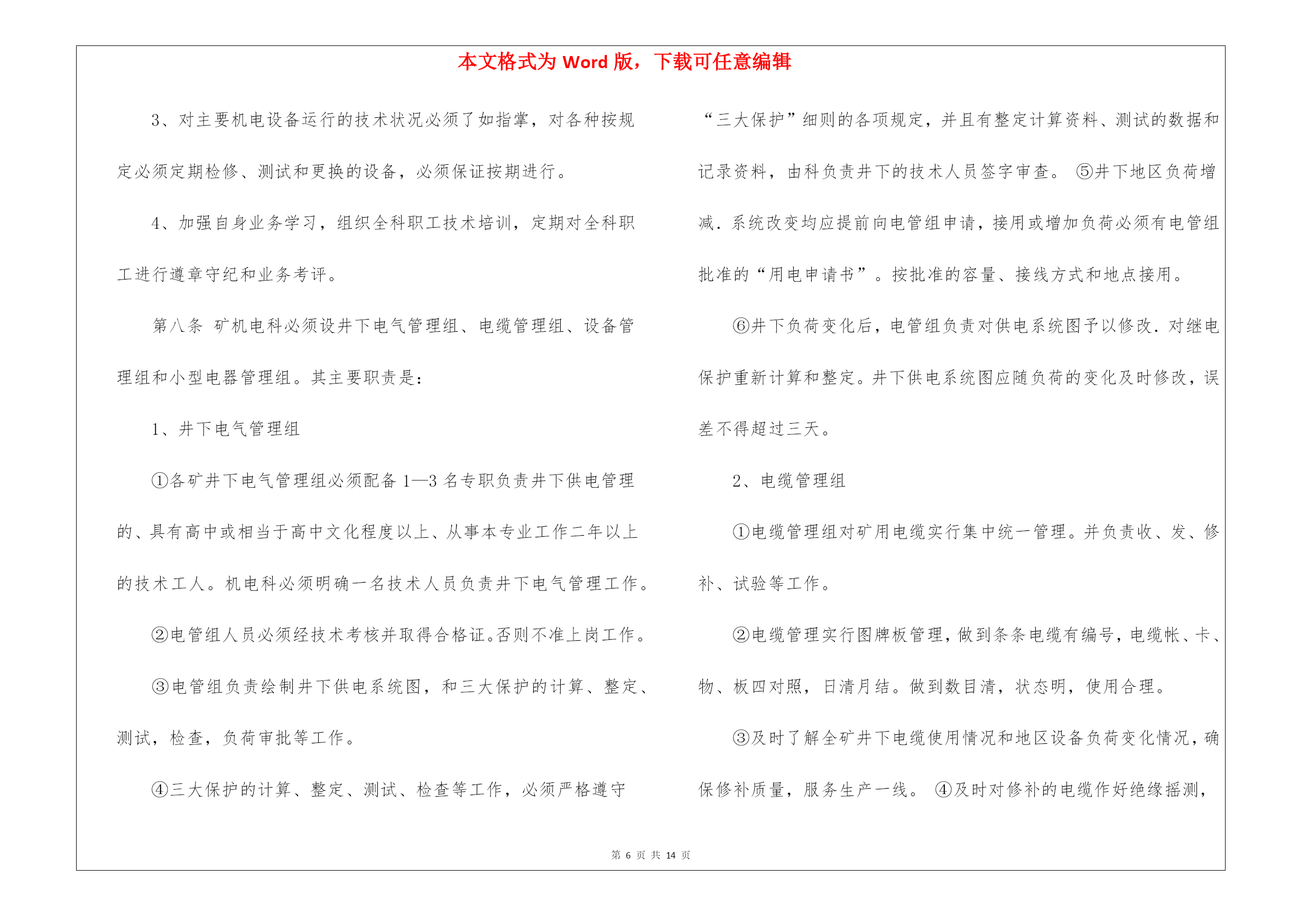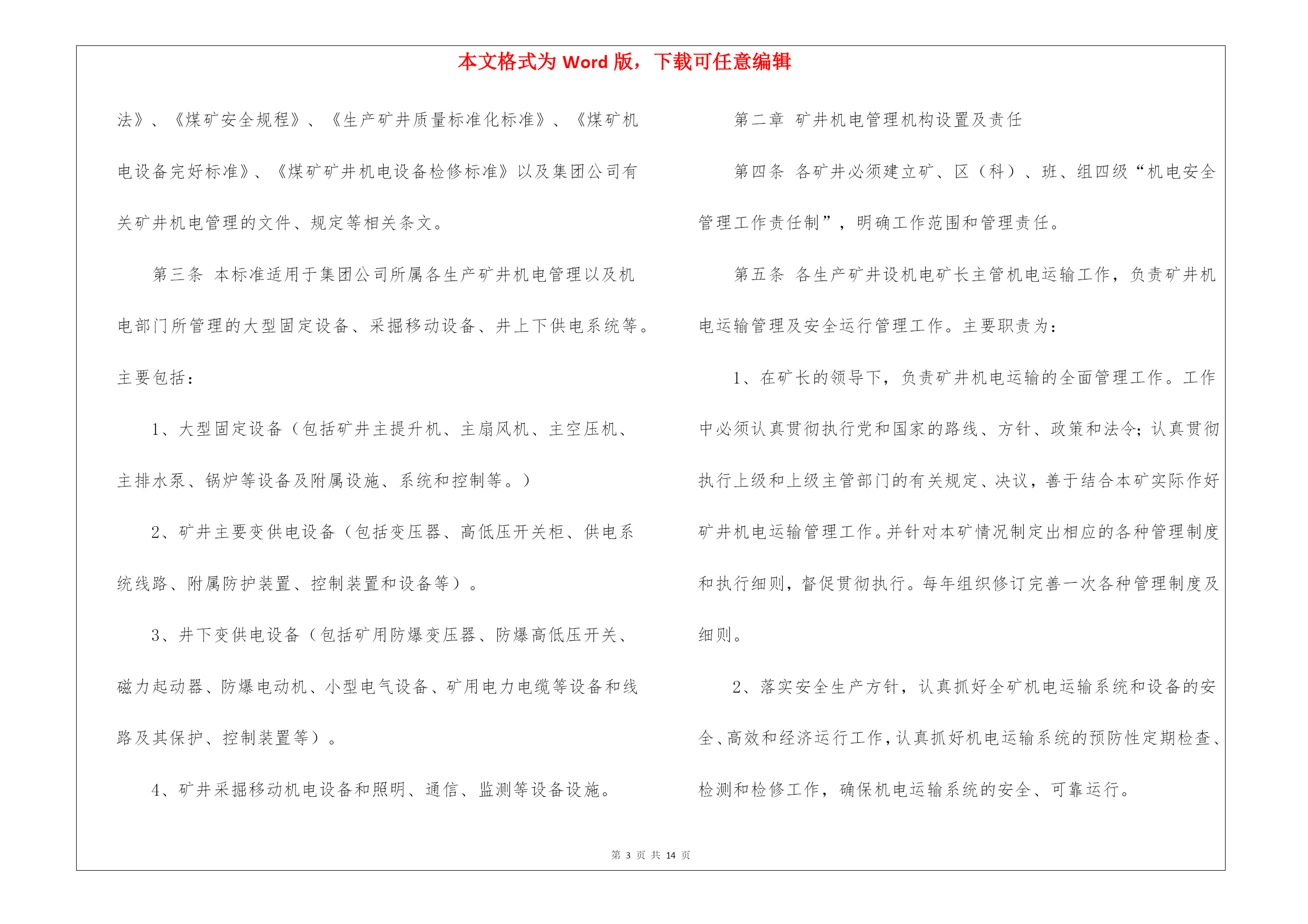 本文格式为Word版,下载可任意编辑第PAGE\*MERGEFORMAT14页共NUMPAGES\*MERGEFORMAT14页机电年度工作计划三篇机电年度工作计划三篇日子如同白驹过隙,不经意间,相信大家对即将到来的工作生活满心期待吧!该好好计划一下接下来的工作了!相信大家又在为写计划犯愁了?以下是我为大家编写的机电年度工作计划3篇,仅供参考,希望能够帮助到大家。机电年度工作计划篇1一、总则为加快机电系统安全、快捷、高效运行,提高设备运行率、减少损失、增大设备使用年限,提高设备重复利用率,提高机电人员安全操作水平,加强机电完好标准,加大设备检修规范,为实现安全本质性矿井打下坚实基础。二、运行管理计划1、人力资源管理人是社会发展的第一要素,现代企业竞争,最终是人力资源的竞争。现代煤矿已经有过去的手镐落煤采煤工艺改为综合机械化采煤和综合机械连续采煤工艺,煤矿机电工人在以后煤矿生产中将起到巨大推动作用。加强机电职工归属感,责任感是机电系统重中之中,通过聘用机电技师工作。机电职工月度评先工作,机电职工内部比武提高机电职工责任感。通过技术培训工作提高职工安全素质,操作技能,通过对机电职工节能改造工作的表扬和奖励,对机电职工责任感和荣誉感的认可,提高机电职工的工作积极性和责任心。2、加强设备管理“工欲善其事,必先利其器,君若利其器,首当顺其治”讲的是企业要保持最强的核心竞争能力,必须要有先进的设备,要让先进的设备流畅运行,发挥最大功效,必须要实施最优秀的管理。设备管理的创新、模式创新让设备管理成为煤矿安全、高效生产的推进器。计划对机电进一步设备维护标准,计划出台机电设备完好标准、机电设备检修规范,机电设备硐室质量达标、。3、加强技术管理加强机电技术管理,加强采面掘进供电先设计后施工,在验收的程序。加强运输技术管理工作,加强运输系统的先设计,后施工,运输维护质量。4、加强质量标准化建设对机电硐室机电质量标准化,实现地面变电所,井下变电所、锅炉房、通风机房、空压机房、水泵房、以及机电系统质量标准化、运输系统质量标准化。三、计划实施目标1、通过人力资源的管理加强企业职工凝聚力,向心力、提高机电职工的工作积极性,工作归属感。2、加强设备管理,提高设备的利用率,杜绝井下机电设备失爆现象,提高设备完好率,延长机电设备使用寿命。3、加强机电技术管理提高机电管理安全管理意识,加强机电工程技术保障能力,提高机电设备抗矿井灾害的能力。4、通过机电质量标准化的而建设,为实现矿井生产安全质量标准化,为小河一矿实现“五优”矿井打下夯实基础,为实现安全本质性矿井实现。第一章总则第一条煤矿机电管理工作是煤炭生产管理中的基础工作。它牵扯和影响到煤炭生产的多个环节,直接影响矿井生产安全和任务的完成。矿井机电设备种类多,线长面广,移动性大,管理工作任务繁重且责任重大;矿井机电工作技术性强、业务范围广,全面管好、用好、修好机电设备,是矿井生产安全和经济运行的首要保证;建立健全管理机构,加强领导是搞好矿井机电工作的基本保证。第二条本标准制定的依据为:《安全生产法》、《矿山安全法》、《煤矿安全规程》、《生产矿井质量标准化标准》、《煤矿机电设备完好标准》、《煤矿矿井机电设备检修标准》以及集团公司有关矿井机电管理的文件、规定等相关条文。第三条本标准适用于集团公司所属各生产矿井机电管理以及机电部门所管理的大型固定设备、采掘移动设备、井上下供电系统等。主要包括:1、大型固定设备(包括矿井主提升机、主扇风机、主空压机、主排水泵、锅炉等设备及附属设施、系统和控制等。)2、矿井主要变供电设备(包括变压器、高低压开关柜、供电系统线路、附属防护装置、控制装置和设备等)。3、井下变供电设备(包括矿用防爆变压器、防爆高低压开关、磁力起动器、防爆电动机、小型电气设备、矿用电力电缆等设备和线路及其保护、控制装置等)。4、矿井采掘移动机电设备和照明、通信、监测等设备设施。第二章矿井机电管理机构设置及责任第四条各矿井必须建立矿、区(科)、班、组四级“机电安全管理工作责任制”,明确工作范围和管理责任。第五条各生产矿井设机电矿长主管机电运输工作,负责矿井机电运输管理及安全运行管理工作。主要职责为:1、在矿长的领导下,负责矿井机电运输的全面管理工作。工作中必须认真贯彻执行党和国家的路线、方针、政策和法令;认真贯彻执行上级和上级主管部门的有关规定、决议,善于结合本矿实际作好矿井机电运输管理工作。并针对本矿情况制定出相应的各种管理制度和执行细则,督促贯彻执行。每年组织修订完善一次各种管理制度及细则。2、落实安全生产方针,认真抓好全矿机电运输系统和设备的安全、高效和经济运行工作,认真抓好机电运输系统的预防性定期检查、检测和检修工作,确保机电运输系统的安全、可靠运行。3、定期主持召开矿井机电运输专业会议