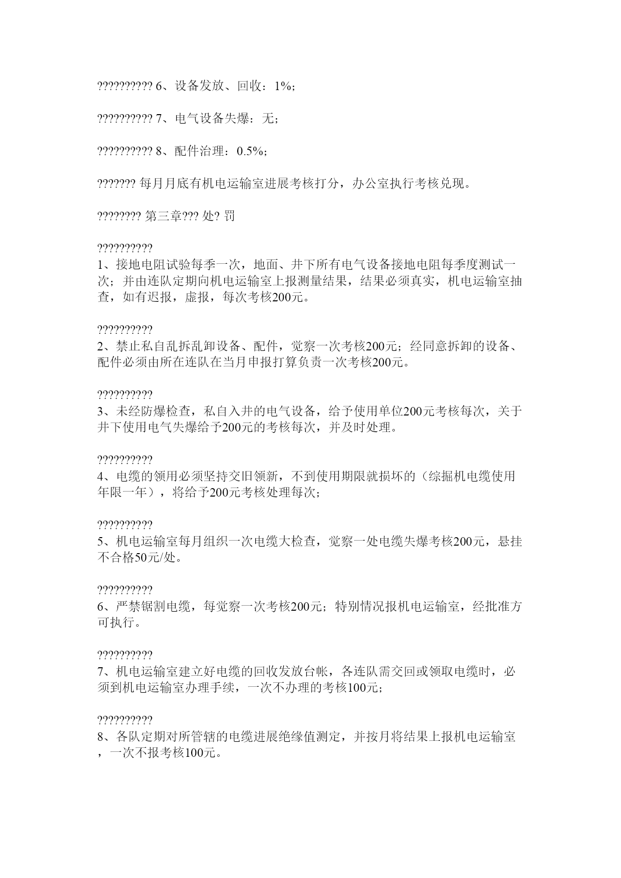 机电运输平安考核细那么第一章???总?那么???????本方法制定的按照为:《平安消费法》、《矿山平安法》、《煤矿平安规程》、《消费矿井质量标准化标准》、《煤矿机电设备完好标准》、《煤矿矿井机电设备检修标准》以及集团对矿井机电治理的文件、规定等相关条文。???????本方法适用与煤矿所属各单位机电治理以及大型固定设备、采掘挪动设备、供电设备、井上下供电系统、各类机电平安保护系统、计量器具、特种设备等。???????第二章???执?行?????????一、我矿矿成立机电治理考核领导小组,小组成员如下:???????组长:矿长???????副组长:机电副矿长???????成?员:各科队治理人员???????机电治理考核领导小组下设办公室,办公室设在机电运输办公室。???????二、?办公室的职责:全面负责组织全矿机电运输治理工作的开展,及时协调处理各区队的机电运输征询题,做好检查、监视和考核工作,提高机电运输系统的可靠性,确保机电运输质量标注化达标。???????三、?机电设备治理进展月考核,机电治理工作其指标分配如下:??????????1、设备完好情况:2%;??????????2、各项机电平安保护:2%;??????????3、点检定修工作:2%;??????????4、设备事故、缺点、误产情况:1%;??????????5、设备治理工作:1%;??????????6、设备发放、回收:1%;??????????7、电气设备失爆:无;??????????8、配件治理:0.5%;???????每月月底有机电运输室进展考核打分,办公室执行考核兑现。????????第三章???处?罚??????????1、接地电阻试验每季一次,地面、井下所有电气设备接地电阻每季度测试一次;并由连队定期向机电运输室上报测量结果,结果必须真实,机电运输室抽查,如有迟报,虚报,每次考核200元。??????????2、禁止私自乱拆乱卸设备、配件,觉察一次考核200元;经同意拆卸的设备、配件必须由所在连队在当月申报打算负责一次考核200元。??????????3、未经防爆检查,私自入井的电气设备,给予使用单位200元考核每次,关于井下使用电气失爆给予200元的考核每次,并及时处理。??????????4、电缆的领用必须坚持交旧领新,不到使用期限就损坏的(综掘机电缆使用年限一年),将给予200元考核处理每次;??????????5、机电运输室每月组织一次电缆大检查,觉察一处电缆失爆考核200元,悬挂不合格50元/处。??????????6、严禁锯割电缆,每觉察一次考核200元;特别情况报机电运输室,经批准方可执行。??????????7、机电运输室建立好电缆的回收发放台帐,各连队需交回或领取电缆时,必须到机电运输室办理手续,一次不办理的考核100元;??????????8、各队定期对所管辖的电缆进展绝缘值测定,并按月将结果上报机电运输室,一次不报考核100元。??????????9、有五小电气,各队都必须有专职或兼职负责人,进展日常治理、维护,并及时回收退下来的五小电气,并分类整齐的存放在本队的库房内,以备再用,同时建立台帐,进展记录,否那么井下每觉察一次考核100元。??????????10、领用小型电气一律采纳交旧领新制度,材料办严格把关,不交旧不予发新,如未交旧发放新的,一经查出,给予200元的考核处理,并在24小时内交旧。??????????11、各队使用的油脂必须按规定摆放整齐,标示明晰,油脂摆放地点必须保证洁净整齐,要有足够数量的灭火器,沙箱等防火器材,缺一项或不合格考核100元。??????????12、各种加油桶不得混用,油桶必须加盖,加油桶每次装油前都要清洗洁净,不得有任何杂物,如加油桶混用一次考核100元,桶不洁净一次考核50元,如不按规定加油造成机电设备出现缺点一次考核500元,加油桶不加盖一次考核50元。??????????13、工作面油桶摆放数量最多不能超过5个,综掘队不得超过3个,多一个考核100元。??????????14、综掘机加油,在用油必须通过滤油机过滤,否那么不得使用,如在用油不过滤使用一次考核100元。??????????15、加油前必须做好防护工作,每次加油,更换油必须在设备上搭装不小于5m2的防护棚,以保护设备开盖后,不得掉进煤块等杂物,必须清扫洁净采煤机等设备上的杂物,用水管冲洗洁净加油设备后,用大布擦净设备,以防油、水、煤混合,否那么一次考核100元,如不搭防护棚,掉进煤等杂物,造成设备出现缺点一次考核200元。??????????16、人为的浪费油脂,按油价的