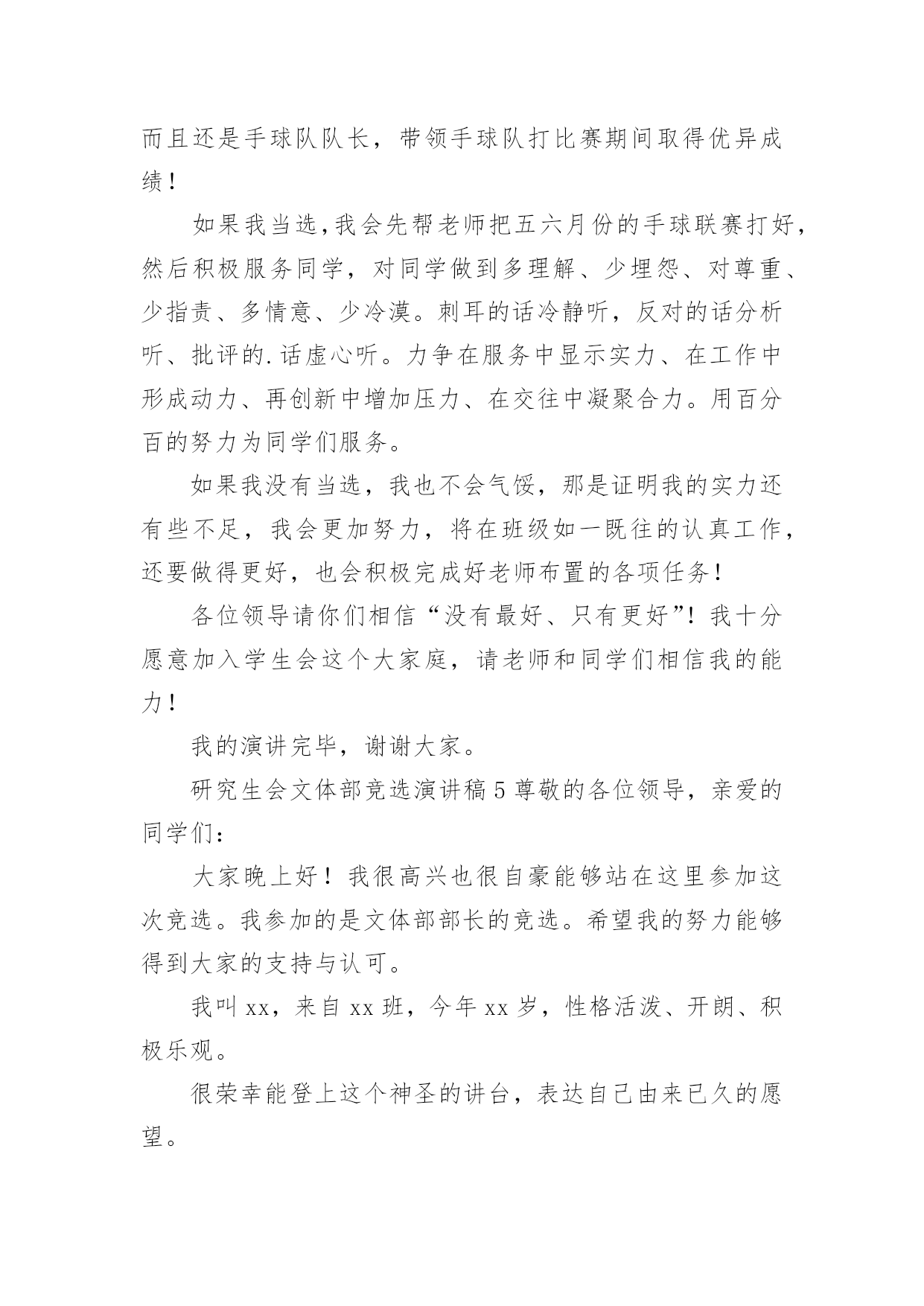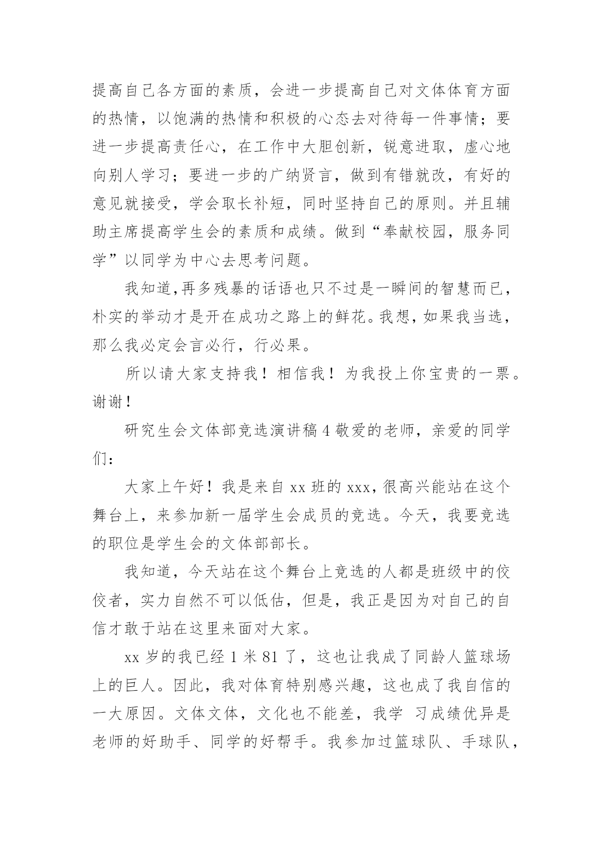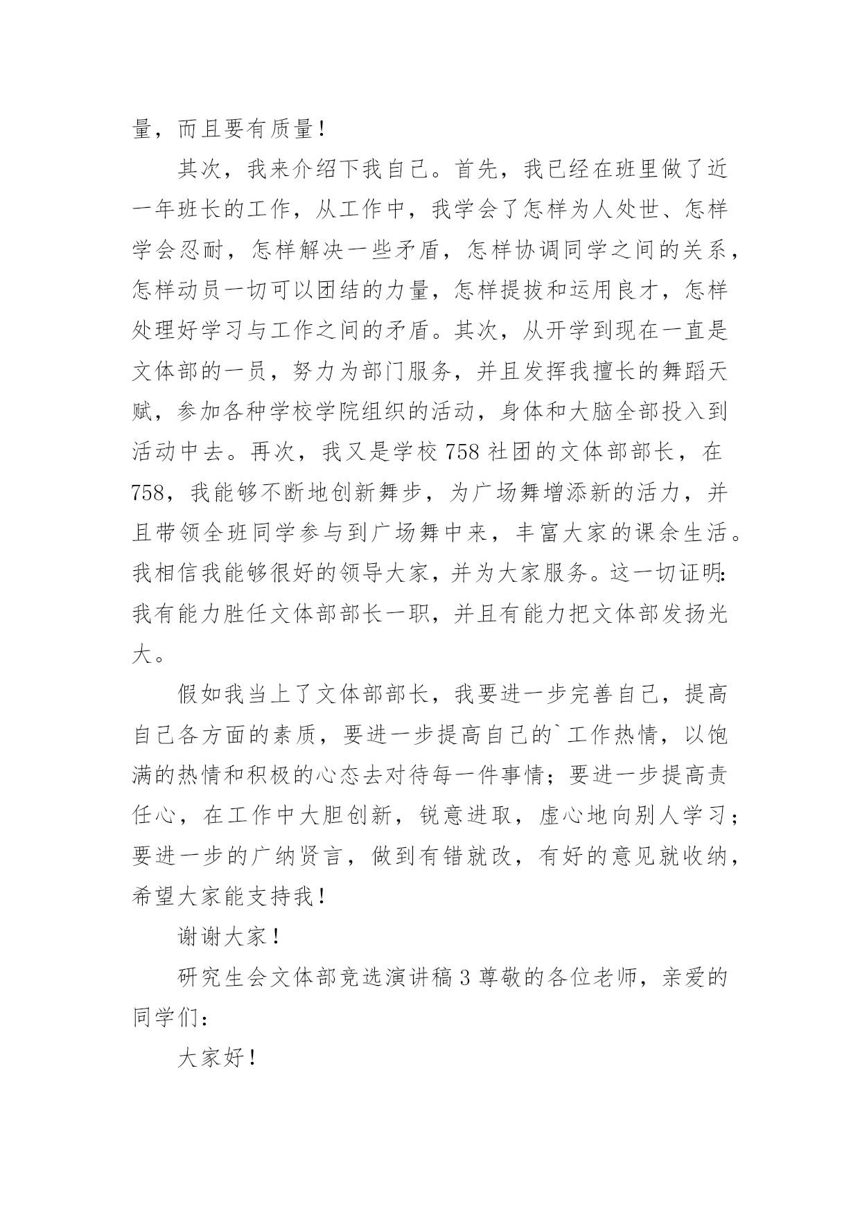 研究生会文体部竞选演讲稿研究生会文体部竞选演讲稿(精选5篇)演讲稿可以提高演讲人的自信心,有助发言人更好地展现自己。在生活中,我们可以使用演讲稿的机会越来越多,怎么写演讲稿才能避免踩雷呢?下面是小编收集整理的研究生会文体部竞选演讲稿(精选5篇),欢迎大家分享。研究生会文体部竞选演讲稿1亲爱的老师,同学们:大家好,我是文体部副部xx,首先感谢大家给了这次机会站在这里,我觉得非常的荣幸,今天我竞选的职位是文体部部长。正如大家所见,这就是我:活泼外向,直率真诚,热情洋溢,无时无刻不充满干劲!有话直说就是我的风格!过去的两年里,我参加了很多的活动,可以说,我活跃在学校或学院的各个舞台上,这一路走来,不能说是鲜花满地,但起码我们都收获了披荆斩棘后的快乐和喜悦。我作为本届唯一一个在文体部呆了两年的人,我付出了很多,有汗水,有泪水,但是我也成长了很多,得到了很多,明白了什么是目标,什么是责任,什么是拼搏,什么是奉献,什么是团结,从部员到副部,我熟悉文体部处事的各个流程,部内各个职位的工作特点,组织,策划,协调的能力都得到了很大的提升,培养了责任感和荣誉感,得到了部员和同学的支持和信任,使得自己现在在文体部的各项工作中如鱼得水。而这次参加文体部部长的竞选,对我本身来说可以说是一次不小的挑战,是对我的一种锻炼和考验。大家精彩的演讲给了我不少的压力,然面对这样的压力,我只能尽力去争取,无论成功与失败,我要做到的只是无愧于己,无愧于心,当然我也会迎难而上,用我的表现来争取大家的鼓励和支持。学生会文体部是一个代表学生的团体,是让每个学生施展自己才华、才艺的舞台。因此我热爱文体部,为身为其中的`一员而自豪。一届一届的传承,正是希望的延续。如果我竞选成功,成为下一届文体部部长,我会从各方面来完善文体部的各项工作。比如说推陈出新,面对多元化的校园,文体部现在表演的形式还很单一,节目也经常重复表演,同学们多少失去了一些新鲜感和激情,所以在今后节目的策划与实施中,要有大胆的创新精神,并且要多有一些体现历史学院特色的节目。然后也要增进部内部员,副部,部长之间的友谊,多交流多沟通,共同努力来使文体部变的越来越好。同时如果我竞选成功,我也会进一步的完善自己,提高自己各方面的能力,希望是自信的动力,自信是成功的源泉。我一定会以饱满,热情,积极的心态去对待文体部的每一份工作,将自己的能力和特长充分发挥。文体部的工作离不开生活部和宣传部,还有社会实践部的帮助,谢谢他们,还有谢谢老师,谢谢保哥,谷哥,楠姐,谢谢我的部长,谢谢一直支持我的亲爱的部员,当然,更谢谢在座的每一位积极参加文体活动的同学,谢谢你们的辛苦参与和付出,谢谢你们。我一直相信青春是一抹亮丽的暖色,是文体部给了我尽情挥洒的舞台,我想要留下来。我也相信年少没有失败,挑战无处不在。各位老师,各位同学,如果你们选择相信我,支持我,请把你们珍贵的一票投给我,我一定在其位,谋其职,尽其力,不会让大家失望,谢谢!研究生会文体部竞选演讲稿2尊敬的各位领导、老师,亲爱的同学们:大家好!首先感谢大家的支持与学校提供这次机会,使我能参与竞争。我是来自xx班的xxx。性格活泼开朗,处事沉着、果断,能够顾全大局。今天我很荣幸地站在这里表达自己由来已久的愿望:“我要竞选文体部部长。”我在这里郑重承诺:“我将尽全力完成学校领导和同学们交给我的任务,使文体部成为一个现代化的积极团体,成为学校的得力助手和同学们信赖的组织。”首先,我要先说下我对文体部的理解。从广义上说,文体部是一个代表学生的团体,让每个学生施展自己才华的舞台,具体来说,文体部通过组织丰富多彩的活动来充实同学们的课余生活。但是,我们仍要遵循三点原则:一、玩不能忘本,学生的本性就是学习,不能茺废学业;二、我们要玩出档次,玩出水平,要玩得有意义,不能玩过之后毫无收获,那样就纯粹是浪费时间。三、就是要玩得尽兴,一旦文体部组织的活动再也无法引起同学们的`兴趣,那文体部就失去了它的存在的价值,因此文体部要善于把握学生的心理,组织的活动不仅要有数量,而且要有质量!其次,我来介绍下我自己。首先,我已经在班里做了近一年班长的工作,从工作中,我学会了怎样为人处世、怎样学会忍耐,怎样解决一些矛盾,怎样协调同学之间的关系,怎样动员一切可以团结的力量,怎样提拔和运用良才,怎样处理好学习与工作之间的矛盾。其次,从开学到现在一直是文体部的一员,努力为部门服务,并且发挥我擅长的舞蹈天赋,参加各种学校学院组织的活动,身体和大脑全部投入到活动中去。再次,我又是学校758社团的文体部部长,在758,我能够不断地创新舞步,为广场舞增添新的活力,并且带领全班同学参与到广场舞中来,丰富大家的课余生活。我相信我能够很好的领导大家,并为大家服务。这一切证明:我有能力胜任文体部部长一职,并且有能力把文体部发扬光大。假如我