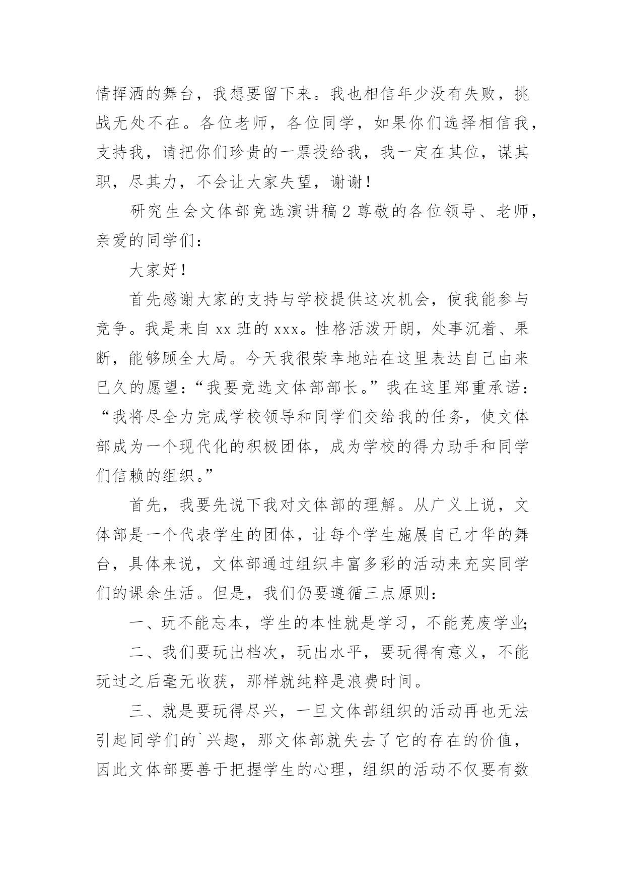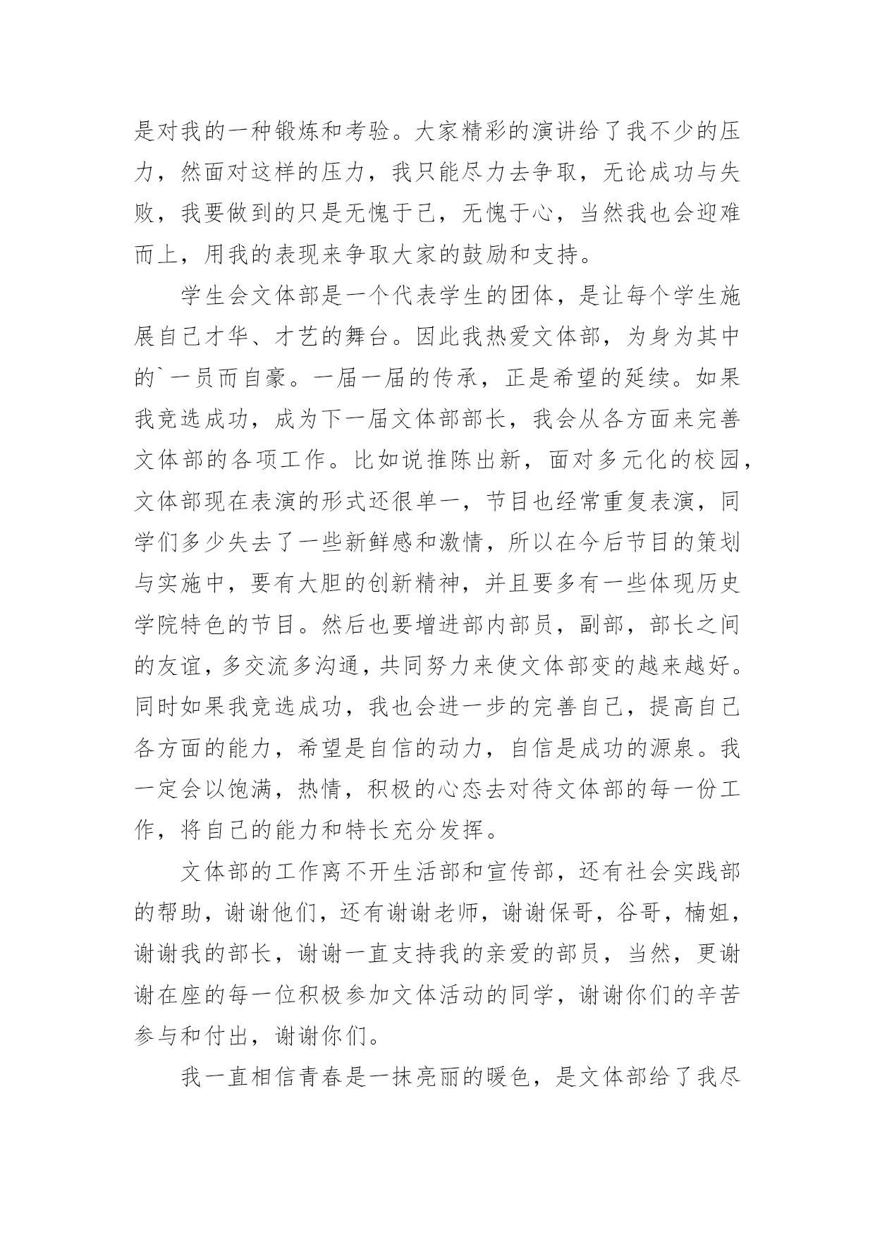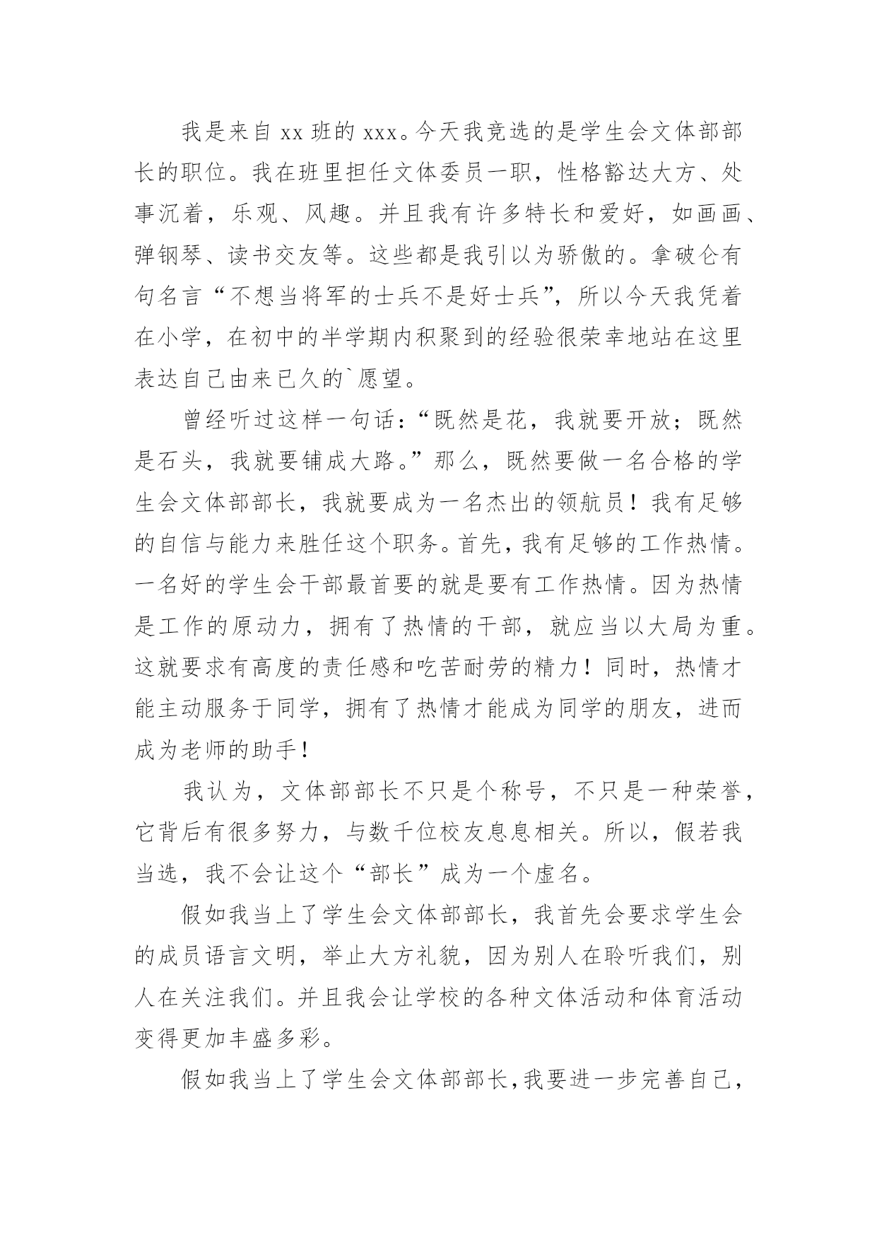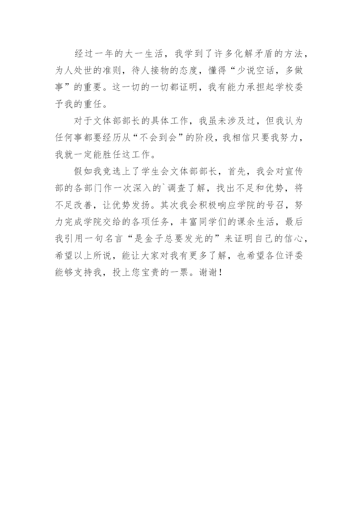 研究生会文体部竞选演讲稿研究生会文体部竞选演讲稿(精选5篇)演讲稿可以提高演讲人的自信心,有助发言人更好地展现自己。在生活中,我们可以使用演讲稿的机会越来越多,怎么写演讲稿才能避免踩雷呢?下面是小编收集整理的研究生会文体部竞选演讲稿(精选5篇),欢迎大家分享。研究生会文体部竞选演讲稿1亲爱的老师,同学们:大家好,我是文体部副部xx,首先感谢大家给了这次机会站在这里,我觉得非常的荣幸,今天我竞选的职位是文体部部长。正如大家所见,这就是我:活泼外向,直率真诚,热情洋溢,无时无刻不充满干劲!有话直说就是我的风格!过去的两年里,我参加了很多的活动,可以说,我活跃在学校或学院的各个舞台上,这一路走来,不能说是鲜花满地,但起码我们都收获了披荆斩棘后的快乐和喜悦。我作为本届唯一一个在文体部呆了两年的人,我付出了很多,有汗水,有泪水,但是我也成长了很多,得到了很多,明白了什么是目标,什么是责任,什么是拼搏,什么是奉献,什么是团结,从部员到副部,我熟悉文体部处事的各个流程,部内各个职位的工作特点,组织,策划,协调的能力都得到了很大的提升,培养了责任感和荣誉感,得到了部员和同学的支持和信任,使得自己现在在文体部的各项工作中如鱼得水。而这次参加文体部部长的竞选,对我本身来说可以说是一次不小的挑战,是对我的一种锻炼和考验。大家精彩的演讲给了我不少的压力,然面对这样的压力,我只能尽力去争取,无论成功与失败,我要做到的只是无愧于己,无愧于心,当然我也会迎难而上,用我的表现来争取大家的鼓励和支持。学生会文体部是一个代表学生的团体,是让每个学生施展自己才华、才艺的舞台。因此我热爱文体部,为身为其中的`一员而自豪。一届一届的传承,正是希望的延续。如果我竞选成功,成为下一届文体部部长,我会从各方面来完善文体部的各项工作。比如说推陈出新,面对多元化的校园,文体部现在表演的形式还很单一,节目也经常重复表演,同学们多少失去了一些新鲜感和激情,所以在今后节目的策划与实施中,要有大胆的创新精神,并且要多有一些体现历史学院特色的节目。然后也要增进部内部员,副部,部长之间的友谊,多交流多沟通,共同努力来使文体部变的越来越好。同时如果我竞选成功,我也会进一步的完善自己,提高自己各方面的能力,希望是自信的动力,自信是成功的源泉。我一定会以饱满,热情,积极的心态去对待文体部的每一份工作,将自己的能力和特长充分发挥。文体部的工作离不开生活部和宣传部,还有社会实践部的帮助,谢谢他们,还有谢谢老师,谢谢保哥,谷哥,楠姐,谢谢我的部长,谢谢一直支持我的亲爱的部员,当然,更谢谢在座的每一位积极参加文体活动的同学,谢谢你们的辛苦参与和付出,谢谢你们。我一直相信青春是一抹亮丽的暖色,是文体部给了我尽情挥洒的舞台,我想要留下来。我也相信年少没有失败,挑战无处不在。各位老师,各位同学,如果你们选择相信我,支持我,请把你们珍贵的一票投给我,我一定在其位,谋其职,尽其力,不会让大家失望,谢谢!研究生会文体部竞选演讲稿2尊敬的各位领导、老师,亲爱的同学们:大家好!首先感谢大家的支持与学校提供这次机会,使我能参与竞争。我是来自xx班的xxx。性格活泼开朗,处事沉着、果断,能够顾全大局。今天我很荣幸地站在这里表达自己由来已久的愿望:“我要竞选文体部部长。”我在这里郑重承诺:“我将尽全力完成学校领导和同学们交给我的任务,使文体部成为一个现代化的积极团体,成为学校的得力助手和同学们信赖的组织。”首先,我要先说下我对文体部的理解。从广义上说,文体部是一个代表学生的团体,让每个学生施展自己才华的舞台,具体来说,文体部通过组织丰富多彩的活动来充实同学们的课余生活。但是,我们仍要遵循三点原则:一、玩不能忘本,学生的本性就是学习,不能茺废学业;二、我们要玩出档次,玩出水平,要玩得有意义,不能玩过之后毫无收获,那样就纯粹是浪费时间。三、就是要玩得尽兴,一旦文体部组织的活动再也无法引起同学们的`兴趣,那文体部就失去了它的存在的价值,因此文体部要善于把握学生的心理,组织的活动不仅要有数量,而且要有质量!其次,我来介绍下我自己。首先,我已经在班里做了近一年班长的工作,从工作中,我学会了怎样为人处世、怎样学会忍耐,怎样解决一些矛盾,怎样协调同学之间的关系,怎样动员一切可以团结的力量,怎样提拔和运用良才,怎样处理好学习与工作之间的矛盾。其次,从开学到现在一直是文体部的一员,努力为部门服务,并且发挥我擅长的舞蹈天赋,参加各种学校学院组织的活动,身体和大脑全部投入到活动中去。再次,我又是学校758社团的文体部部长,在758,我能够不断地创新舞步,为广场舞增添新的活力,并且带领全班同学参与到广场舞中来,丰富大家的课余生活。我相信我能够很好的领导大家,并为大家服务。这一切证明:我有能力胜任文体部部长一职,并且有能力把文体部发扬光大。假如我