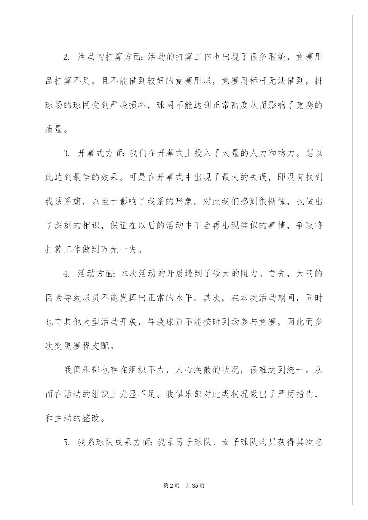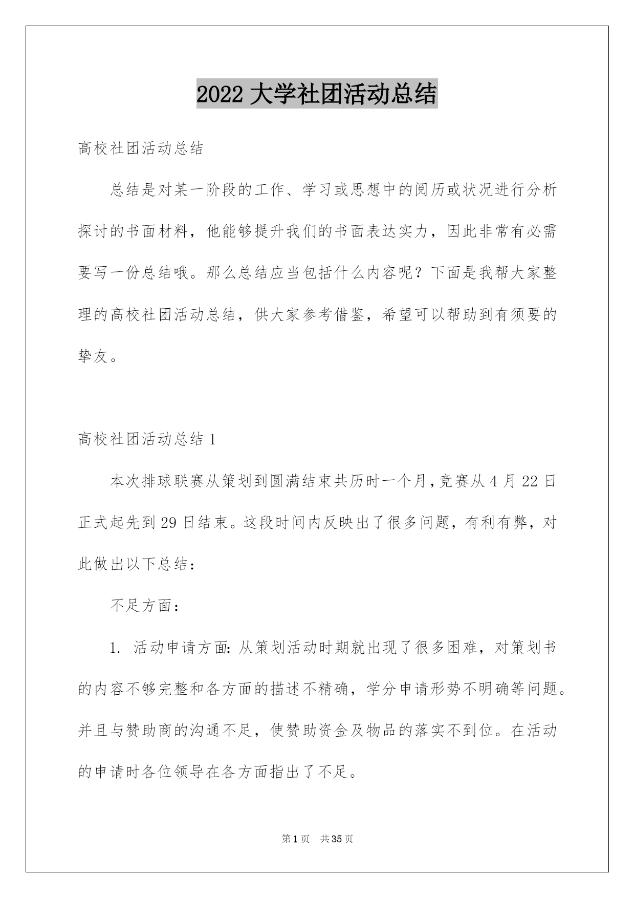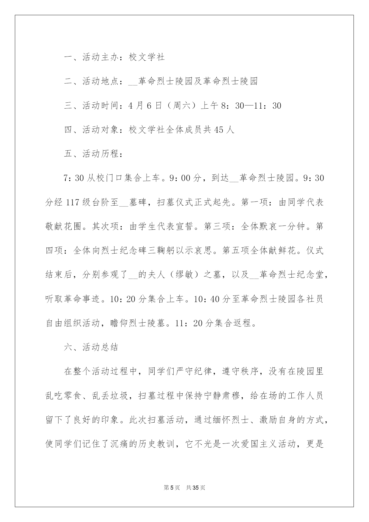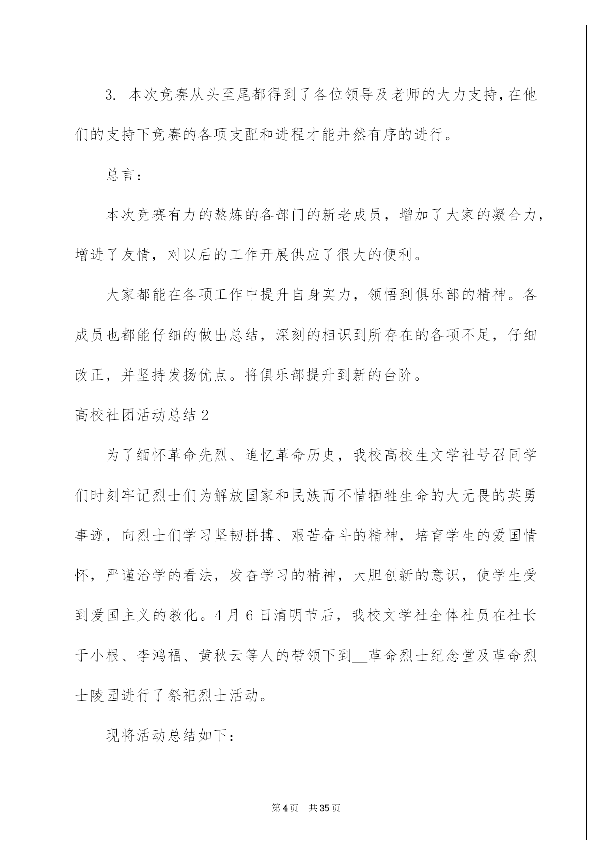 第PAGE\*Arabic\*MERGEFORMAT35页共NUMPAGES\*Arabic\*MERGEFORMAT35页第PAGE\*MERGEFORMAT35页共NUMPAGES\*MERGEFORMAT35页第PAGE\*MERGEFORMAT35页共NUMPAGES\*MERGEFORMAT35页第PAGE\*MERGEFORMAT35页共NUMPAGES\*MERGEFORMAT35页第PAGE\*MERGEFORMAT35页共NUMPAGES\*MERGEFORMAT35页第PAGE\*MERGEFORMAT35页共NUMPAGES\*MERGEFORMAT35页第PAGE\*MERGEFORMAT35页共NUMPAGES\*MERGEFORMAT35页第PAGE\*MERGEFORMAT35页共NUMPAGES\*MERGEFORMAT35页第PAGE\*MERGEFORMAT35页共NUMPAGES\*MERGEFORMAT35页第PAGE\*MERGEFORMAT35页共NUMPAGES\*MERGEFORMAT35页第PAGE\*MERGEFORMAT35页共NUMPAGES\*MERGEFORMAT35页2022大学社团活动总结高校社团活动总结总结是对某一阶段的工作、学习或思想中的阅历或状况进行分析探讨的书面材料,他能够提升我们的书面表达实力,因此非常有必需要写一份总结哦。那么总结应当包括什么内容呢?下面是我帮大家整理的高校社团活动总结,供大家参考借鉴,希望可以帮助到有须要的挚友。高校社团活动总结1本次排球联赛从策划到圆满结束共历时一个月,竞赛从4月22日正式起先到29日结束。这段时间内反映出了很多问题,有利有弊,对此做出以下总结:不足方面:1.活动申请方面:从策划活动时期就出现了很多困难,对策划书的内容不够完整和各方面的描述不精确,学分申请形势不明确等问题。并且与赞助商的沟通不足,使赞助资金及物品的落实不到位。在活动的申请时各位领导在各方面指出了不足。2.活动的打算方面:活动的打算工作也出现了很多瑕疵,竞赛用品打算不足,且不能借到较好的竞赛用球,竞赛用标杆无法借到,排球场的球网受到严峻损坏,球网不能达到正常高度从而影响了竞赛的质量。3.开幕式方面:我们在开幕式上投入了大量的人力和物力。想以此达到最佳的效果。可是在开幕式中出现了最大的失误,即没有找到我系系旗,以至于影响了我系的形象。对此我们感到很惭愧,也做出了深刻的相识,保证在以后的活动中不会再出现类似的事情,争取将打算工作做到万无一失。4.活动方面:本次活动的开展遇到了较大的阻力。首先,天气的因素导致球员不能发挥出正常的水平。其次,在本次活动期间,同时也有其他大型活动开展,导致球员不能按时到场参与竞赛,因此而多次变更赛程支配。我俱乐部也存在组织不力,人心涣散的状况,很难达到统一。从而在活动的组织上尤显不足。我俱乐部对此类状况做出了严厉指责,和主动的整改。5.我系球队成果方面:我系男子球队、女子球队均只获得其次名的成果。对此我们有不行推卸的责任。首先,在系队人员的选择上出现了不利,没有能够发觉足够的人才,导致球队战斗力不足。在前期工作中奢侈的时间太多,便没有足够的时间对球队进行系统性的训练。其次,各队员的沟通过少,默契值不足,不能正确的领悟各类战术,竞赛时无法作出有利的协作。出现了很多不应当出现的失误。便使得竞赛进行的很艰难,不能稳住领先的局面。从而导致了在决赛时的失利。对于本次竞赛的失利,我们进行了深刻的反思,也表示在以后的各类竞赛中不会重蹈覆辙,胜不骄,败不馁,将以平和的心态去面对,不能太过自负。过度自信和自满的心态也是导致本次竞赛失利的重要因素。优点方面:1.俱乐部主席、副主席及各位部长、副部长对此次联赛都尤其重视,在各个环节上都下了大量的功夫。以饱满的热忱开展各项工作,以“东道主”的形式,对待各系的参赛队伍,营造了一个良好的氛围。2.在竞赛途中没有出现争吵不休、斗殴或赛场混乱的状况。更没有任何平安事故发生。很好的保证了各队员的人身及财产平安。3.本次竞赛从头至尾都得到了各位领导及老师的大力支持,在他们的支持下竞赛的各项支配和进程才能井然有序的进行。总言:本次竞赛有力的熬炼的各部门的新老成员,增加了大家的凝合力,增进了友情,对以后的工作开展供应了很大的便利。大家都能在各项工作中提升自身实力,领悟到俱乐部的精神。各成员也都能仔细的做出总结,深刻的相识到所存在的各项不足,仔细改正,并坚持发扬优点。将俱乐部提升到新的台阶。高校社团活动总结2为了缅怀革命先烈、追忆革命历史,我校高校生文学社号召同学们