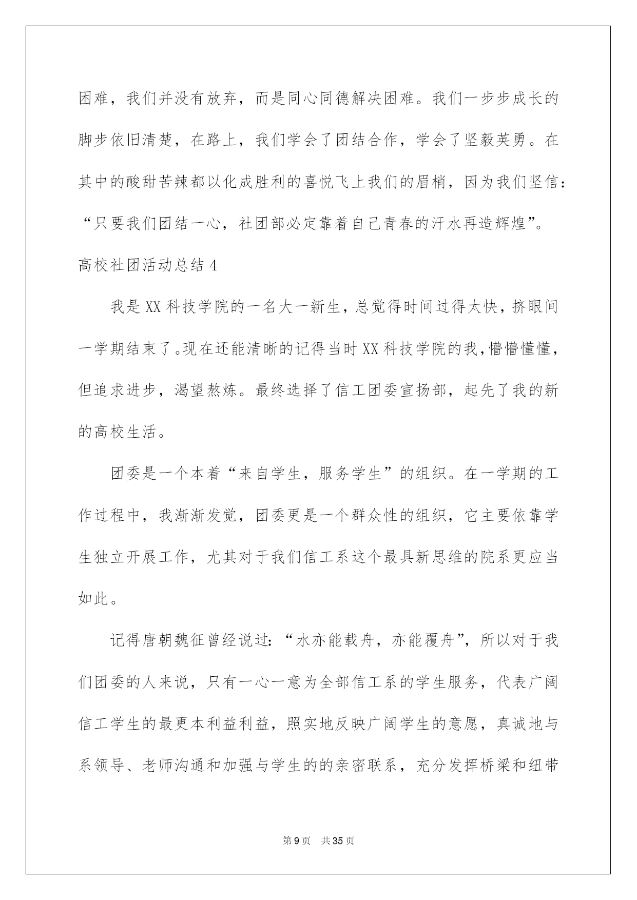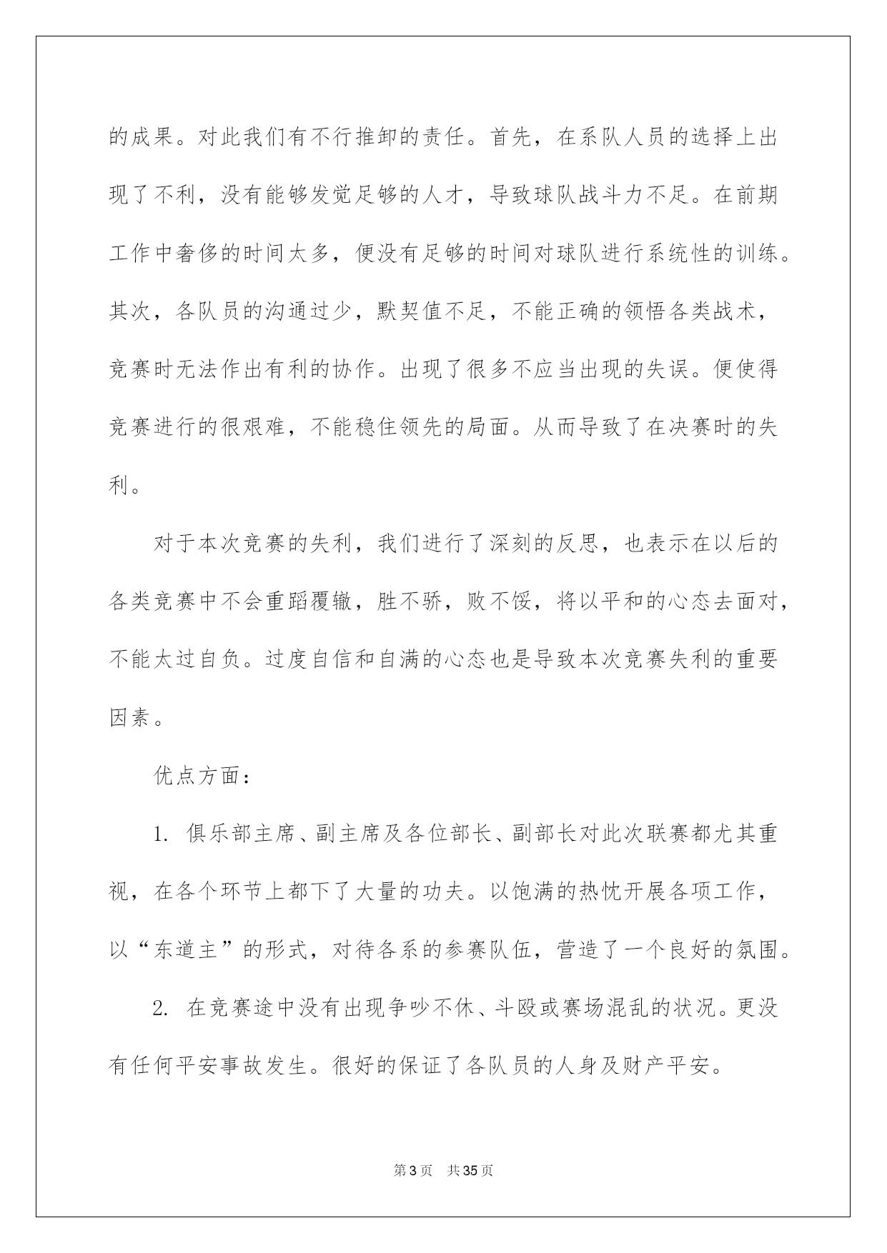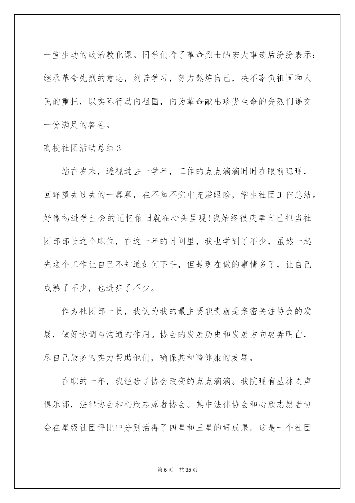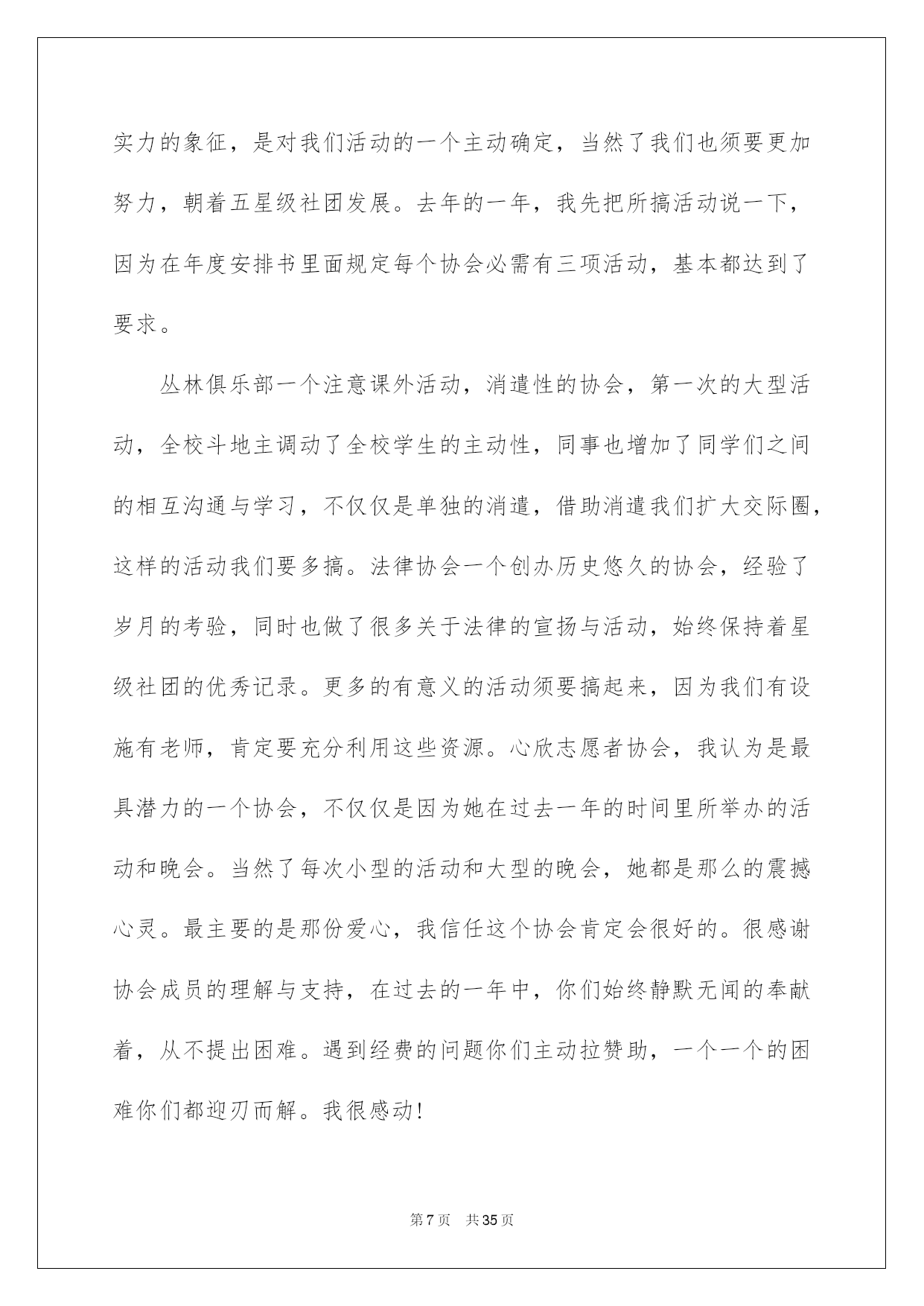 第PAGE\*Arabic\*MERGEFORMAT35页共NUMPAGES\*Arabic\*MERGEFORMAT35页第PAGE\*MERGEFORMAT35页共NUMPAGES\*MERGEFORMAT35页第PAGE\*MERGEFORMAT35页共NUMPAGES\*MERGEFORMAT35页第PAGE\*MERGEFORMAT35页共NUMPAGES\*MERGEFORMAT35页第PAGE\*MERGEFORMAT35页共NUMPAGES\*MERGEFORMAT35页第PAGE\*MERGEFORMAT35页共NUMPAGES\*MERGEFORMAT35页第PAGE\*MERGEFORMAT35页共NUMPAGES\*MERGEFORMAT35页第PAGE\*MERGEFORMAT35页共NUMPAGES\*MERGEFORMAT35页第PAGE\*MERGEFORMAT35页共NUMPAGES\*MERGEFORMAT35页第PAGE\*MERGEFORMAT35页共NUMPAGES\*MERGEFORMAT35页第PAGE\*MERGEFORMAT35页共NUMPAGES\*MERGEFORMAT35页2022大学社团活动总结高校社团活动总结总结是对某一阶段的工作、学习或思想中的阅历或状况进行分析探讨的书面材料,他能够提升我们的书面表达实力,因此非常有必需要写一份总结哦。那么总结应当包括什么内容呢?下面是我帮大家整理的高校社团活动总结,供大家参考借鉴,希望可以帮助到有须要的挚友。高校社团活动总结1本次排球联赛从策划到圆满结束共历时一个月,竞赛从4月22日正式起先到29日结束。这段时间内反映出了很多问题,有利有弊,对此做出以下总结:不足方面:1.活动申请方面:从策划活动时期就出现了很多困难,对策划书的内容不够完整和各方面的描述不精确,学分申请形势不明确等问题。并且与赞助商的沟通不足,使赞助资金及物品的落实不到位。在活动的申请时各位领导在各方面指出了不足。2.活动的打算方面:活动的打算工作也出现了很多瑕疵,竞赛用品打算不足,且不能借到较好的竞赛用球,竞赛用标杆无法借到,排球场的球网受到严峻损坏,球网不能达到正常高度从而影响了竞赛的质量。3.开幕式方面:我们在开幕式上投入了大量的人力和物力。想以此达到最佳的效果。可是在开幕式中出现了最大的失误,即没有找到我系系旗,以至于影响了我系的形象。对此我们感到很惭愧,也做出了深刻的相识,保证在以后的活动中不会再出现类似的事情,争取将打算工作做到万无一失。4.活动方面:本次活动的开展遇到了较大的阻力。首先,天气的因素导致球员不能发挥出正常的水平。其次,在本次活动期间,同时也有其他大型活动开展,导致球员不能按时到场参与竞赛,因此而多次变更赛程支配。我俱乐部也存在组织不力,人心涣散的状况,很难达到统一。从而在活动的组织上尤显不足。我俱乐部对此类状况做出了严厉指责,和主动的整改。5.我系球队成果方面:我系男子球队、女子球队均只获得其次名的成果。对此我们有不行推卸的责任。首先,在系队人员的选择上出现了不利,没有能够发觉足够的人才,导致球队战斗力不足。在前期工作中奢侈的时间太多,便没有足够的时间对球队进行系统性的训练。其次,各队员的沟通过少,默契值不足,不能正确的领悟各类战术,竞赛时无法作出有利的协作。出现了很多不应当出现的失误。便使得竞赛进行的很艰难,不能稳住领先的局面。从而导致了在决赛时的失利。对于本次竞赛的失利,我们进行了深刻的反思,也表示在以后的各类竞赛中不会重蹈覆辙,胜不骄,败不馁,将以平和的心态去面对,不能太过自负。过度自信和自满的心态也是导致本次竞赛失利的重要因素。优点方面:1.俱乐部主席、副主席及各位部长、副部长对此次联赛都尤其重视,在各个环节上都下了大量的功夫。以饱满的热忱开展各项工作,以“东道主”的形式,对待各系的参赛队伍,营造了一个良好的氛围。2.在竞赛途中没有出现争吵不休、斗殴或赛场混乱的状况。更没有任何平安事故发生。很好的保证了各队员的人身及财产平安。3.本次竞赛从头至尾都得到了各位领导及老师的大力支持,在他们的支持下竞赛的各项支配和进程才能井然有序的进行。总言:本次竞赛有力的熬炼的各部门的新老成员,增加了大家的凝合力,增进了友情,对以后的工作开展供应了很大的便利。大家都能在各项工作中提升自身实力,领悟到俱乐部的精神。各成员也都能仔细的做出总结,深刻的相识到所存在的各项不足,仔细改正,并坚持发扬优点。将俱乐部提升到新的台阶。高校社团活动总结2为了缅怀革命先烈、追忆革命历史,我校高校生文学社号召同学们