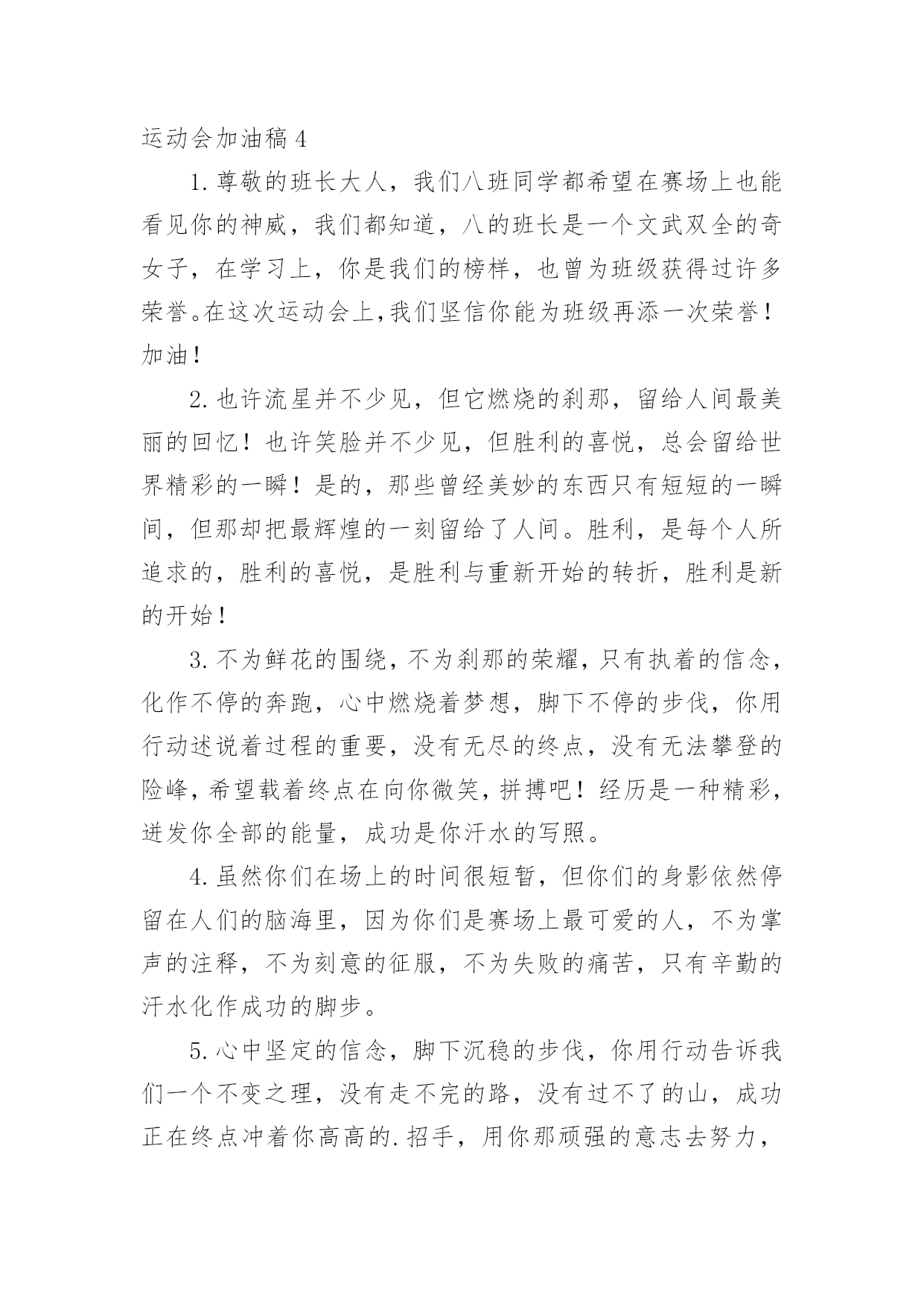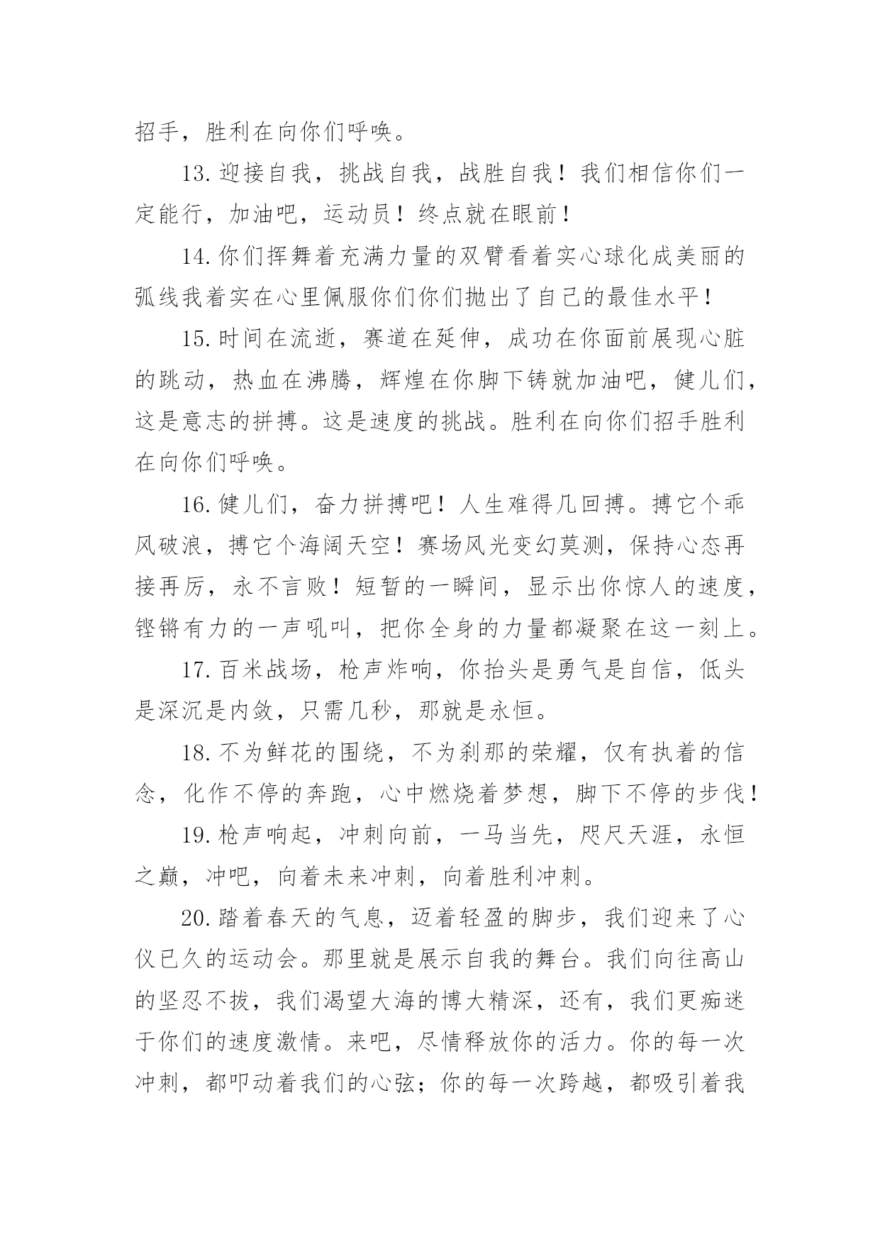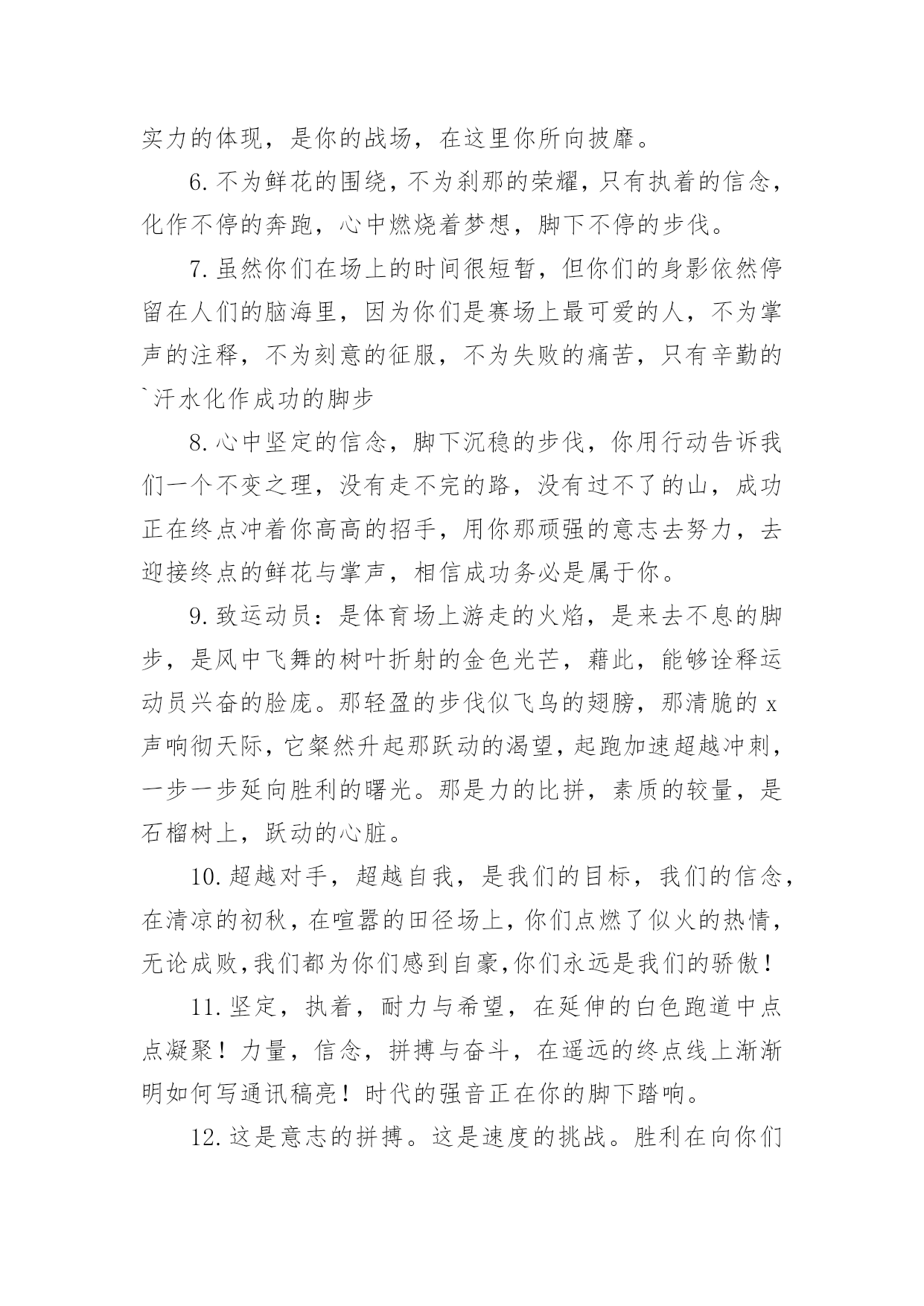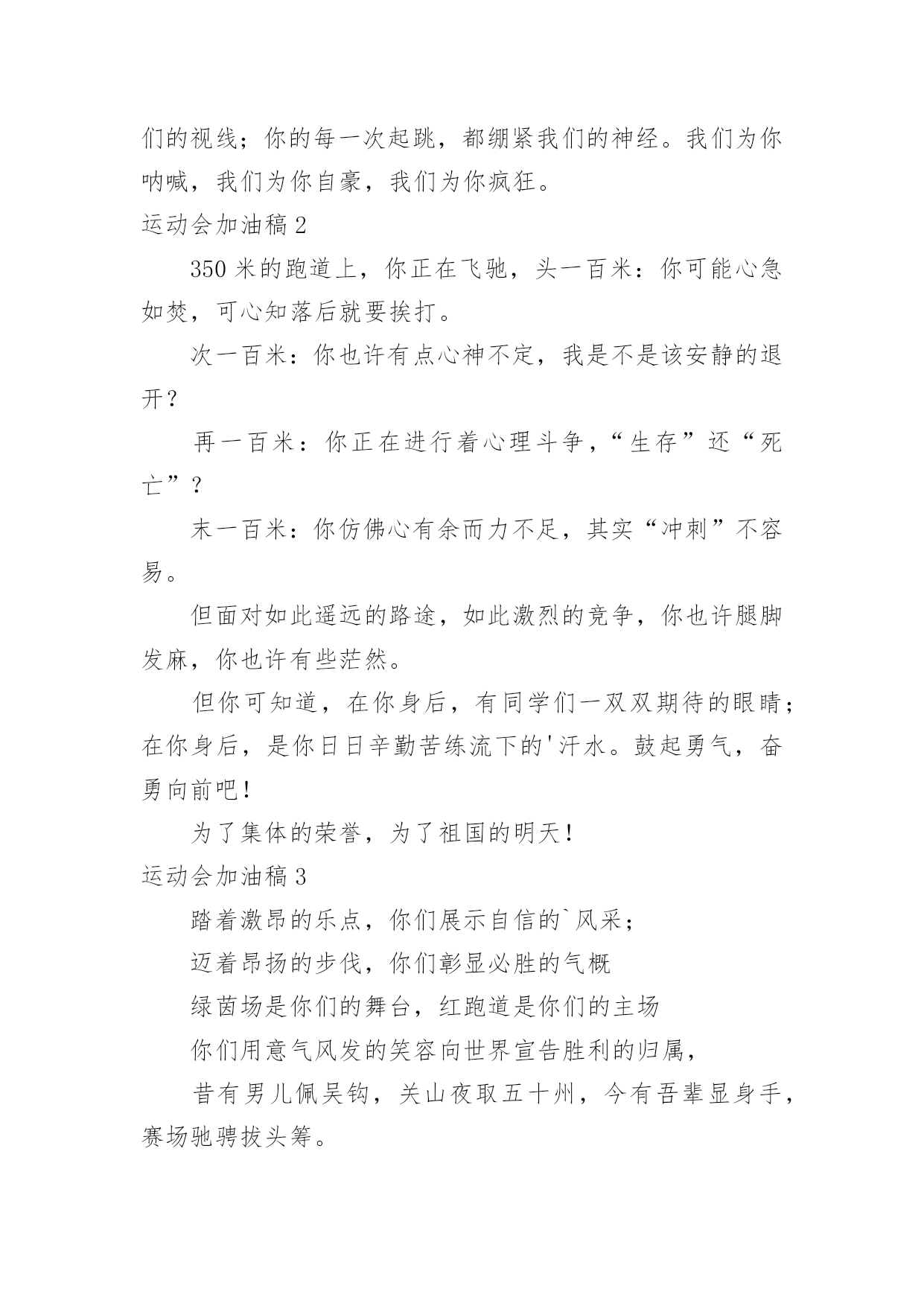 运动会加油稿【精华】运动会加油稿15篇在发展不断提速的社会中,我们越来越需要加油稿,加油稿是一种对他人有正向激励作用的文稿。写起加油稿来就毫无头绪?以下是小编精心整理的运动会加油稿,欢迎大家分享。运动会加油稿11.你赢得十分精彩,无需掩饰你的微笑,流露在你脸上。但我相信,你心中十分明白,征途刚刚开始,漫漫长路刚刚开头。加油啊,朋友,只有不断的拼搏,才可以不断战胜自己,战胜一切!向前、向前、向前!2.运动健将们,用你的实力,用你的精神,去开拓出,一片属于你的长跑天地!3.100只是一道过场,几秒钟转瞬即逝,但是这背后承载的是多少成败,加油吧,少年。4.也许流星并不少见,但它燃烧的刹那,留给人间最美丽的回忆!也许笑脸并不少见,但胜利的喜悦,总会留给世界精彩的一瞬!是的,那些以前美妙的东西只有短短的一瞬间,但那却把最辉煌的一刻留给了人间。胜利,是每个人所追求的,胜利的喜悦,是胜利与重新开始的转折,胜利是新的开始!5.跑道,是你勇气的选择,驰骋赛场,获得胜利,是你实力的体现,是你的战场,在这里你所向披靡。6.不为鲜花的围绕,不为刹那的荣耀,只有执着的信念,化作不停的奔跑,心中燃烧着梦想,脚下不停的步伐。7.虽然你们在场上的时间很短暂,但你们的身影依然停留在人们的脑海里,因为你们是赛场上最可爱的人,不为掌声的注释,不为刻意的征服,不为失败的痛苦,只有辛勤的`汗水化作成功的脚步8.心中坚定的信念,脚下沉稳的步伐,你用行动告诉我们一个不变之理,没有走不完的路,没有过不了的山,成功正在终点冲着你高高的招手,用你那顽强的意志去努力,去迎接终点的鲜花与掌声,相信成功务必是属于你。9.致运动员:是体育场上游走的火焰,是来去不息的脚步,是风中飞舞的树叶折射的金色光芒,藉此,能够诠释运动员兴奋的脸庞。那轻盈的步伐似飞鸟的翅膀,那清脆的x声响彻天际,它粲然升起那跃动的渴望,起跑加速超越冲刺,一步一步延向胜利的曙光。那是力的比拼,素质的较量,是石榴树上,跃动的心脏。10.超越对手,超越自我,是我们的目标,我们的信念,在清凉的初秋,在喧嚣的田径场上,你们点燃了似火的热情,无论成败,我们都为你们感到自豪,你们永远是我们的骄傲!11.坚定,执着,耐力与希望,在延伸的白色跑道中点点凝聚!力量,信念,拼搏与奋斗,在遥远的终点线上渐渐明如何写通讯稿亮!时代的强音正在你的脚下踏响。12.这是意志的拼搏。这是速度的挑战。胜利在向你们招手,胜利在向你们呼唤。13.迎接自我,挑战自我,战胜自我!我们相信你们一定能行,加油吧,运动员!终点就在眼前!14.你们挥舞着充满力量的双臂看着实心球化成美丽的弧线我着实在心里佩服你们你们抛出了自己的最佳水平!15.时间在流逝,赛道在延伸,成功在你面前展现心脏的跳动,热血在沸腾,辉煌在你脚下铸就加油吧,健儿们,这是意志的拼搏。这是速度的挑战。胜利在向你们招手胜利在向你们呼唤。16.健儿们,奋力拼搏吧!人生难得几回搏。搏它个乖风破浪,搏它个海阔天空!赛场风光变幻莫测,保持心态再接再厉,永不言败!短暂的一瞬间,显示出你惊人的速度,铿锵有力的一声吼叫,把你全身的力量都凝聚在这一刻上。17.百米战场,枪声炸响,你抬头是勇气是自信,低头是深沉是内敛,只需几秒,那就是永恒。18.不为鲜花的围绕,不为刹那的荣耀,仅有执着的信念,化作不停的奔跑,心中燃烧着梦想,脚下不停的步伐!19.枪声响起,冲刺向前,一马当先,咫尺天涯,永恒之巅,冲吧,向着未来冲刺,向着胜利冲刺。20.踏着春天的气息,迈着轻盈的脚步,我们迎来了心仪已久的运动会。那里就是展示自我的舞台。我们向往高山的坚忍不拔,我们渴望大海的博大精深,还有,我们更痴迷于你们的速度激情。来吧,尽情释放你的活力。你的每一次冲刺,都叩动着我们的心弦;你的每一次跨越,都吸引着我们的视线;你的每一次起跳,都绷紧我们的神经。我们为你呐喊,我们为你自豪,我们为你疯狂。运动会加油稿2350米的跑道上,你正在飞驰,头一百米:你可能心急如焚,可心知落后就要挨打。次一百米:你也许有点心神不定,我是不是该安静的退开?再一百米:你正在进行着心理斗争,“生存”还“死亡”?末一百米:你仿佛心有余而力不足,其实“冲刺”不容易。但面对如此遥远的路途,如此激烈的竞争,你也许腿脚发麻,你也许有些茫然。但你可知道,在你身后,有同学们一双双期待的眼睛;在你身后,是你日日辛勤苦练流下的'汗水。鼓起勇气,奋勇向前吧!为了集体的荣誉,为了祖国的明天!运动会加油稿3踏着激昂的乐点,你们展示自信的`风采;迈着昂扬的步伐,你们彰显必胜的气概绿茵场是你们的舞台,红跑道是你们的主场你们用意气风发的笑容向世界宣告胜利的归属,昔有男儿佩吴钩,关山夜取五十州,今有吾辈显身手,赛场驰骋拔头筹。运动会加油稿41.尊敬的班长大人,我们八班同学都希望在赛场上也能看见你的神威,