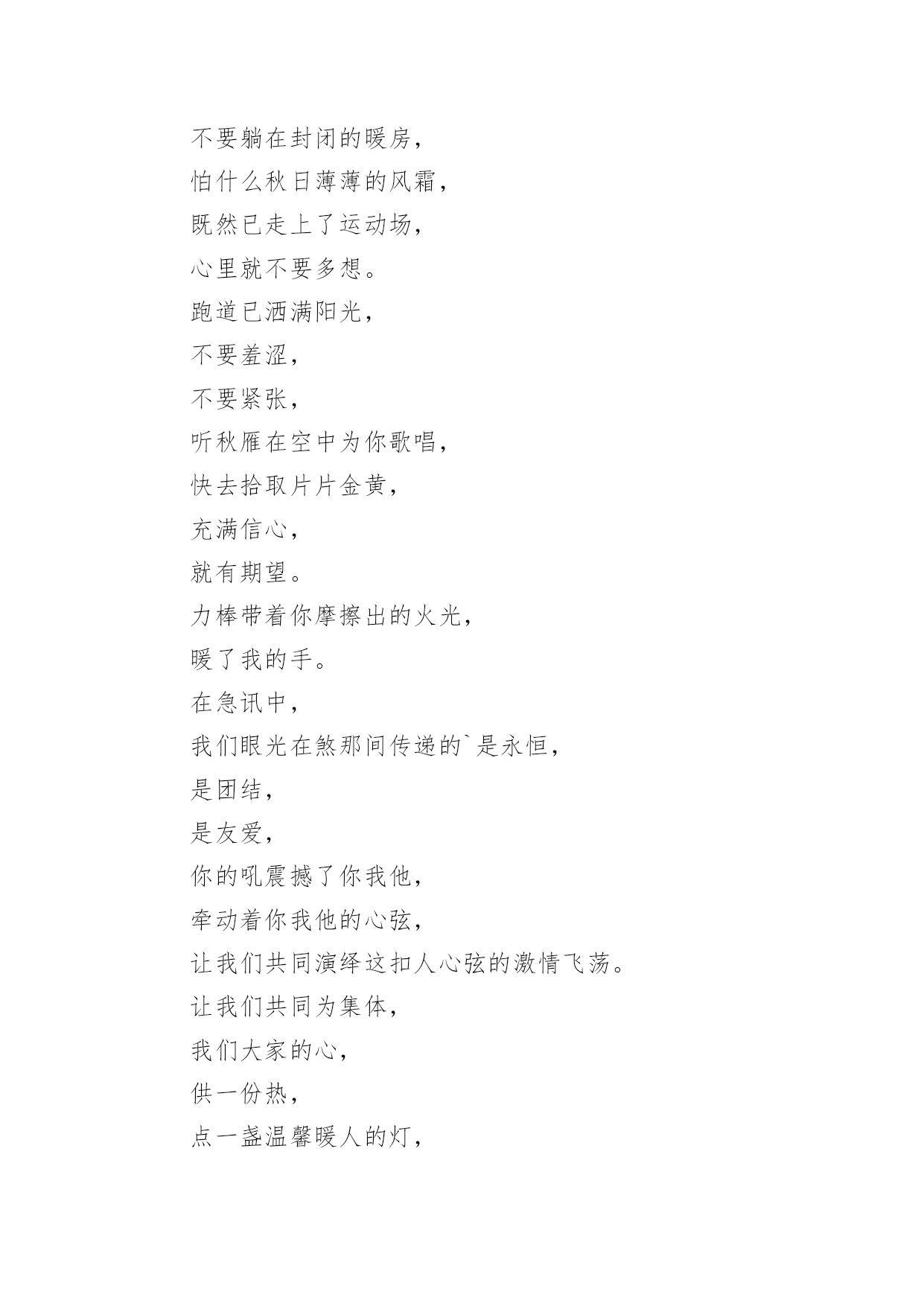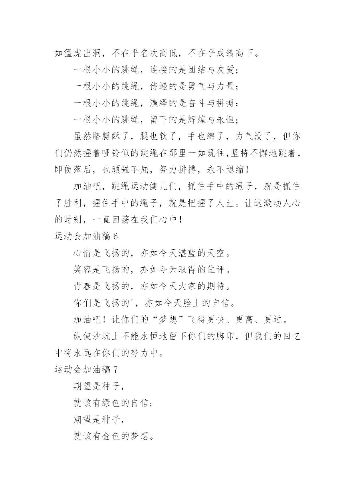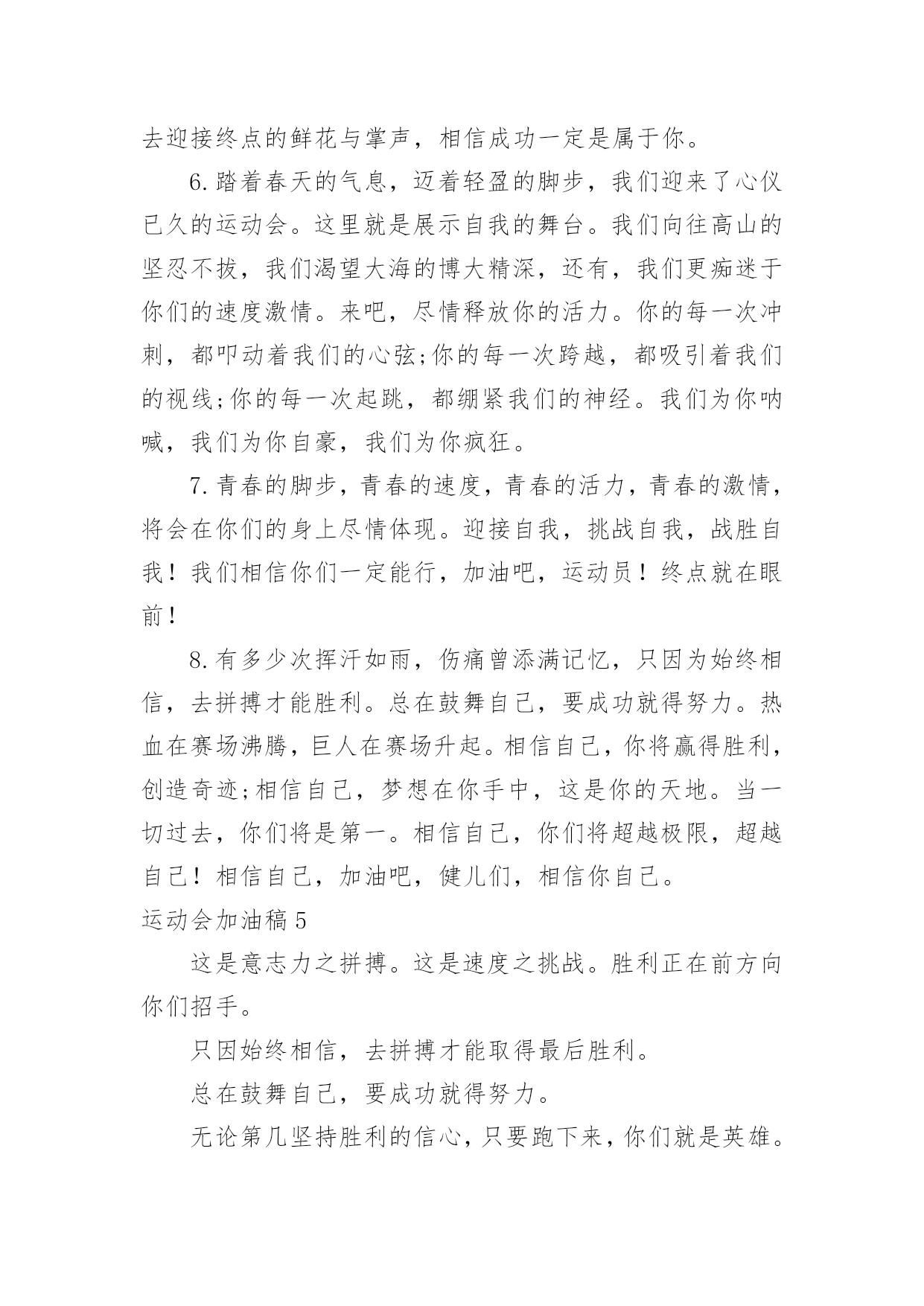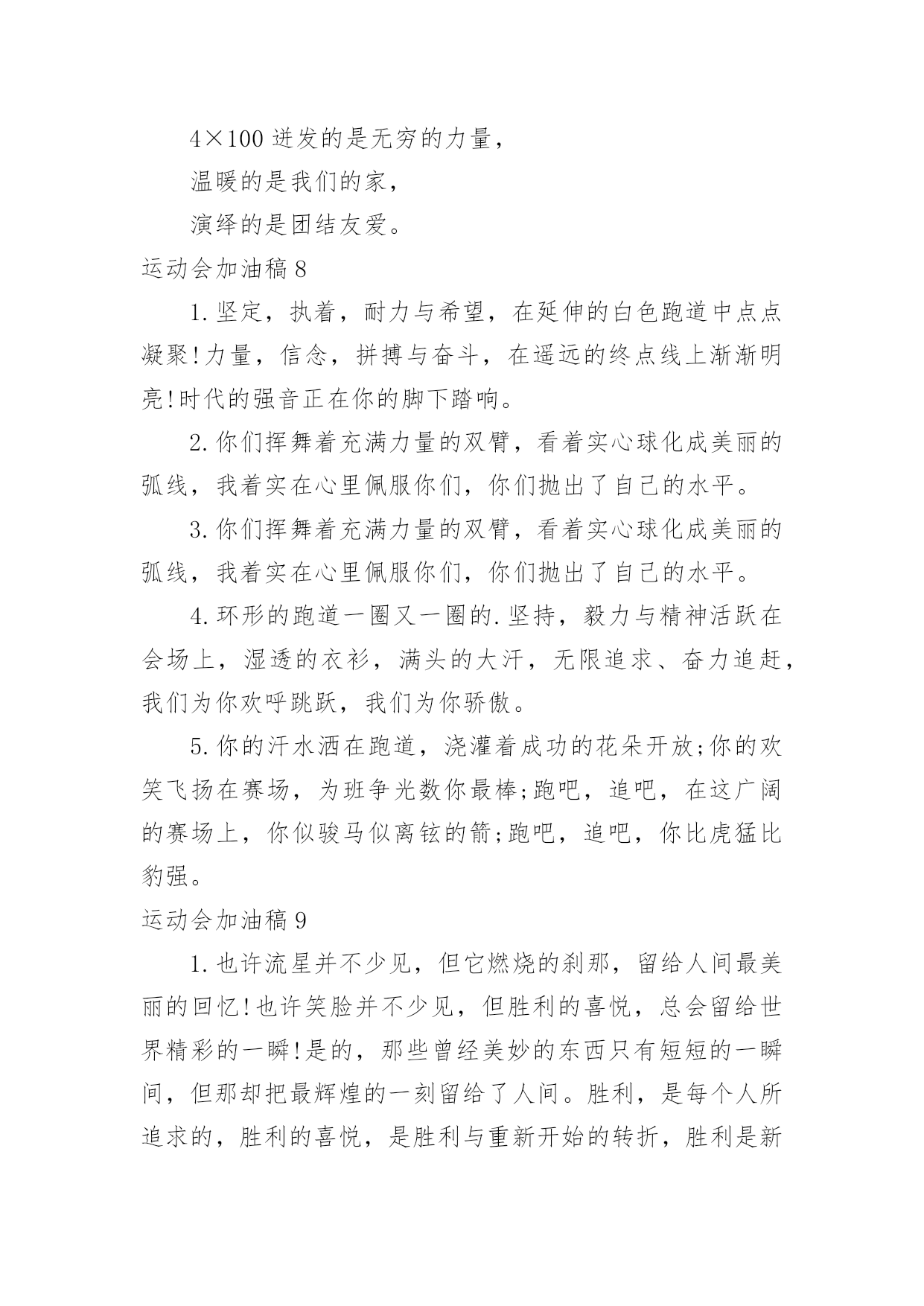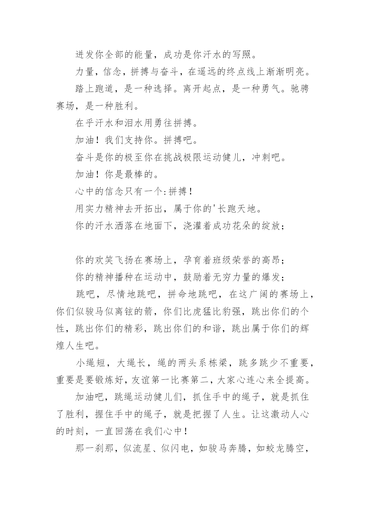 运动会加油稿【精华】运动会加油稿15篇在发展不断提速的社会中,我们越来越需要加油稿,加油稿是一种对他人有正向激励作用的文稿。写起加油稿来就毫无头绪?以下是小编精心整理的运动会加油稿,欢迎大家分享。运动会加油稿11.你赢得十分精彩,无需掩饰你的微笑,流露在你脸上。但我相信,你心中十分明白,征途刚刚开始,漫漫长路刚刚开头。加油啊,朋友,只有不断的拼搏,才可以不断战胜自己,战胜一切!向前、向前、向前!2.运动健将们,用你的实力,用你的精神,去开拓出,一片属于你的长跑天地!3.100只是一道过场,几秒钟转瞬即逝,但是这背后承载的是多少成败,加油吧,少年。4.也许流星并不少见,但它燃烧的刹那,留给人间最美丽的回忆!也许笑脸并不少见,但胜利的喜悦,总会留给世界精彩的一瞬!是的,那些以前美妙的东西只有短短的一瞬间,但那却把最辉煌的一刻留给了人间。胜利,是每个人所追求的,胜利的喜悦,是胜利与重新开始的转折,胜利是新的开始!5.跑道,是你勇气的选择,驰骋赛场,获得胜利,是你实力的体现,是你的战场,在这里你所向披靡。6.不为鲜花的围绕,不为刹那的荣耀,只有执着的信念,化作不停的奔跑,心中燃烧着梦想,脚下不停的步伐。7.虽然你们在场上的时间很短暂,但你们的身影依然停留在人们的脑海里,因为你们是赛场上最可爱的人,不为掌声的注释,不为刻意的征服,不为失败的痛苦,只有辛勤的`汗水化作成功的脚步8.心中坚定的信念,脚下沉稳的步伐,你用行动告诉我们一个不变之理,没有走不完的路,没有过不了的山,成功正在终点冲着你高高的招手,用你那顽强的意志去努力,去迎接终点的鲜花与掌声,相信成功务必是属于你。9.致运动员:是体育场上游走的火焰,是来去不息的脚步,是风中飞舞的树叶折射的金色光芒,藉此,能够诠释运动员兴奋的脸庞。那轻盈的步伐似飞鸟的翅膀,那清脆的x声响彻天际,它粲然升起那跃动的渴望,起跑加速超越冲刺,一步一步延向胜利的曙光。那是力的比拼,素质的较量,是石榴树上,跃动的心脏。10.超越对手,超越自我,是我们的目标,我们的信念,在清凉的初秋,在喧嚣的田径场上,你们点燃了似火的热情,无论成败,我们都为你们感到自豪,你们永远是我们的骄傲!11.坚定,执着,耐力与希望,在延伸的白色跑道中点点凝聚!力量,信念,拼搏与奋斗,在遥远的终点线上渐渐明如何写通讯稿亮!时代的强音正在你的脚下踏响。12.这是意志的拼搏。这是速度的挑战。胜利在向你们招手,胜利在向你们呼唤。13.迎接自我,挑战自我,战胜自我!我们相信你们一定能行,加油吧,运动员!终点就在眼前!14.你们挥舞着充满力量的双臂看着实心球化成美丽的弧线我着实在心里佩服你们你们抛出了自己的最佳水平!15.时间在流逝,赛道在延伸,成功在你面前展现心脏的跳动,热血在沸腾,辉煌在你脚下铸就加油吧,健儿们,这是意志的拼搏。这是速度的挑战。胜利在向你们招手胜利在向你们呼唤。16.健儿们,奋力拼搏吧!人生难得几回搏。搏它个乖风破浪,搏它个海阔天空!赛场风光变幻莫测,保持心态再接再厉,永不言败!短暂的一瞬间,显示出你惊人的速度,铿锵有力的一声吼叫,把你全身的力量都凝聚在这一刻上。17.百米战场,枪声炸响,你抬头是勇气是自信,低头是深沉是内敛,只需几秒,那就是永恒。18.不为鲜花的围绕,不为刹那的荣耀,仅有执着的信念,化作不停的奔跑,心中燃烧着梦想,脚下不停的步伐!19.枪声响起,冲刺向前,一马当先,咫尺天涯,永恒之巅,冲吧,向着未来冲刺,向着胜利冲刺。20.踏着春天的气息,迈着轻盈的脚步,我们迎来了心仪已久的运动会。那里就是展示自我的舞台。我们向往高山的坚忍不拔,我们渴望大海的博大精深,还有,我们更痴迷于你们的速度激情。来吧,尽情释放你的活力。你的每一次冲刺,都叩动着我们的心弦;你的每一次跨越,都吸引着我们的视线;你的每一次起跳,都绷紧我们的神经。我们为你呐喊,我们为你自豪,我们为你疯狂。运动会加油稿2350米的跑道上,你正在飞驰,头一百米:你可能心急如焚,可心知落后就要挨打。次一百米:你也许有点心神不定,我是不是该安静的退开?再一百米:你正在进行着心理斗争,“生存”还“死亡”?末一百米:你仿佛心有余而力不足,其实“冲刺”不容易。但面对如此遥远的路途,如此激烈的竞争,你也许腿脚发麻,你也许有些茫然。但你可知道,在你身后,有同学们一双双期待的眼睛;在你身后,是你日日辛勤苦练流下的'汗水。鼓起勇气,奋勇向前吧!为了集体的荣誉,为了祖国的明天!运动会加油稿3踏着激昂的乐点,你们展示自信的`风采;迈着昂扬的步伐,你们彰显必胜的气概绿茵场是你们的舞台,红跑道是你们的主场你们用意气风发的笑容向世界宣告胜利的归属,昔有男儿佩吴钩,关山夜取五十州,今有吾辈显身手,赛场驰骋拔头筹。运动会加油稿41.尊敬的班长大人,我们八班同学都希望在赛场上也能看见你的神威,