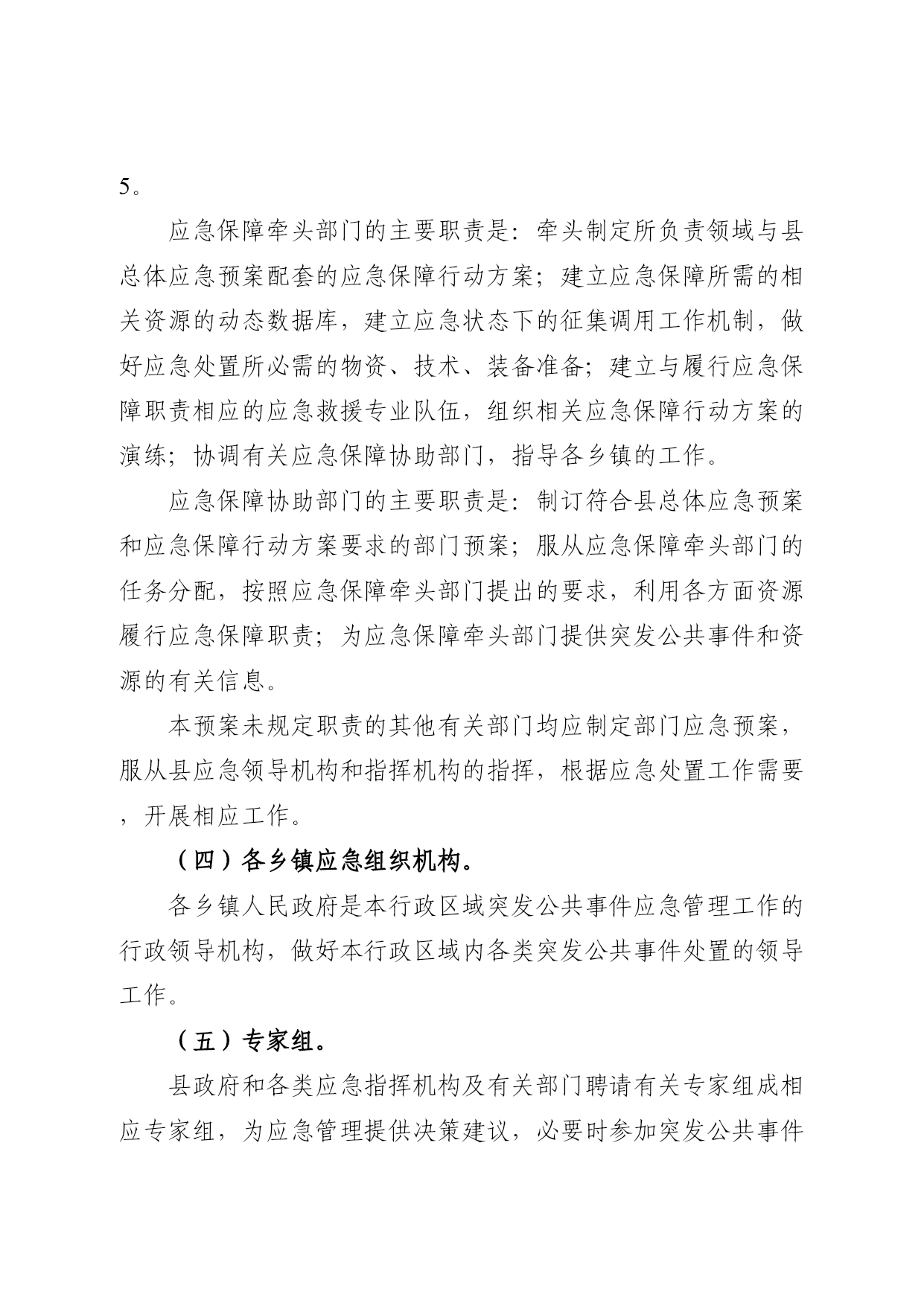 嵊泗县突发公共事件总体应急预案一、总则(一)编制目的。提高政府保障公共安全和处置突发公共事件的能力,最大程度地预防和减少各类突发公共事件及其造成的损害,保障公众健康和生命财产安全,维护社会稳定,促进经济社会全面、协调、可持续发展,促进“平安嵊泗”建设。(二)编制依据。依据有关法律、法规和国发〔2005〕11号、浙政发〔2005〕12号、14号及舟政发〔2005〕59号文件精神,结合嵊泗实际,制定本预案。(三)分级分类。本预案所称突发公共事件,是指突然发生,造成或者可能造成重大人员伤亡、财产损失、生态环境破坏和严重社会危害,危及公共安全的紧急事件。根据突发公共事件的发生过程、性质和机理,突发公共事件主要分为以下四类:1.自然灾害。主要包括水旱灾害,气象灾害,地震灾害,地质灾害,海洋灾害,生物灾害,森林火灾等。2.事故灾难。主要包括工矿商贸等企业的各类安全事故,海上船舶事故,交通运输事故,火灾事故,公共设施和设备事故,放射源辐射事故,环境污染和生态破坏事故等。3.公共卫生事件。主要包括传染病疫情,群体性不明原因疾病,食品安全和职业危害,动物疫情以及其它严重影响公众健康和生命安全的事件。4.社会安全事件。主要包括恐怖袭击事件,民族宗教事件,经济安全事件,涉外突发公共事件和群体性事件等。上述各类突发公共事件往往是相互交叉和关联的,某类突发公共事件可能和其他类别的事件同时发生,或引发次生、衍生的其它类型事件,应当具体分析,统筹应对。各类突发公共事件按照其性质、严重程度、可控性和影响范围等因素,一般分为四级:Ⅰ级(特别重大)、Ⅱ级(重大)、Ⅲ级(较大)、Ⅳ级(一般)。国家和省、市有关法律法规另有明确规定的,按国家和省、市有关规定执行。特别重大、重大突发公共事件分级标准见附件7。较大和一般突发公共事件分级标准待国家或省、市发布后参照执行。(四)适用范围。本预案适用于本县发生的、涉及跨乡镇行政区划或超出事发地乡镇人民政府处置能力的特别重大、重大突发公共事件的应对工作,或者需要由县政府负责处置的特别重大、重大突发公共事件的应对工作。本预案指导全县的突发公共事件应对工作。(五)工作原则。1.加强预防。增强忧患意识,高度重视公共安全工作,居安思危,常抓不懈,防患于未然。坚持预防与应急相结合,常态与非常态相结合,做好应对突发公共事件的思想准备、预案准备、组织准备以及物资准备等。2.快速反应。突发公共事件应急处置的各环节都要坚持效率原则,建立健全快速反应机制,及时获取充分而准确的信息,跟踪研判,果断决策,迅速处置,最大程度地减少危害和影响。3.以人为本。把保障公众健康和生命安全作为首要任务。凡是可能造成人员伤亡的突发公共事件发生前,要及时采取人员避险措施;突发公共事件发生后,要优先开展抢救人员的紧急行动;要加强抢险救援人员的安全防护,最大程度地避免和减少突发公共事件造成的人员伤亡和危害。4.损益合理。处置突发公共事件所采取的措施应该与突发公共事件造成的社会危害的性质、程度、范围和阶段相适应;处置突发公共事件有多种措施可供选择的,应选择对公众利益损害较小的措施;对公众权利与自由的限制,不应超出控制和消除突发公共事件造成的危害所必要的限度,并应对公众的合法利益所造成的直接损失给予适当的补偿。5.分级负责。在县委、县政府领导下,建立健全分类管理、分级负责,条块结合、属地管理为主的应急管理体制,事发地人民政府为处置本行政区域突发公共事件的主体。根据突发公共事件的严重性、可控性、所需动用的资源、影响范围等因素,启动相应的预案。6.联动处置。建立和完善联动协调制度,推行城市统一接警、分级分类处置工作制度,加强部门之间、乡镇之间、军地之间、省、市驻嵊单位与地方政府之间的沟通协调,充分动员和发挥城乡社区、企事业单位、社会团体和志愿者队伍的作用,形成统一指挥、反应灵敏、功能齐全、协调有序、运转高效的应急管理机制。7.专群结合。加强公共安全技术引进推广,采用先进的预测、预警、预防和应急处置技术及设备,提高应对突发公共事件的科技水平和指挥能力;充分发挥专家在突发公共事件的信息研判、决策咨询、专业救援、应急抢险、事件评估等方面的作用。有序组织和动员社会力量参与突发公共事件应急处置工作;加强宣传和培训教育工作,提高公众自我防范、自救互救等能力。8.资源整合。整合现有突发公共事件的监测、预测、预警等信息系统,建立网络互联、信息共享、科学有效的防范体系;整合现有突发公共事件应急指挥和组织网络,建立统一、科学、高效的指挥体系;整合现有突发公共事件应急处置资源,建立分工明确、责任落实、常备不懈的保障体系。9.依法规范。坚持依法行政,妥善处理应急措施与常规管理的关系,合理把握非常措施的运用范围和实施力度,使应对突发公共事件的工作规