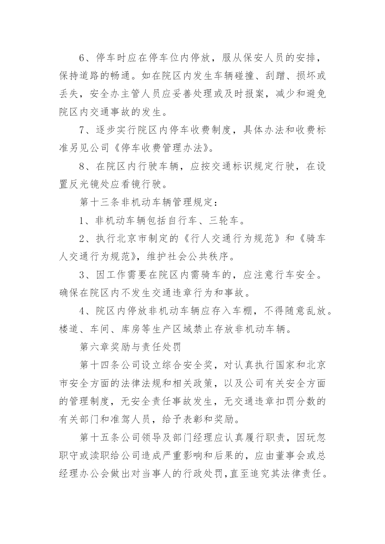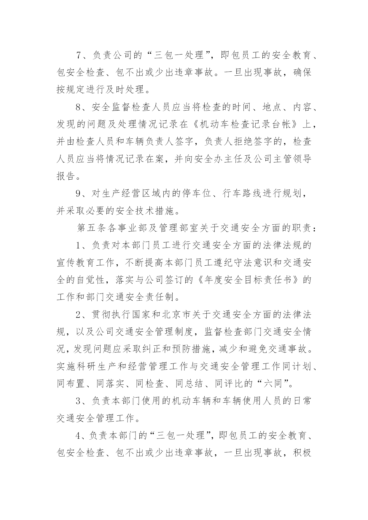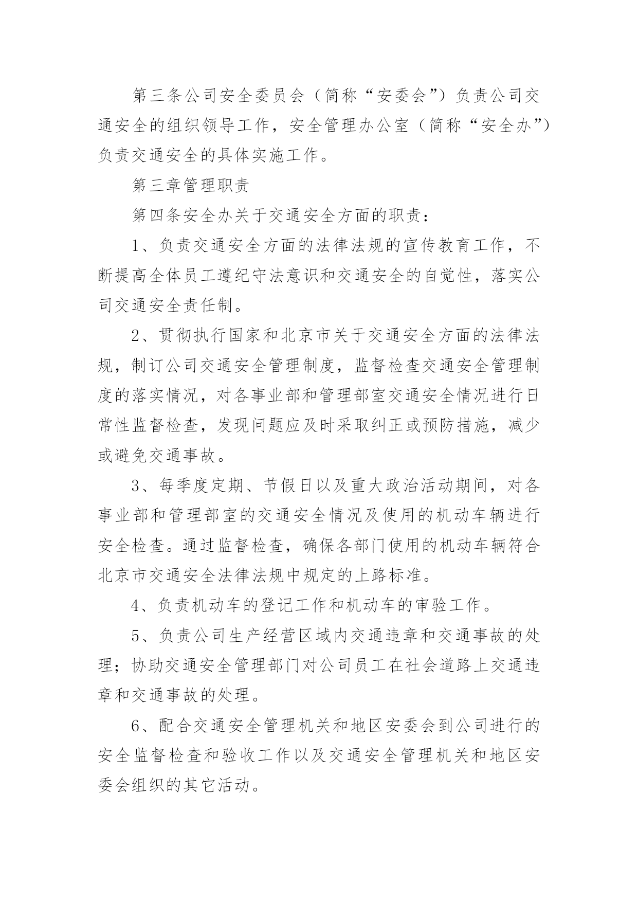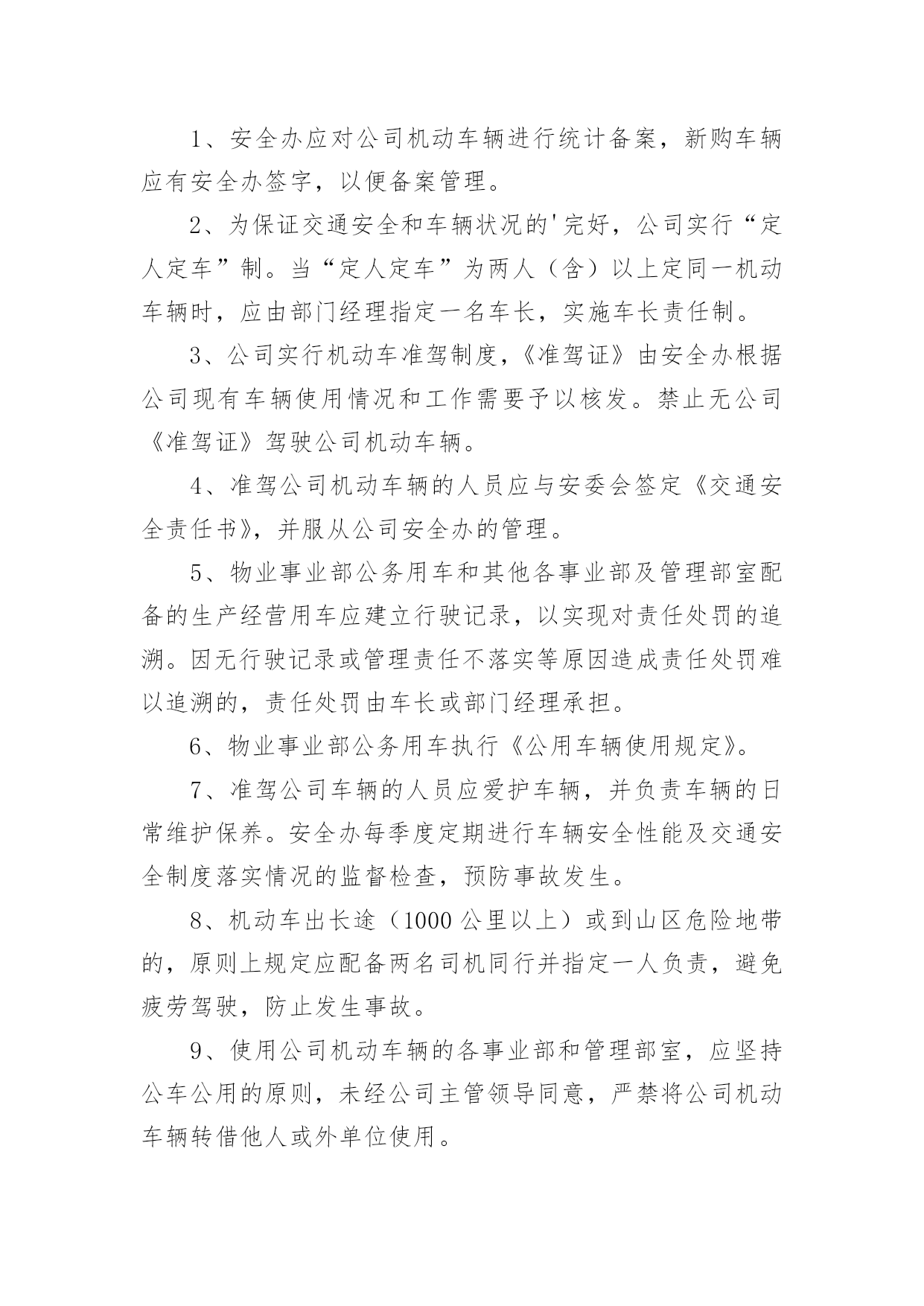 交通安全管理制度交通安全管理制度(15篇)在快速变化和不断变革的今天,很多场合都离不了制度,制度是国家机关、社会团体、企事业单位,为了维护正常的工作、劳动、学习、生活的秩序,保证国家各项政策的顺利执行和各项工作的正常开展,依照法律、法令、政策而制订的具有法规性或指导性与约束力的应用文。我敢肯定,大部分人都对拟定制度很是头疼的,下面是小编帮大家整理的交通安全管理制度,仅供参考,欢迎大家阅读。交通安全管理制度1第一章总则第一条为加强公司交通安全管理工作,落实“安全第一、预防为主”的工作方针,依据《中华人民共和国道路交通管理条例》和《北京市实施〈中华人民共和国道路交通管理条例〉的若干规定》,以及国家和北京市有关交通安全方面的法律法规和相关政策的规定,结合公司实际情况,制定本制度。第二章组织管理第二条贯彻落实企业法人代表或委托代理人责任制,企业法人代表或委托代理人代表公司与上级管理部门签订年度《交通安全责任书》,公司主管领导负责组织实施工作。第三条公司安全委员会(简称“安委会”)负责公司交通安全的组织领导工作,安全管理办公室(简称“安全办”)负责交通安全的具体实施工作。第三章管理职责第四条安全办关于交通安全方面的职责:1、负责交通安全方面的法律法规的宣传教育工作,不断提高全体员工遵纪守法意识和交通安全的自觉性,落实公司交通安全责任制。2、贯彻执行国家和北京市关于交通安全方面的法律法规,制订公司交通安全管理制度,监督检查交通安全管理制度的落实情况,对各事业部和管理部室交通安全情况进行日常性监督检查,发现问题应及时采取纠正或预防措施,减少或避免交通事故。3、每季度定期、节假日以及重大政治活动期间,对各事业部和管理部室的交通安全情况及使用的机动车辆进行安全检查。通过监督检查,确保各部门使用的机动车辆符合北京市交通安全法律法规中规定的上路标准。4、负责机动车的登记工作和机动车的审验工作。5、负责公司生产经营区域内交通违章和交通事故的处理;协助交通安全管理部门对公司员工在社会道路上交通违章和交通事故的处理。6、配合交通安全管理机关和地区安委会到公司进行的安全监督检查和验收工作以及交通安全管理机关和地区安委会组织的其它活动。7、负责公司的“三包一处理”,即包员工的安全教育、包安全检查、包不出或少出违章事故。一旦出现事故,确保按规定进行及时处理。8、安全监督检查人员应当将检查的时间、地点、内容、发现的问题及处理情况记录在《机动车检查记录台帐》上,并由检查人员和车辆负责人签字,负责人拒绝签字的,检查人员应当将情况记录在案,并向安全办主任及公司主管领导报告。9、对生产经营区域内的停车位、行车路线进行规划,并采取必要的安全技术措施。第五条各事业部及管理部室关于交通安全方面的职责:1、负责对本部门员工进行交通安全方面的法律法规的宣传教育工作,不断提高本部门员工遵纪守法意识和交通安全的自觉性,落实与公司签订的《年度安全目标责任书》的工作和部门交通安全责任制。2、贯彻执行国家和北京市关于交通安全方面的法律法规,以及公司交通安全管理制度,监督检查部门交通安全情况,发现问题应采取纠正和预防措施,减少和避免交通事故。实施科研生产和经营管理工作与交通安全管理工作同计划、同布置、同落实、同检查、同总结、同评比的“六同”。3、负责本部门使用的机动车辆和车辆使用人员的日常交通安全管理工作。4、负责本部门的“三包一处理”,即包员工的安全教育、包安全检查、包不出或少出违章事故,一旦出现事故,积极协助公司安全办进行事故处理。5、配合交通安全管理机关和地区安委会以及公司组织的安全监督检查和其它交通安全活动。第四章宣传和教育第六条安委会每季度定期召开工作例会,分析公司安全形势、学习贯彻有关文件精神,针对问题制定改进措施并予以落实。第七条安委会成员应利用公司党、政、工、团系统的各种会议对干部和员工进行安全教育,及时通报公司安全情况,并按安委会的要求布置落实安全工作。第八条安全办应利用公司计算机信息网络、通讯、黑板报、宣传画、横幅等多种形式和手段,开展经常性的交通法规、交通安全的宣传教育活动。第九条公司领导、各事业部与管理部室经理应充分重视交通安全工作,按照安全办的要求落实对员工的交通安全教育,带领员工自觉遵守交通安全方面的法律法规,以及公司安全方面的有关制度,组织员工开展交通法规的学习培训,提高员工安全意识和遵守交通法律法规的自觉性。第十条机动车驾驶员学习的规定:各事业部及管理部室的员工驾驶车辆的,公司规定每周应保持不低于3个小时的学习时间(含业余时间)。学习方式以自学为主,必要时由公司安全办统一安排。第五章相关规定第十一条机动车辆管理规定:1、安全办应对公司机动车辆进行统计备案,新购车辆应有安全办签字,以便备案管理。2、为保证交通安全和车辆状况的'完好,公司实行“定人定车”制。当