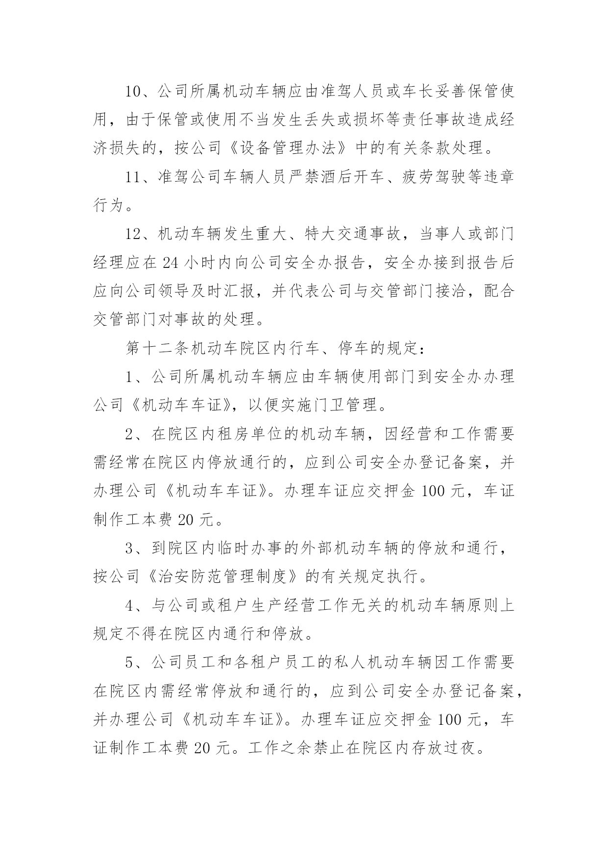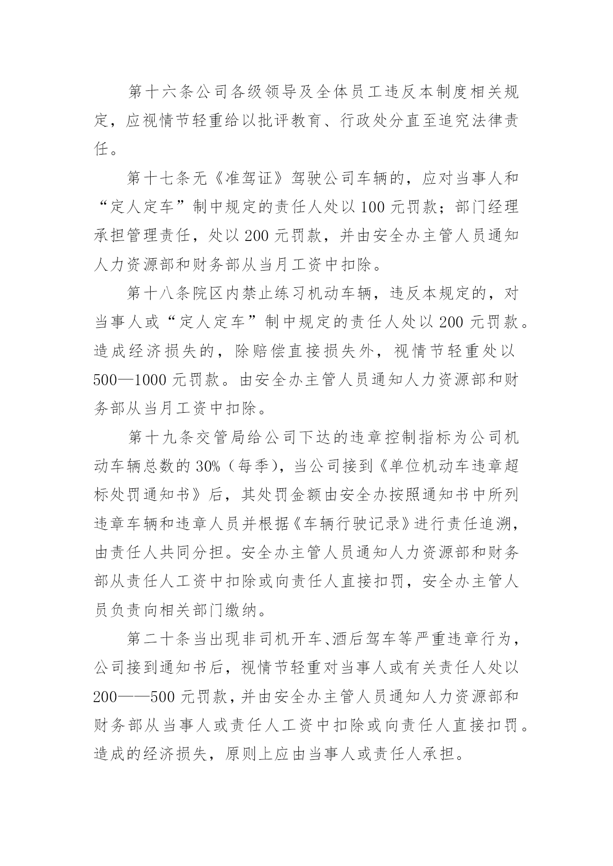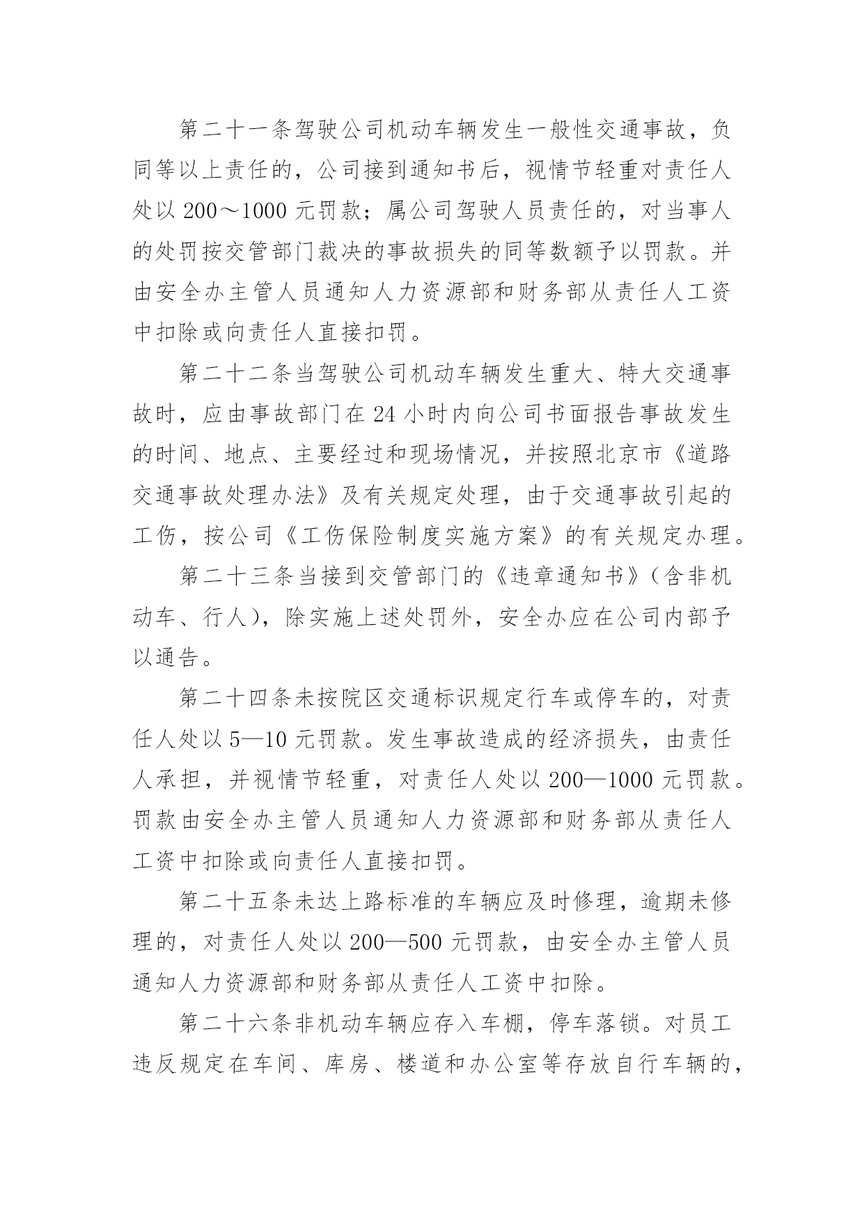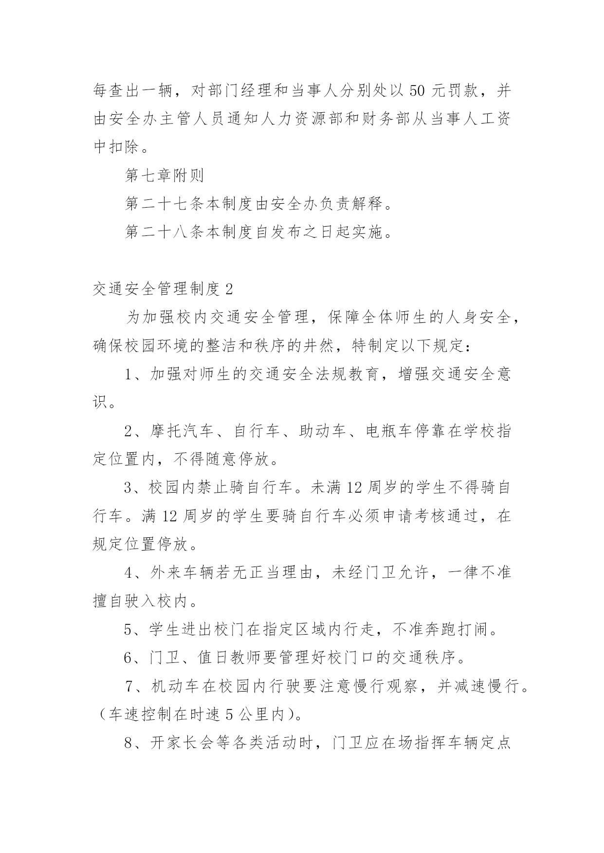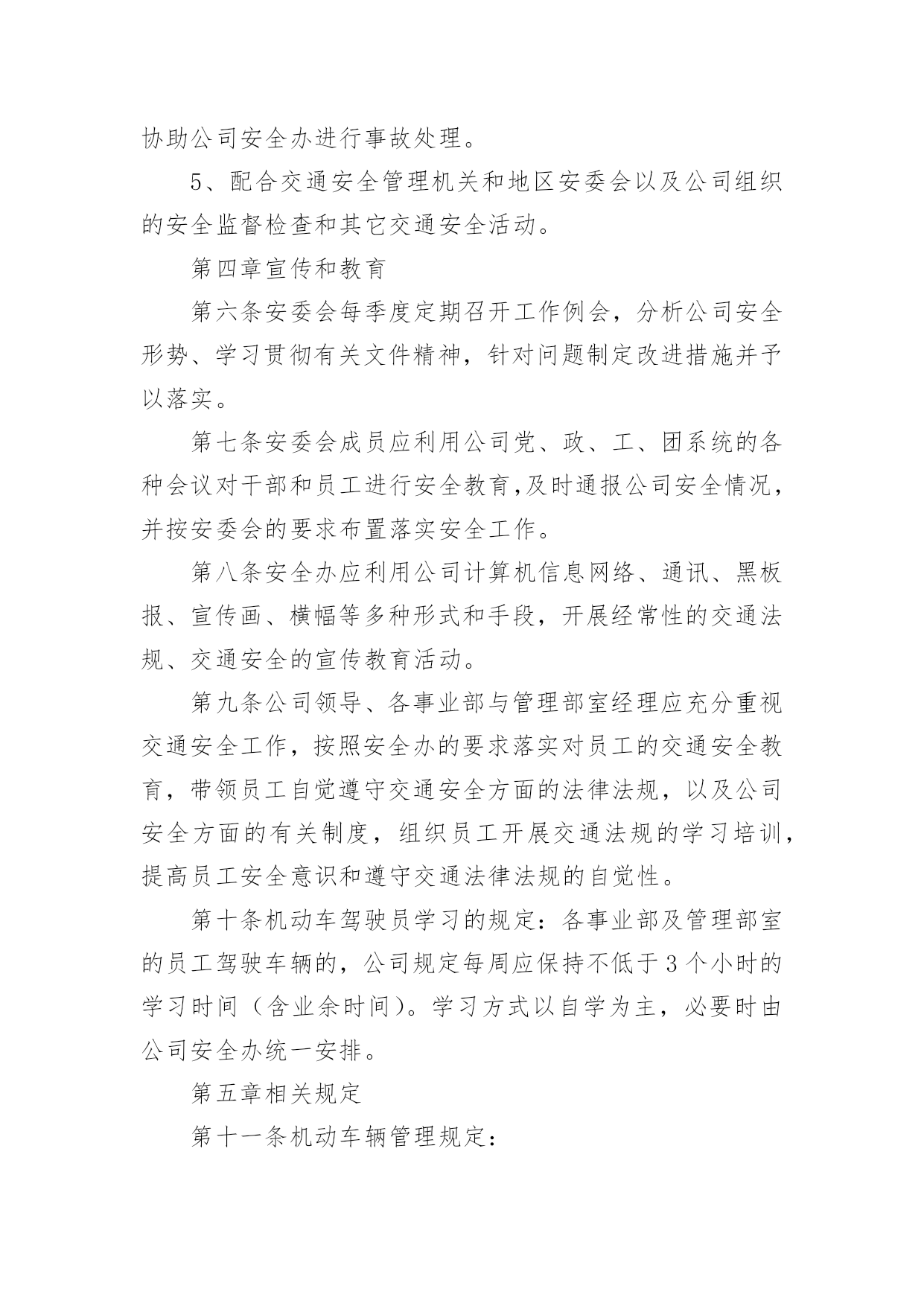 交通安全管理制度交通安全管理制度(15篇)在快速变化和不断变革的今天,很多场合都离不了制度,制度是国家机关、社会团体、企事业单位,为了维护正常的工作、劳动、学习、生活的秩序,保证国家各项政策的顺利执行和各项工作的正常开展,依照法律、法令、政策而制订的具有法规性或指导性与约束力的应用文。我敢肯定,大部分人都对拟定制度很是头疼的,下面是小编帮大家整理的交通安全管理制度,仅供参考,欢迎大家阅读。交通安全管理制度1第一章总则第一条为加强公司交通安全管理工作,落实“安全第一、预防为主”的工作方针,依据《中华人民共和国道路交通管理条例》和《北京市实施〈中华人民共和国道路交通管理条例〉的若干规定》,以及国家和北京市有关交通安全方面的法律法规和相关政策的规定,结合公司实际情况,制定本制度。第二章组织管理第二条贯彻落实企业法人代表或委托代理人责任制,企业法人代表或委托代理人代表公司与上级管理部门签订年度《交通安全责任书》,公司主管领导负责组织实施工作。第三条公司安全委员会(简称“安委会”)负责公司交通安全的组织领导工作,安全管理办公室(简称“安全办”)负责交通安全的具体实施工作。第三章管理职责第四条安全办关于交通安全方面的职责:1、负责交通安全方面的法律法规的宣传教育工作,不断提高全体员工遵纪守法意识和交通安全的自觉性,落实公司交通安全责任制。2、贯彻执行国家和北京市关于交通安全方面的法律法规,制订公司交通安全管理制度,监督检查交通安全管理制度的落实情况,对各事业部和管理部室交通安全情况进行日常性监督检查,发现问题应及时采取纠正或预防措施,减少或避免交通事故。3、每季度定期、节假日以及重大政治活动期间,对各事业部和管理部室的交通安全情况及使用的机动车辆进行安全检查。通过监督检查,确保各部门使用的机动车辆符合北京市交通安全法律法规中规定的上路标准。4、负责机动车的登记工作和机动车的审验工作。5、负责公司生产经营区域内交通违章和交通事故的处理;协助交通安全管理部门对公司员工在社会道路上交通违章和交通事故的处理。6、配合交通安全管理机关和地区安委会到公司进行的安全监督检查和验收工作以及交通安全管理机关和地区安委会组织的其它活动。7、负责公司的“三包一处理”,即包员工的安全教育、包安全检查、包不出或少出违章事故。一旦出现事故,确保按规定进行及时处理。8、安全监督检查人员应当将检查的时间、地点、内容、发现的问题及处理情况记录在《机动车检查记录台帐》上,并由检查人员和车辆负责人签字,负责人拒绝签字的,检查人员应当将情况记录在案,并向安全办主任及公司主管领导报告。9、对生产经营区域内的停车位、行车路线进行规划,并采取必要的安全技术措施。第五条各事业部及管理部室关于交通安全方面的职责:1、负责对本部门员工进行交通安全方面的法律法规的宣传教育工作,不断提高本部门员工遵纪守法意识和交通安全的自觉性,落实与公司签订的《年度安全目标责任书》的工作和部门交通安全责任制。2、贯彻执行国家和北京市关于交通安全方面的法律法规,以及公司交通安全管理制度,监督检查部门交通安全情况,发现问题应采取纠正和预防措施,减少和避免交通事故。实施科研生产和经营管理工作与交通安全管理工作同计划、同布置、同落实、同检查、同总结、同评比的“六同”。3、负责本部门使用的机动车辆和车辆使用人员的日常交通安全管理工作。4、负责本部门的“三包一处理”,即包员工的安全教育、包安全检查、包不出或少出违章事故,一旦出现事故,积极协助公司安全办进行事故处理。5、配合交通安全管理机关和地区安委会以及公司组织的安全监督检查和其它交通安全活动。第四章宣传和教育第六条安委会每季度定期召开工作例会,分析公司安全形势、学习贯彻有关文件精神,针对问题制定改进措施并予以落实。第七条安委会成员应利用公司党、政、工、团系统的各种会议对干部和员工进行安全教育,及时通报公司安全情况,并按安委会的要求布置落实安全工作。第八条安全办应利用公司计算机信息网络、通讯、黑板报、宣传画、横幅等多种形式和手段,开展经常性的交通法规、交通安全的宣传教育活动。第九条公司领导、各事业部与管理部室经理应充分重视交通安全工作,按照安全办的要求落实对员工的交通安全教育,带领员工自觉遵守交通安全方面的法律法规,以及公司安全方面的有关制度,组织员工开展交通法规的学习培训,提高员工安全意识和遵守交通法律法规的自觉性。第十条机动车驾驶员学习的规定:各事业部及管理部室的员工驾驶车辆的,公司规定每周应保持不低于3个小时的学习时间(含业余时间)。学习方式以自学为主,必要时由公司安全办统一安排。第五章相关规定第十一条机动车辆管理规定:1、安全办应对公司机动车辆进行统计备案,新购车辆应有安全办签字,以便备案管理。2、为保证交通安全和车辆状况的'完好,公司实行“定人定车”制。当