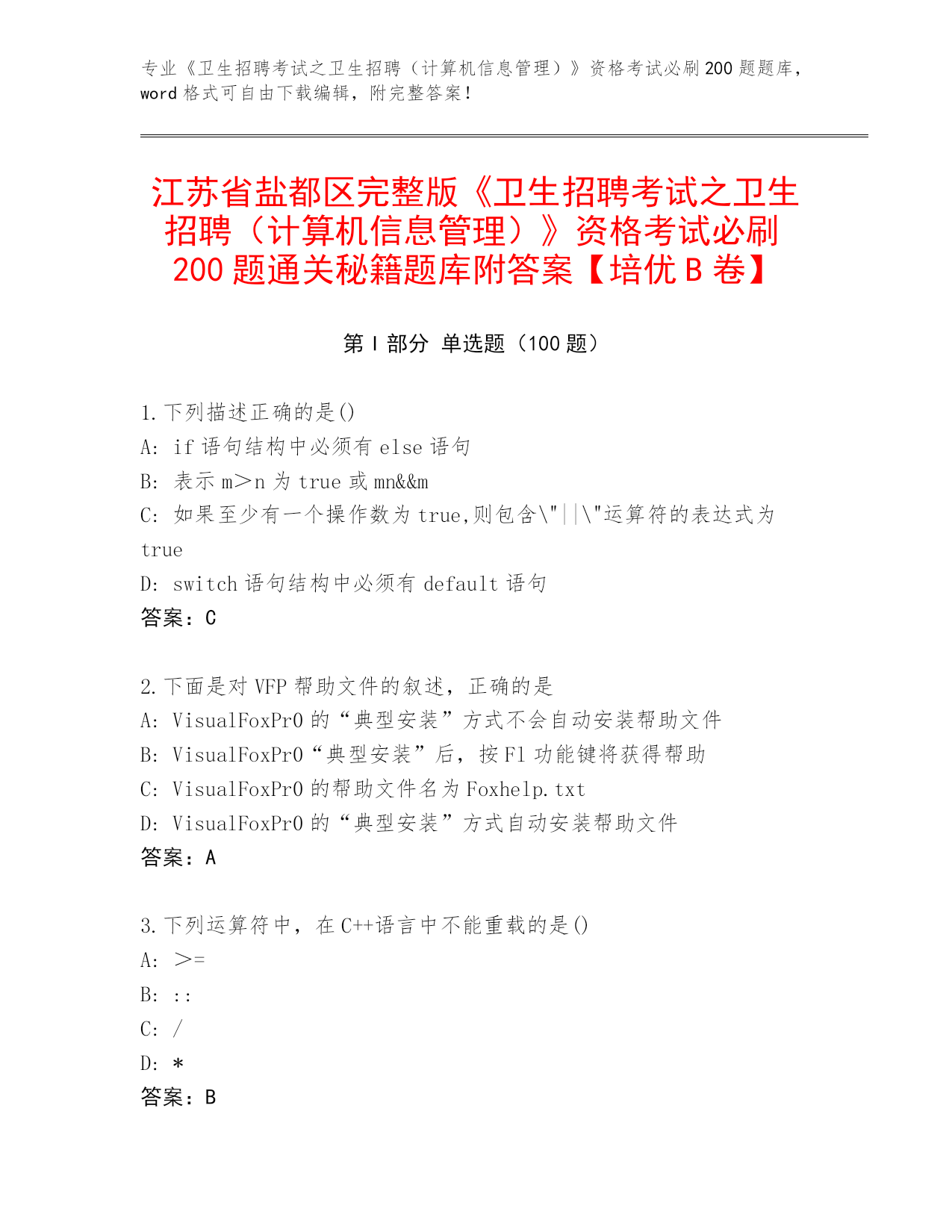 江苏省盐都区完整版《卫生招聘考试之卫生招聘(计算机信息管理)》资格考试必刷200题通关秘籍题库附答案【培优B卷】