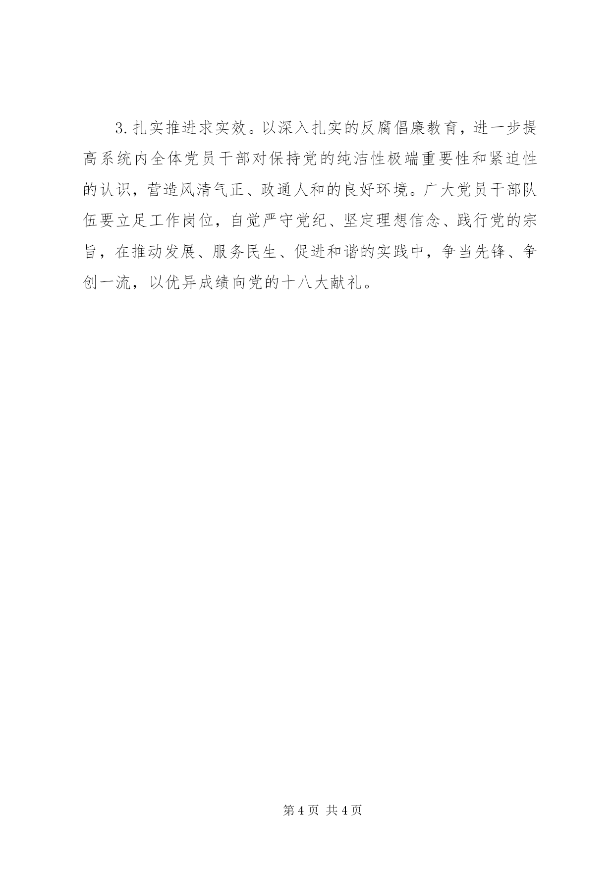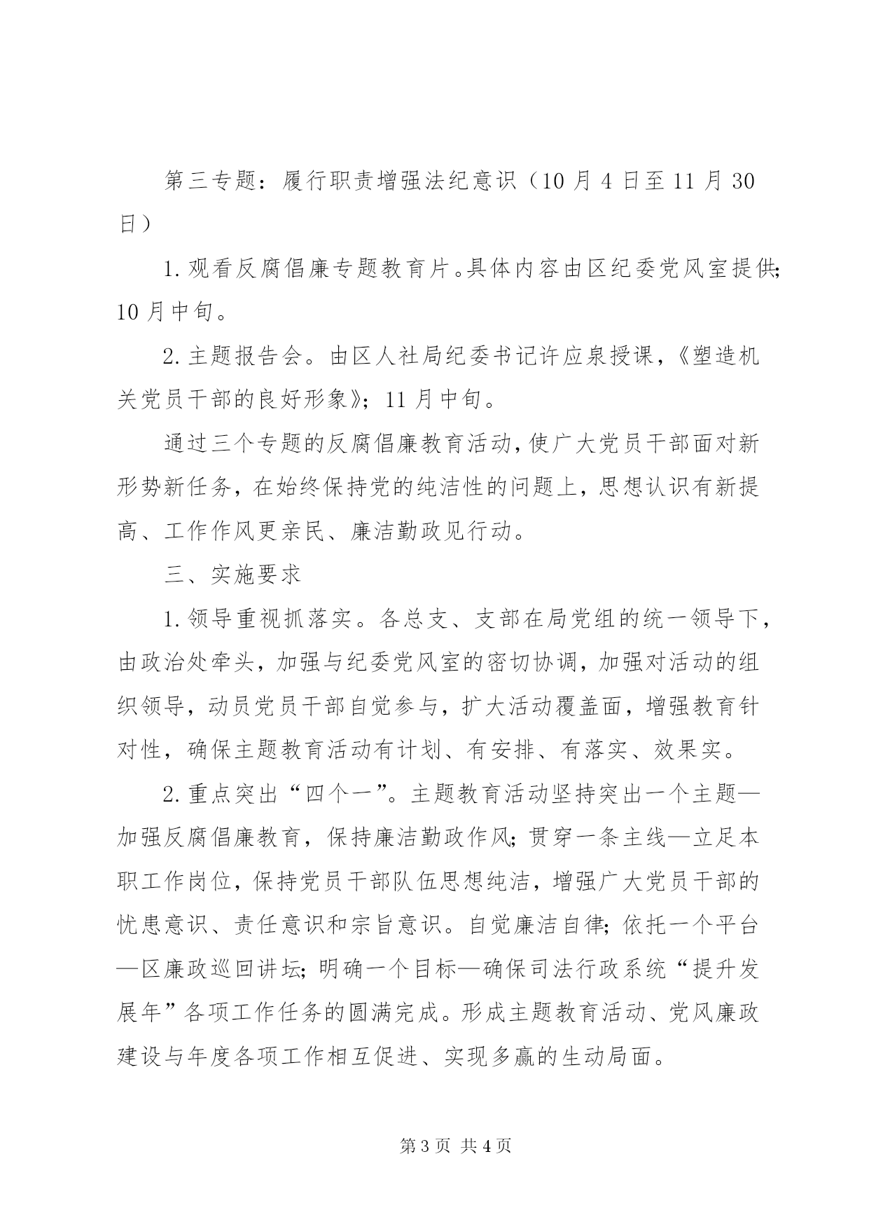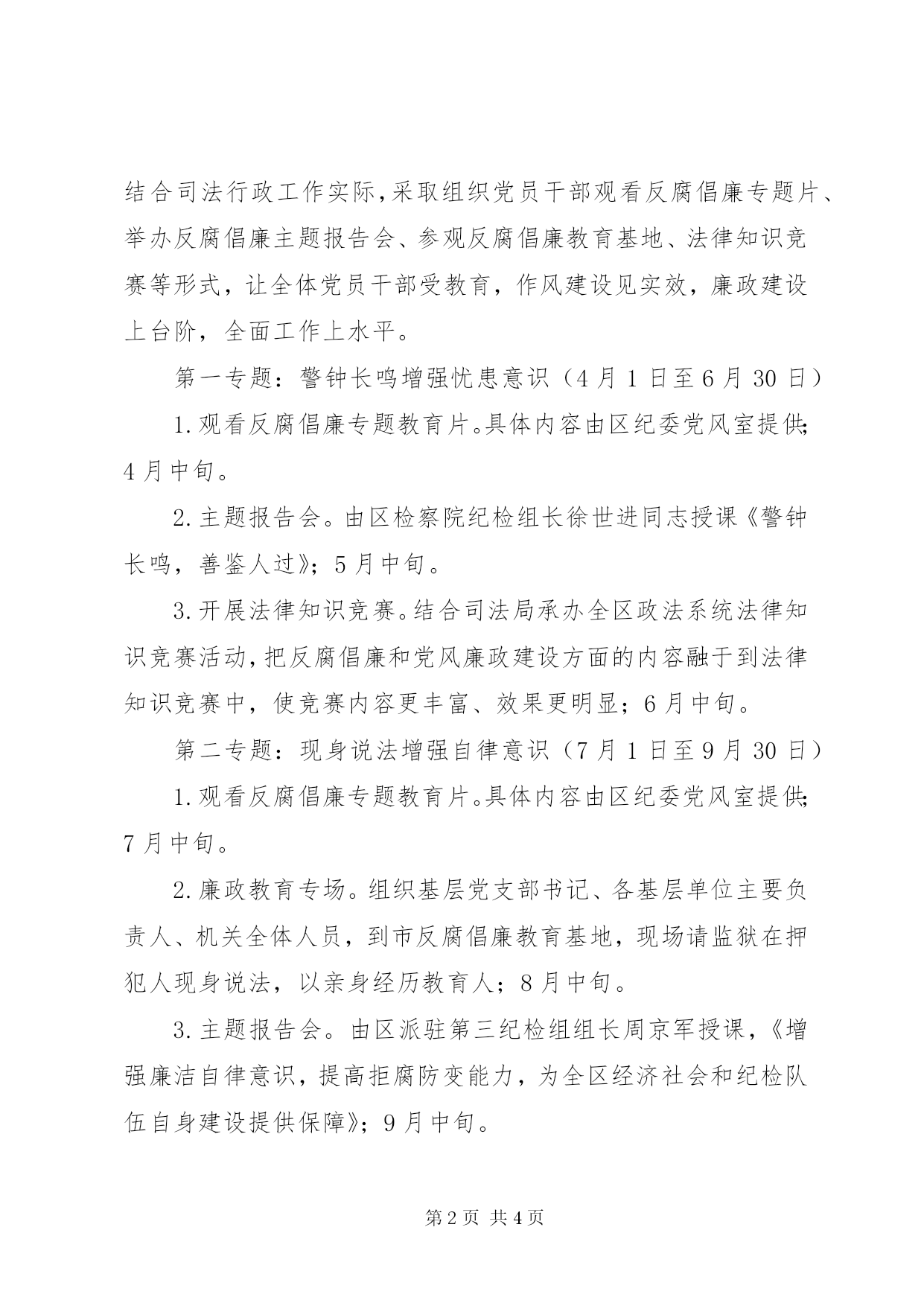 第PAGE\*Arabic\*MERGEFORMAT4页共NUMPAGES\*MERGEFORMAT4页司法系统反腐倡廉指导方案为深入学习贯彻胡锦涛同志重要讲话和十七届中央纪委第七次全会精神,按照区纪委《关于继续深化“廉政巡回讲坛”活动的通知》的统一部署,切实加强基层反腐倡廉教育,营造风清气正的良好环境,确保司法局“提升发展年”各项目标任务圆满完成,经局党组研究决定,在司法行政系统各级党组织和党员干部中深入开展“加强反腐倡廉教育,保持廉洁勤政作风”主题教育活动,现制定实施方案如下:一、目标任务坚持以十七届中央纪委第七次全会精神为指导,深入学习贯彻胡锦涛总书记重要讲话精神,深刻认识始终保持党的纯洁性的极端重要性和紧迫性,正确把握区委“提升发展年”活动中心任务,不断加强和深化反腐倡廉教育,以维护党纪、维护党的纯洁性教育为主要内容,以保持党员、干部队伍思想纯洁为重点目标,在注重预防上下功夫,始终保持廉洁勤政作风,营造风清气正良好环境,以党风廉政建设的新成效,促和谐惠民生的新成果,确保2012年度司法行政各项目标任务的圆满完成。二、主要内容本次主题教育活动自4月开始,至11月底结束。按照区纪委的统一部署,充分发挥区直单位和部门在反腐倡廉教育和党风廉政建设方面的专业优势,利用《区廉政巡回讲坛》特色平台,结合司法行政工作实际,采取组织党员干部观看反腐倡廉专题片、举办反腐倡廉主题报告会、参观反腐倡廉教育基地、法律知识竞赛等形式,让全体党员干部受教育,作风建设见实效,廉政建设上台阶,全面工作上水平。第一专题:警钟长鸣增强忧患意识(4月1日至6月30日)1.观看反腐倡廉专题教育片。具体内容由区纪委党风室提供;4月中旬。2.主题报告会。由区检察院纪检组长徐世进同志授课《警钟长鸣,善鉴人过》;5月中旬。3.开展法律知识竞赛。结合司法局承办全区政法系统法律知识竞赛活动,把反腐倡廉和党风廉政建设方面的内容融于到法律知识竞赛中,使竞赛内容更丰富、效果更明显;6月中旬。第二专题:现身说法增强自律意识(7月1日至9月30日)1.观看反腐倡廉专题教育片。具体内容由区纪委党风室提供;7月中旬。2.廉政教育专场。组织基层党支部书记、各基层单位主要负责人、机关全体人员,到市反腐倡廉教育基地,现场请监狱在押犯人现身说法,以亲身经历教育人;8月中旬。3.主题报告会。由区派驻第三纪检组组长周京军授课,《增强廉洁自律意识,提高拒腐防变能力,为全区经济社会和纪检队伍自身建设提供保障》;9月中旬。第三专题:履行职责增强法纪意识(10月4日至11月30日)1.观看反腐倡廉专题教育片。具体内容由区纪委党风室提供;10月中旬。2.主题报告会。由区人社局纪委书记许应泉授课,《塑造机关党员干部的良好形象》;11月中旬。通过三个专题的反腐倡廉教育活动,使广大党员干部面对新形势新任务,在始终保持党的纯洁性的问题上,思想认识有新提高、工作作风更亲民、廉洁勤政见行动。三、实施要求1.领导重视抓落实。各总支、支部在局党组的统一领导下,由政治处牵头,加强与纪委党风室的密切协调,加强对活动的组织领导,动员党员干部自觉参与,扩大活动覆盖面,增强教育针对性,确保主题教育活动有计划、有安排、有落实、效果实。2.重点突出“四个一”。主题教育活动坚持突出一个主题—加强反腐倡廉教育,保持廉洁勤政作风;贯穿一条主线—立足本职工作岗位,保持党员干部队伍思想纯洁,增强广大党员干部的忧患意识、责任意识和宗旨意识。自觉廉洁自律;依托一个平台—区廉政巡回讲坛;明确一个目标—确保司法行政系统“提升发展年”各项工作任务的圆满完成。形成主题教育活动、党风廉政建设与年度各项工作相互促进、实现多赢的生动局面。3.扎实推进求实效。以深入扎实的反腐倡廉教育,进一步提高系统内全体党员干部对保持党的纯洁性极端重要性和紧迫性的认识,营造风清气正、政通人和的良好环境。广大党员干部队伍要立足工作岗位,自觉严守党纪、坚定理想信念、践行党的宗旨,在推动发展、服务民生、促进和谐的实践中,争当先锋、争创一流,以优异成绩向党的十八大献礼。