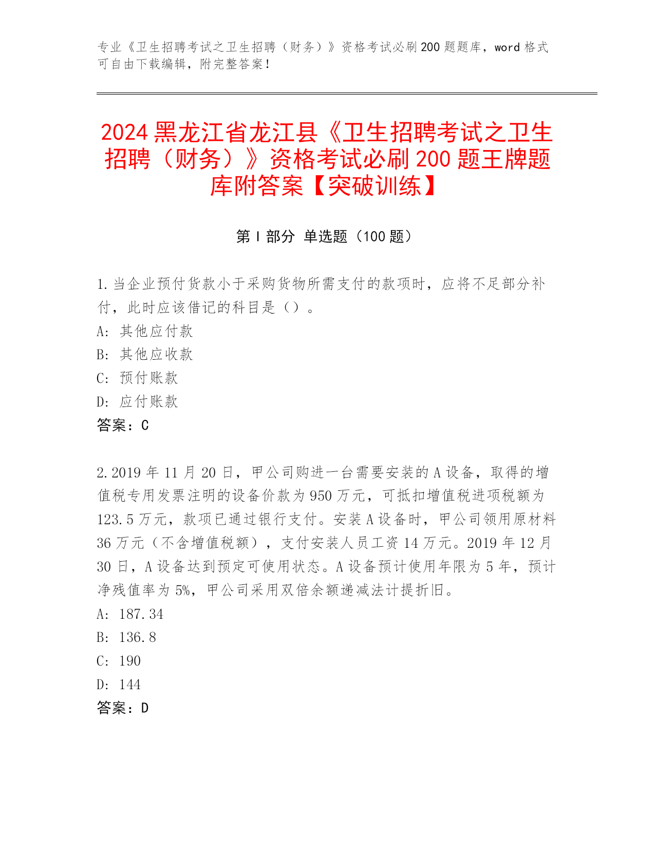 2024黑龙江省龙江县《卫生招聘考试之卫生招聘(财务)》资格考试必刷200题王牌题库附答案【突破训练】