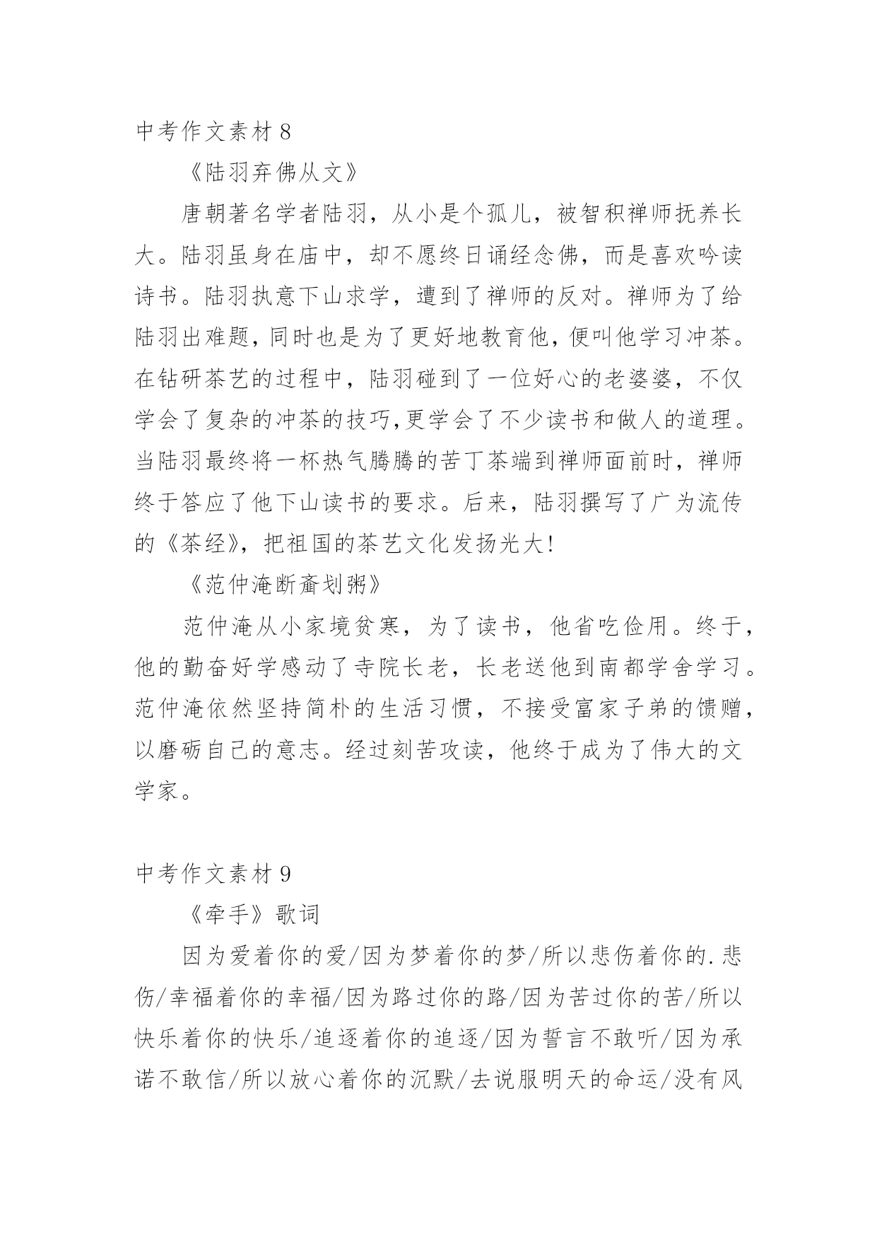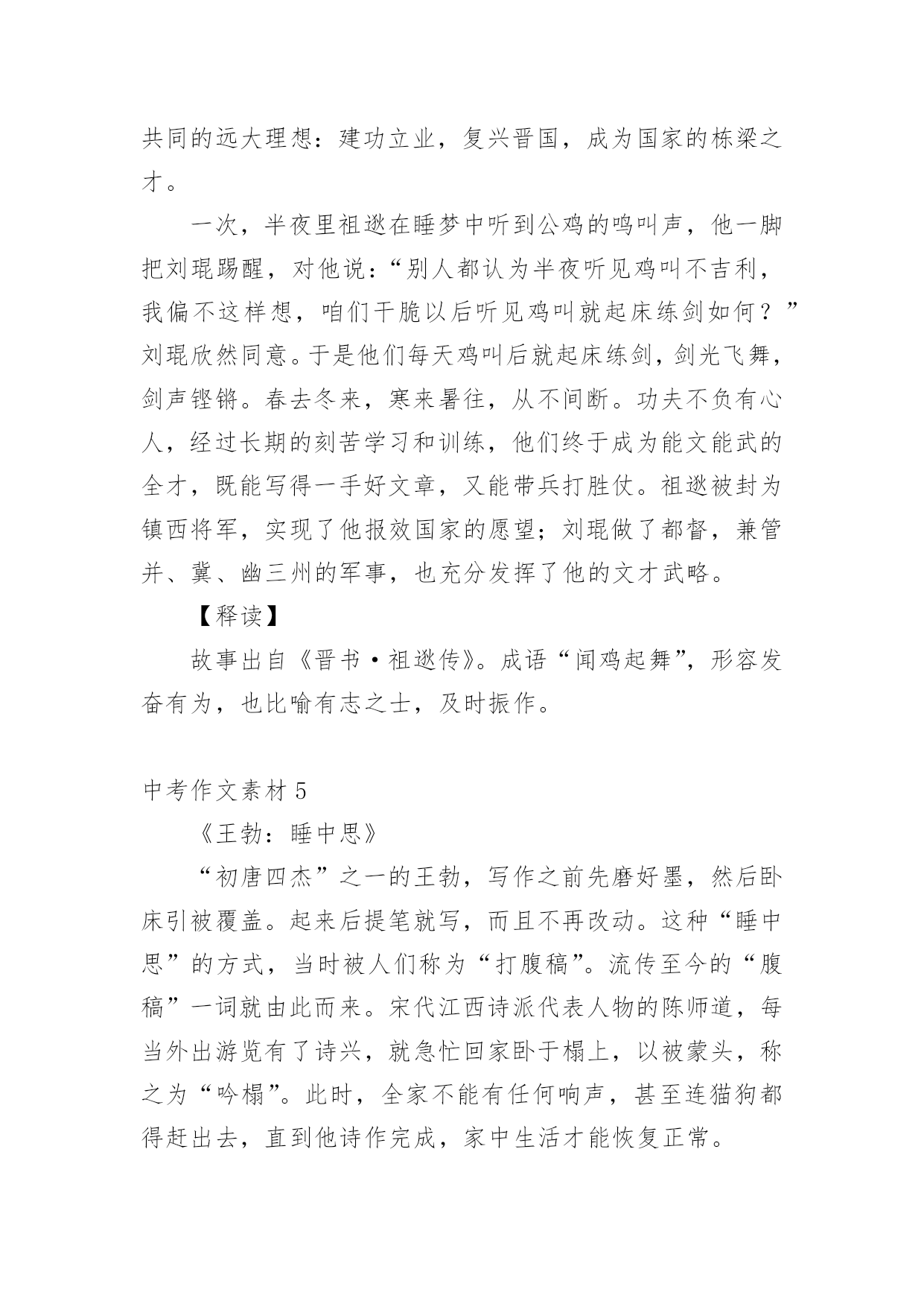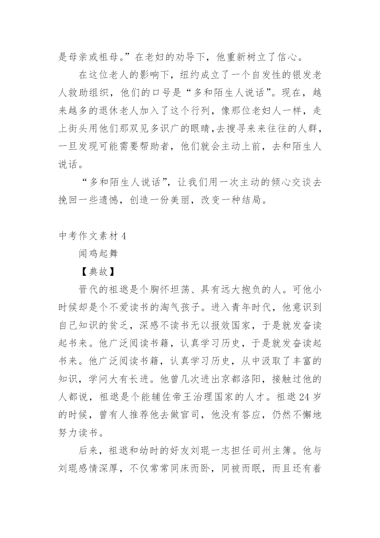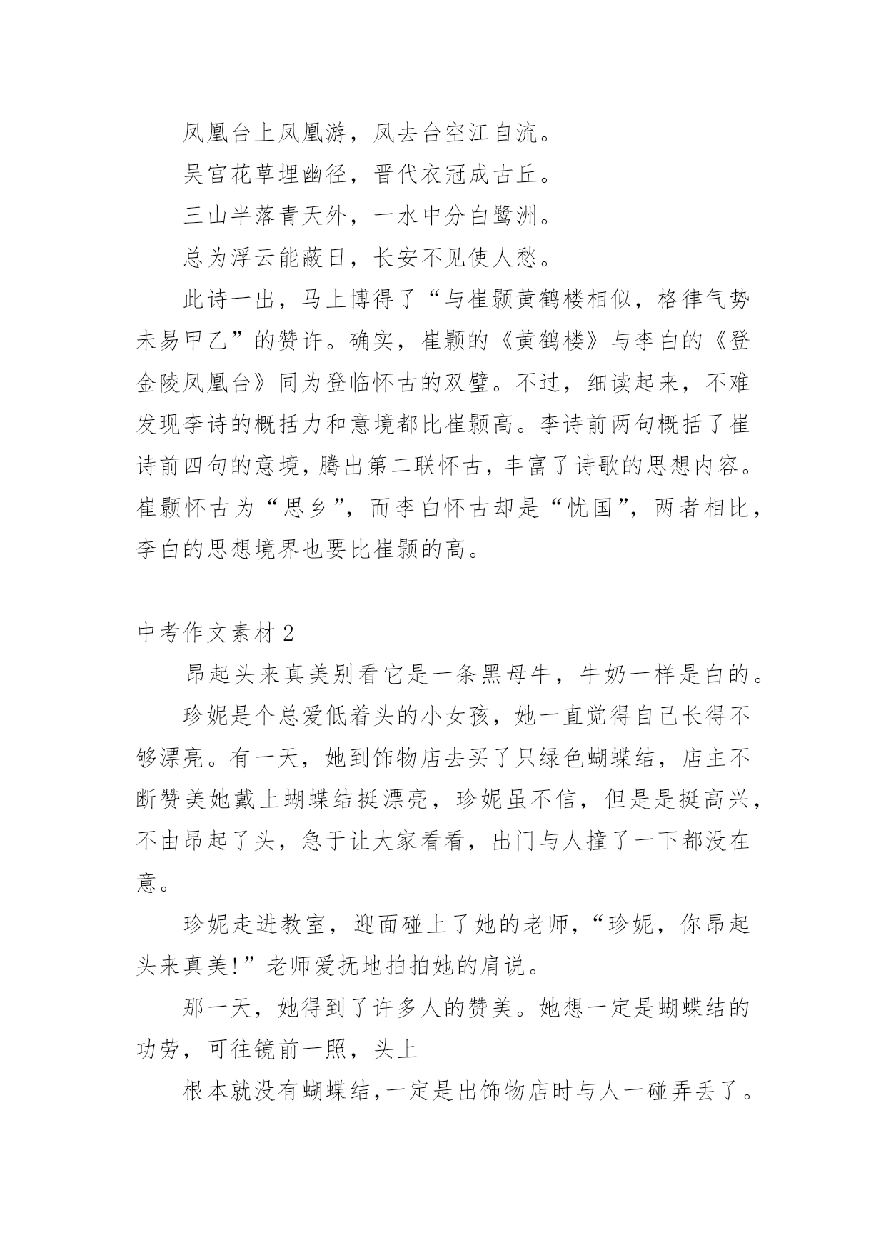 中考作文素材中考作文素材15篇在学习、工作、生活中,大家最不陌生的就是作文了吧,借助作文人们可以反映客观事物、表达思想感情、传递知识信息。作文的注意事项有许多,你确定会写吗?以下是小编精心整理的中考作文素材,仅供参考,大家一起来看看吧。中考作文素材1崔颢的《黄鹤楼》和李白的《登金陵凤凰台》传说崔颢游览黄鹤楼,留诗云:昔人已乘黄鹤去,此地空余黄鹤楼。黄鹤一去不复返,白云千载空悠悠。晴川历历汉阳树,芳草萋萋鹦鹉洲。日暮乡关何处是,烟波江上使人愁。不久,李白登黄鹤楼见到崔颢的诗,非常欣赏。当时有人要李白题诗,出于对崔颢的尊重,李白谦虚地说:“眼前有景道不得,崔颢题诗在上头。”于是“无作而去,为巨匠敛手”。文坛因而留下了一段千古佳话。然而,李白毕竟属于那种充满创作天才的诗人,在登临黄鹤楼时没有尽情尽意,于是他“至金陵,乃作凤凰台诗以拟之”。也就是过后不久,李白在游览金陵凤凰台时,步崔颢原韵,作《登金陵凤凰台》。诗云:凤凰台上凤凰游,凤去台空江自流。吴宫花草埋幽径,晋代衣冠成古丘。三山半落青天外,一水中分白鹭洲。总为浮云能蔽日,长安不见使人愁。此诗一出,马上博得了“与崔颢黄鹤楼相似,格律气势未易甲乙”的赞许。确实,崔颢的《黄鹤楼》与李白的《登金陵凤凰台》同为登临怀古的双璧。不过,细读起来,不难发现李诗的概括力和意境都比崔颢高。李诗前两句概括了崔诗前四句的意境,腾出第二联怀古,丰富了诗歌的思想内容。崔颢怀古为“思乡”,而李白怀古却是“忧国”,两者相比,李白的思想境界也要比崔颢的高。中考作文素材2昂起头来真美别看它是一条黑母牛,牛奶一样是白的。珍妮是个总爱低着头的小女孩,她一直觉得自己长得不够漂亮。有一天,她到饰物店去买了只绿色蝴蝶结,店主不断赞美她戴上蝴蝶结挺漂亮,珍妮虽不信,但是是挺高兴,不由昂起了头,急于让大家看看,出门与人撞了一下都没在意。珍妮走进教室,迎面碰上了她的老师,“珍妮,你昂起头来真美!”老师爱抚地拍拍她的肩说。那一天,她得到了许多人的赞美。她想一定是蝴蝶结的功劳,可往镜前一照,头上根本就没有蝴蝶结,一定是出饰物店时与人一碰弄丢了。自信原本就是一种美丽,而很多人却因为太在意外表而失去很多快乐。温馨提示:无论是贫穷还是富有,无论是貌若天仙,还是相貌平平,只要你昂起头来,快乐会使你变得可爱——人人都喜欢的那种可爱。中考作文素材3在美国纽约的时代广场上,有一位银发老妇整日踱来踱去。有人认为她是在活动筋骨,有人认为她是位无家可归的老人。直到有一天,报纸上登出了这位老人的事情,人们才知道,原来她是在来来往往的人群中搜寻面带焦虑、心事重重、需要帮助的无助者。见到独自乱跑的小朋友,她也上前问一句:“小东西,是不是找不到家了?需要我帮忙吗?”见到满脸忧郁的女孩,她也上前问一句:“孩子,有什么不开心的事吗?说出来吧,或许我能帮助你。”见到心事重重、满脸沮丧的老年人,她也会主动上前打个招呼:“遇到为难的事了吧?用不用我给你出出主意?”她救助过因长期失业感到前途迷茫而企图自杀的青年男女,送还过离家出走的学生和迷途的智障老人,救助过被拐骗的异地少女,还曾成功地劝说走投无路的犯罪分子投案自首。一位曾经想自杀的男人现在已经是一家跨国公司的部门经理。他在回忆被老人帮助的情形时说:“听到她关切的问话后,我竟然扑到她的怀里大哭了一场,当时我只觉得她是母亲或祖母。”在老妇的劝导下,他重新树立了信心。在这位老人的影响下,纽约成立了一个自发性的银发老人救助组织,他们的口号是“多和陌生人说话”。现在,越来越多的退休老人加入了这个行列,像那位老妇人一样,走上街头用他们那双见多识广的眼睛,去搜寻来来往往的人群,一旦发现可能需要帮助者,他们就会主动上前,去和陌生人说话。“多和陌生人说话”,让我们用一次主动的倾心交谈去挽回一些遗憾,创造一份美丽,改变一种结局。中考作文素材4闻鸡起舞【典故】晋代的祖逖是个胸怀坦荡、具有远大抱负的人。可他小时候却是个不爱读书的淘气孩子。进入青年时代,他意识到自己知识的贫乏,深感不读书无以报效国家,于是就发奋读起书来。他广泛阅读书籍,认真学习历史,于是就发奋读起书来。他广泛阅读书籍,认真学习历史,从中汲取了丰富的知识,学问大有长进。他曾几次进出京都洛阳,接触过他的人都说,祖逖是个能辅佐帝王治理国家的人才。祖逖24岁的时候,曾有人推荐他去做官司,他没有答应,仍然不懈地努力读书。后来,祖逖和幼时的好友刘琨一志担任司州主簿。他与刘琨感情深厚,不仅常常同床而卧,同被而眠,而且还有着共同的远大理想:建功立业,复兴晋国,成为国家的栋梁之才。一次,半夜里祖逖在睡梦中听到公鸡的鸣叫声,他一脚把刘琨踢醒,对他说:“别人都认为半夜听见鸡叫不吉利,我偏不这样想,咱们干脆以后听见鸡叫就起床练剑如何?”刘琨欣然同意。于是他们每天鸡叫后就起床练剑,剑光飞舞,剑声铿锵。