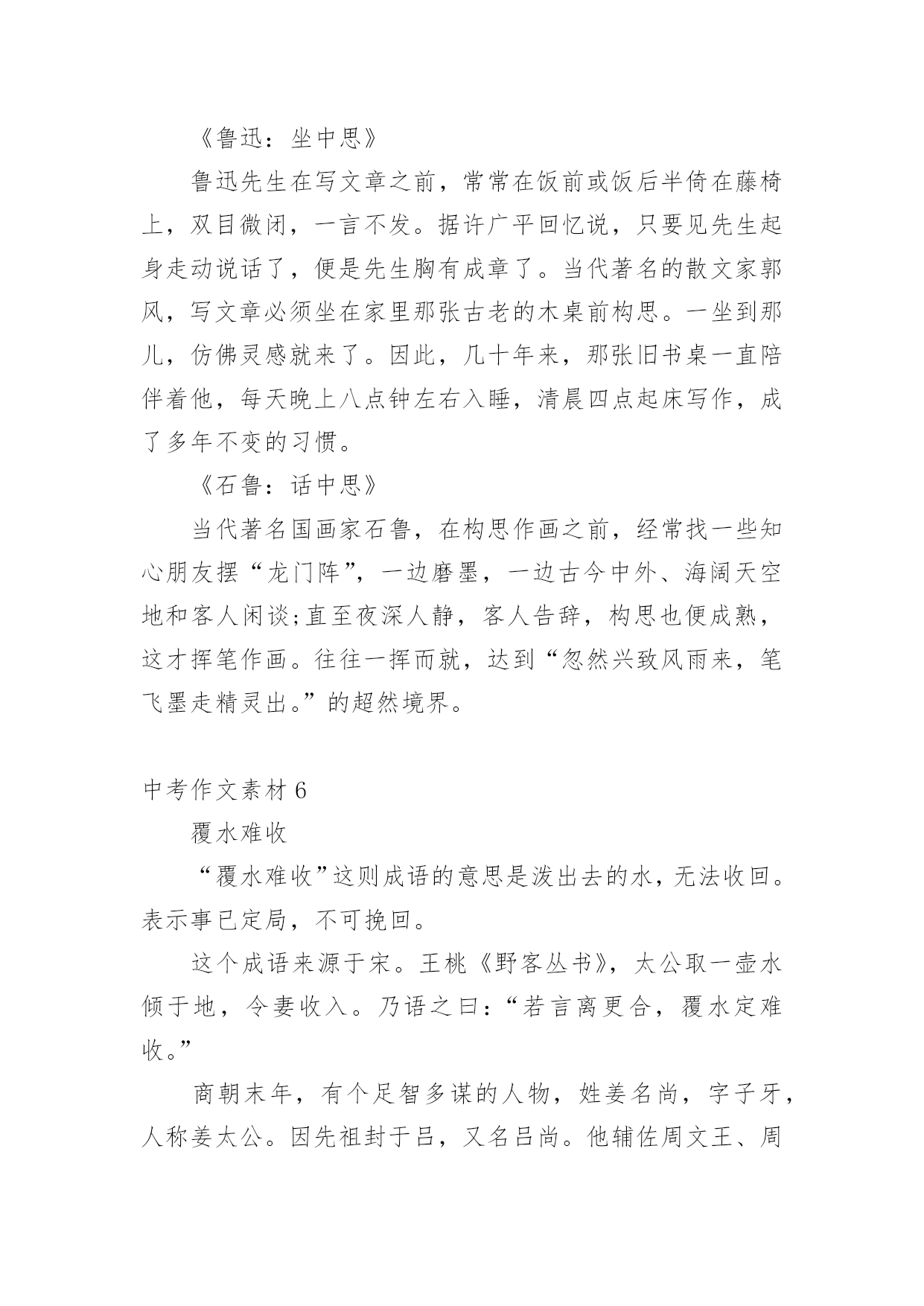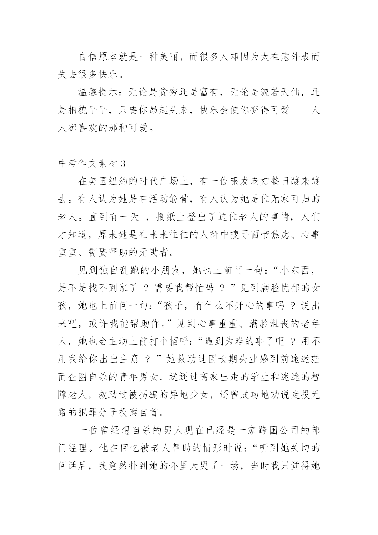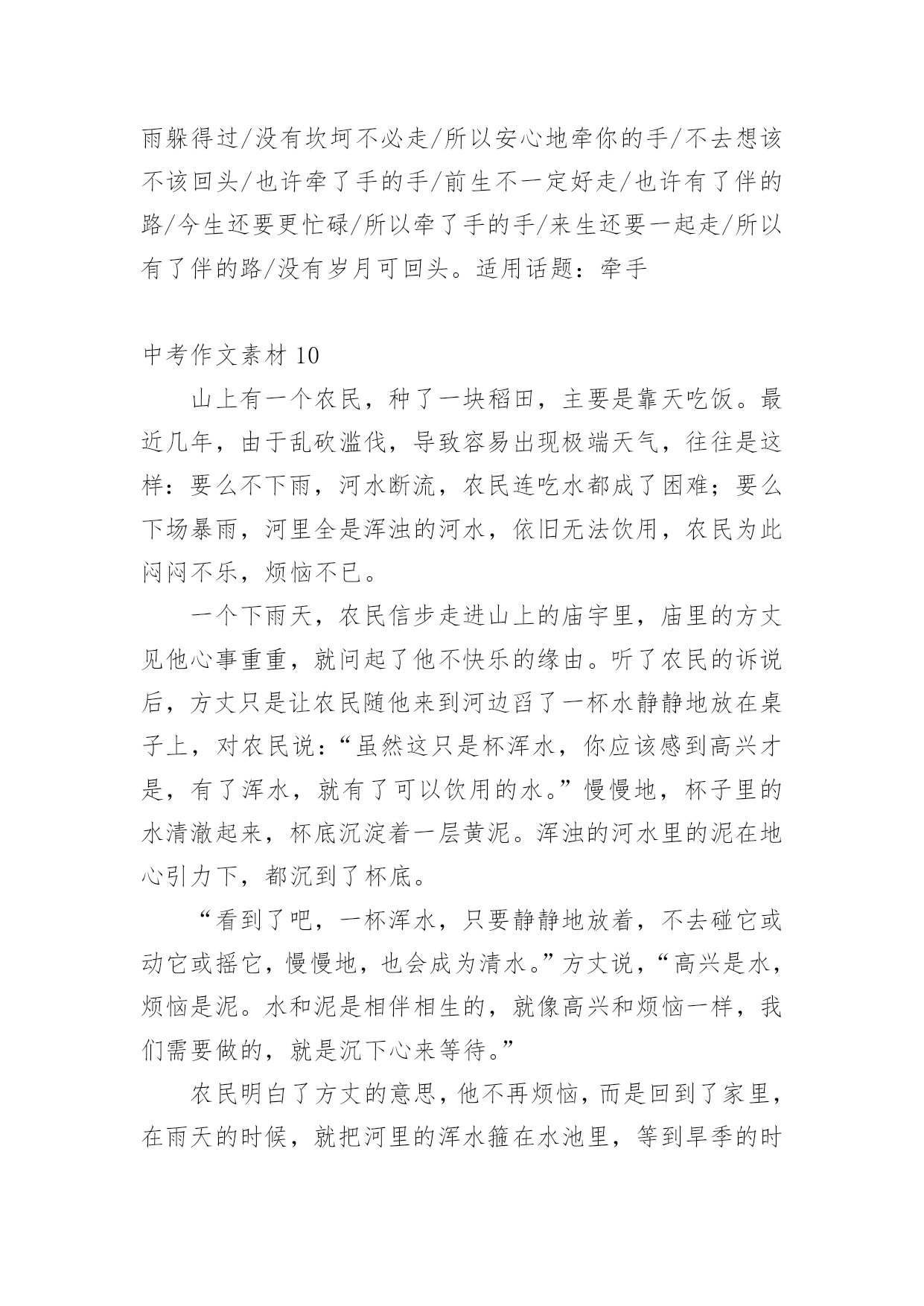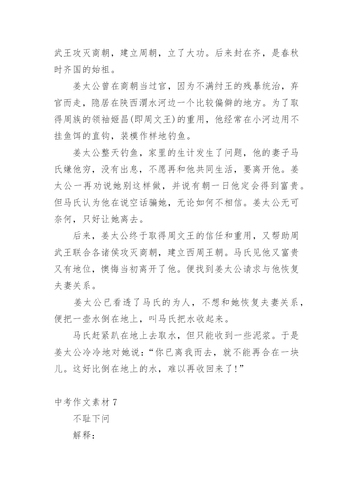 中考作文素材中考作文素材15篇在学习、工作、生活中,大家最不陌生的就是作文了吧,借助作文人们可以反映客观事物、表达思想感情、传递知识信息。作文的注意事项有许多,你确定会写吗?以下是小编精心整理的中考作文素材,仅供参考,大家一起来看看吧。中考作文素材1崔颢的《黄鹤楼》和李白的《登金陵凤凰台》传说崔颢游览黄鹤楼,留诗云:昔人已乘黄鹤去,此地空余黄鹤楼。黄鹤一去不复返,白云千载空悠悠。晴川历历汉阳树,芳草萋萋鹦鹉洲。日暮乡关何处是,烟波江上使人愁。不久,李白登黄鹤楼见到崔颢的诗,非常欣赏。当时有人要李白题诗,出于对崔颢的尊重,李白谦虚地说:“眼前有景道不得,崔颢题诗在上头。”于是“无作而去,为巨匠敛手”。文坛因而留下了一段千古佳话。然而,李白毕竟属于那种充满创作天才的诗人,在登临黄鹤楼时没有尽情尽意,于是他“至金陵,乃作凤凰台诗以拟之”。也就是过后不久,李白在游览金陵凤凰台时,步崔颢原韵,作《登金陵凤凰台》。诗云:凤凰台上凤凰游,凤去台空江自流。吴宫花草埋幽径,晋代衣冠成古丘。三山半落青天外,一水中分白鹭洲。总为浮云能蔽日,长安不见使人愁。此诗一出,马上博得了“与崔颢黄鹤楼相似,格律气势未易甲乙”的赞许。确实,崔颢的《黄鹤楼》与李白的《登金陵凤凰台》同为登临怀古的双璧。不过,细读起来,不难发现李诗的概括力和意境都比崔颢高。李诗前两句概括了崔诗前四句的意境,腾出第二联怀古,丰富了诗歌的思想内容。崔颢怀古为“思乡”,而李白怀古却是“忧国”,两者相比,李白的思想境界也要比崔颢的高。中考作文素材2昂起头来真美别看它是一条黑母牛,牛奶一样是白的。珍妮是个总爱低着头的小女孩,她一直觉得自己长得不够漂亮。有一天,她到饰物店去买了只绿色蝴蝶结,店主不断赞美她戴上蝴蝶结挺漂亮,珍妮虽不信,但是是挺高兴,不由昂起了头,急于让大家看看,出门与人撞了一下都没在意。珍妮走进教室,迎面碰上了她的老师,“珍妮,你昂起头来真美!”老师爱抚地拍拍她的肩说。那一天,她得到了许多人的赞美。她想一定是蝴蝶结的功劳,可往镜前一照,头上根本就没有蝴蝶结,一定是出饰物店时与人一碰弄丢了。自信原本就是一种美丽,而很多人却因为太在意外表而失去很多快乐。温馨提示:无论是贫穷还是富有,无论是貌若天仙,还是相貌平平,只要你昂起头来,快乐会使你变得可爱——人人都喜欢的那种可爱。中考作文素材3在美国纽约的时代广场上,有一位银发老妇整日踱来踱去。有人认为她是在活动筋骨,有人认为她是位无家可归的老人。直到有一天,报纸上登出了这位老人的事情,人们才知道,原来她是在来来往往的人群中搜寻面带焦虑、心事重重、需要帮助的无助者。见到独自乱跑的小朋友,她也上前问一句:“小东西,是不是找不到家了?需要我帮忙吗?”见到满脸忧郁的女孩,她也上前问一句:“孩子,有什么不开心的事吗?说出来吧,或许我能帮助你。”见到心事重重、满脸沮丧的老年人,她也会主动上前打个招呼:“遇到为难的事了吧?用不用我给你出出主意?”她救助过因长期失业感到前途迷茫而企图自杀的青年男女,送还过离家出走的学生和迷途的智障老人,救助过被拐骗的异地少女,还曾成功地劝说走投无路的犯罪分子投案自首。一位曾经想自杀的男人现在已经是一家跨国公司的部门经理。他在回忆被老人帮助的情形时说:“听到她关切的问话后,我竟然扑到她的怀里大哭了一场,当时我只觉得她是母亲或祖母。”在老妇的劝导下,他重新树立了信心。在这位老人的影响下,纽约成立了一个自发性的银发老人救助组织,他们的口号是“多和陌生人说话”。现在,越来越多的退休老人加入了这个行列,像那位老妇人一样,走上街头用他们那双见多识广的眼睛,去搜寻来来往往的人群,一旦发现可能需要帮助者,他们就会主动上前,去和陌生人说话。“多和陌生人说话”,让我们用一次主动的倾心交谈去挽回一些遗憾,创造一份美丽,改变一种结局。中考作文素材4闻鸡起舞【典故】晋代的祖逖是个胸怀坦荡、具有远大抱负的人。可他小时候却是个不爱读书的淘气孩子。进入青年时代,他意识到自己知识的贫乏,深感不读书无以报效国家,于是就发奋读起书来。他广泛阅读书籍,认真学习历史,于是就发奋读起书来。他广泛阅读书籍,认真学习历史,从中汲取了丰富的知识,学问大有长进。他曾几次进出京都洛阳,接触过他的人都说,祖逖是个能辅佐帝王治理国家的人才。祖逖24岁的时候,曾有人推荐他去做官司,他没有答应,仍然不懈地努力读书。后来,祖逖和幼时的好友刘琨一志担任司州主簿。他与刘琨感情深厚,不仅常常同床而卧,同被而眠,而且还有着共同的远大理想:建功立业,复兴晋国,成为国家的栋梁之才。一次,半夜里祖逖在睡梦中听到公鸡的鸣叫声,他一脚把刘琨踢醒,对他说:“别人都认为半夜听见鸡叫不吉利,我偏不这样想,咱们干脆以后听见鸡叫就起床练剑如何?”刘琨欣然同意。于是他们每天鸡叫后就起床练剑,剑光飞舞,剑声铿锵。